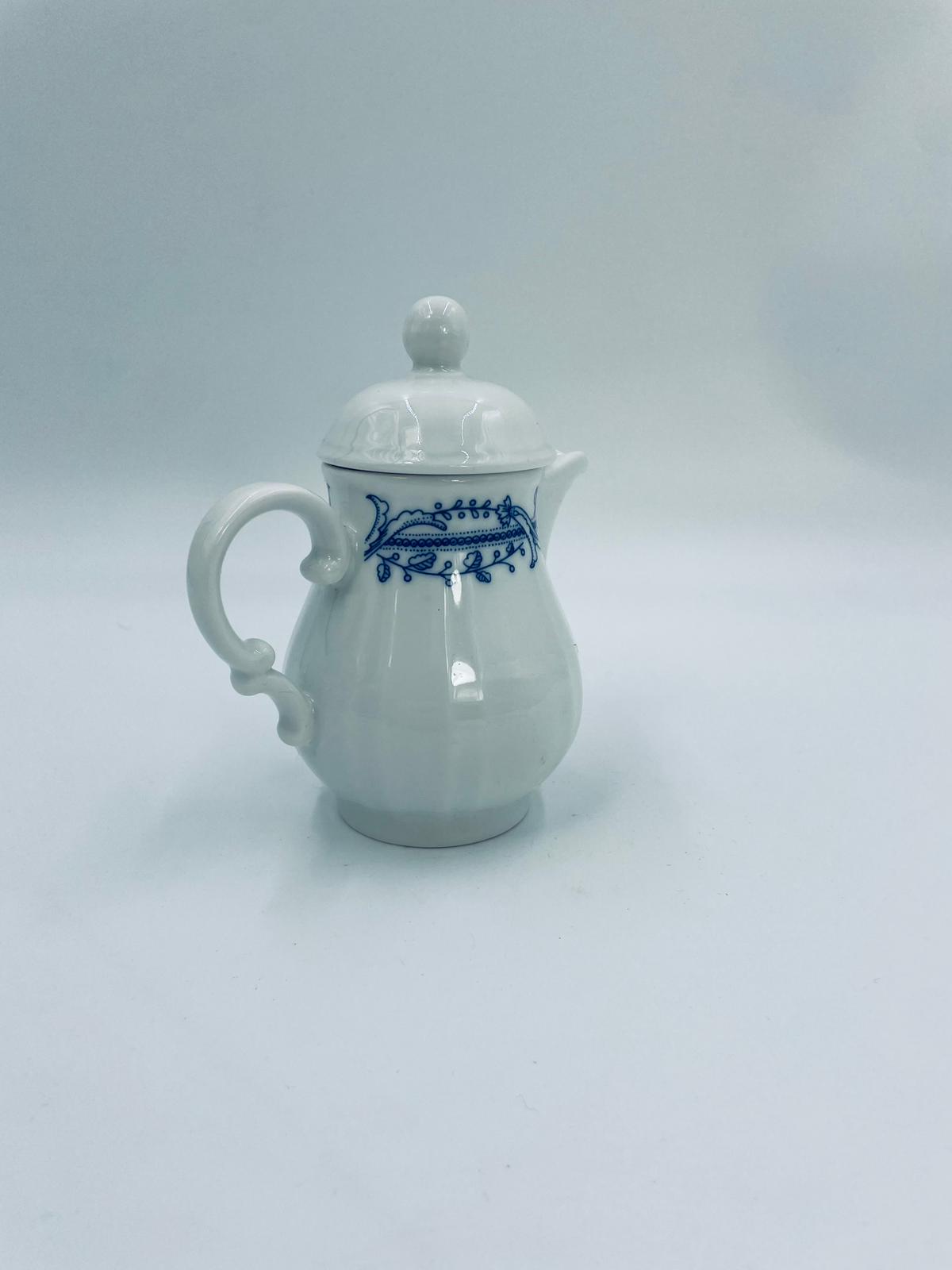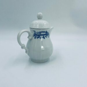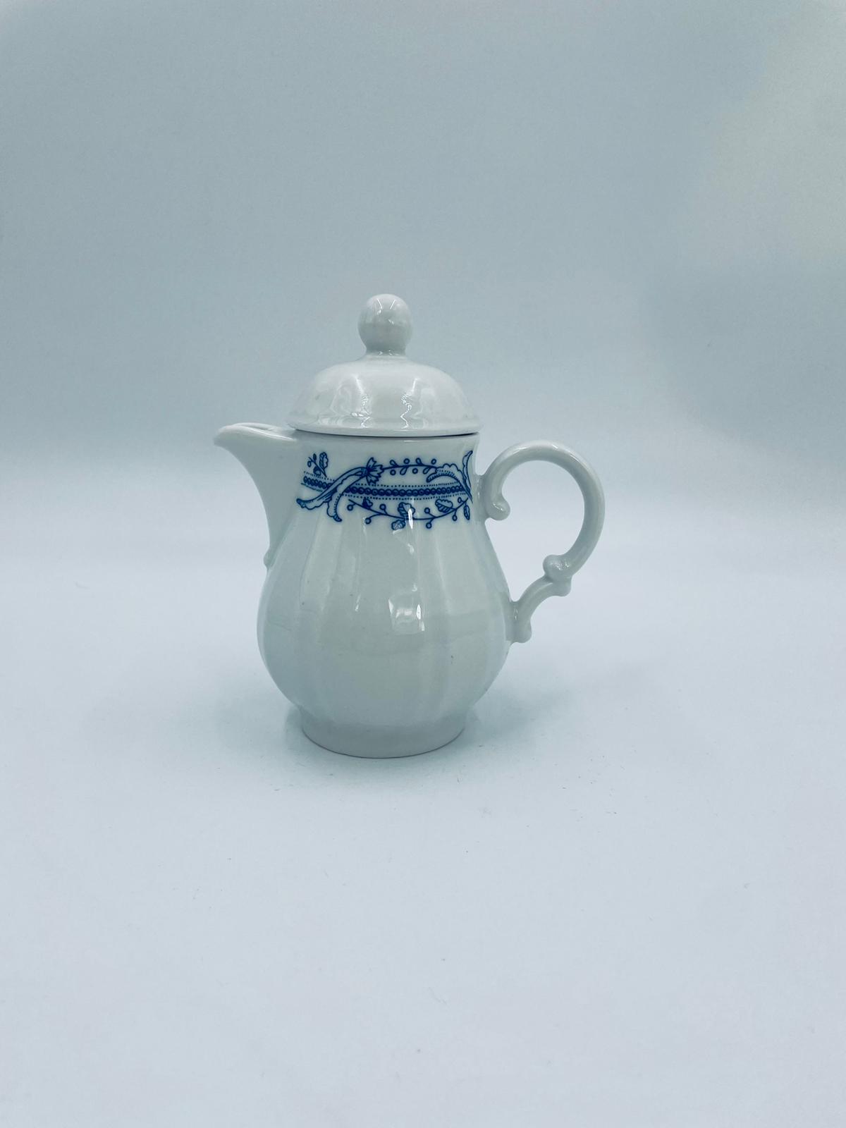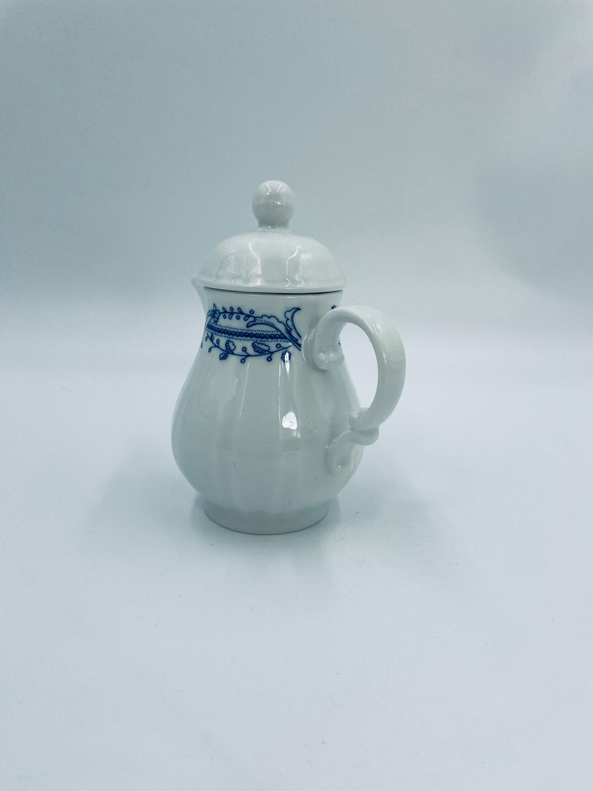 Dzbanek z pokrywą na mleko/ herbatę wytwórni Schönwald Germany, wykonany z wysokiej jakości białej porcelany. Dzbanuszek ozdobiony jest niebieską dekoracją w górnej części, posiada dekoracyjny uchwyt i dzióbek.