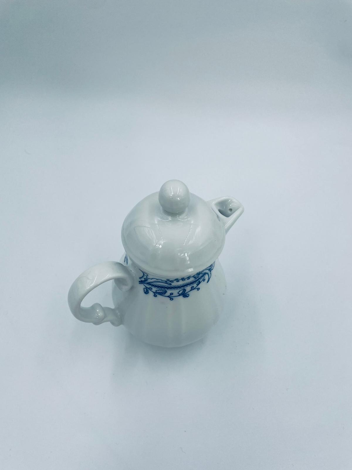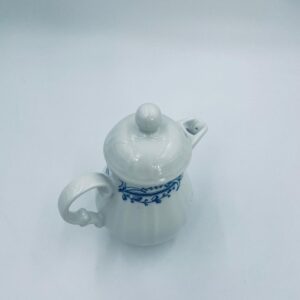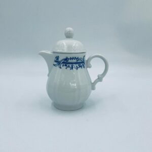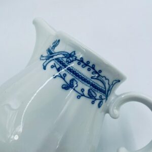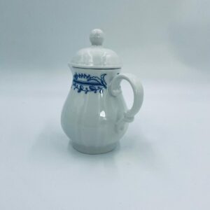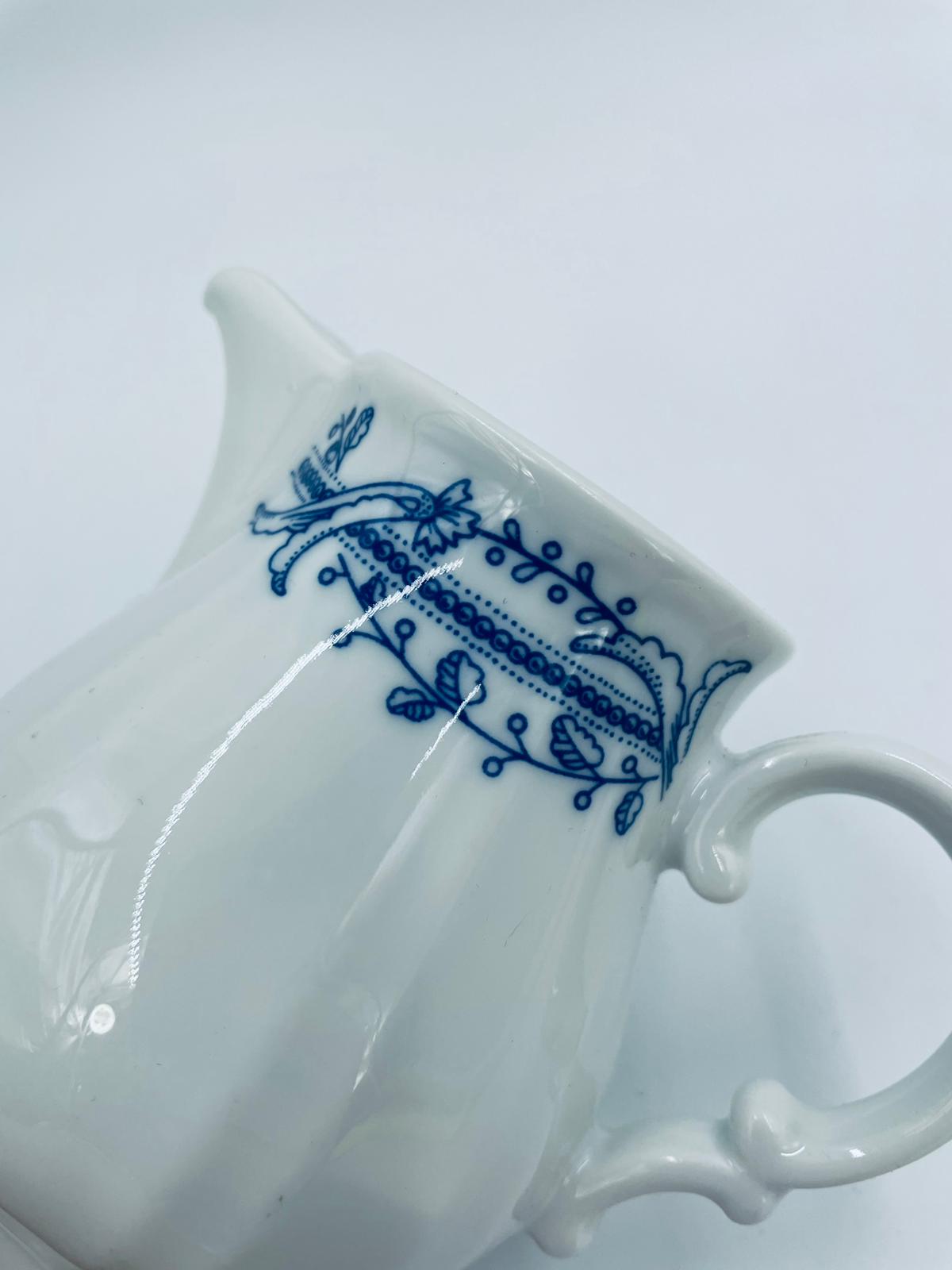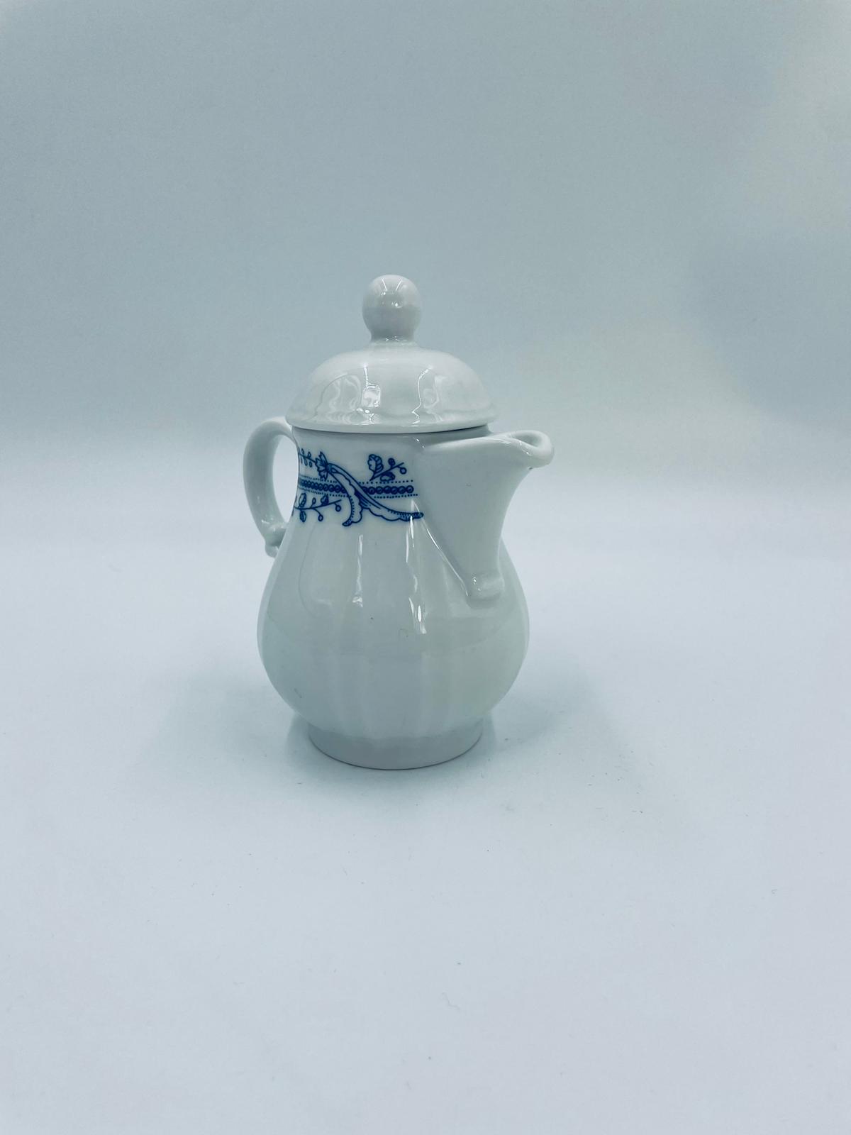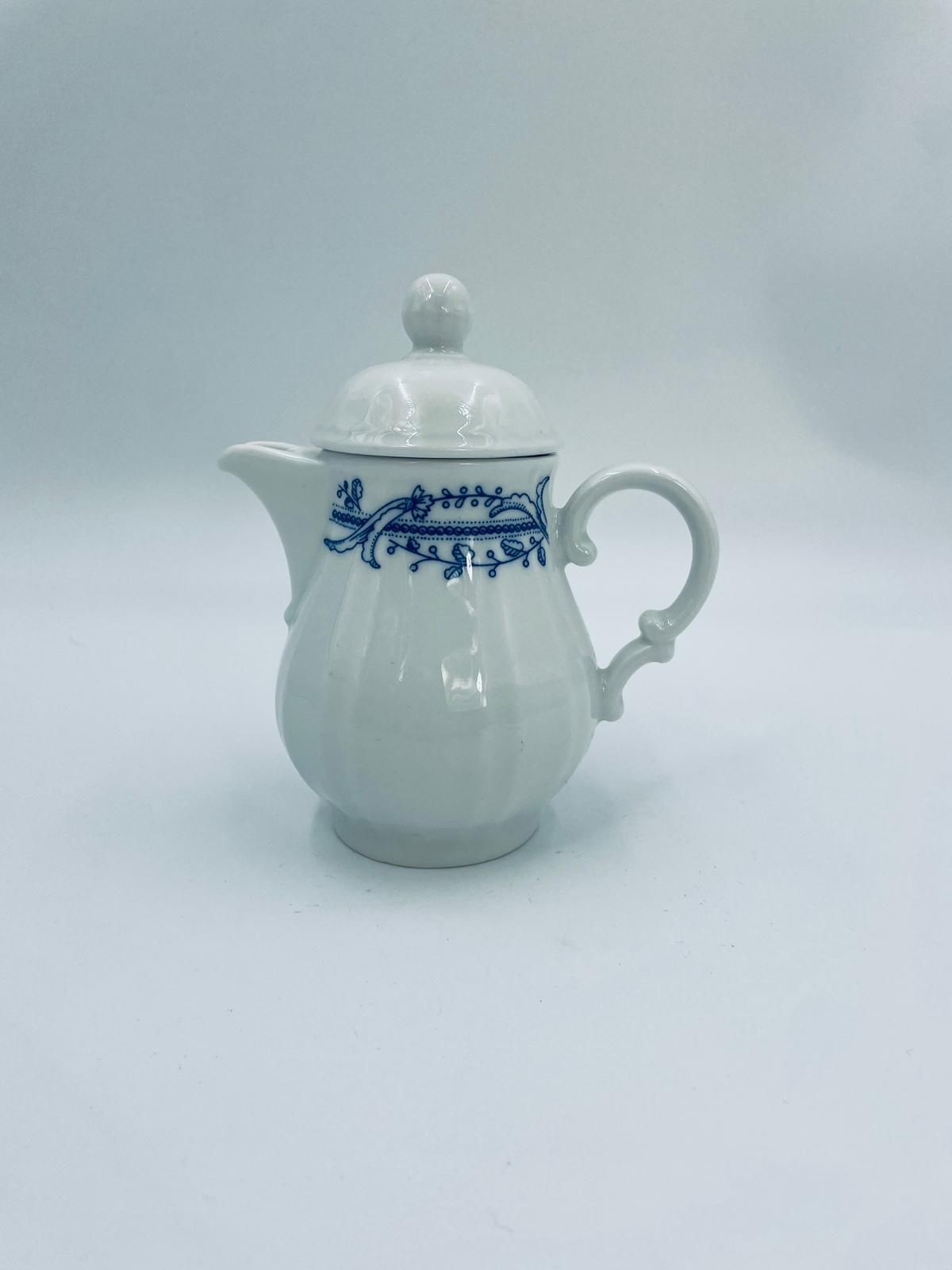 Dzbanek z pokrywą na mleko/ herbatę wytwórni Schönwald Germany, wykonany z wysokiej jakości białej porcelany. Dzbanuszek ozdobiony jest niebieską dekoracją w górnej części, posiada dekoracyjny uchwyt i dzióbek.
