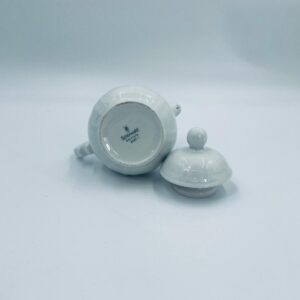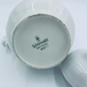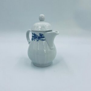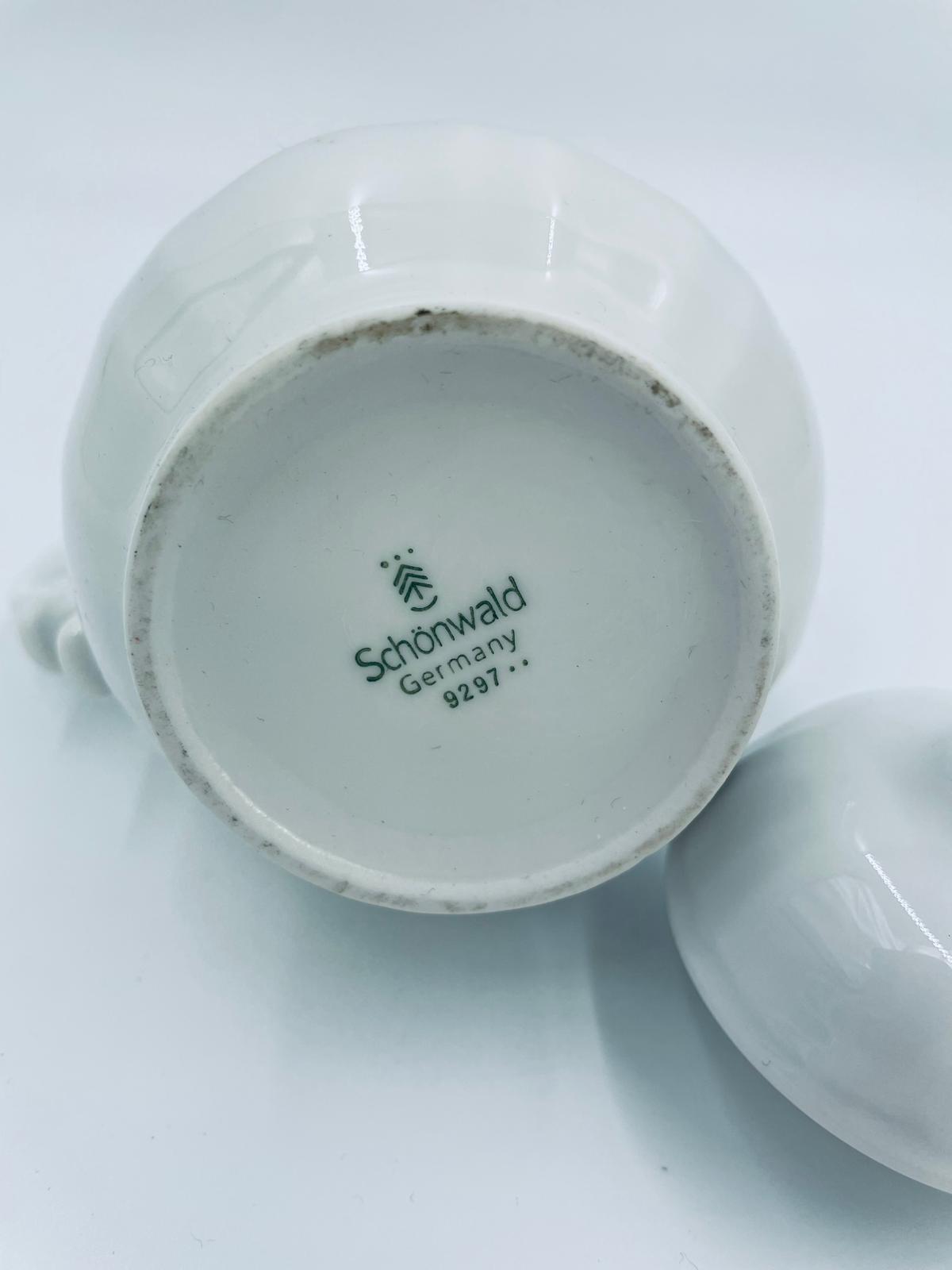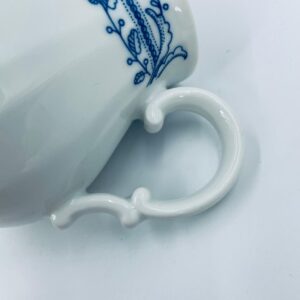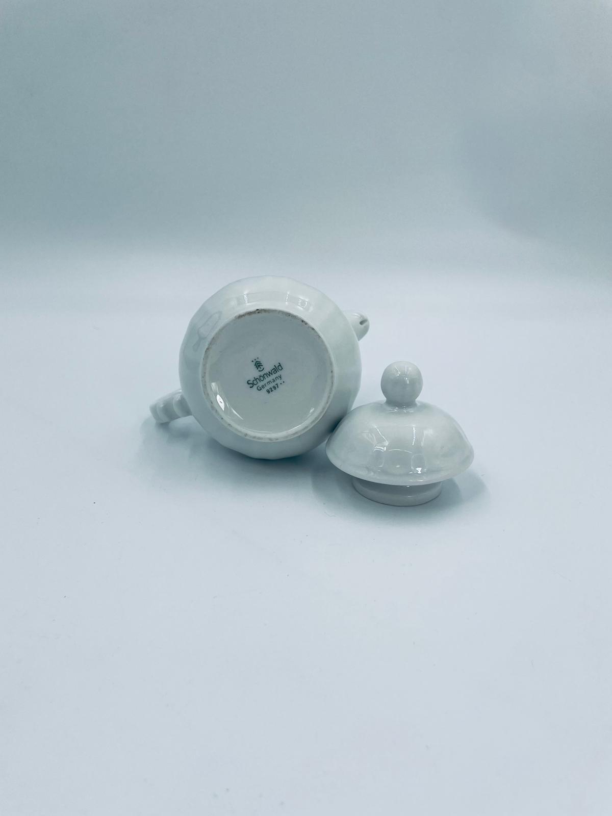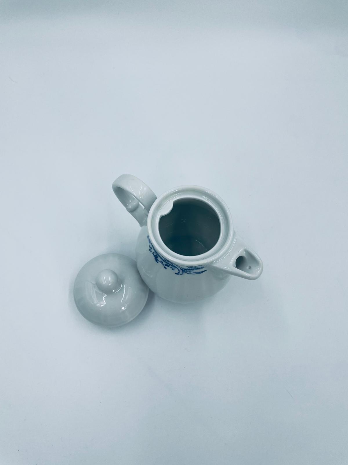 Dzbanek z pokrywą na mleko/ herbatę wytwórni Schönwald Germany, wykonany z wysokiej jakości białej porcelany. Dzbanuszek ozdobiony jest niebieską dekoracją w górnej części, posiada dekoracyjny uchwyt i dzióbek.