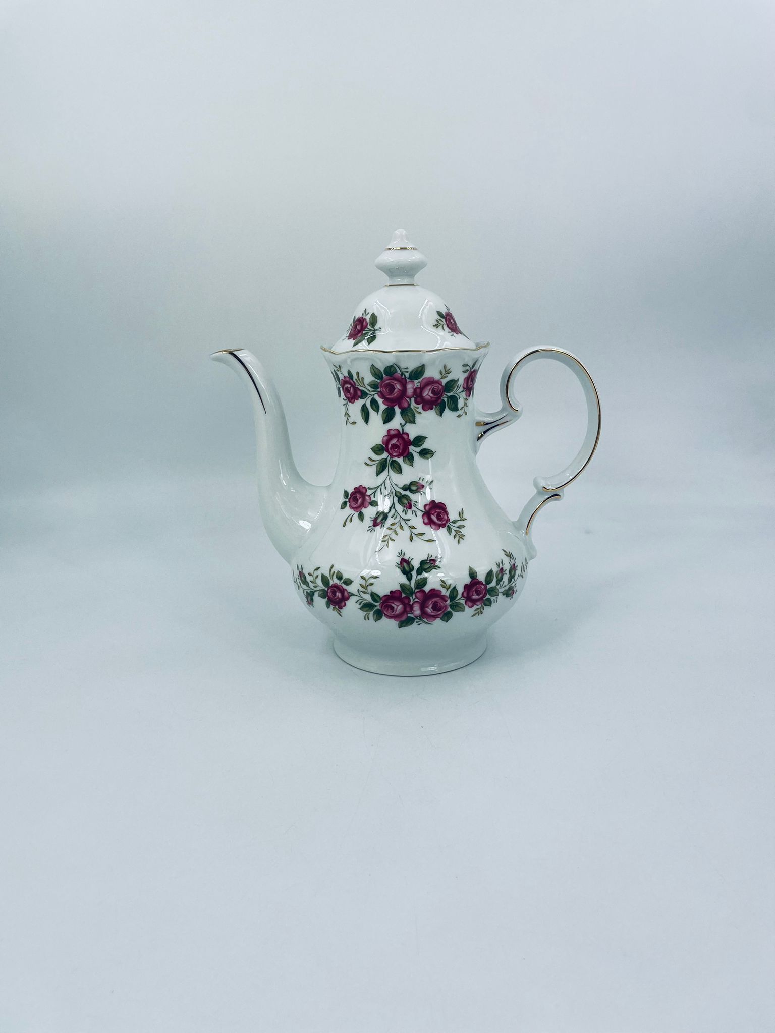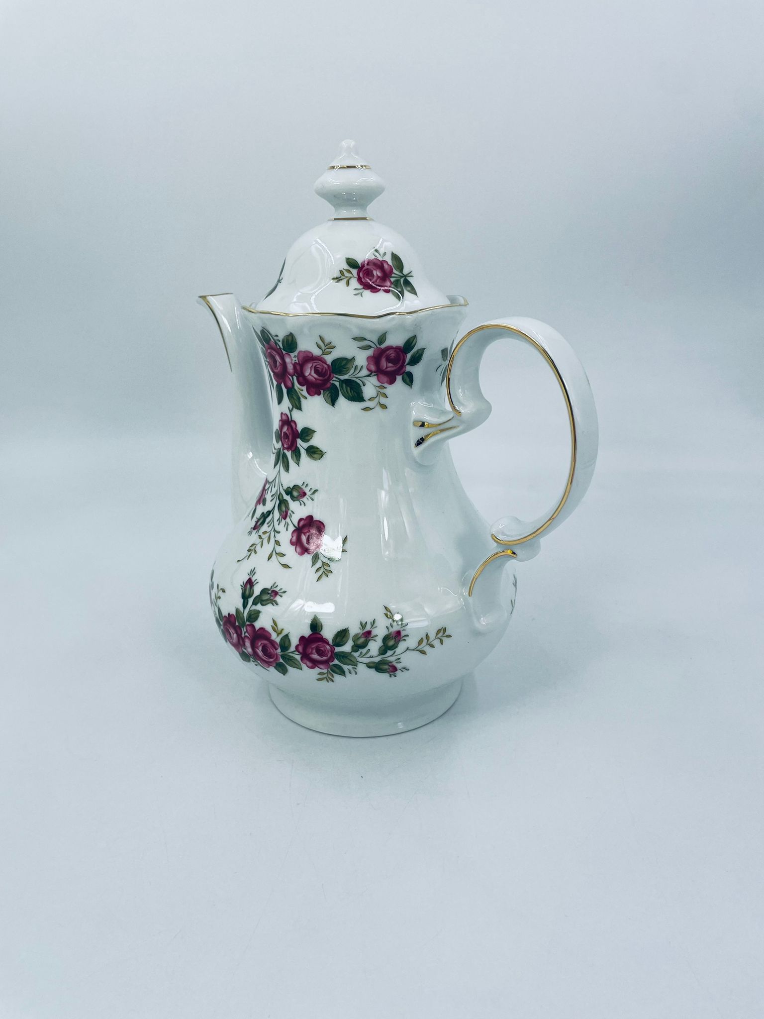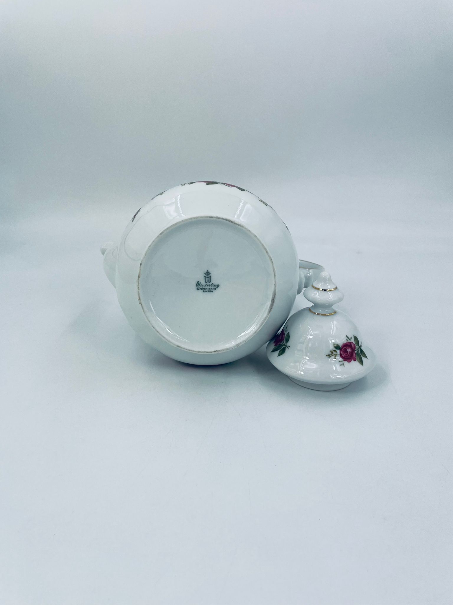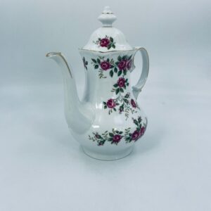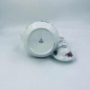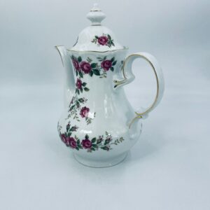 Dzbanek do herbaty znanej wytwórni Winterling Kirchenlamitz, wykonany z wysokiej jakości białej porcelany z przepięknym wzorem różowych różyczek, wykończony złoceniami na rantach. Imbryk przepięknie prezentuje się jako przedmiot kolekcjonerski oraz jako do użytku codziennego i na spotkania herbaciane.
