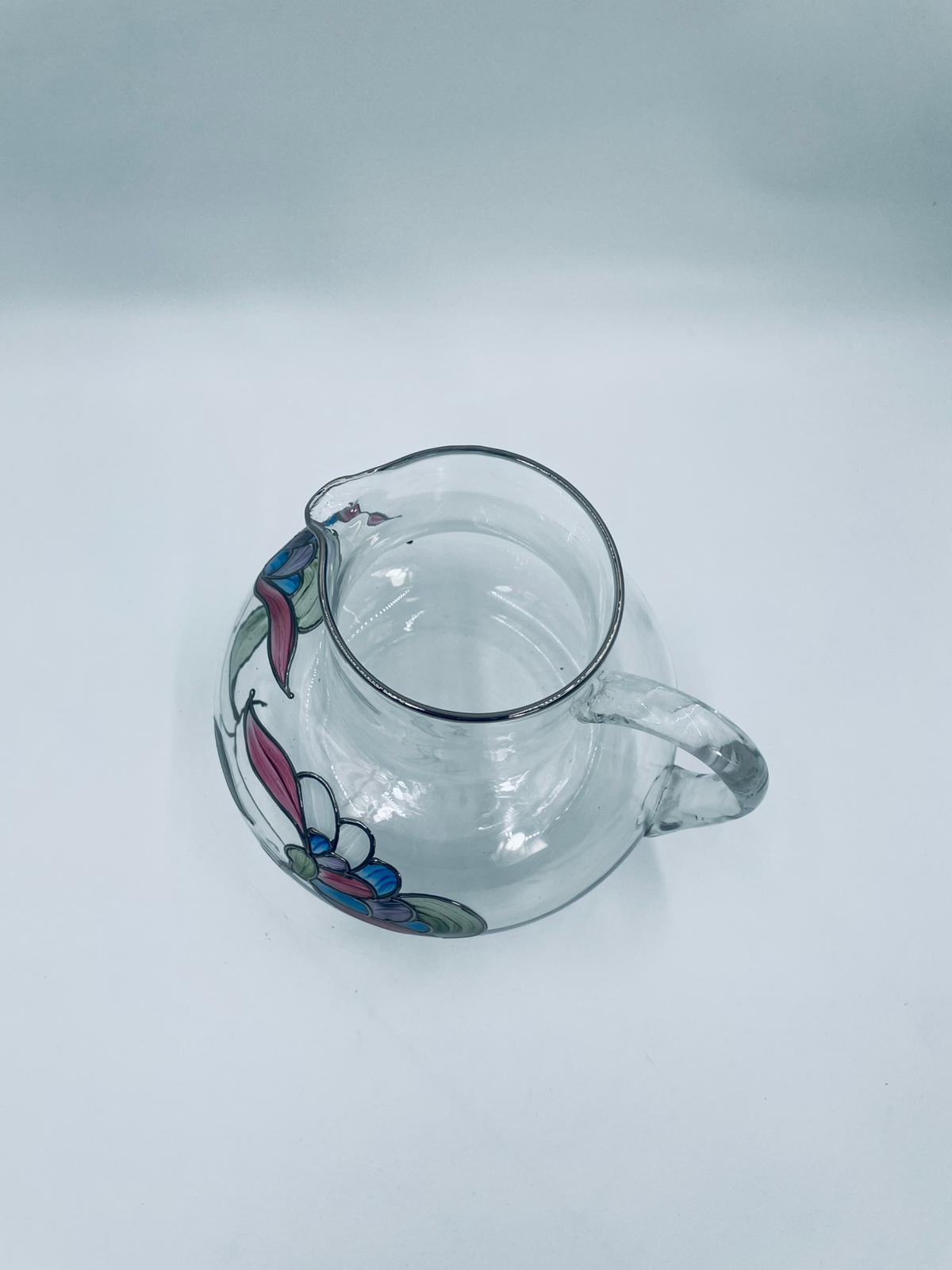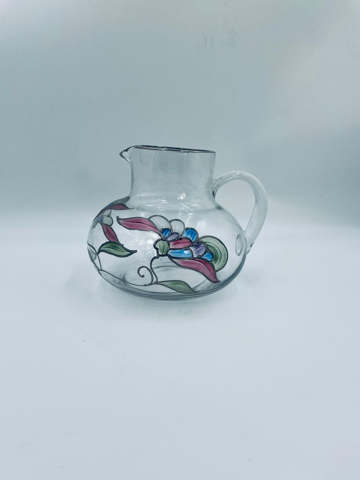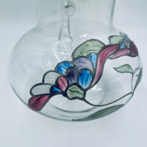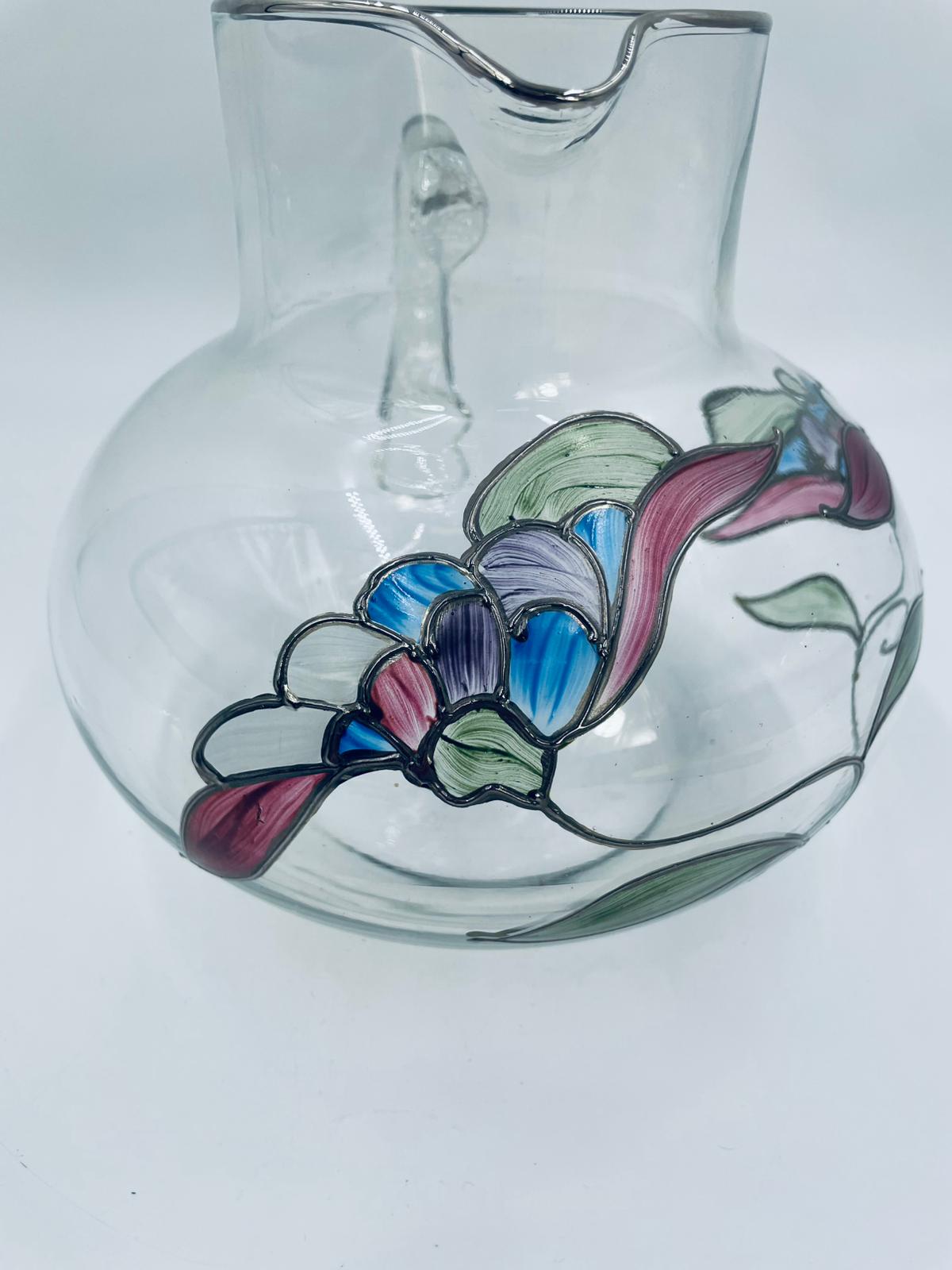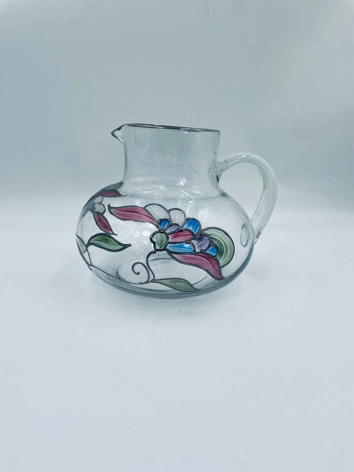 Dzbanek do soku marki Crystal Clear w stylu Tiffany’ego, wykonany z wysokiej jakości szkła kryształowego. Dzbanek klasyczny, elegancki, ozdobiony ręcznie malowanymi farbami wzorem kwiatowym, wykończony srebrną obwódką na kwiatach oraz na górnym rancie.