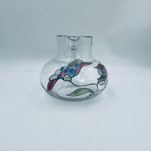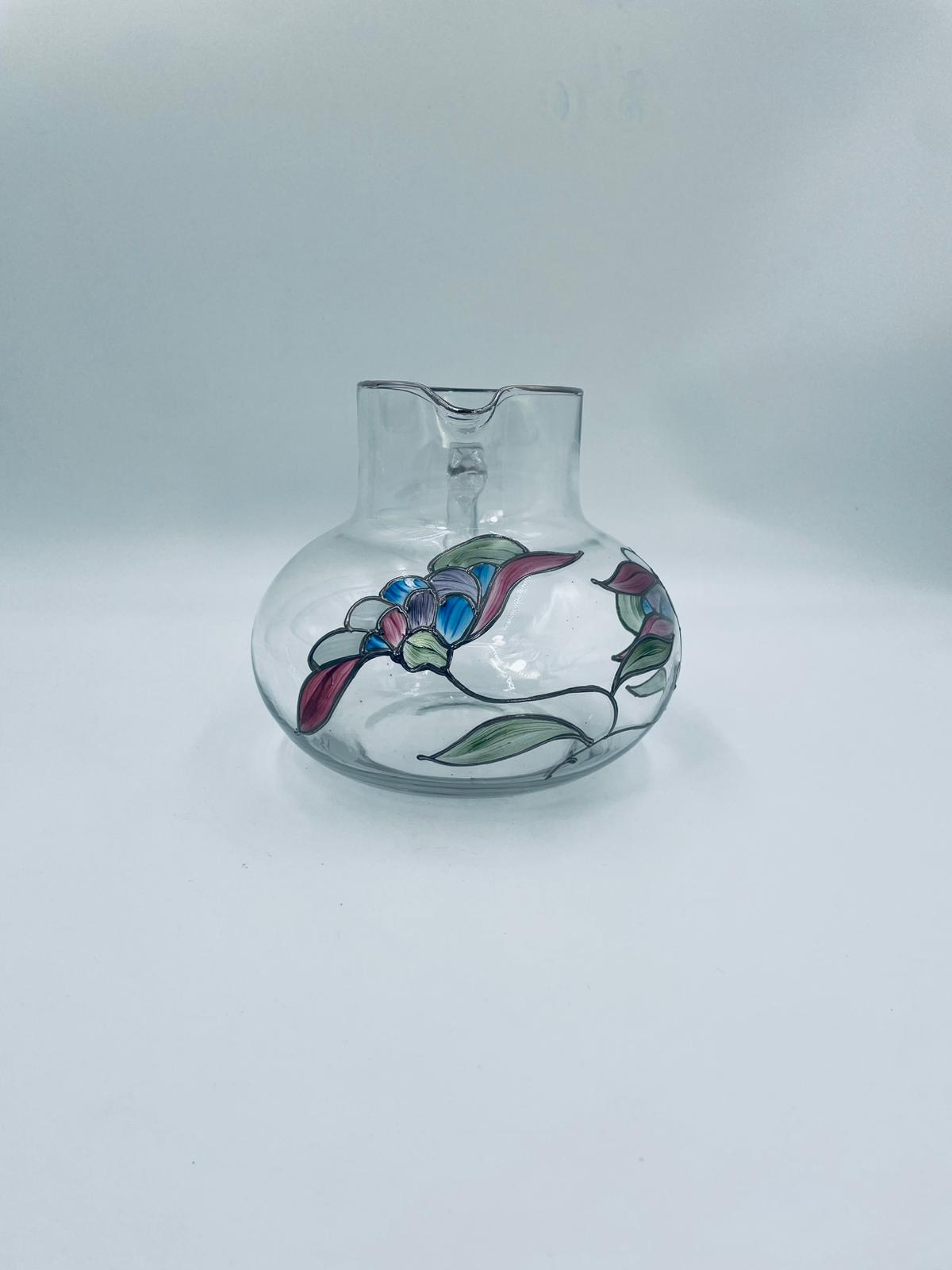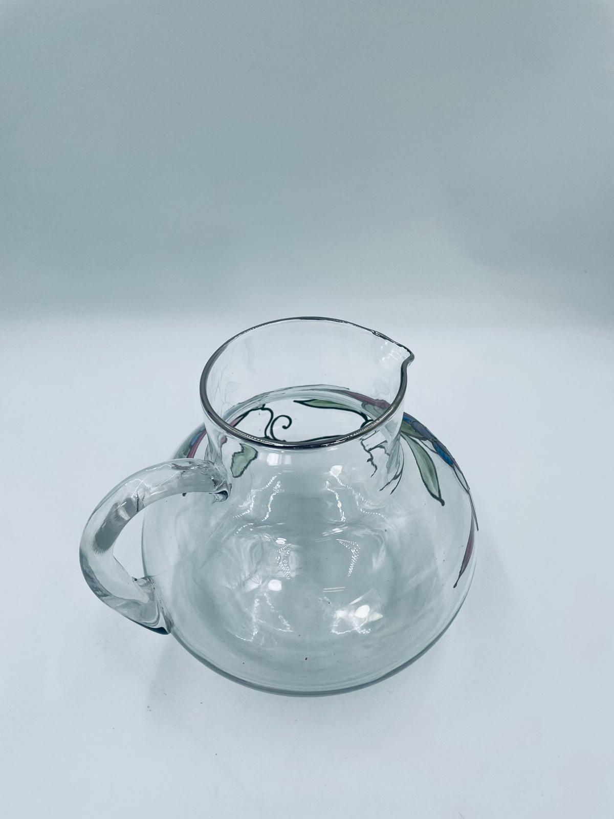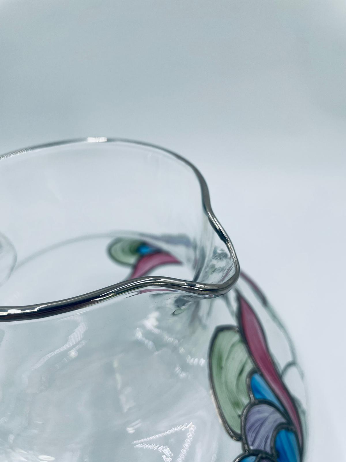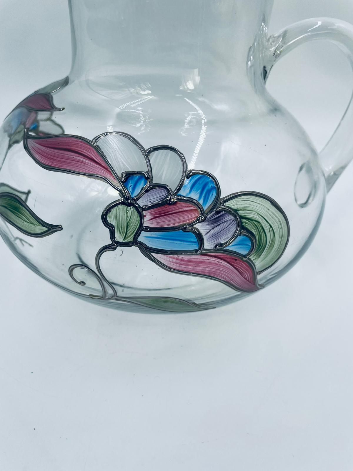 Dzbanek do soku marki Crystal Clear w stylu Tiffany’ego, wykonany z wysokiej jakości szkła kryształowego. Dzbanek klasyczny, elegancki, ozdobiony ręcznie malowanymi farbami wzorem kwiatowym, wykończony srebrną obwódką na kwiatach oraz na górnym rancie.