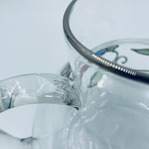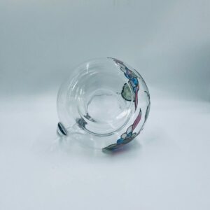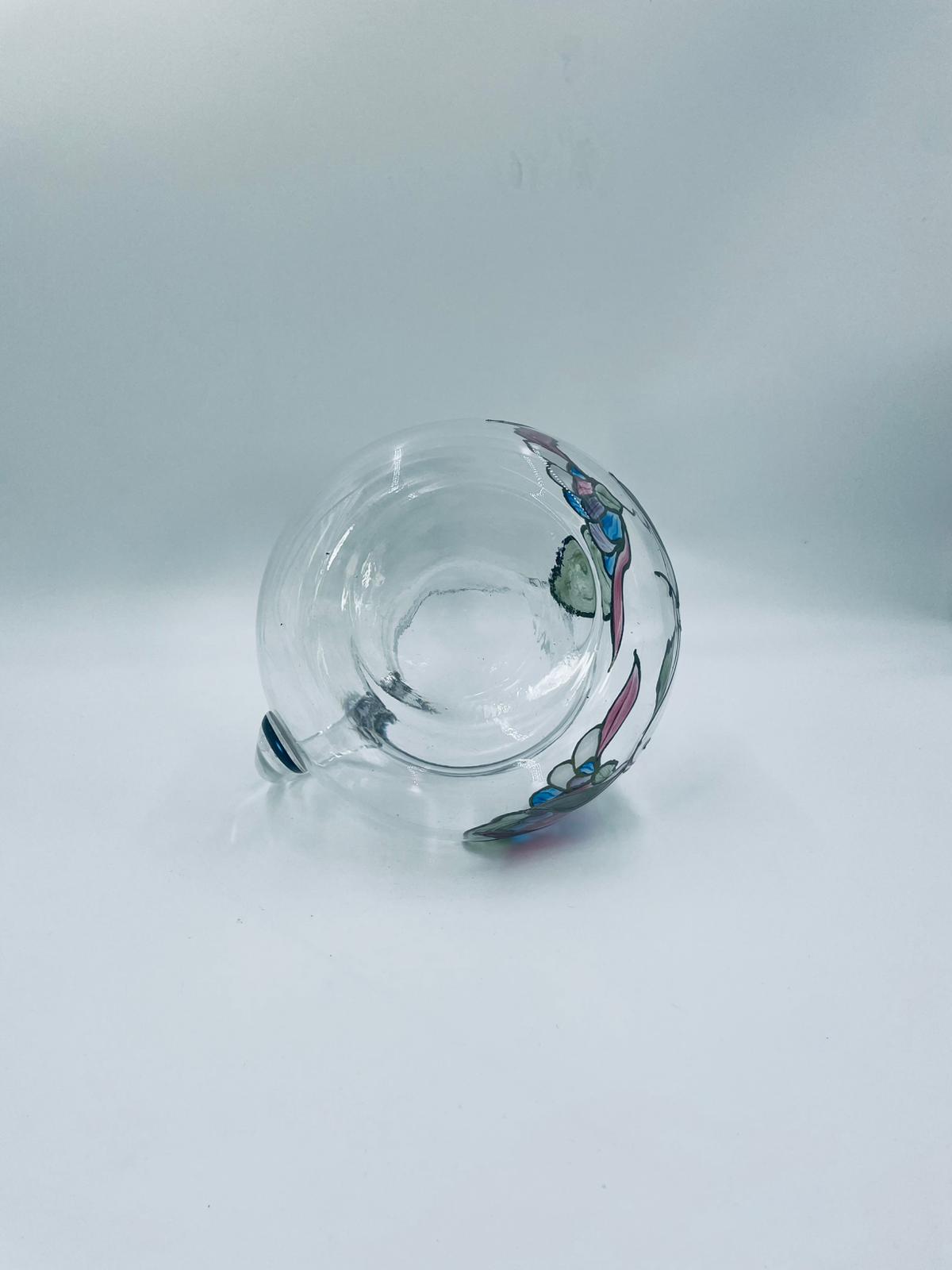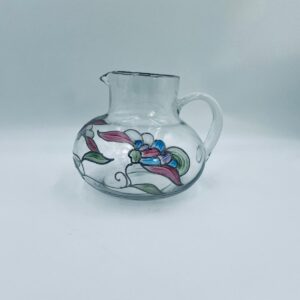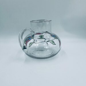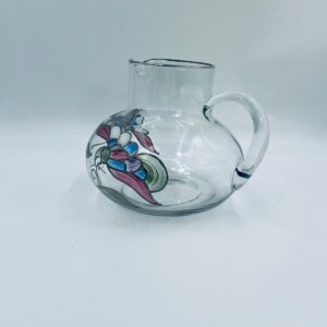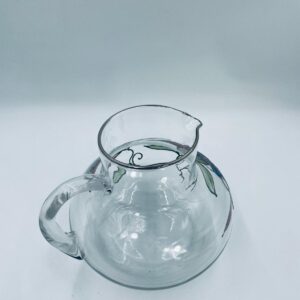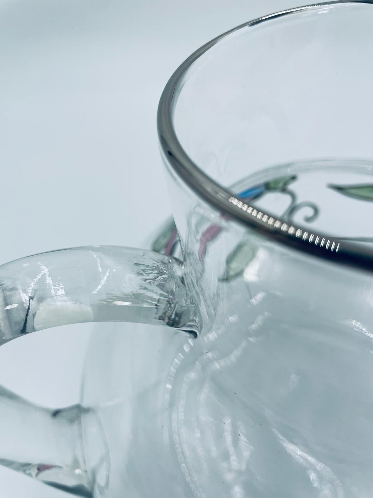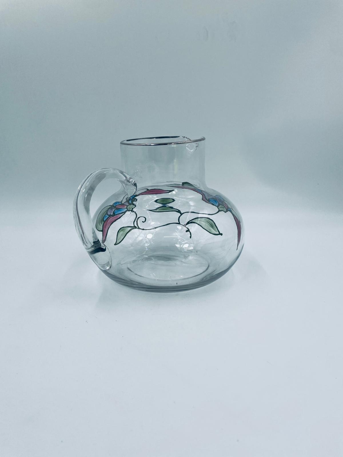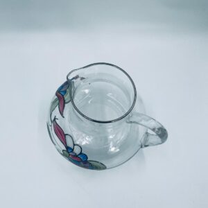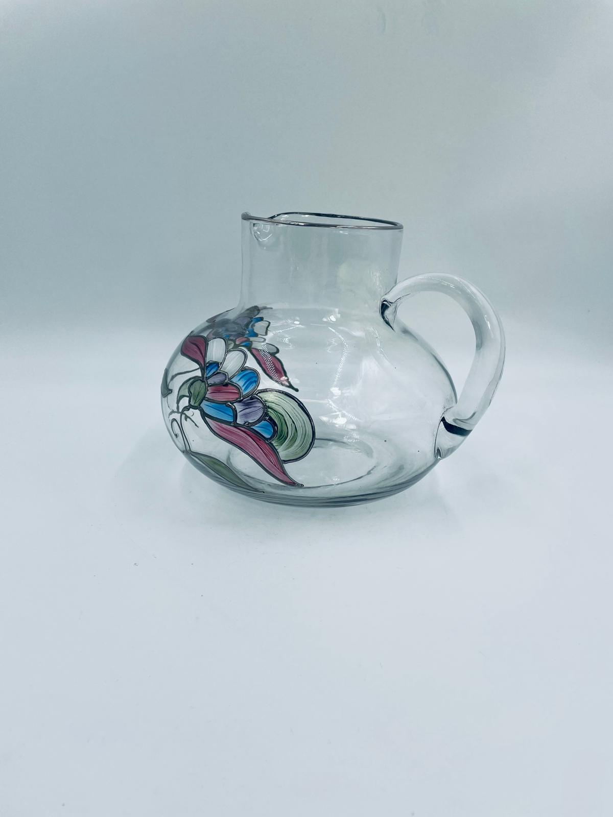 Dzbanek do soku marki Crystal Clear w stylu Tiffany’ego, wykonany z wysokiej jakości szkła kryształowego. Dzbanek klasyczny, elegancki, ozdobiony ręcznie malowanymi farbami wzorem kwiatowym, wykończony srebrną obwódką na kwiatach oraz na górnym rancie.