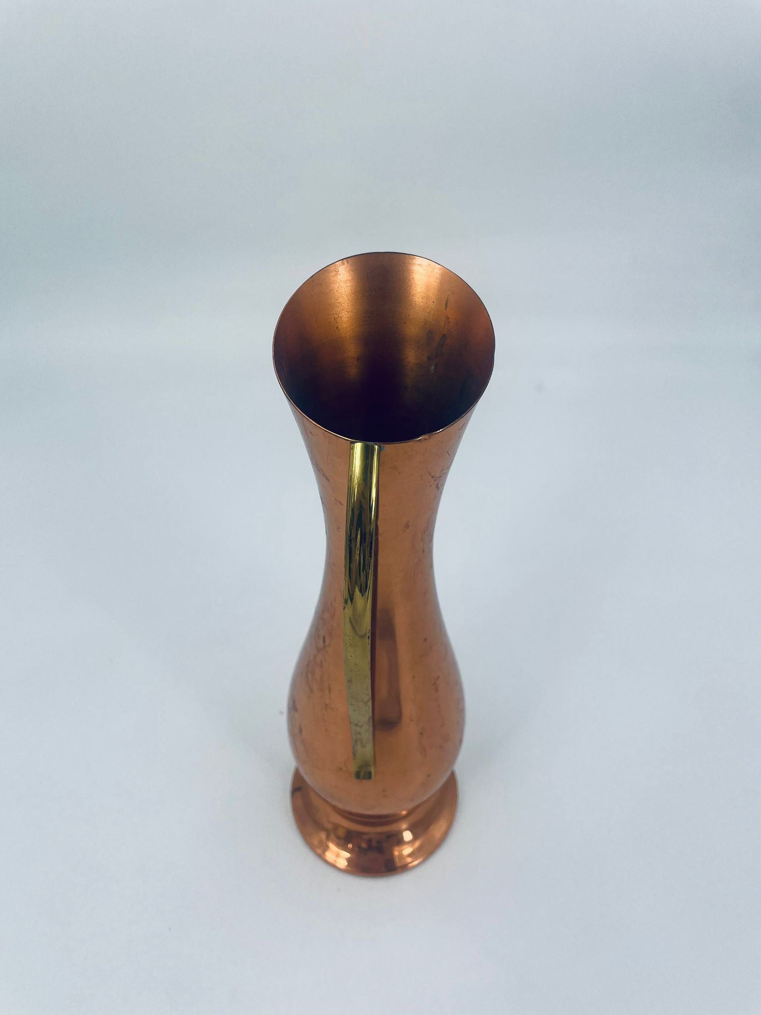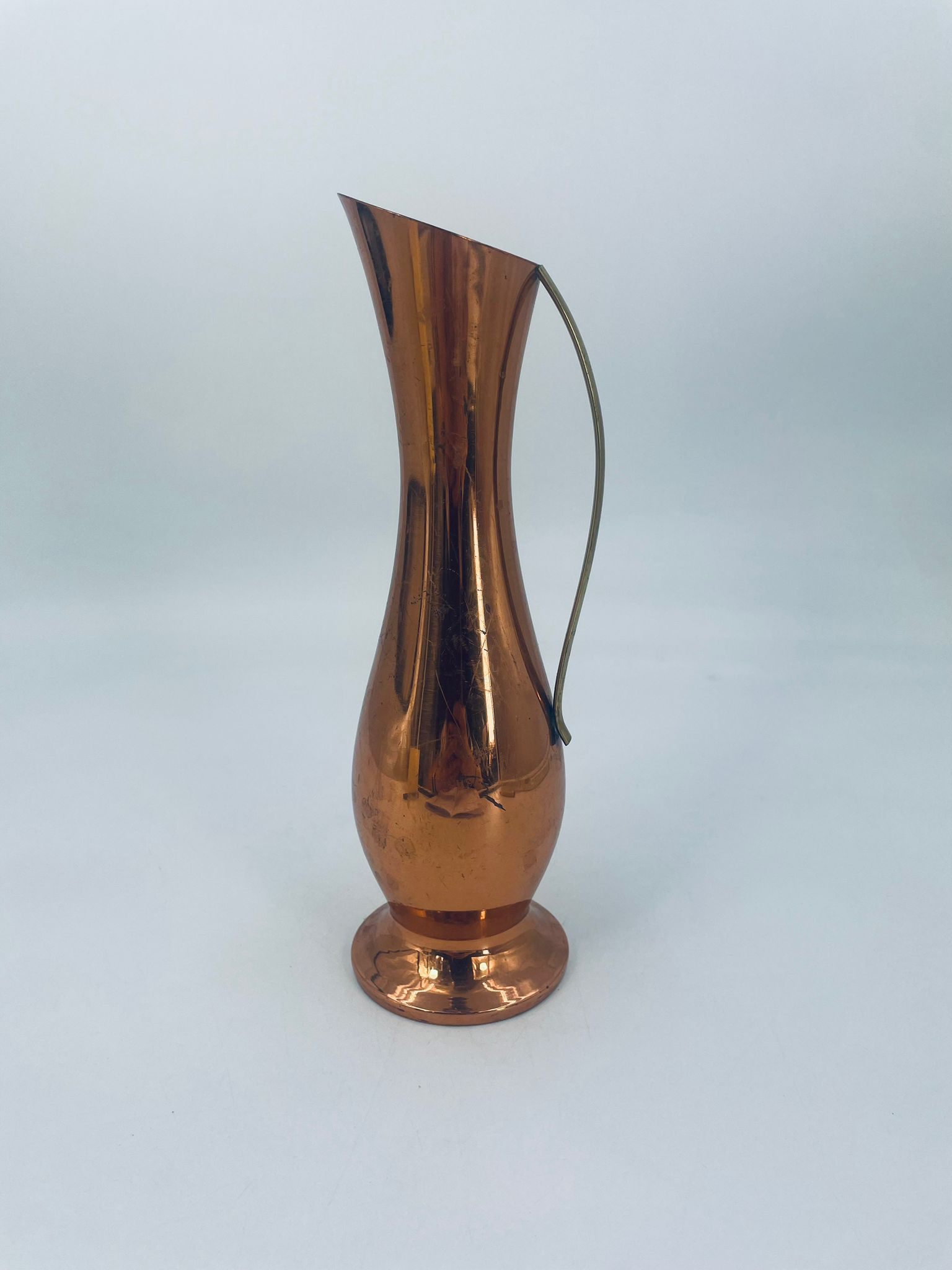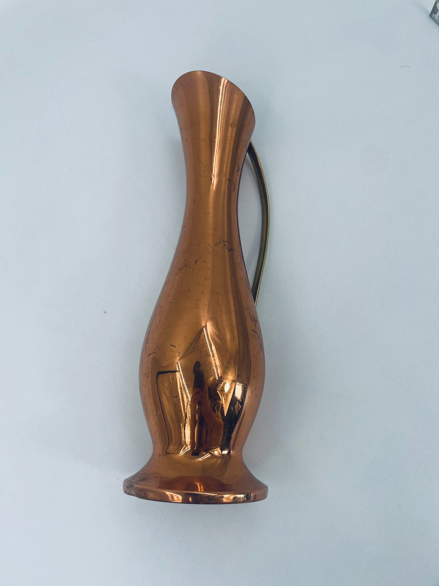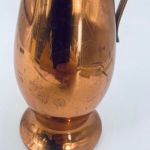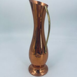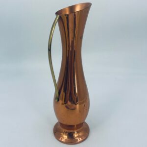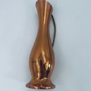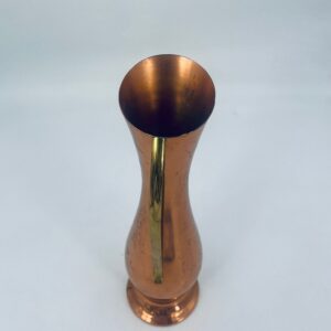 Dzbanek, wazon w stylu retro/vintage, wykonany z miedzi, co nadaje mu elegancki, ciepły, metaliczny połysk. Ma wydłużony, smukły kształt z rozszerzoną podstawą i delikatnie ukośnym wylotem. Przedmiot posiada prosty, metalowy uchwyt. Dzbanek ma zarysowania.