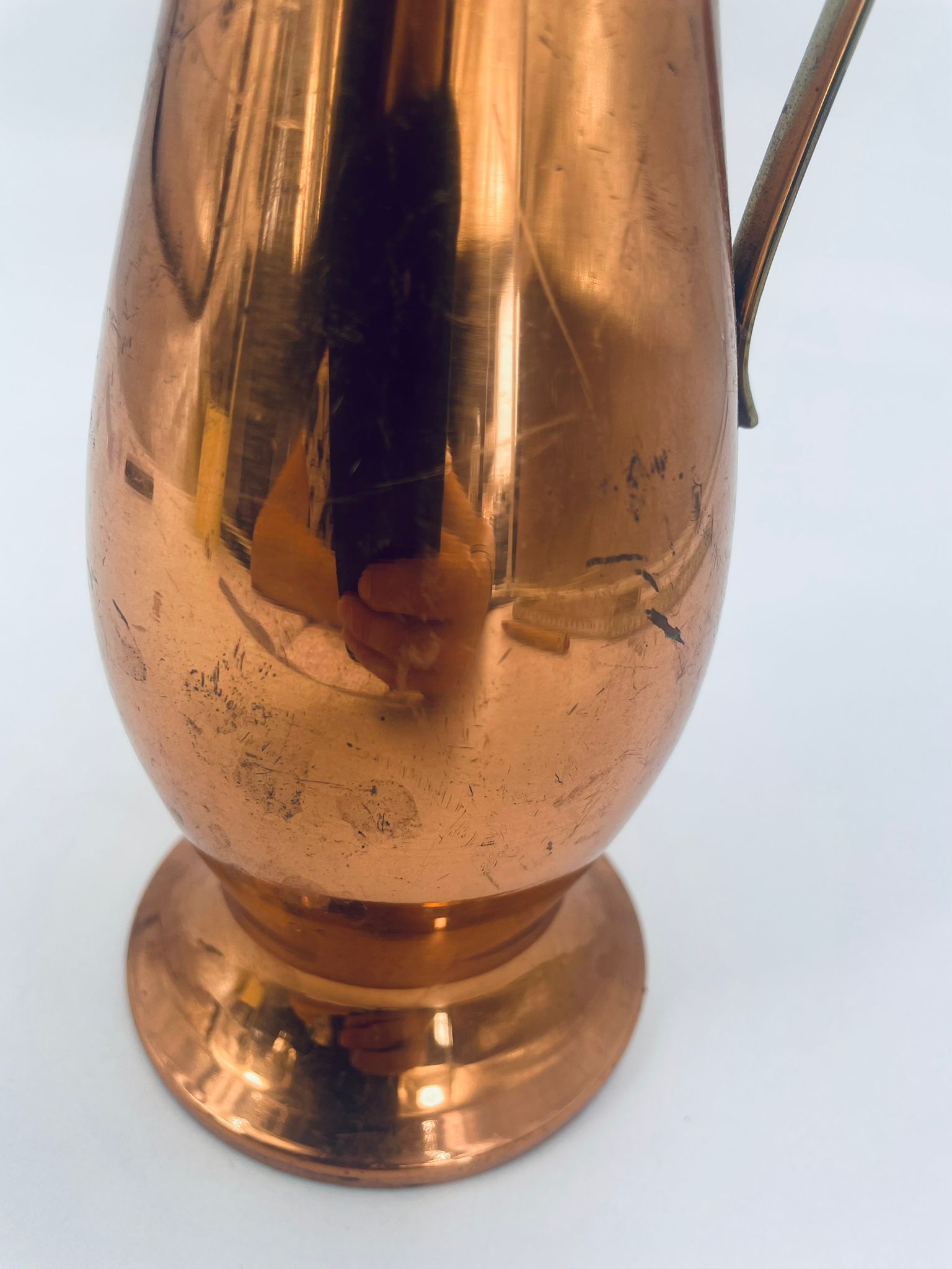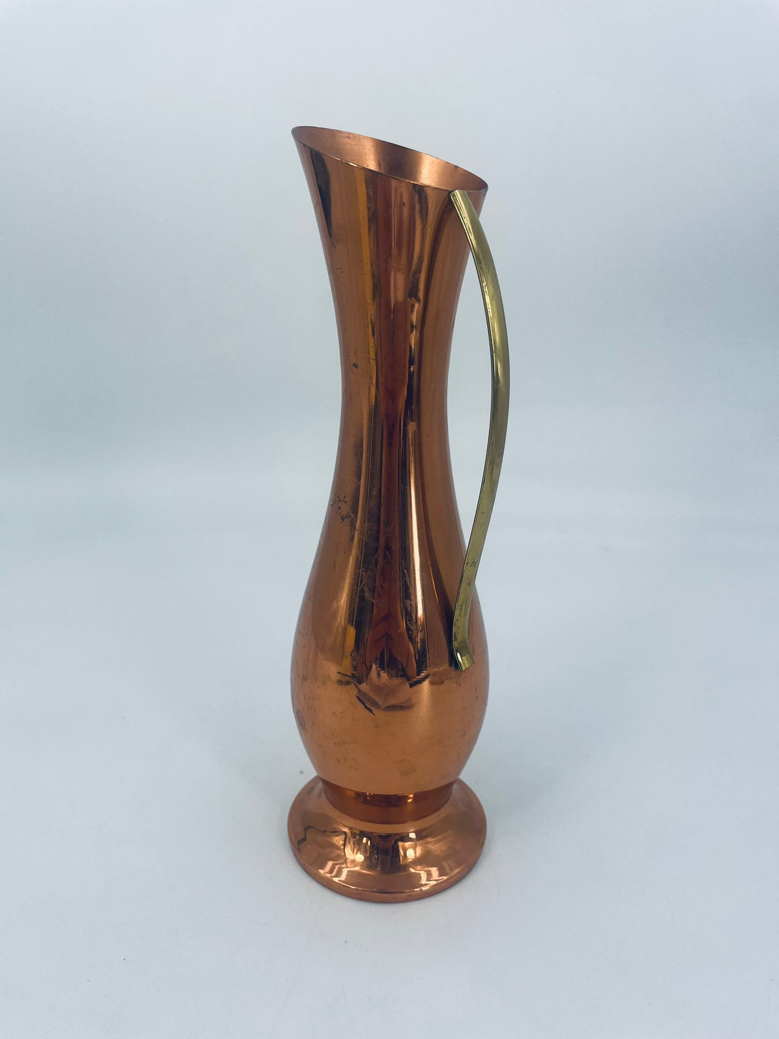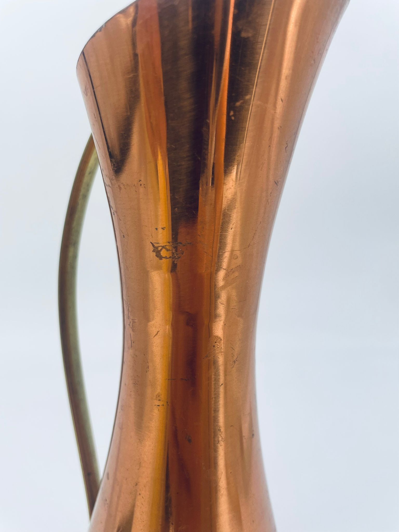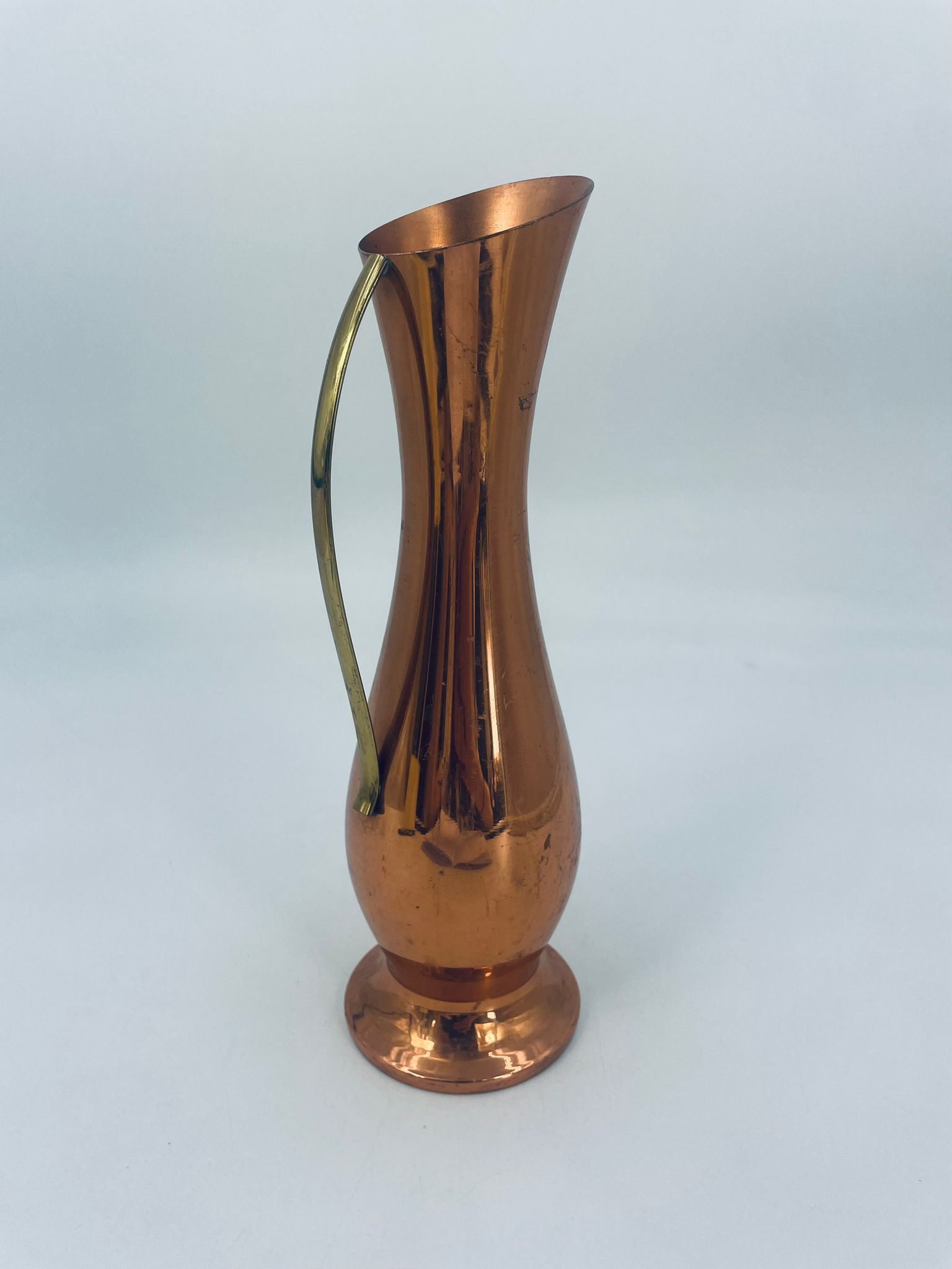 Dzbanek, wazon w stylu retro/vintage, wykonany z miedzi, co nadaje mu elegancki, ciepły, metaliczny połysk. Ma wydłużony, smukły kształt z rozszerzoną podstawą i delikatnie ukośnym wylotem. Przedmiot posiada prosty, metalowy uchwyt. Dzbanek ma zarysowania.