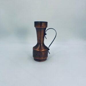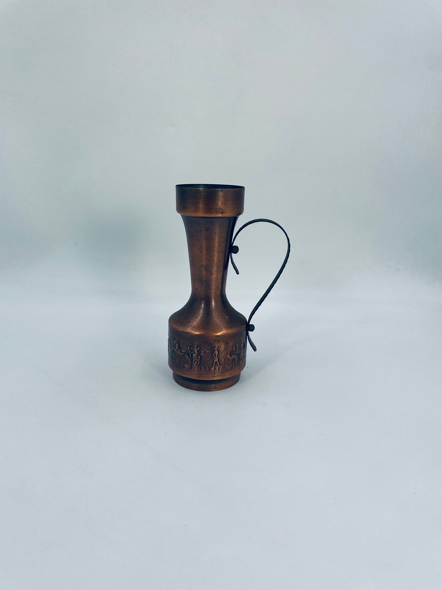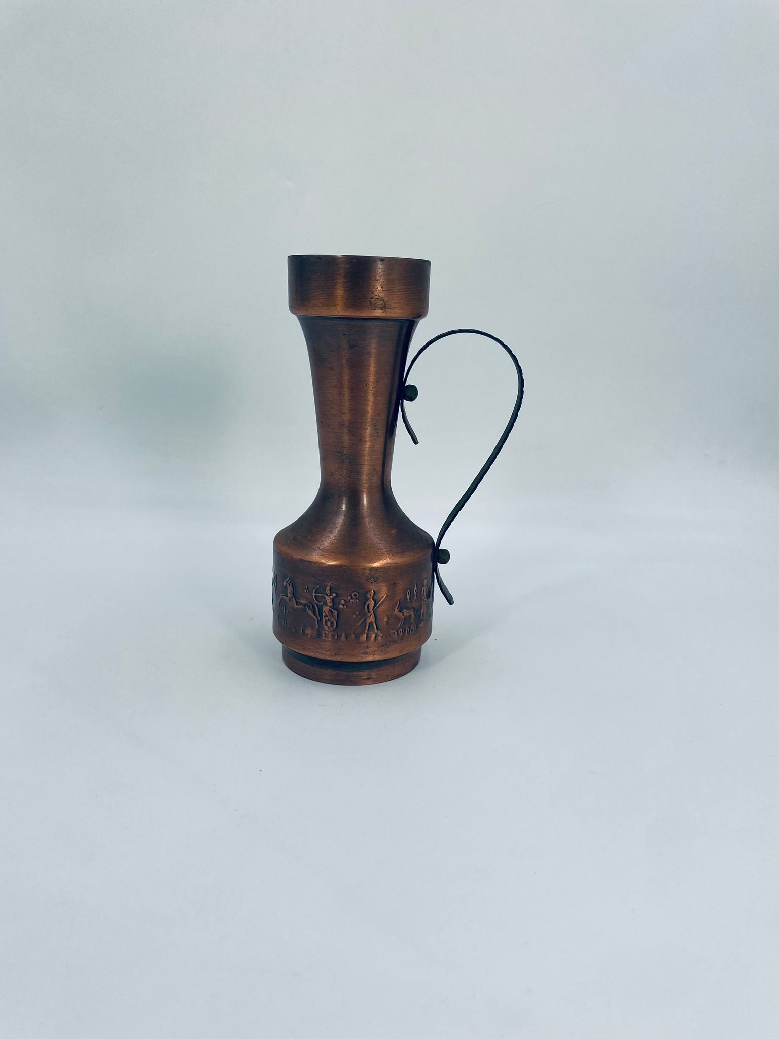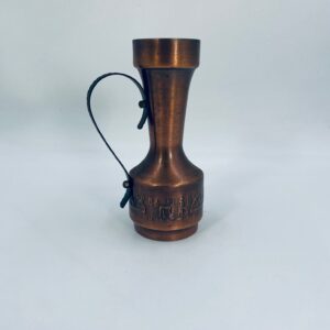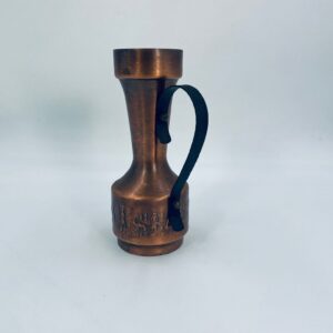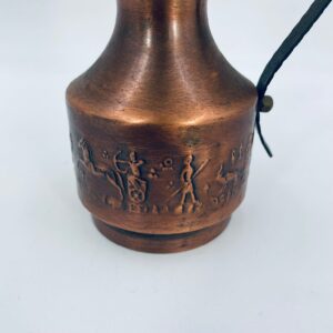 Dzbanek, wazon w stylu Vintage, wykonany z mosiądzu. Dzbanek o dekoracyjnym kształcie z szerszą podstawą, zwężającą się środka częścią i rozszerzającym wylotem. Uchwyt prawdopodobnie wykonany z kutego metalu. W dolej części korpusu znajduje się ozdobny, tłoczony wzór przedstawiający stylizowane postacie ludzkie oraz zwierzęta.