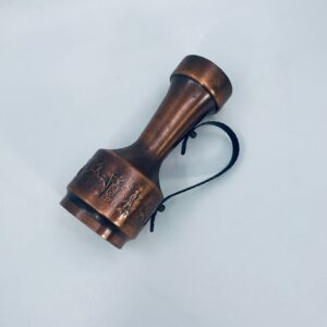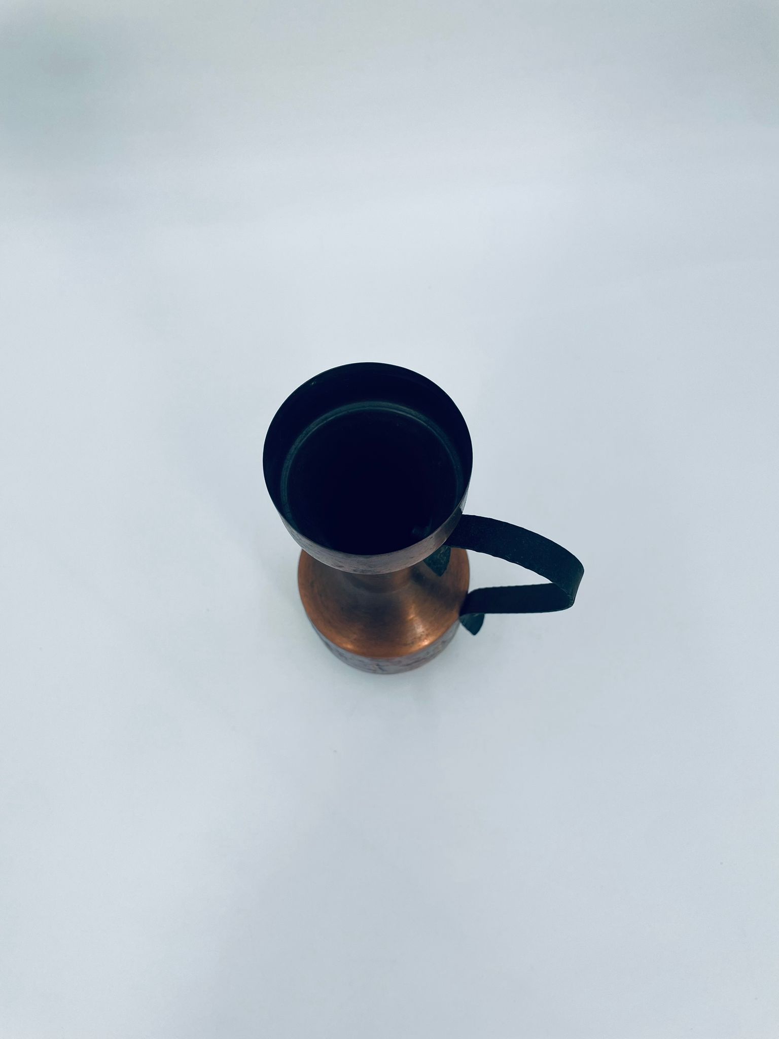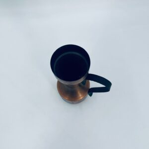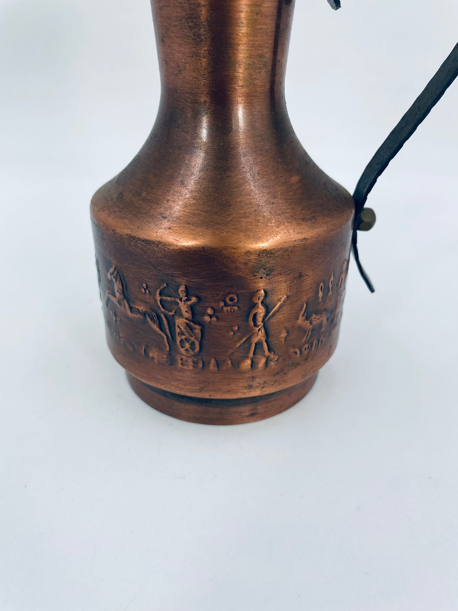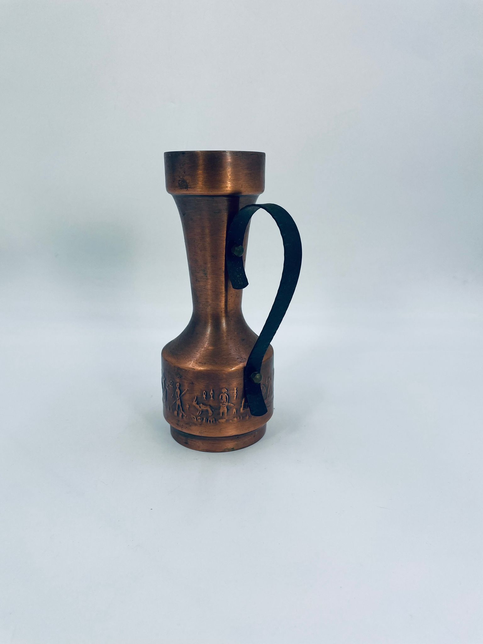 Dzbanek, wazon w stylu Vintage, wykonany z mosiądzu. Dzbanek o dekoracyjnym kształcie z szerszą podstawą, zwężającą się środka częścią i rozszerzającym wylotem. Uchwyt prawdopodobnie wykonany z kutego metalu. W dolej części korpusu znajduje się ozdobny, tłoczony wzór przedstawiający stylizowane postacie ludzkie oraz zwierzęta.
