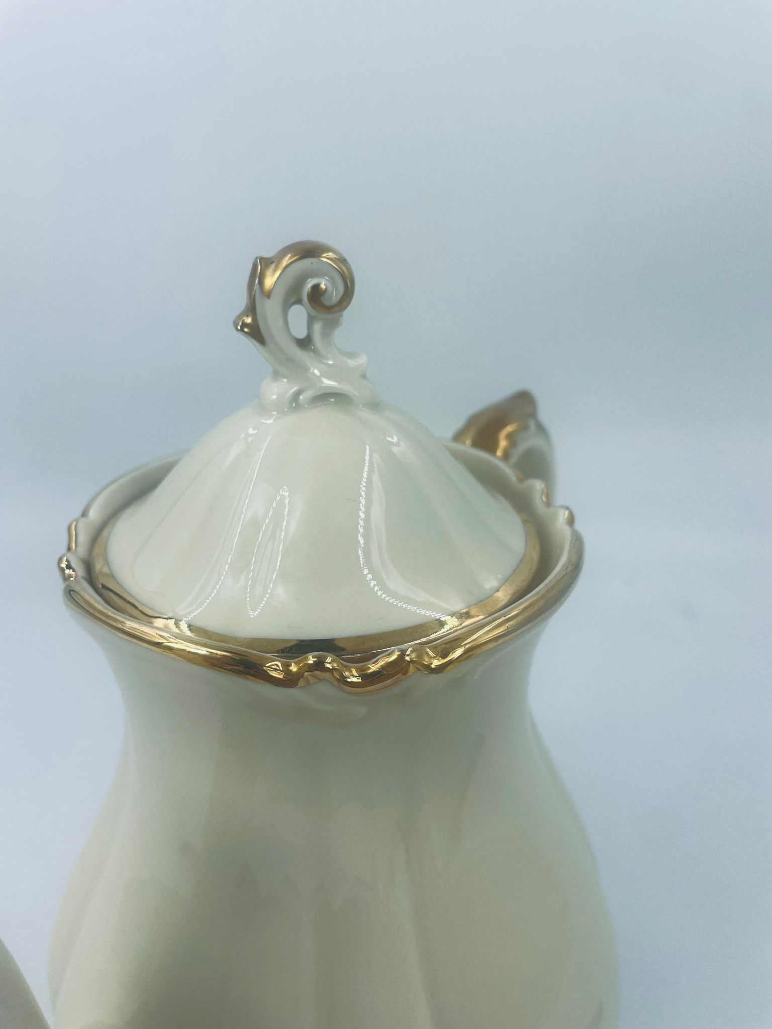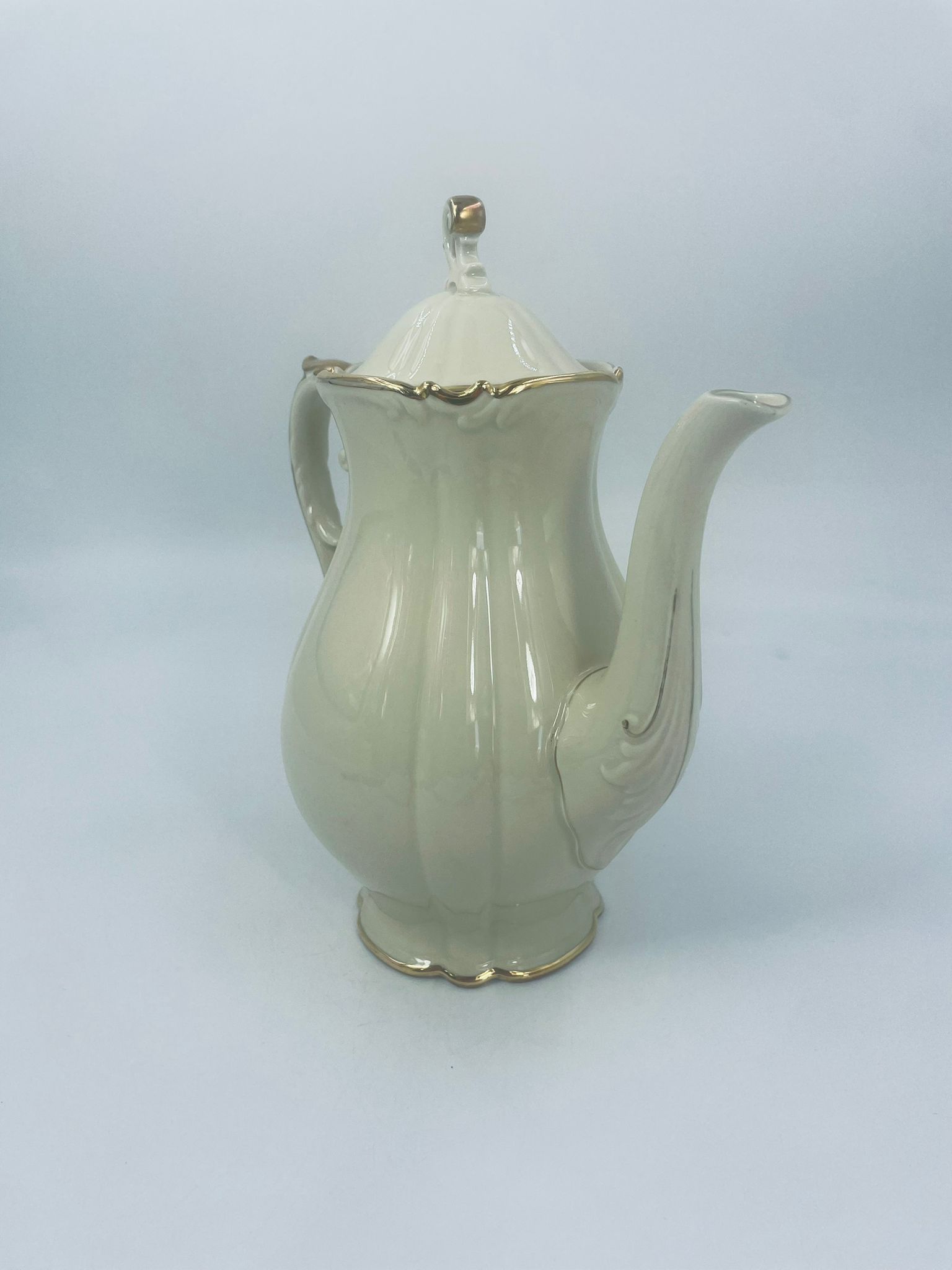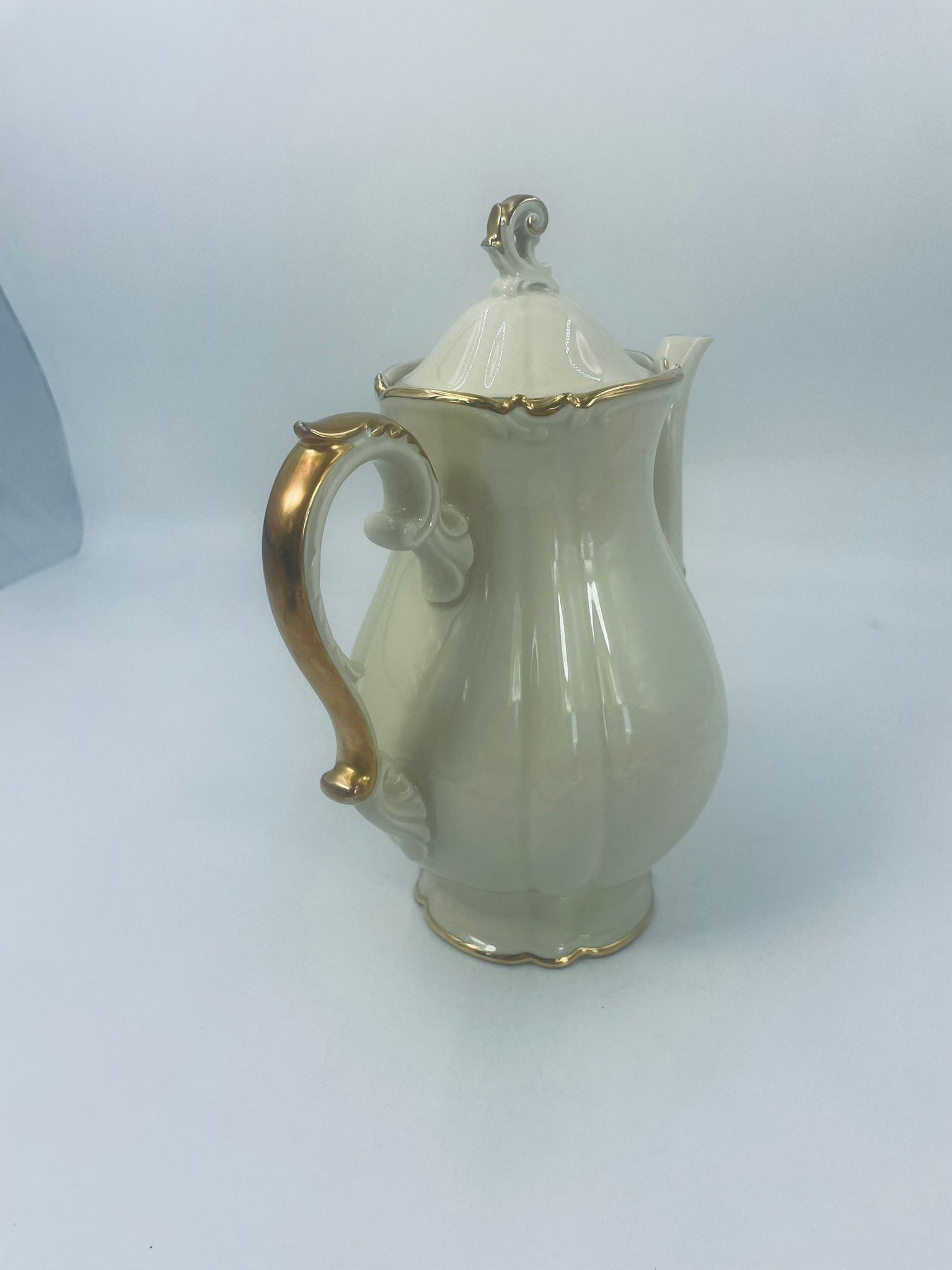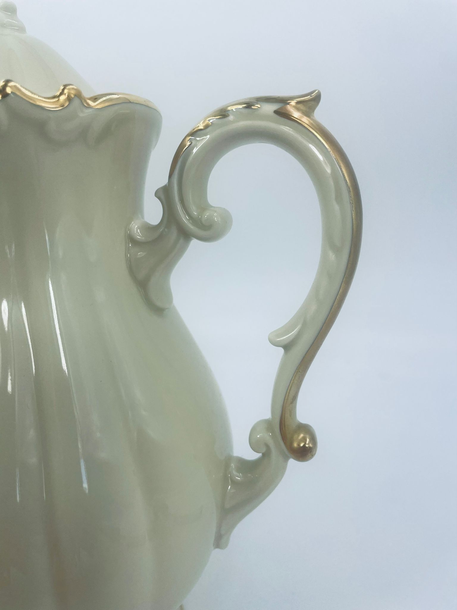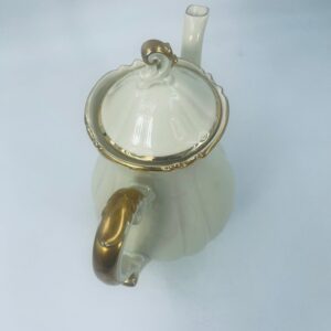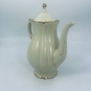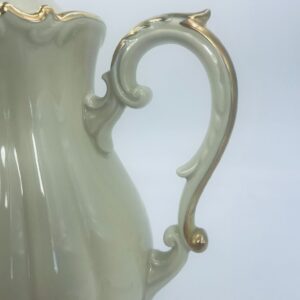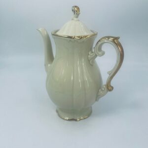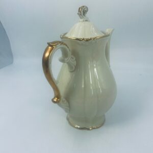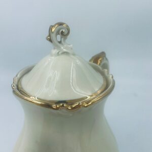 Dzbanek wytwórni Alt Schönwald, wykonany z wysokiej jakości porcelany w kolorze ecru. Posiada eleganckie zdobienia i faliste wykończenia na krawędziach, pozłacane.