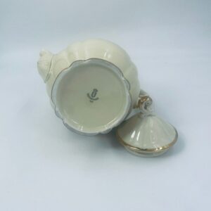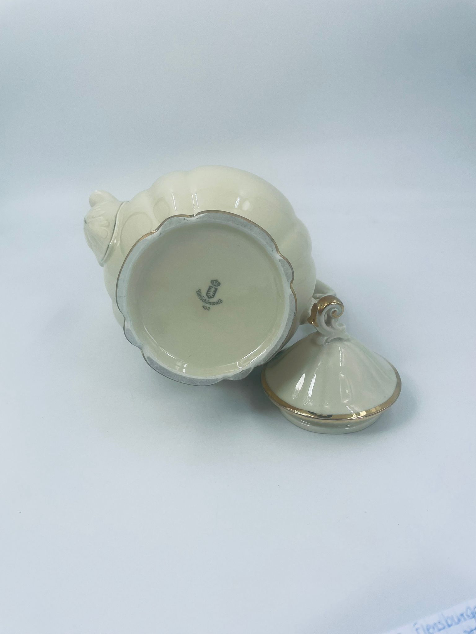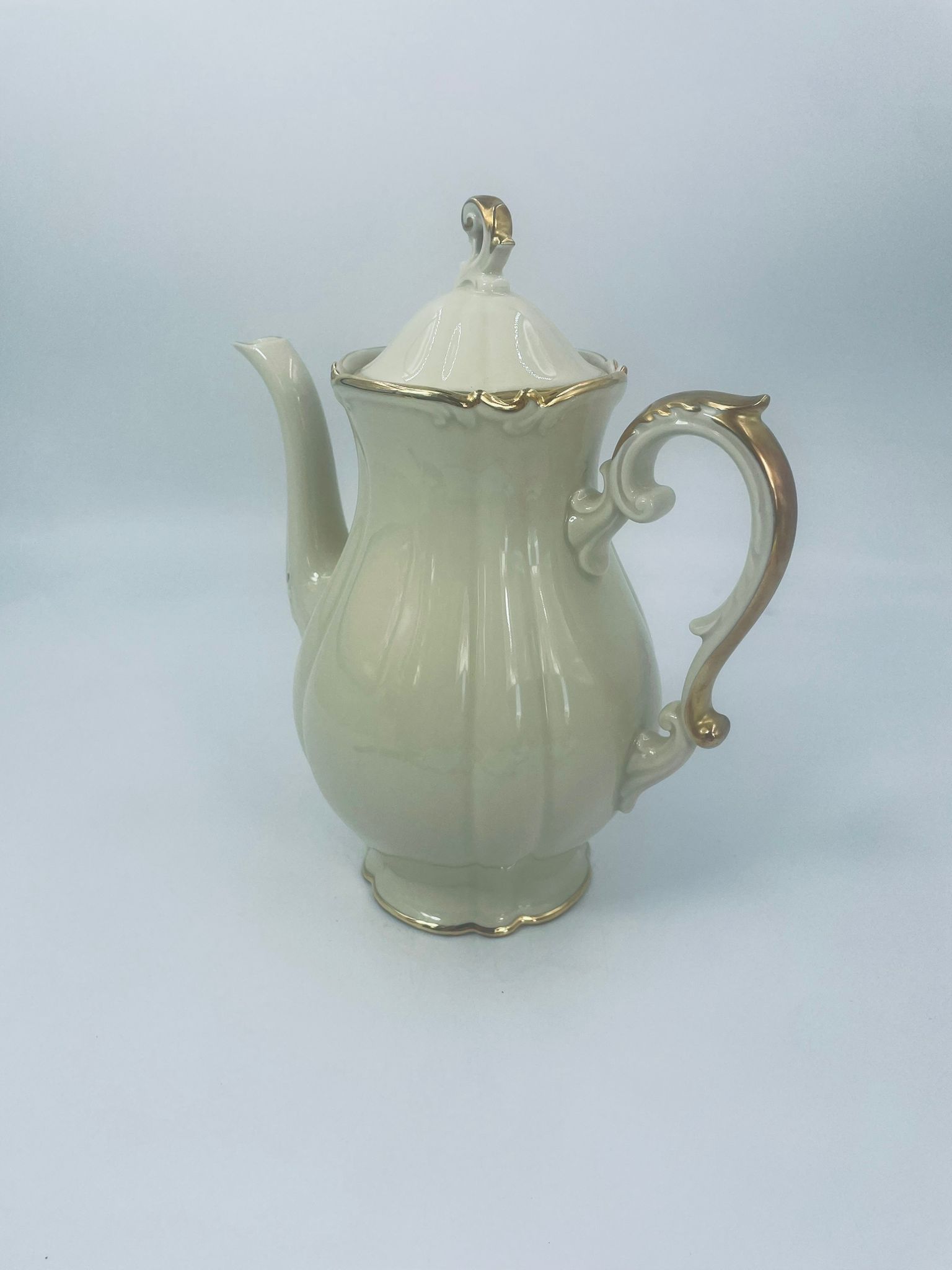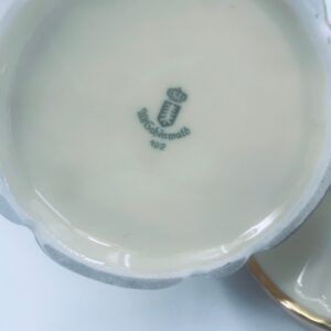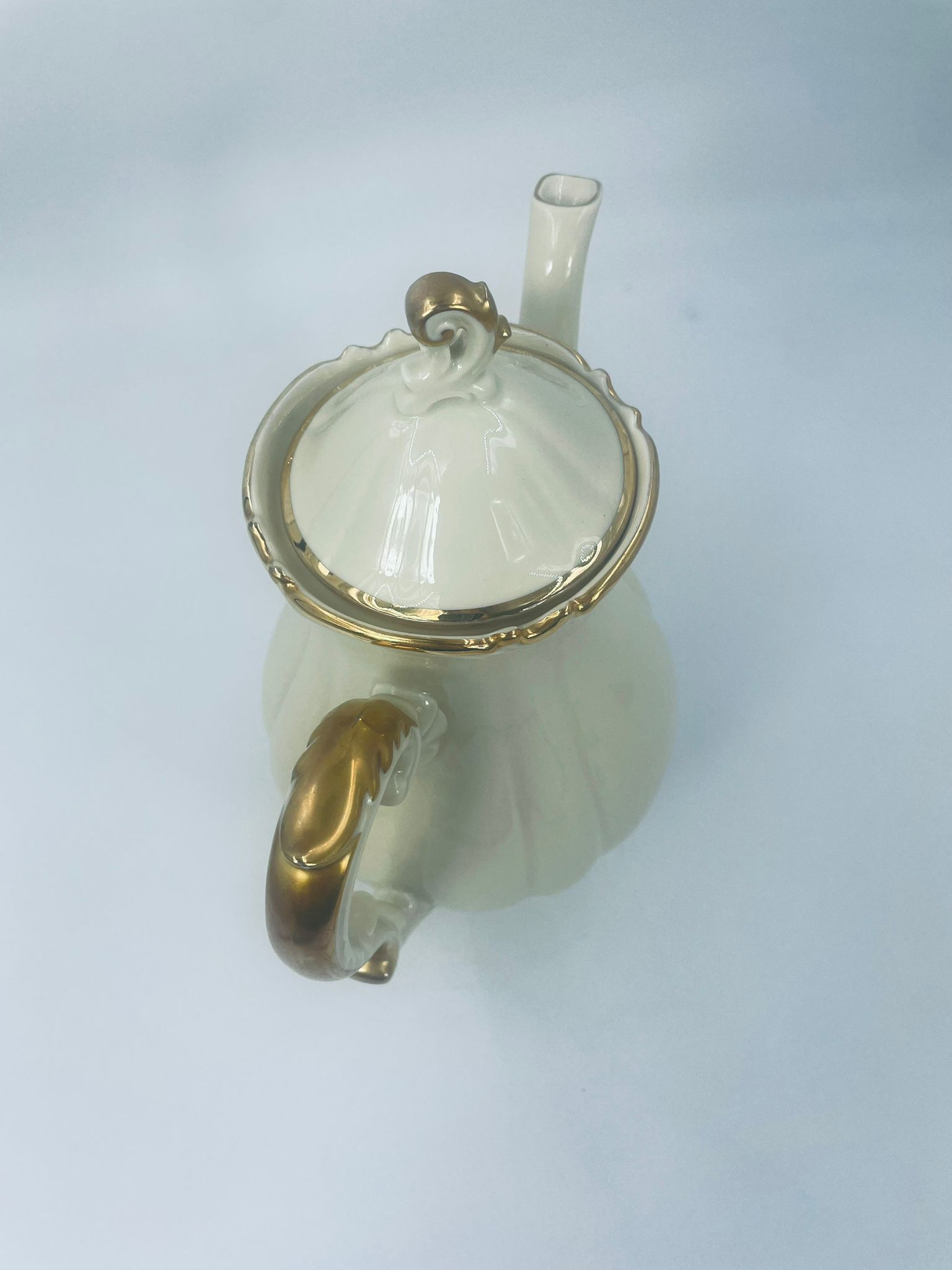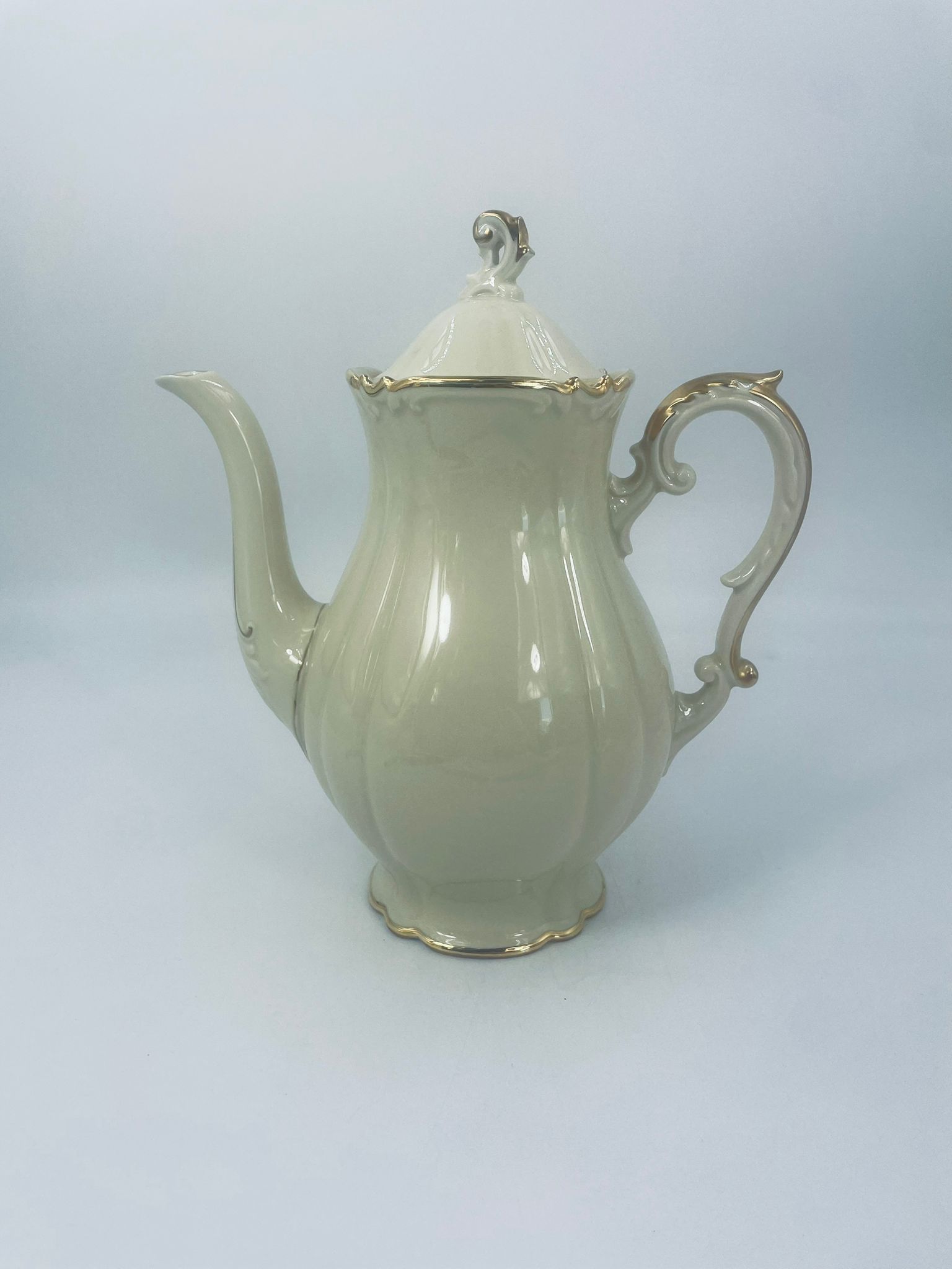 Dzbanek wytwórni Alt Schönwald, wykonany z wysokiej jakości porcelany w kolorze ecru. Posiada eleganckie zdobienia i faliste wykończenia na krawędziach, pozłacane.