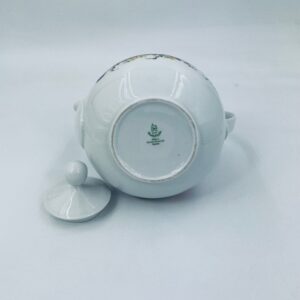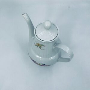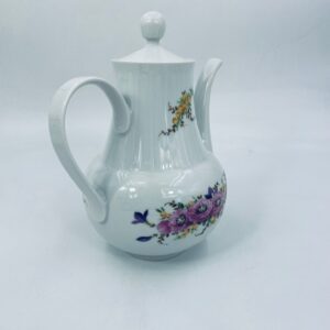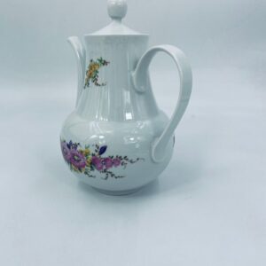 Porcelanowy dzbanek wytwórni Hanneberg Porzellan w białym kolorze z motywem kwiatowym, wyprodukowany w latach 70tych. Imbryk charakteryzuje się prostymi liniami i jest wykonany w stylu Mid Century.