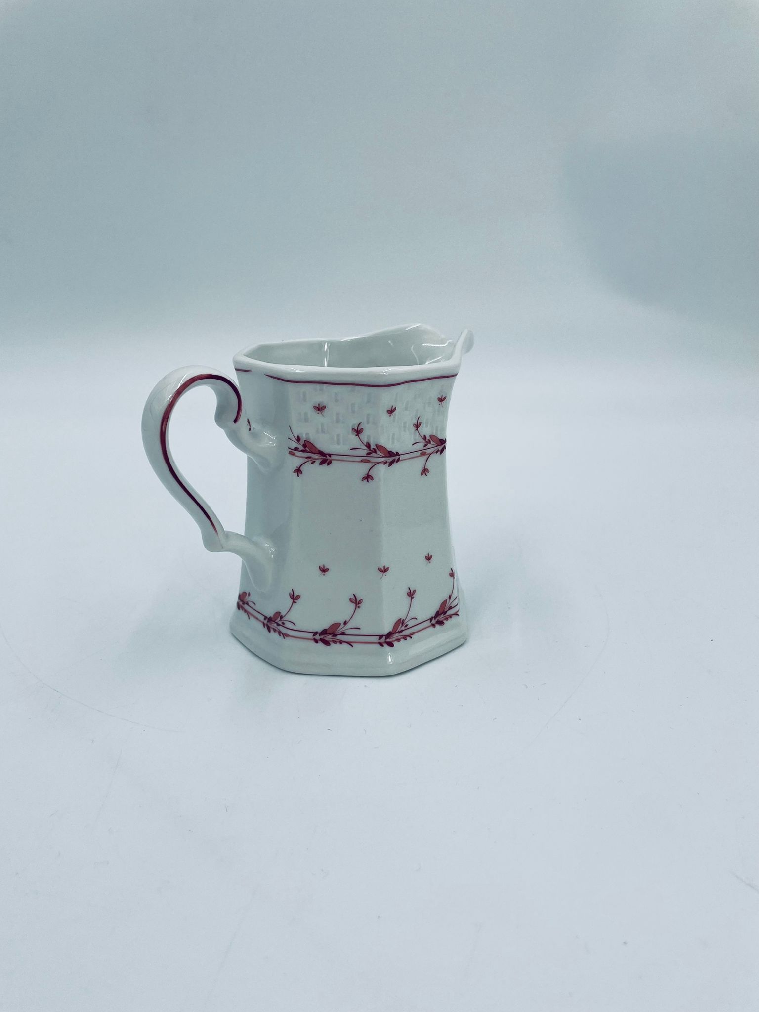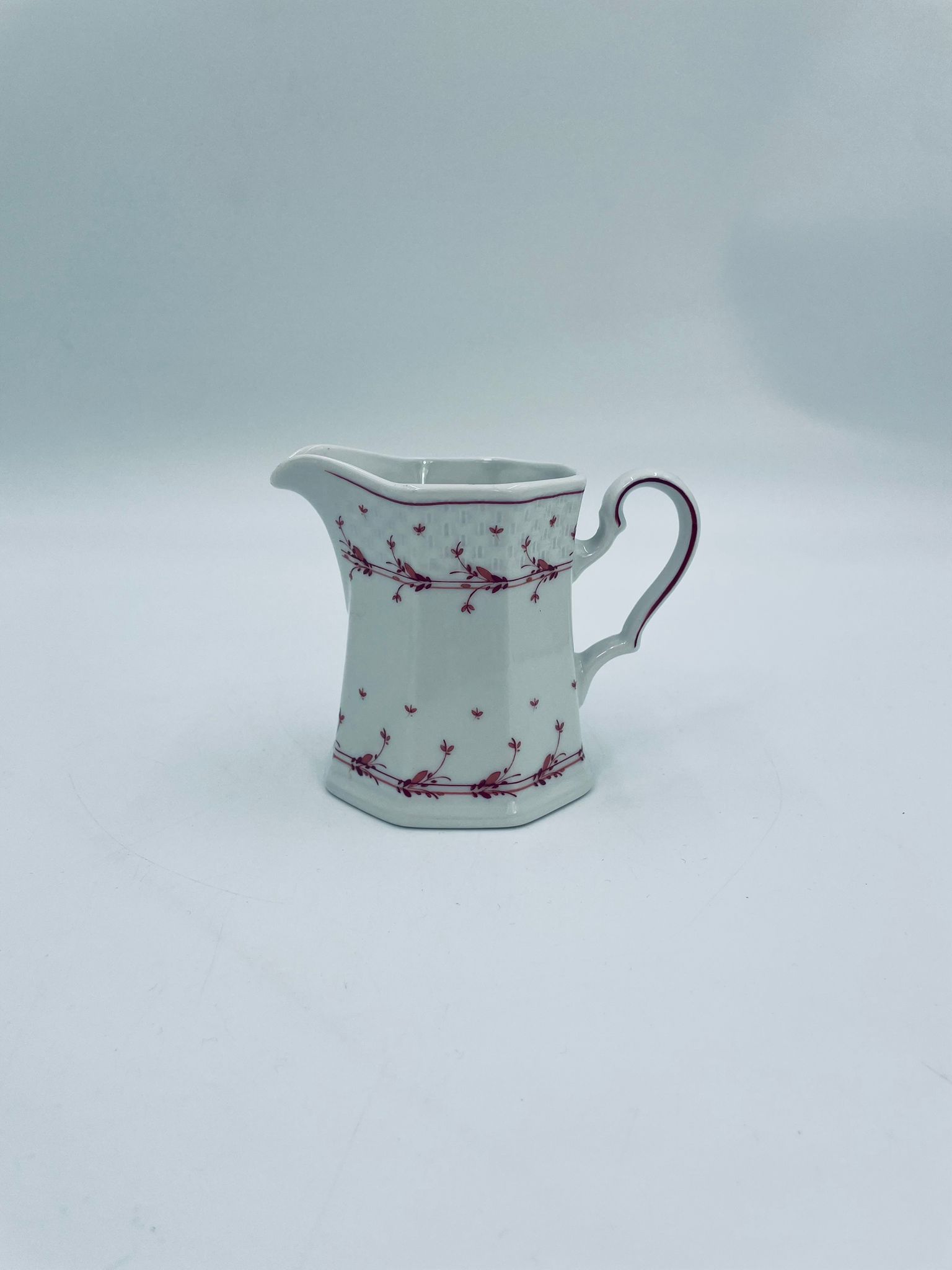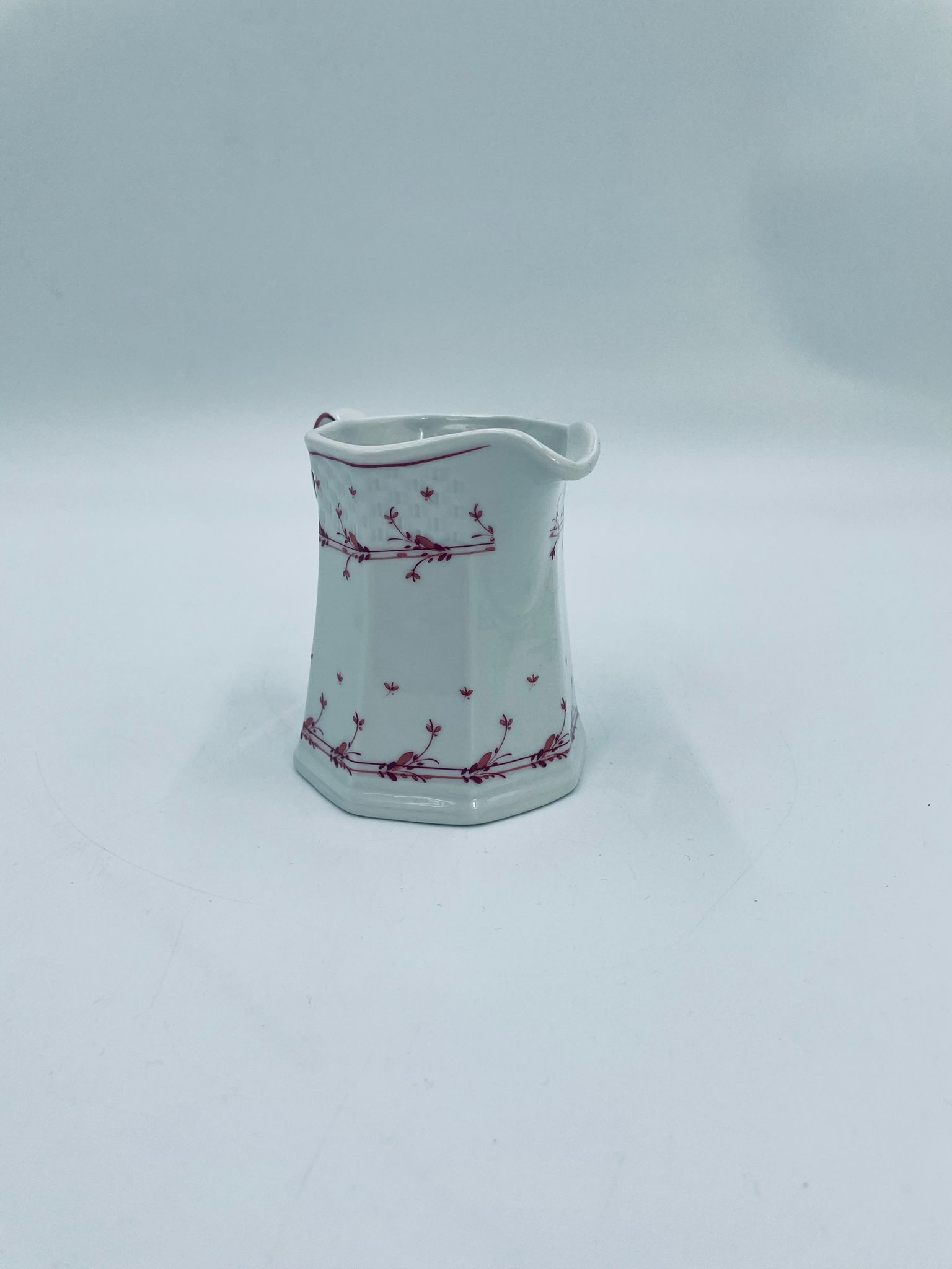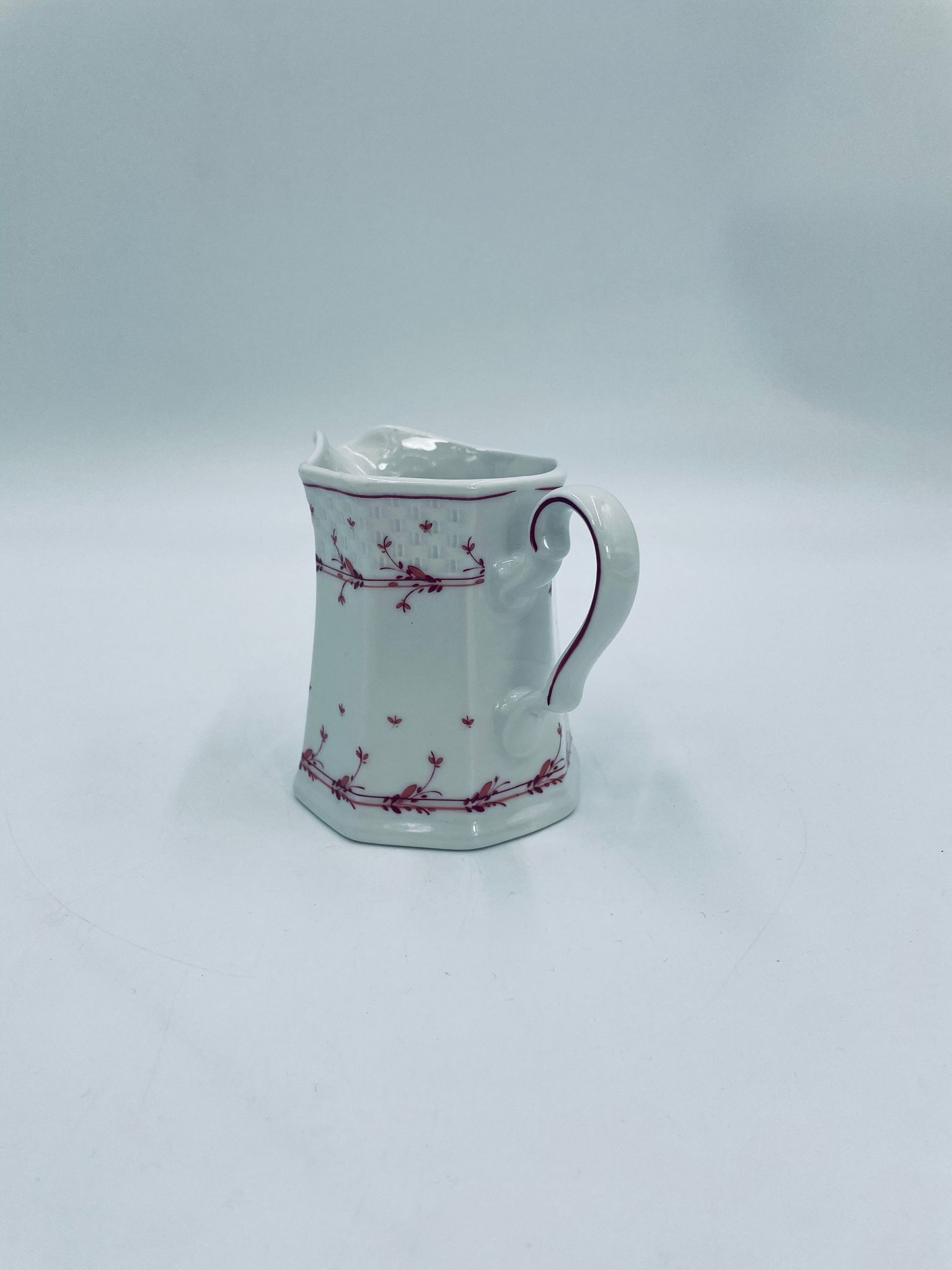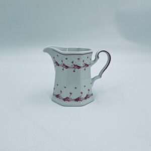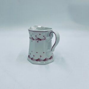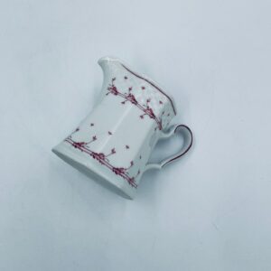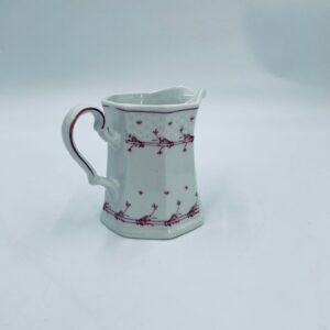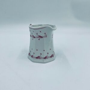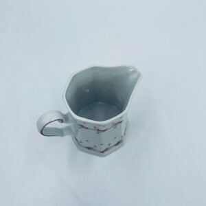Dzbanuszek do mleka wytwórni Winterling Röslau, wykonany z wysokie jakości białej porcelany. Mlecznik posiada charakterystyczny, wielościenne korpus, ręcznie malowane wzory roślinne w bordowym kolorze, ozdobne reliefy oraz profilowany uchwyt.
