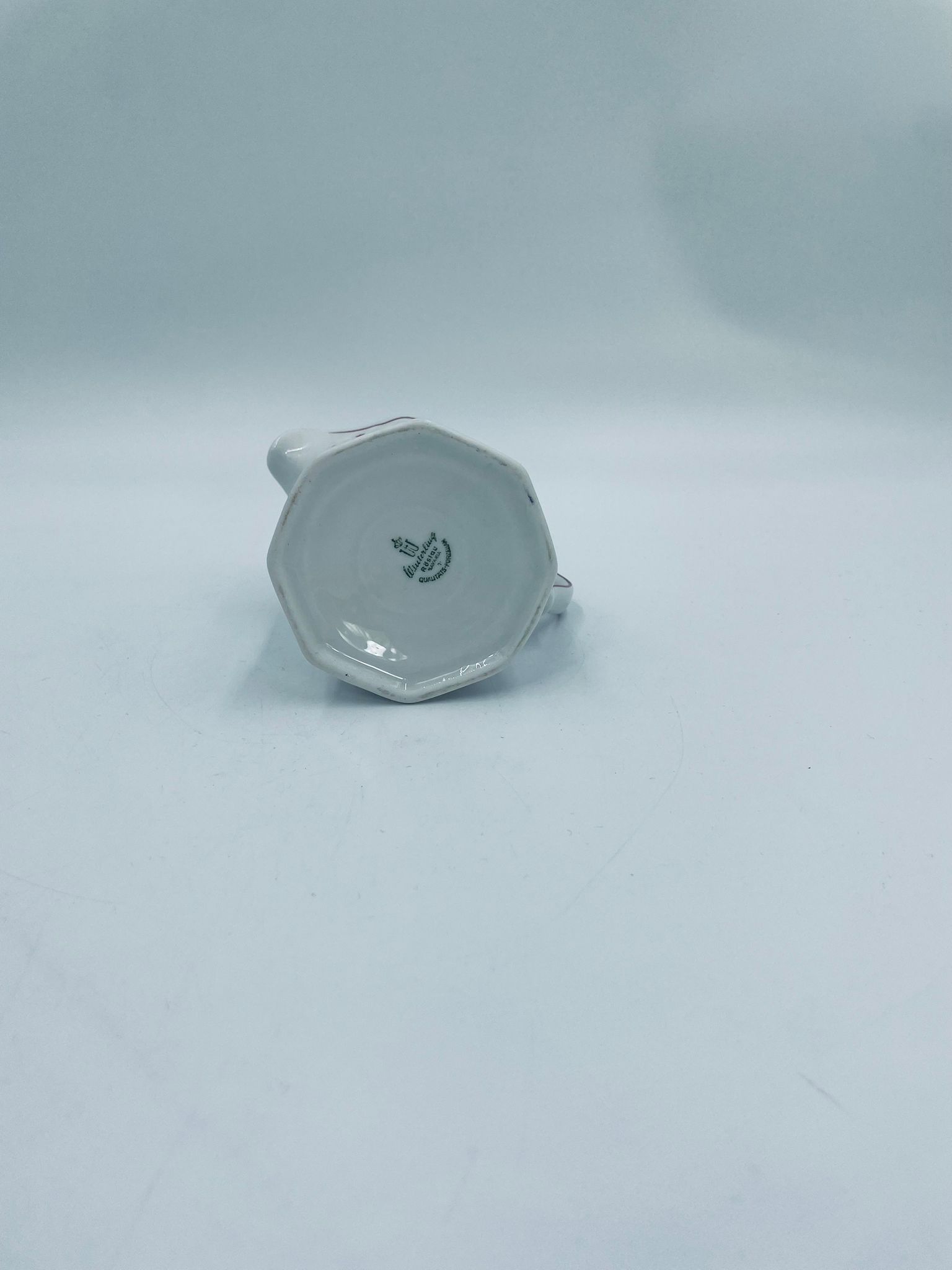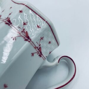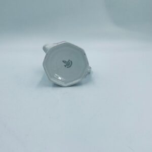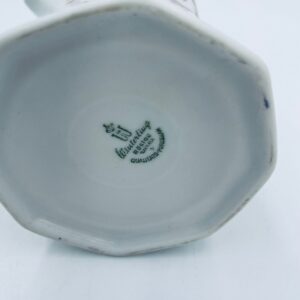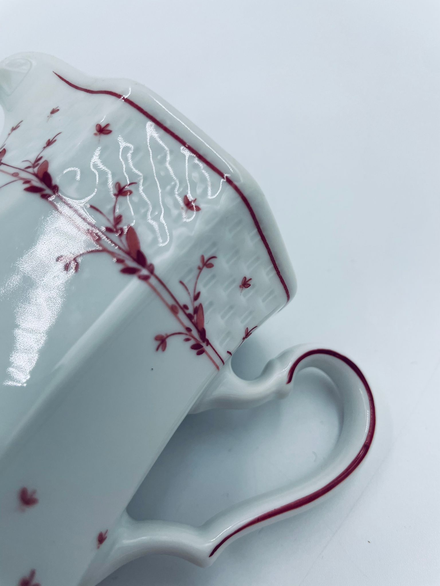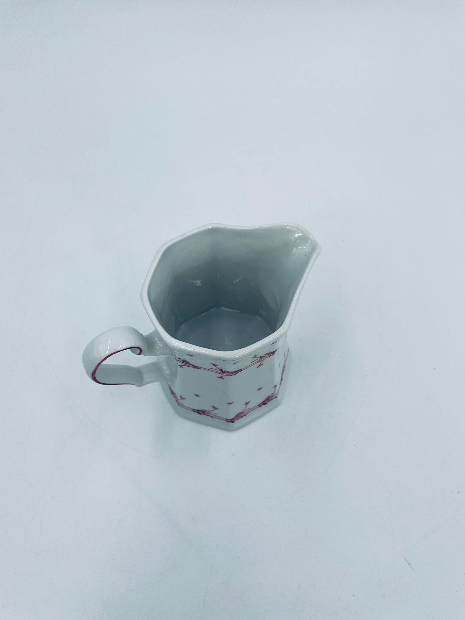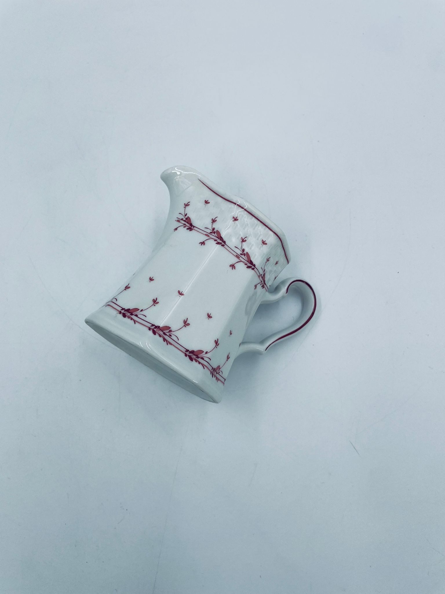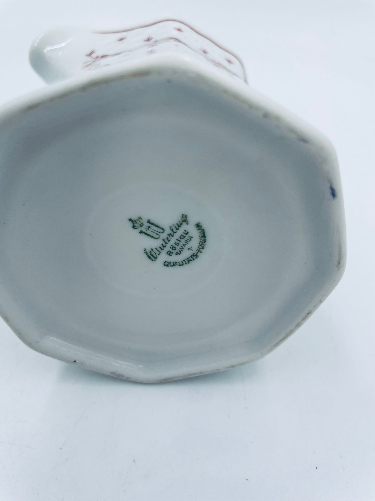 Dzbanuszek do mleka wytwórni Winterling Röslau, wykonany z wysokie jakości białej porcelany. Mlecznik posiada charakterystyczny, wielościenne korpus, ręcznie malowane wzory roślinne w bordowym kolorze, ozdobne reliefy oraz profilowany uchwyt.