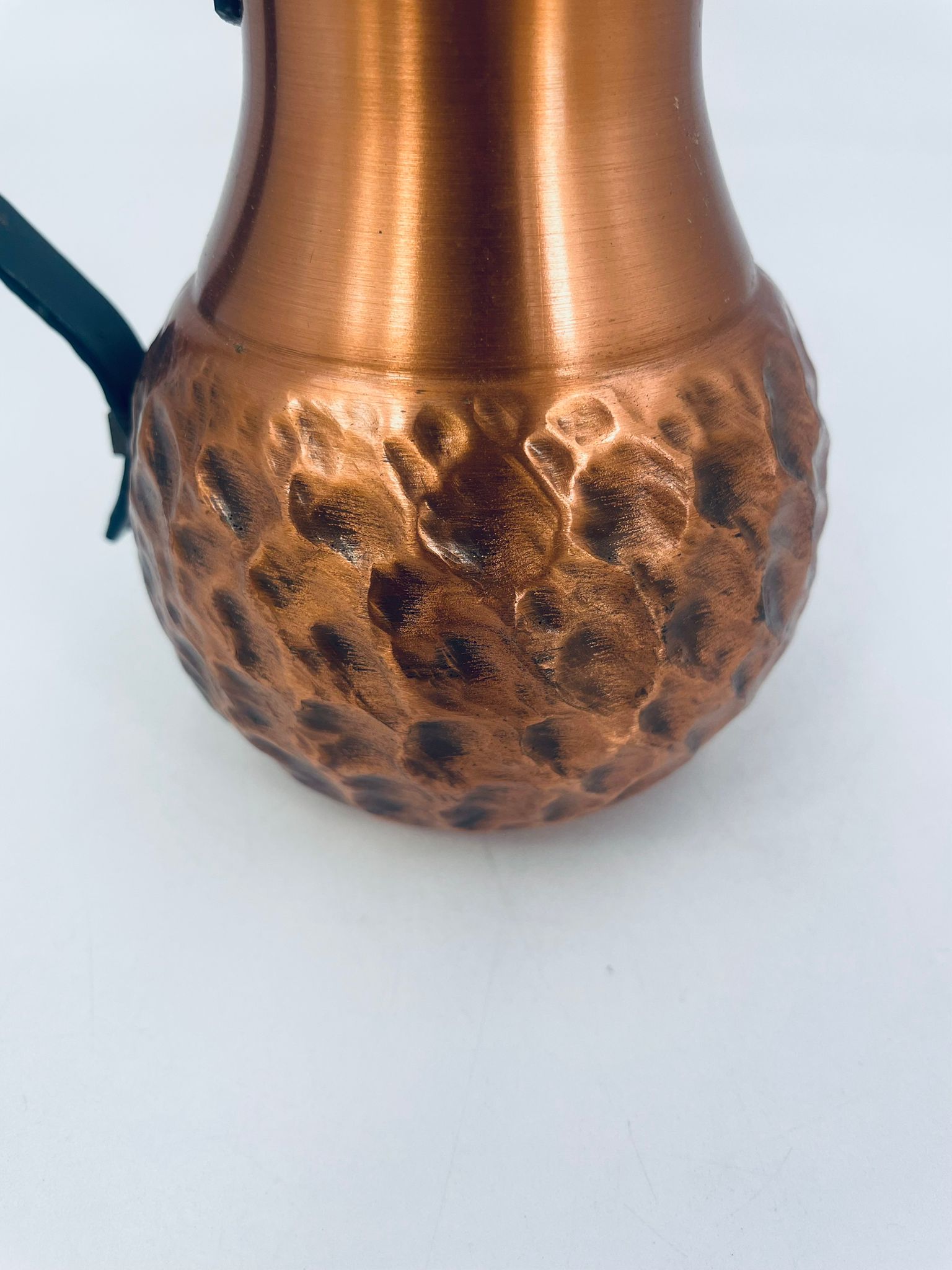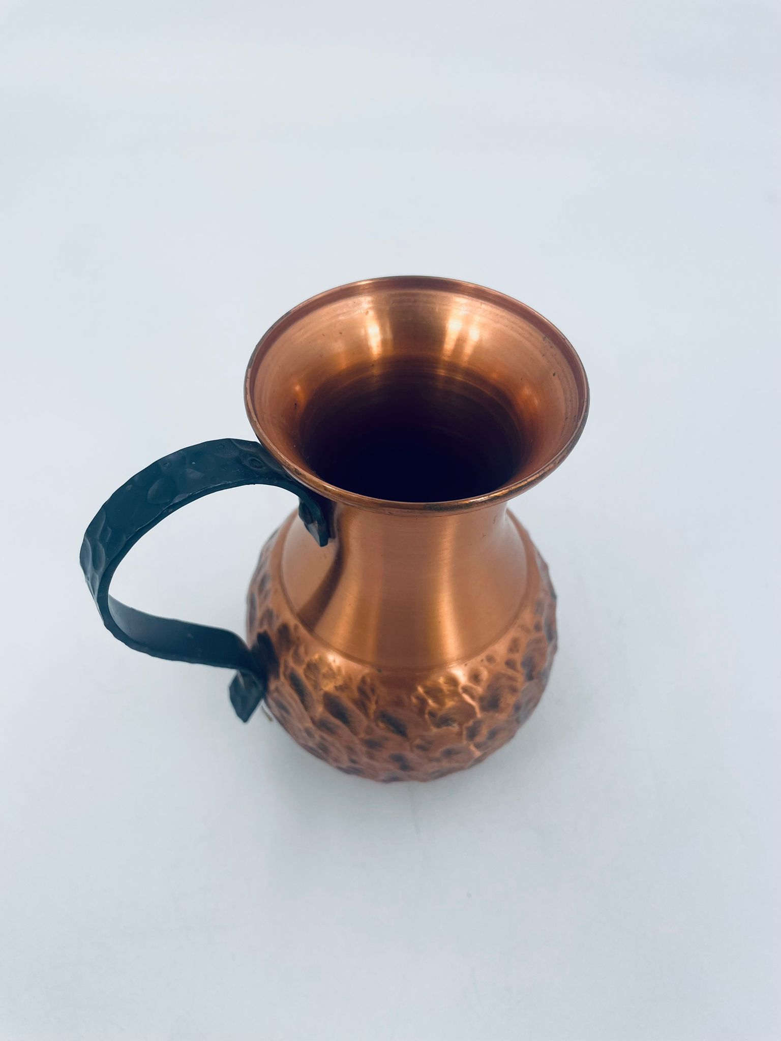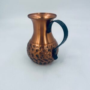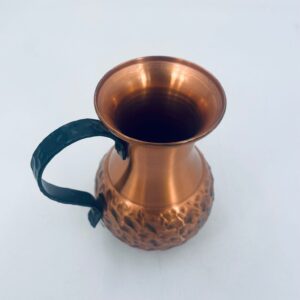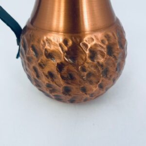 Dzbanuszek miedziany w stylu Vintage z młotkowaną powierzchnią na korpusie dzbanka i uchwytem w ciemnym kolorze.