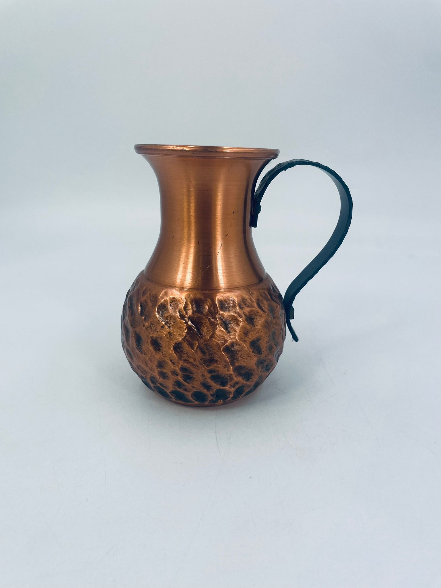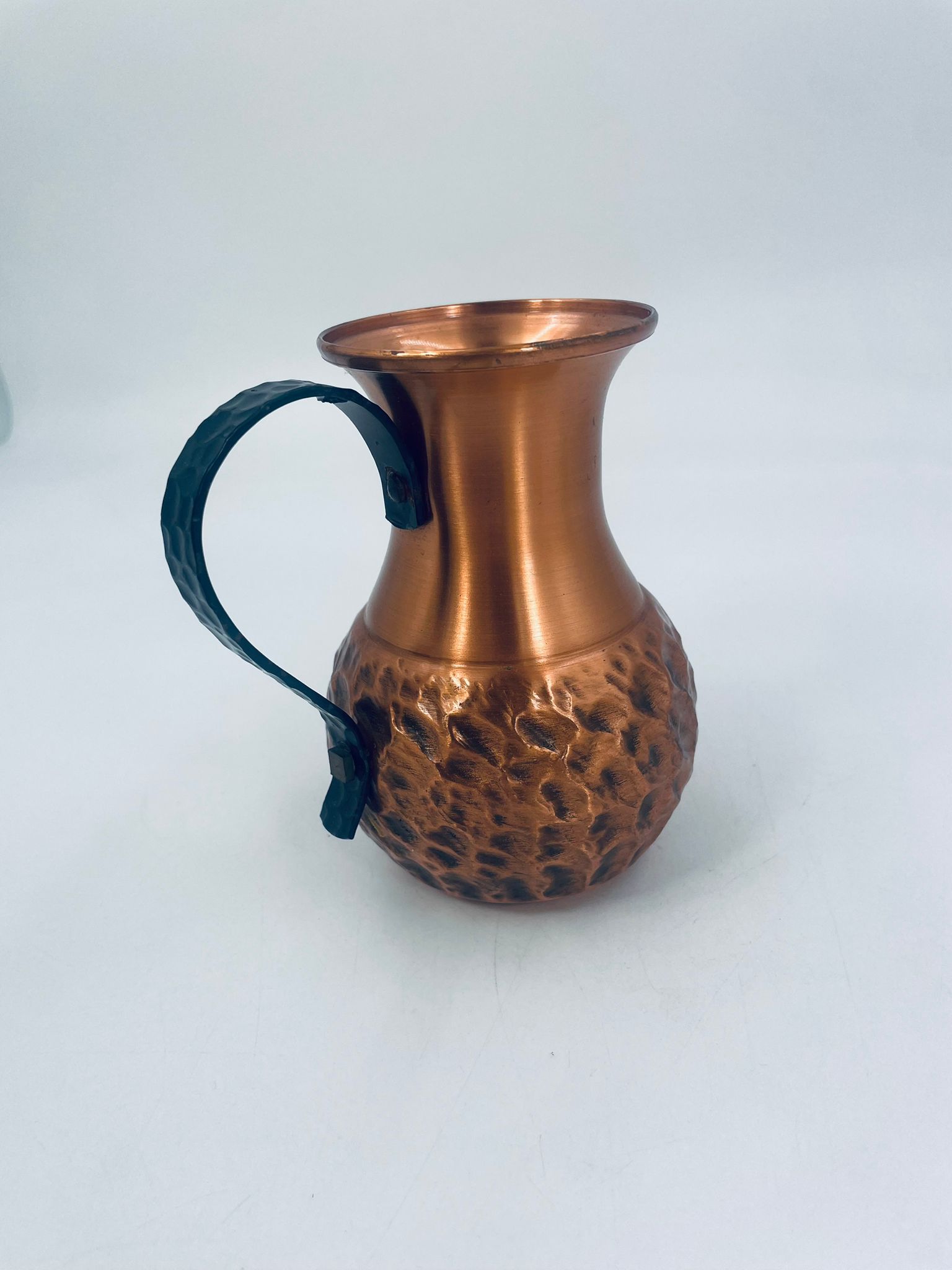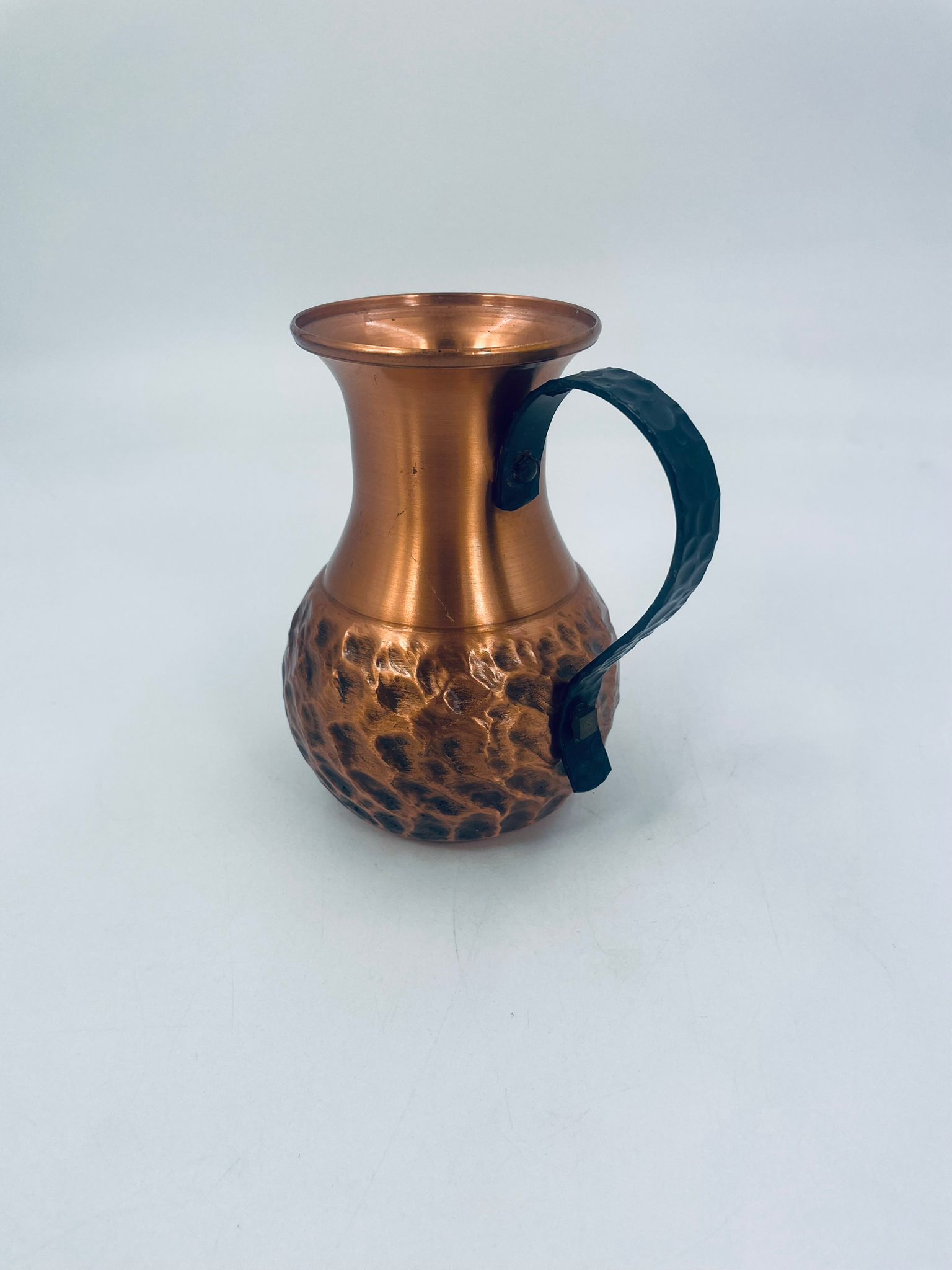 Dzbanuszek miedziany w stylu Vintage z młotkowaną powierzchnią na korpusie dzbanka i uchwytem w ciemnym kolorze.