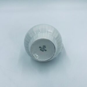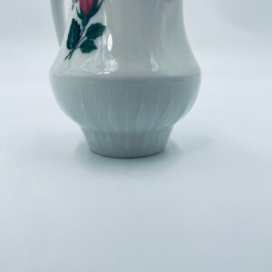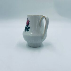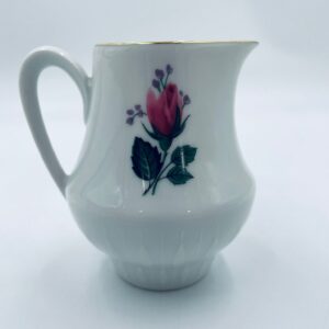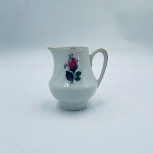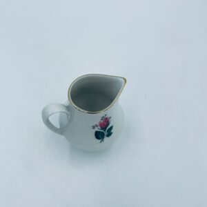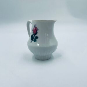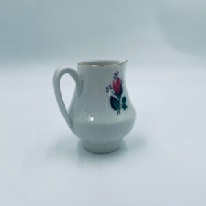 Dzbanuszek na mleko wytwórni Scherzer Bavaria, wykonany z wysokiej jakosci białej porcelany. Mlecznik Ozdobiony jest dekoracją różowych róż, fioletowymi drobnymi kwiatkami i zielonymi listkami oraz dekoracyjną fakturą w dolnej części, wykończony złoceniem na rancie.