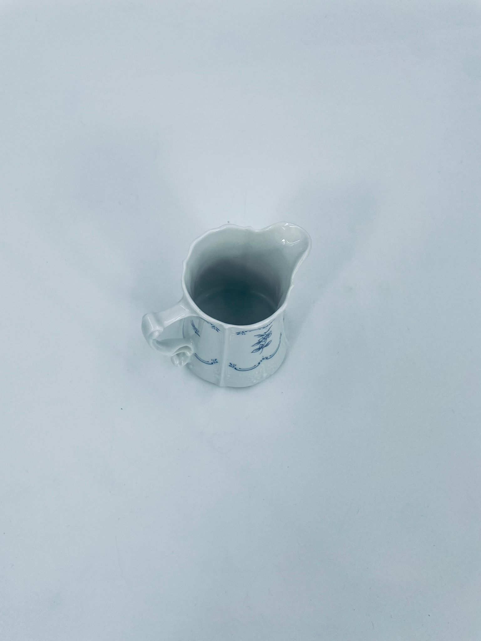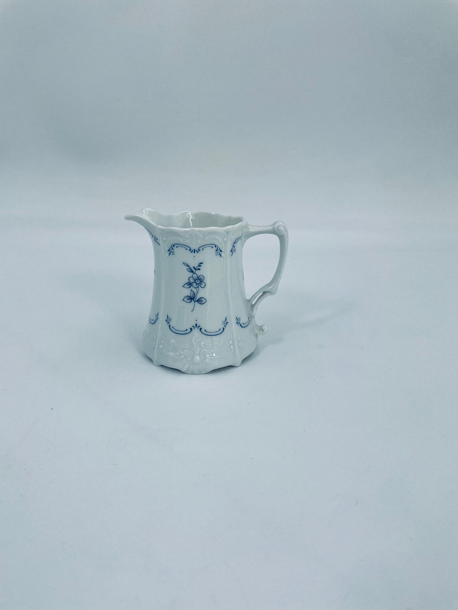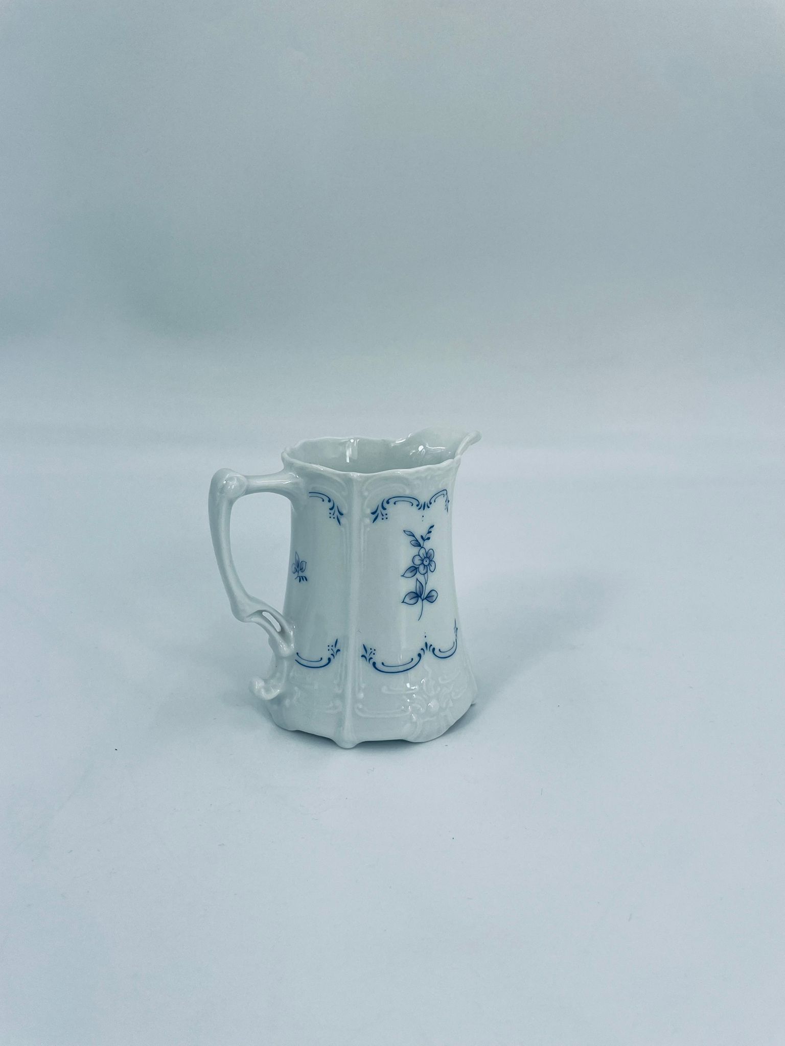 Dzbanuszek na mleko wytwórni Tirschenreuth wykonany z wysokiej jakości białej porcelany. Mlecznik we wzorze Fleur De Lis Blue, charakteryzujący się niebieskimi akcentami, kwiatowym wzorem, ozdobnymi reliefami i pofalowanym brzegiem.