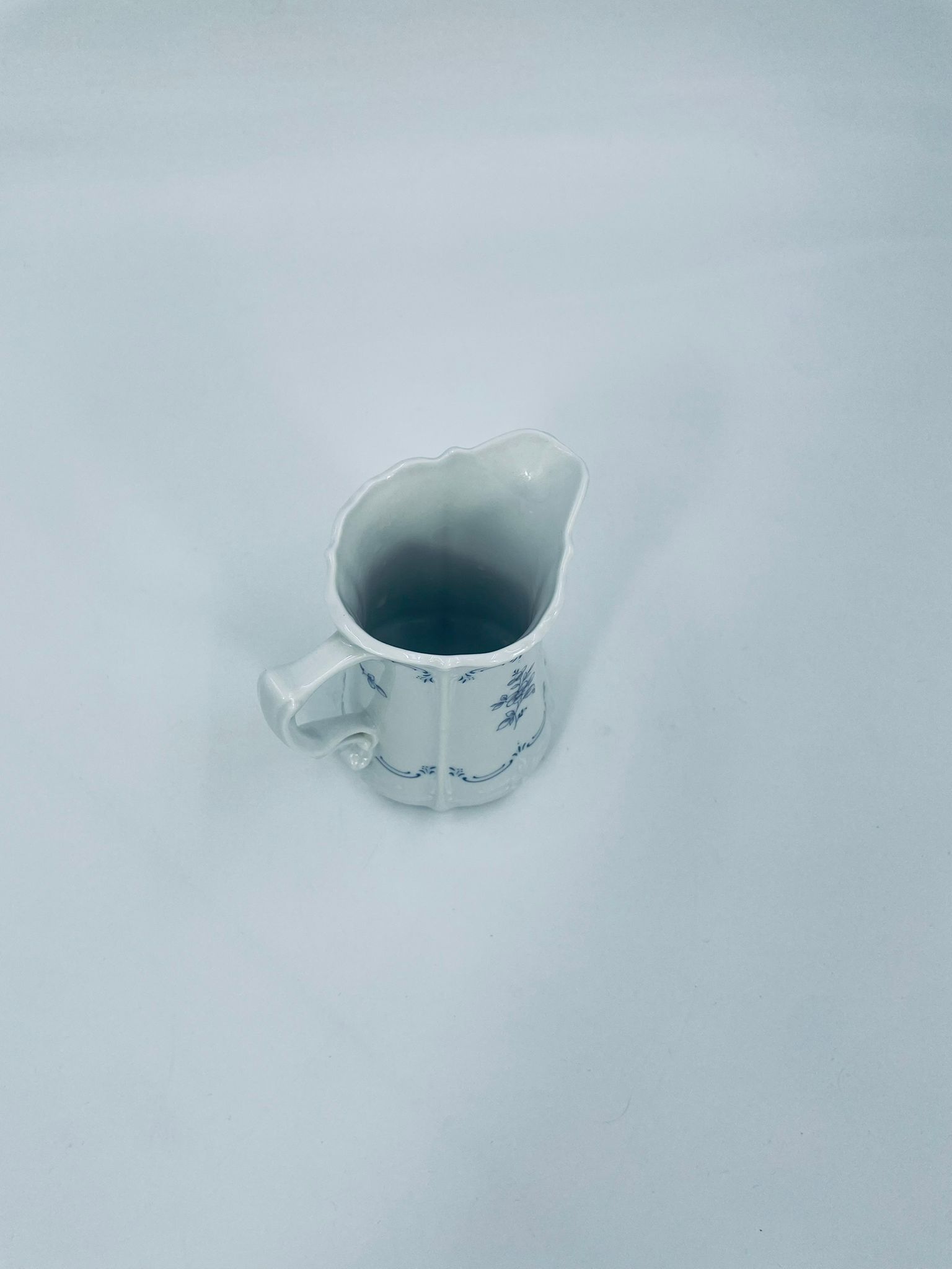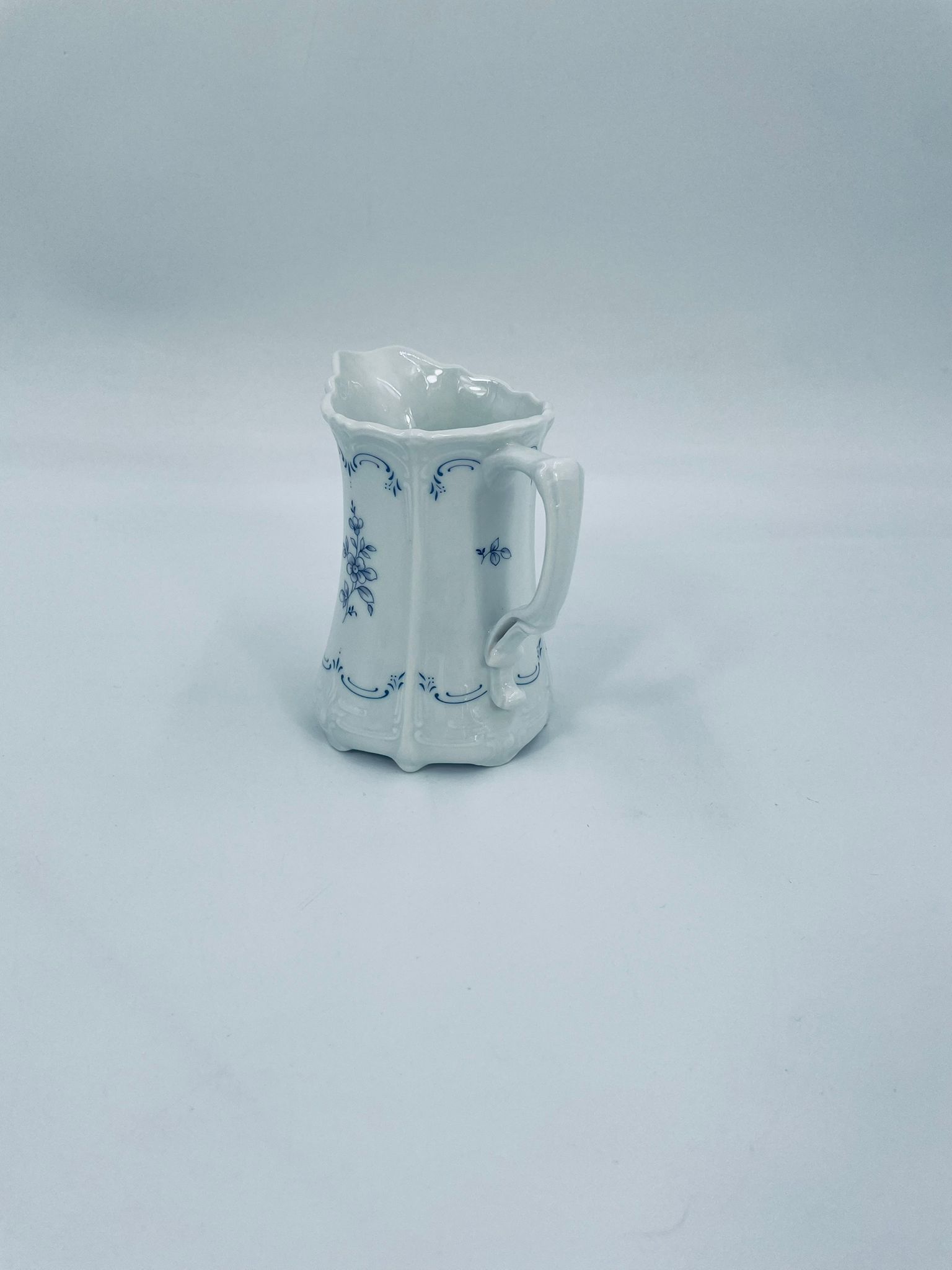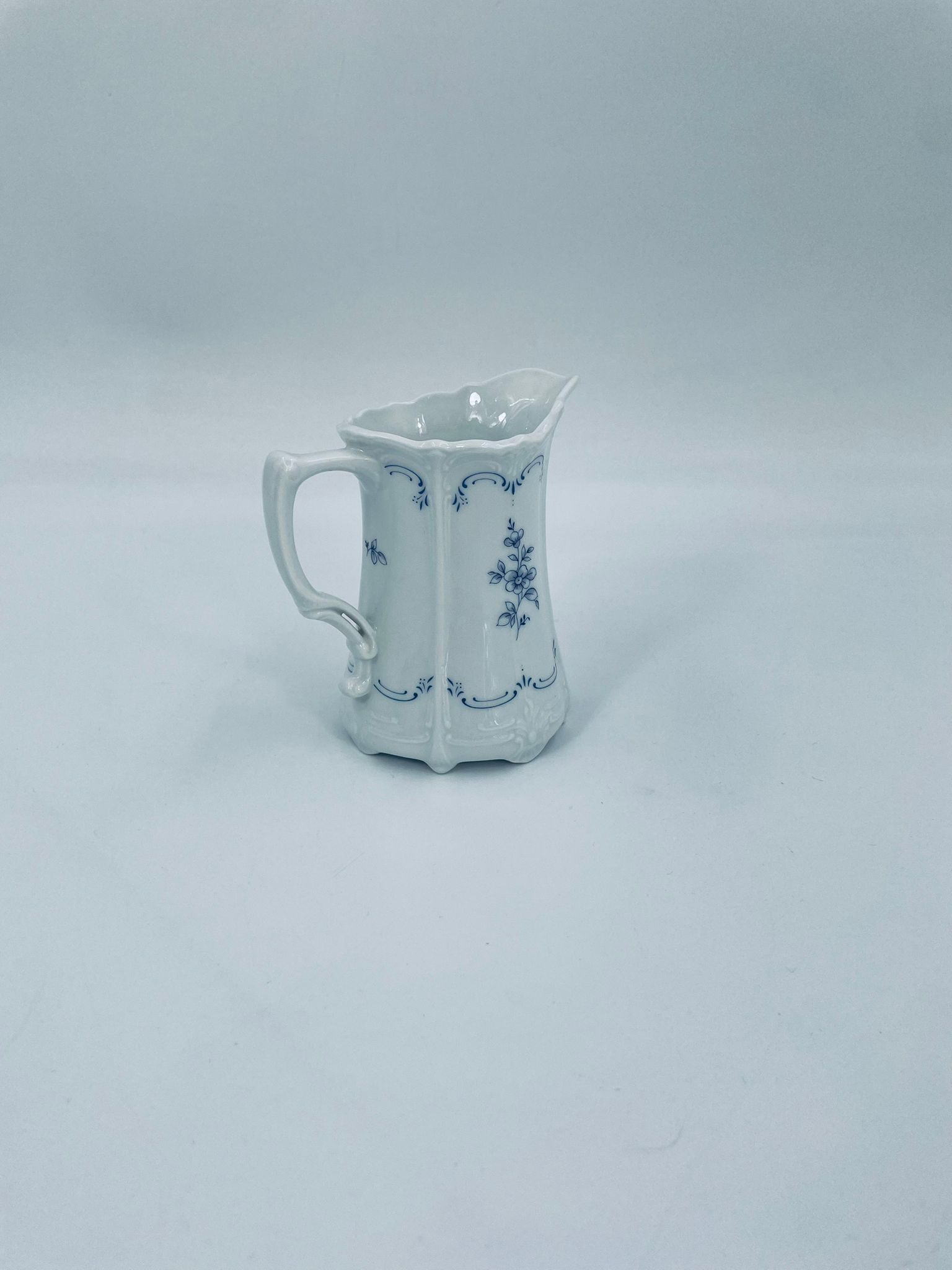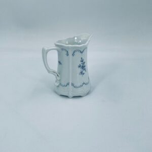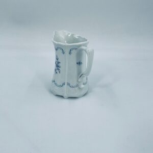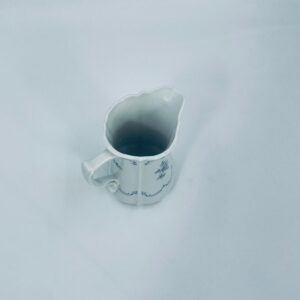 Dzbanuszek na mleko wytwórni Tirschenreuth wykonany z wysokiej jakości białej porcelany. Mlecznik we wzorze Fleur De Lis Blue, charakteryzujący się niebieskimi akcentami, kwiatowym wzorem, ozdobnymi reliefami i pofalowanym brzegiem.