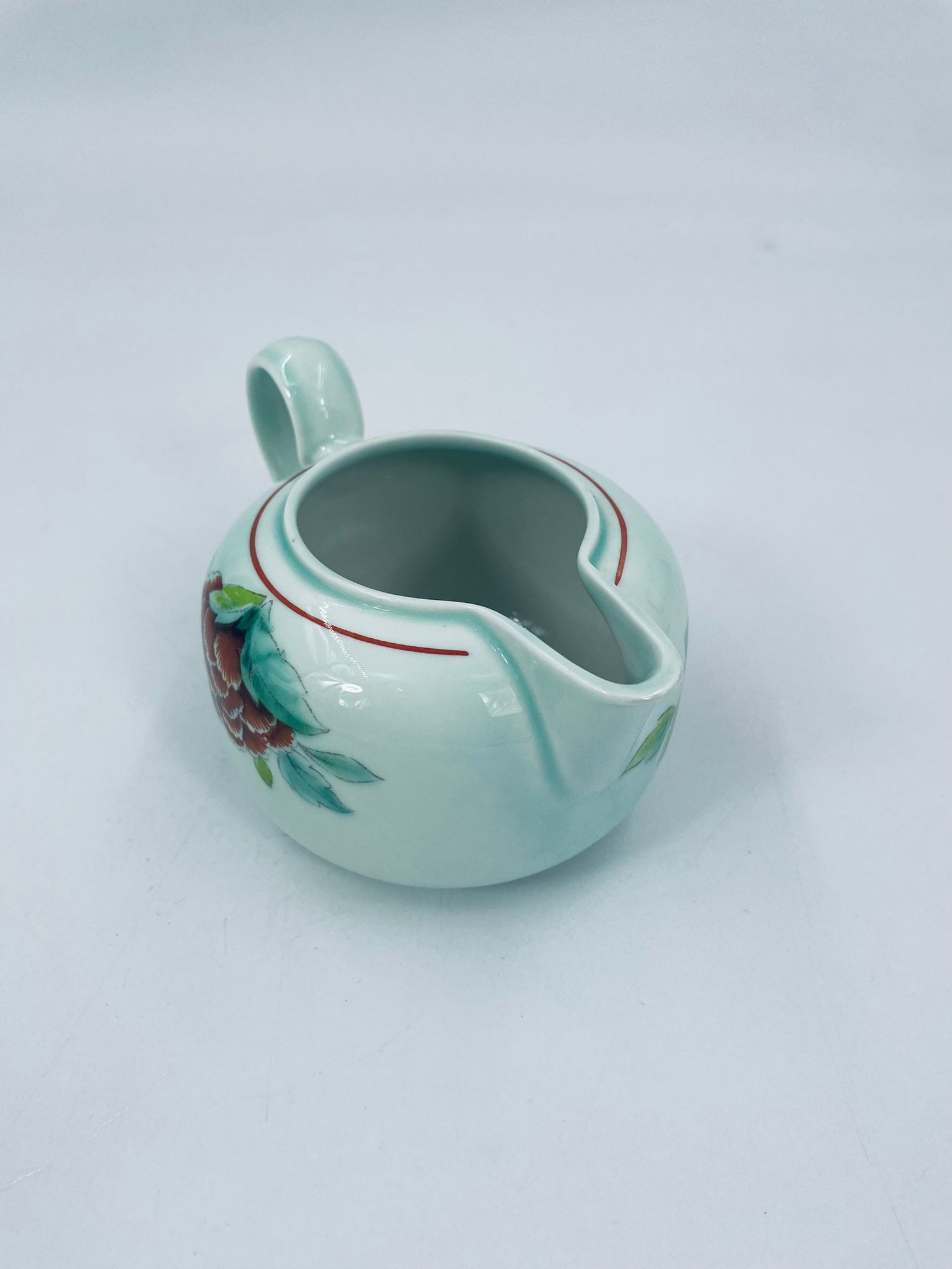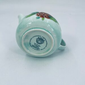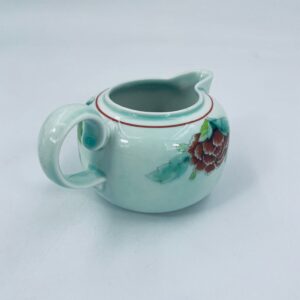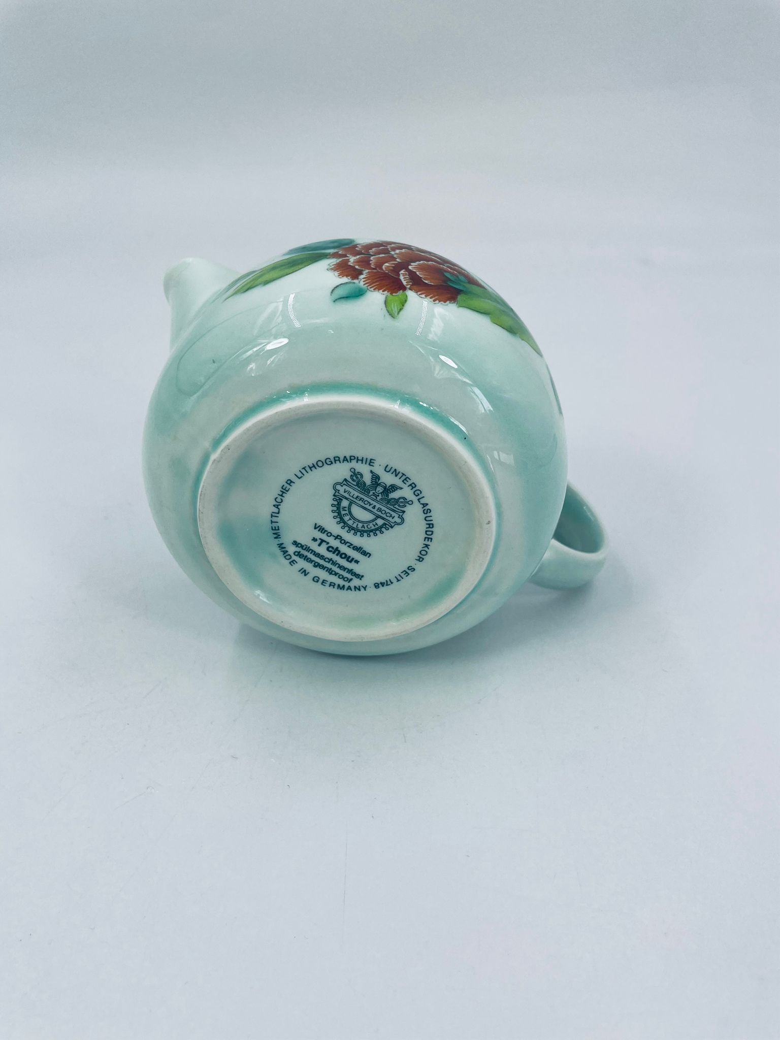 Dzbanek na mleko znanej wytwórni Villeroy Boch mattlacher lithographie. Mlecznik T’chou to wzór charakteryzujący się jasno zielonym tłem i dekoracją czerwonych i żółtych chryzantem z zielonymi liśćmi, wykończony cienkim czerwonym paskiem wokół krawędzi.