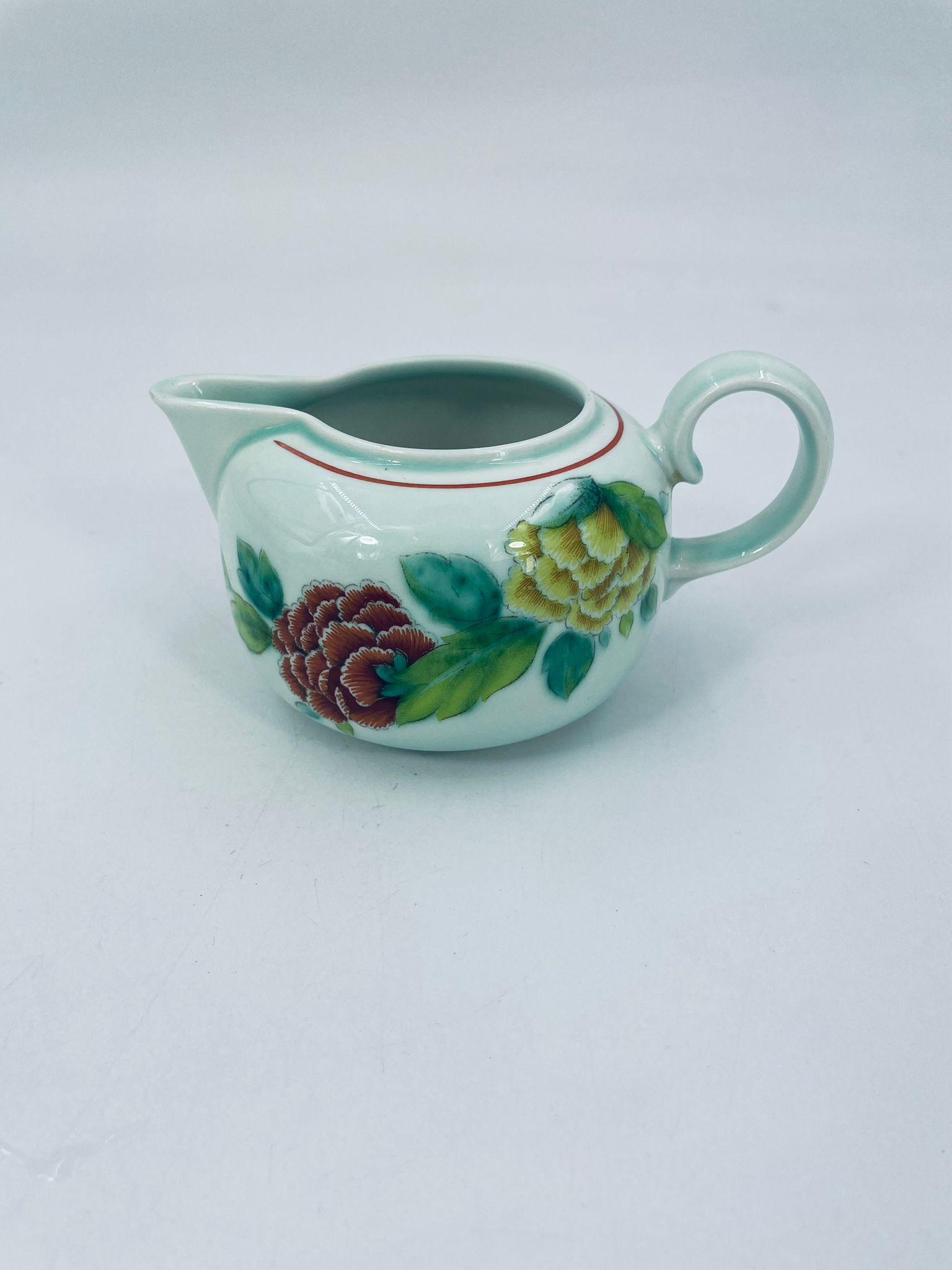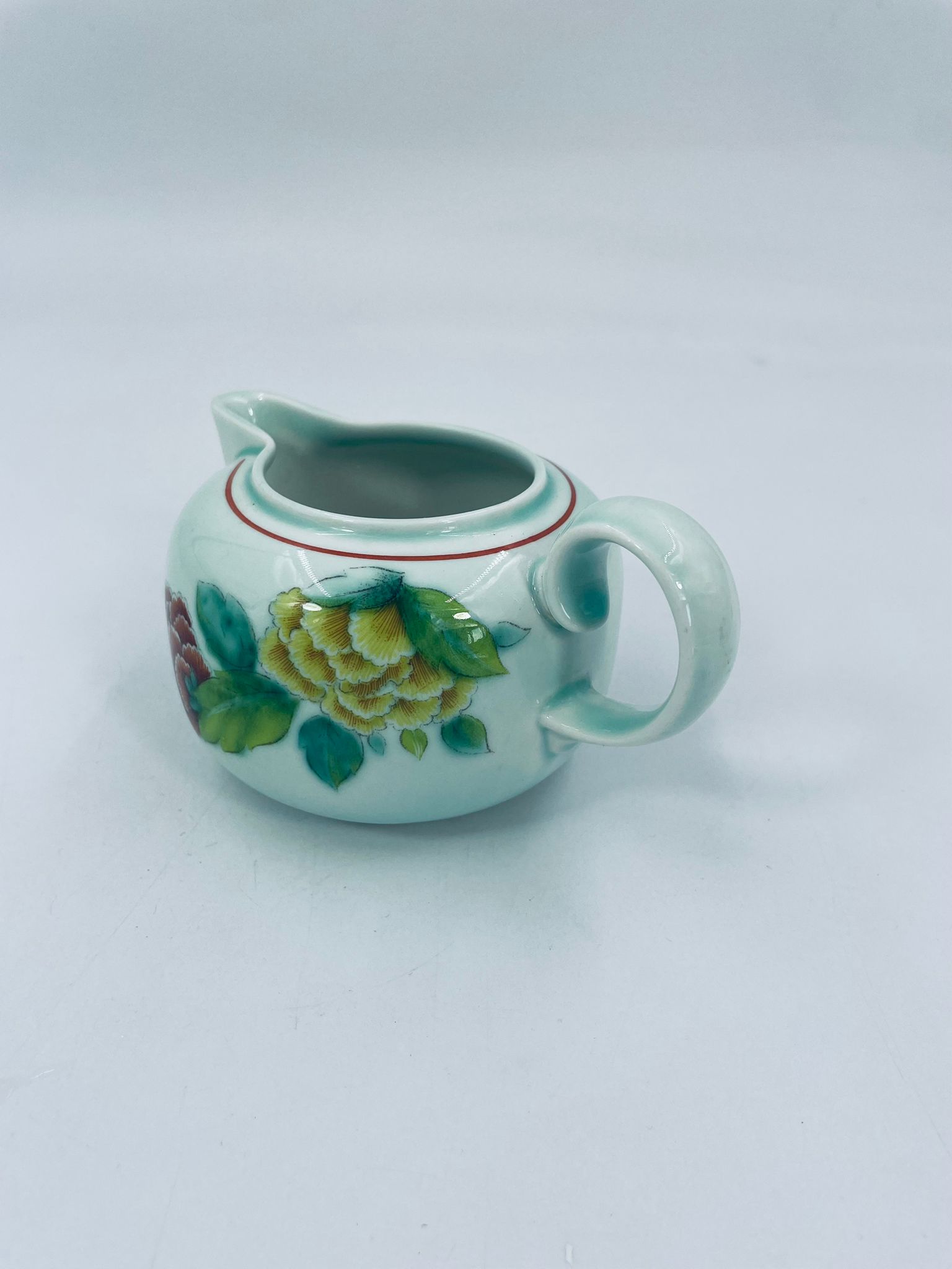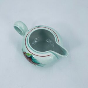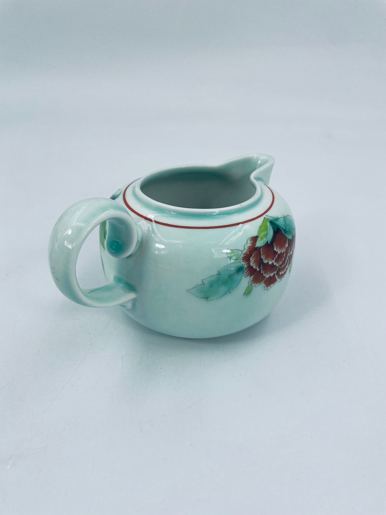 Dzbanek na mleko znanej wytwórni Villeroy Boch mattlacher lithographie. Mlecznik T’chou to wzór charakteryzujący się jasno zielonym tłem i dekoracją czerwonych i żółtych chryzantem z zielonymi liśćmi, wykończony cienkim czerwonym paskiem wokół krawędzi.