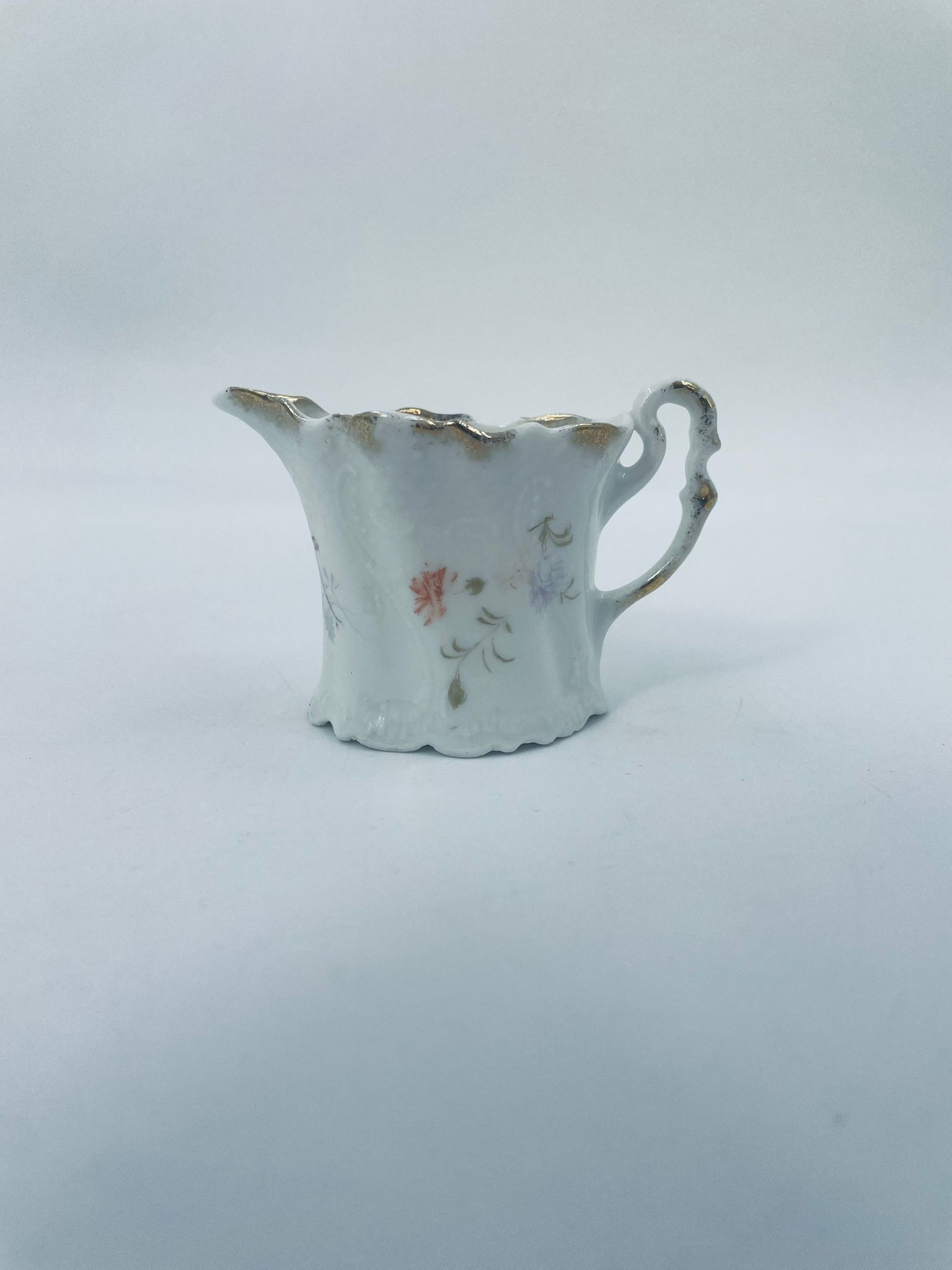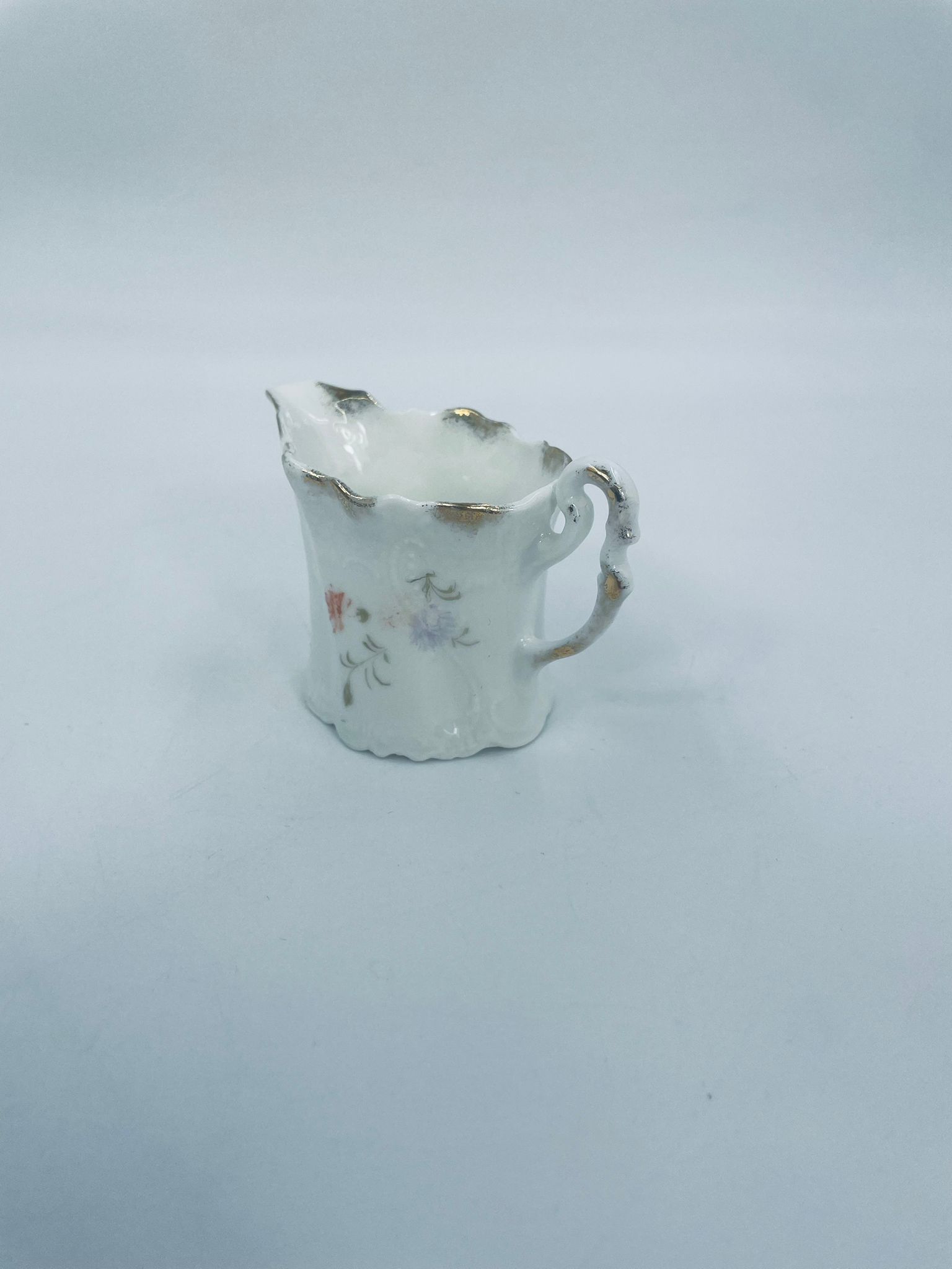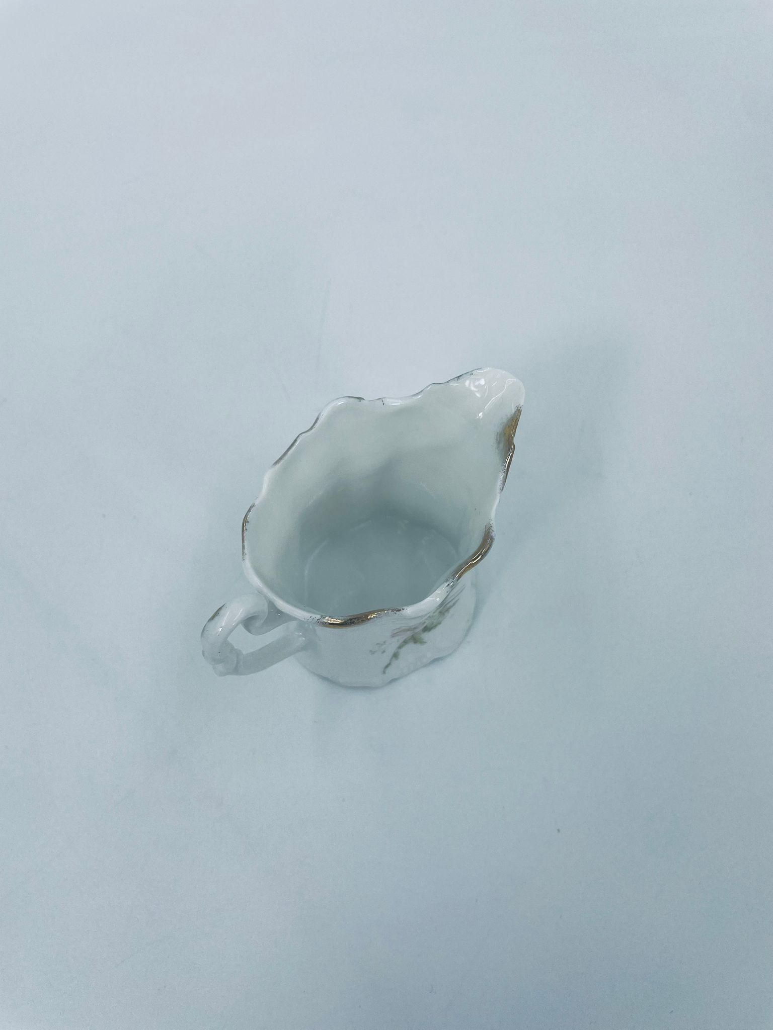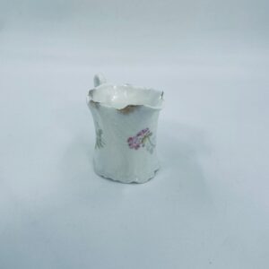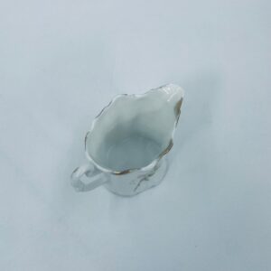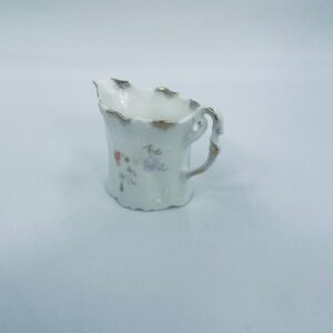 Mały dzbanuszek na mleko/ śmietankę wytwórni Weimar Germany, wykonany z wysokiej jakości białej porcelany. Dzbanuszek z ręcznie malowanymi wzorami kwiatowymi, falistymi krawędziami ze złotymi akcentami oraz reliefami.