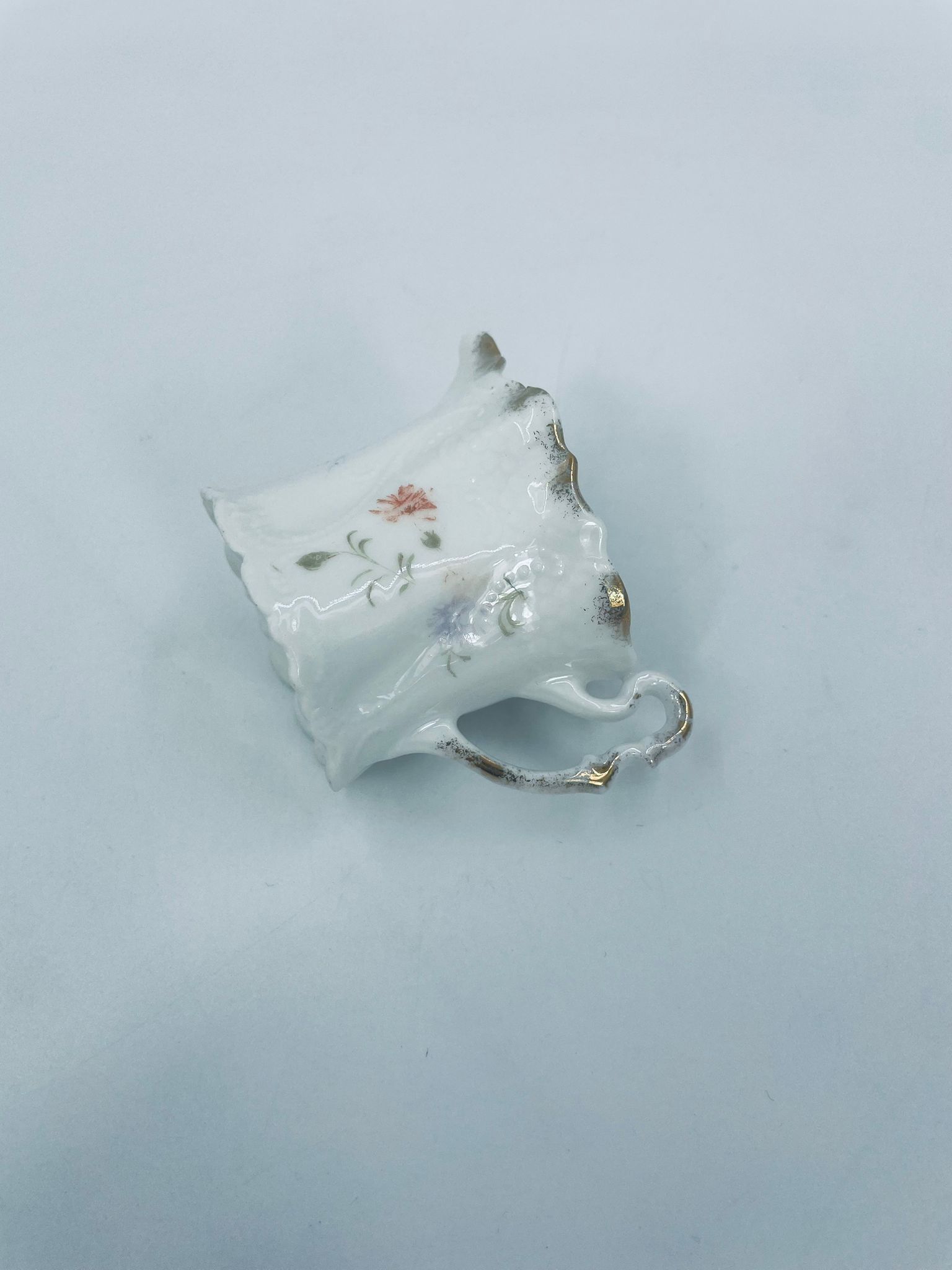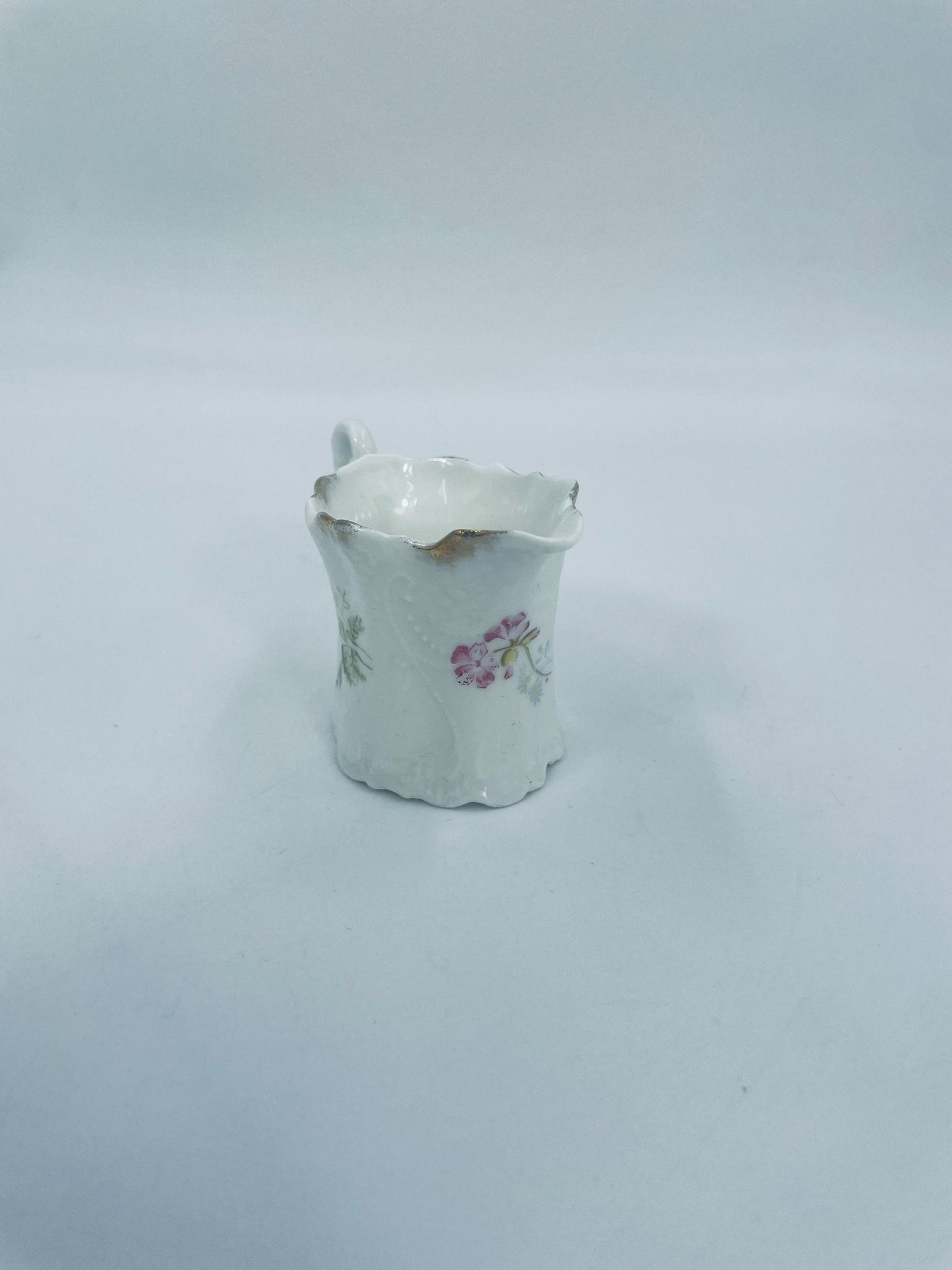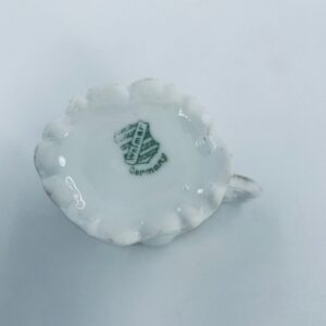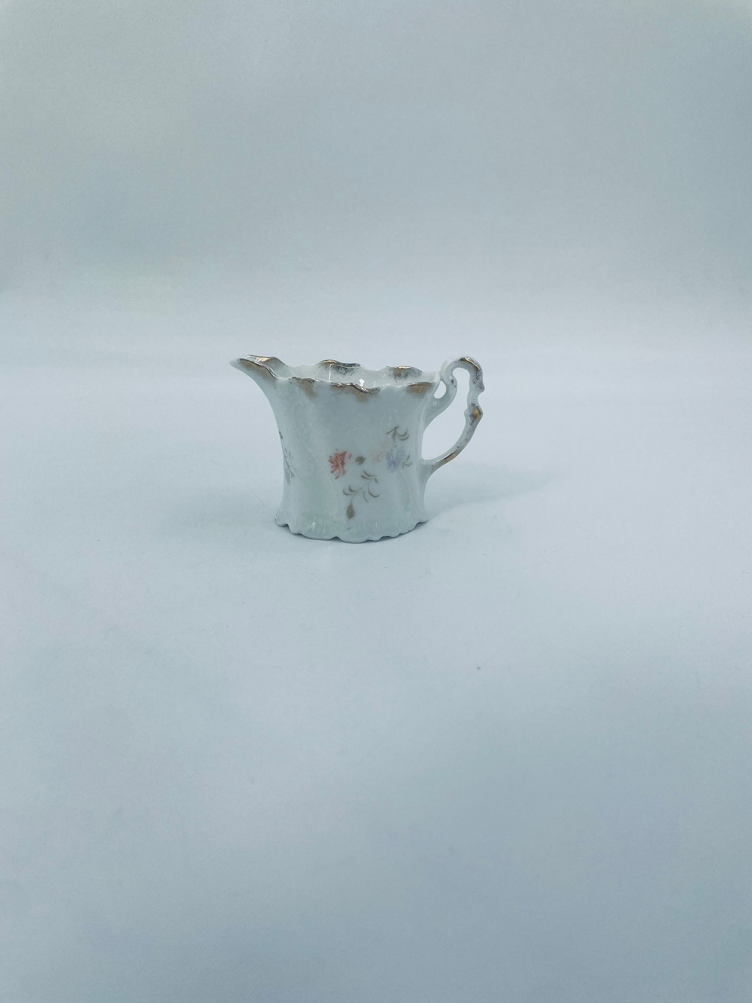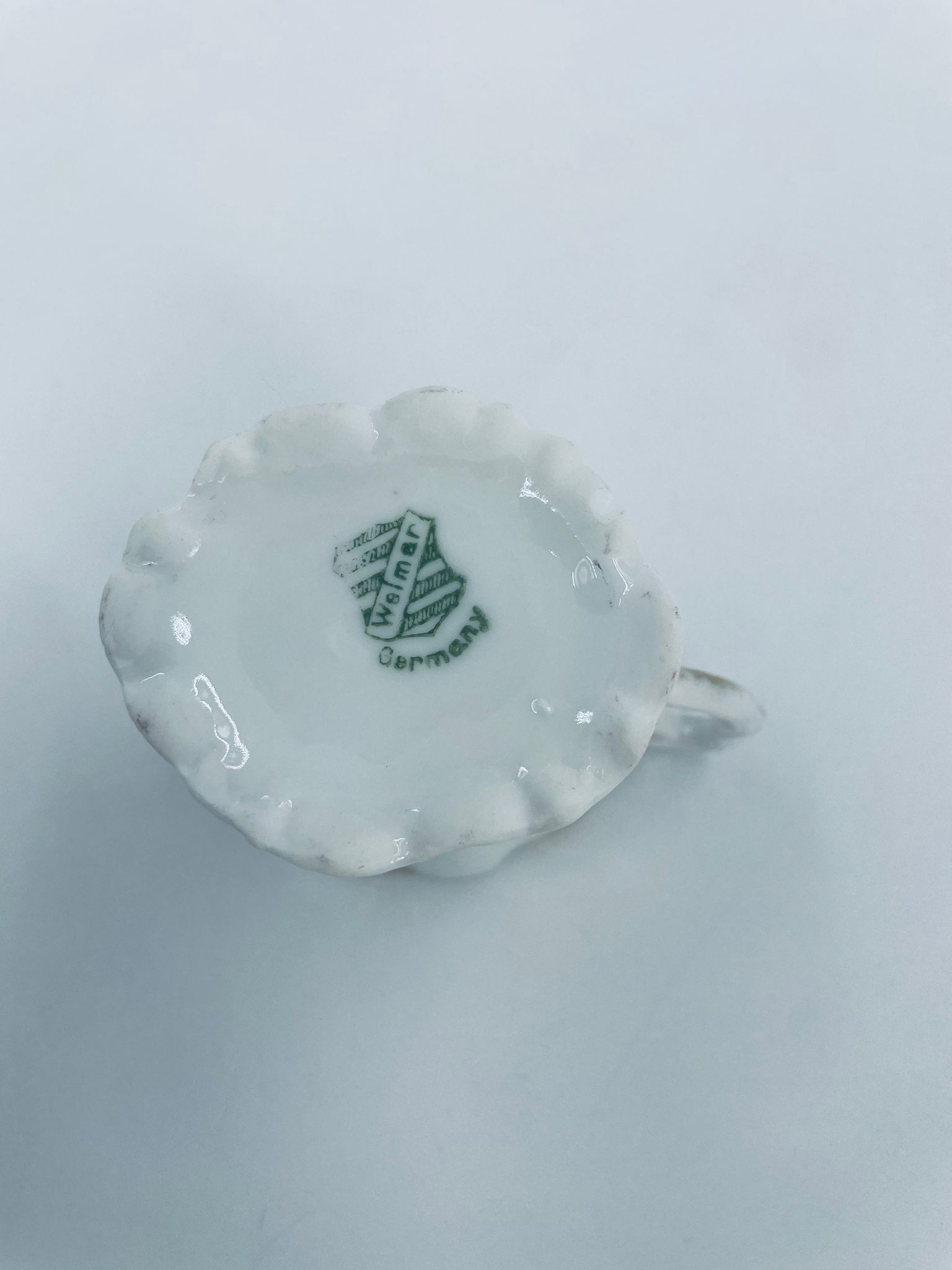 Mały dzbanuszek na mleko/ śmietankę wytwórni Weimar Germany, wykonany z wysokiej jakości białej porcelany. Dzbanuszek z ręcznie malowanymi wzorami kwiatowymi, falistymi krawędziami ze złotymi akcentami oraz reliefami.