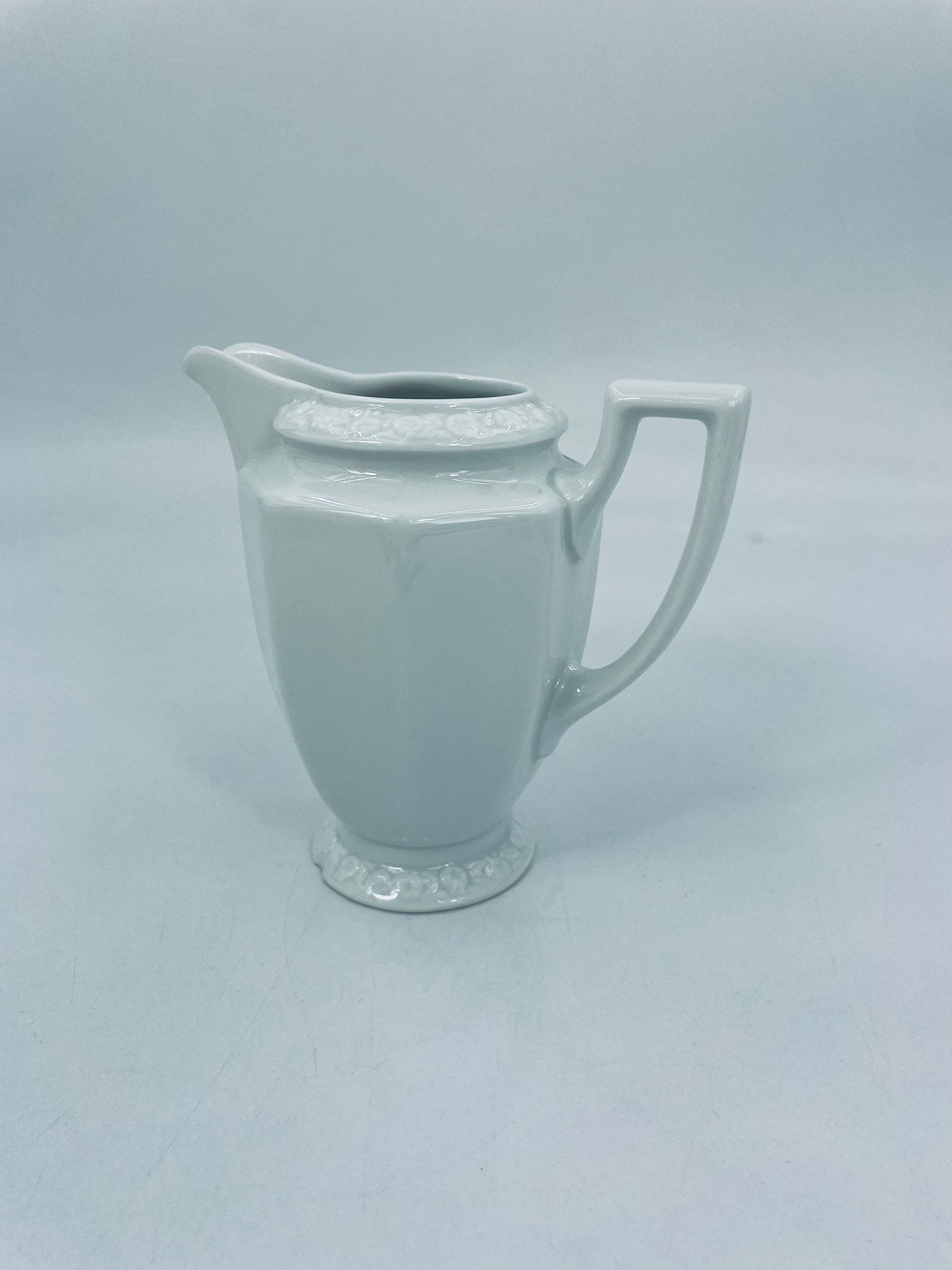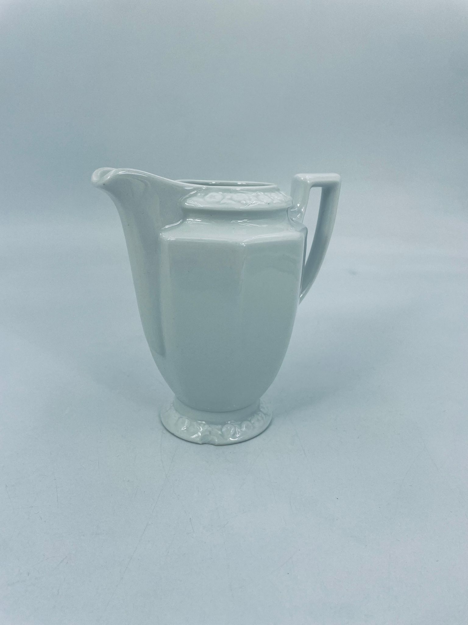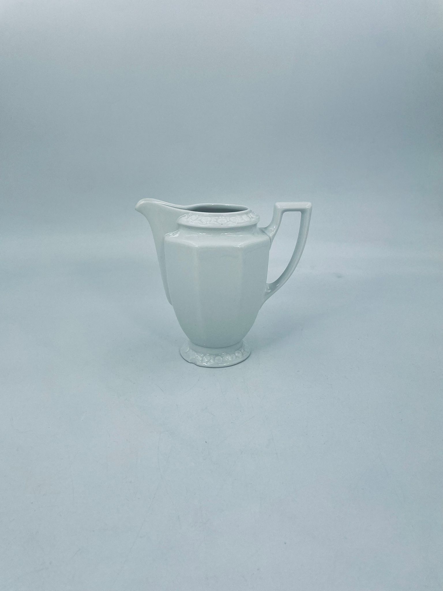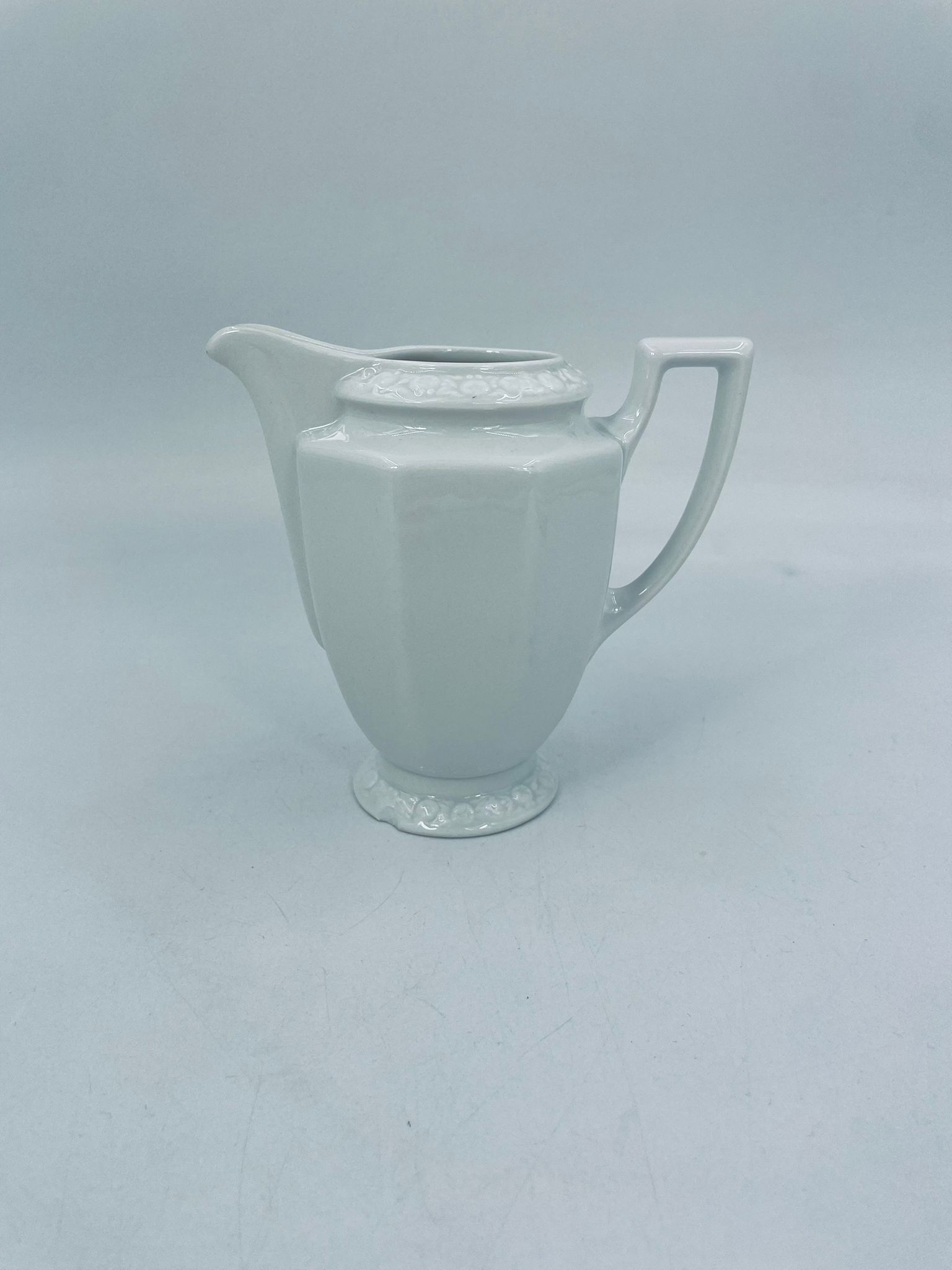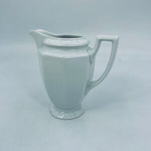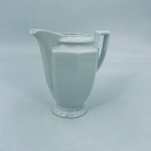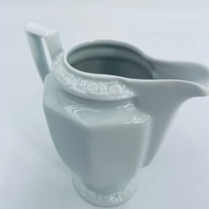 Dzbanuszek na mleko znanej wytwórni Rosenthal Maria Biała, wykonany z wysokiej jakości porcelany w białym kolorze. Mlecznik w lekko geometrycznym kształcie ze zdobieniem reliefowym, kwiatowym. Dzbanuszek posiada uszczerbek u podstawy.