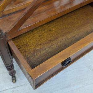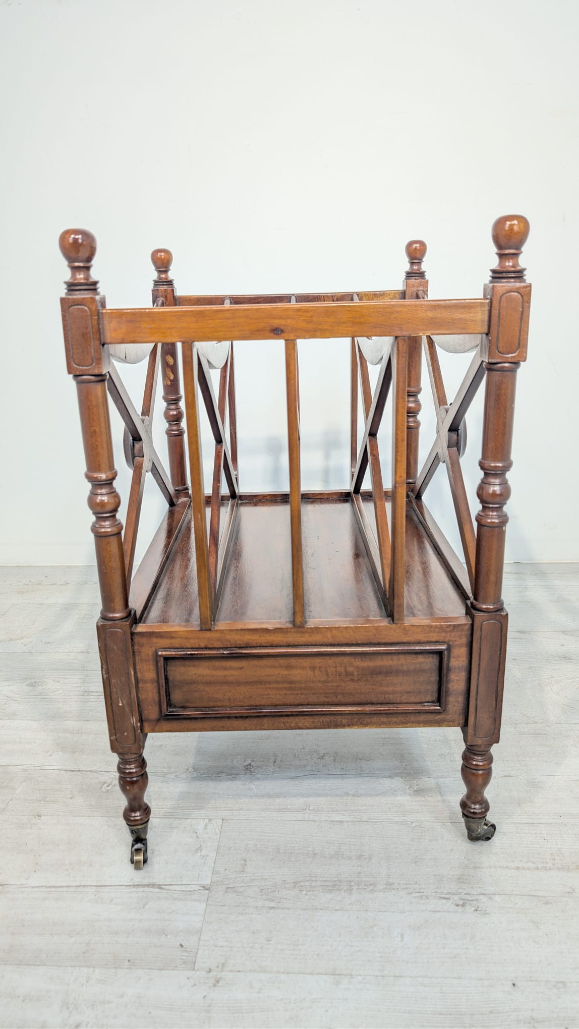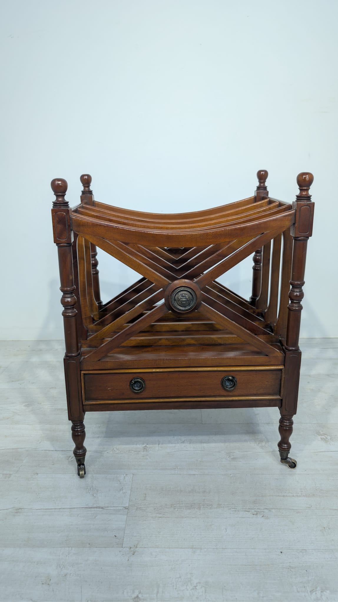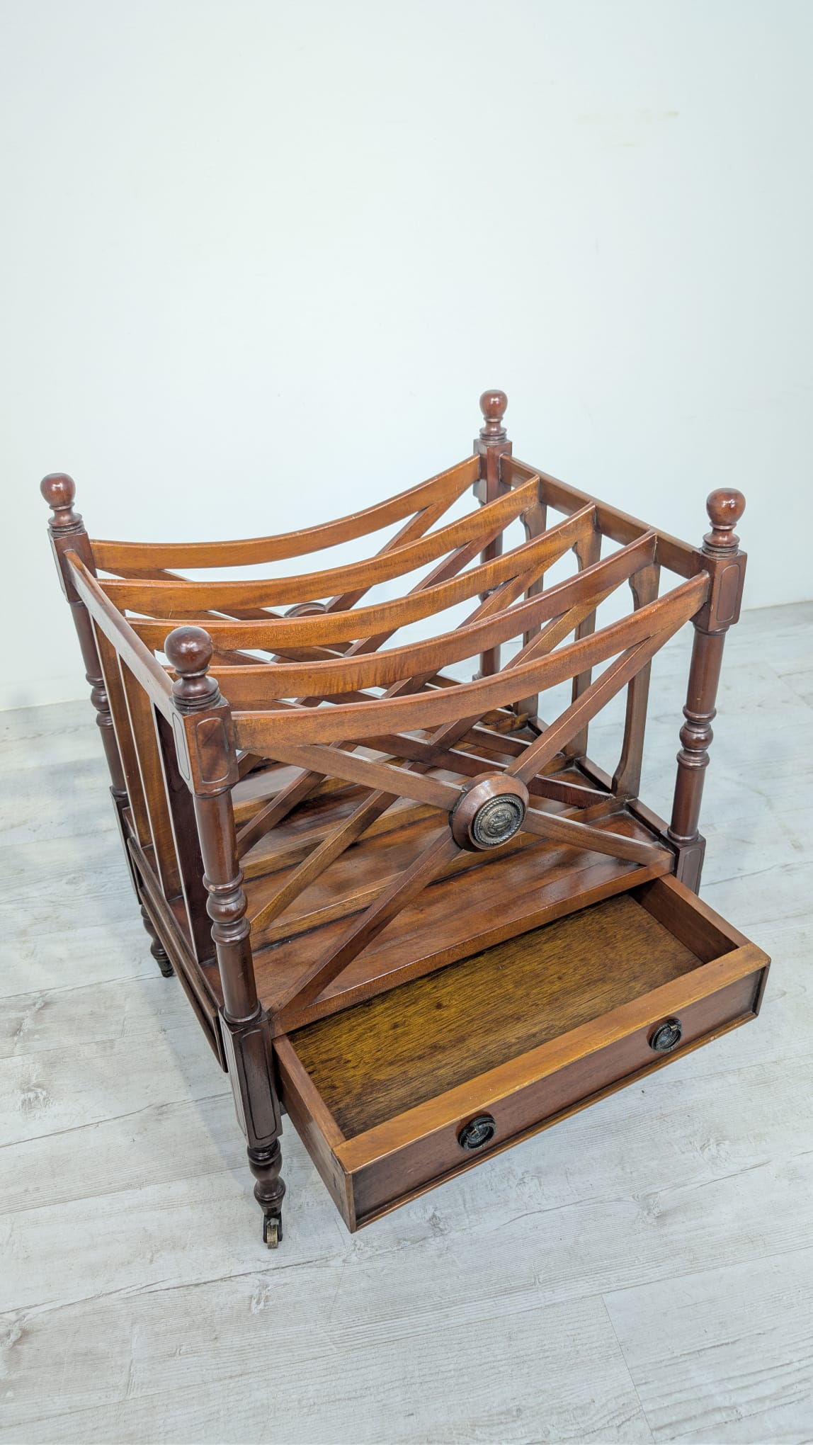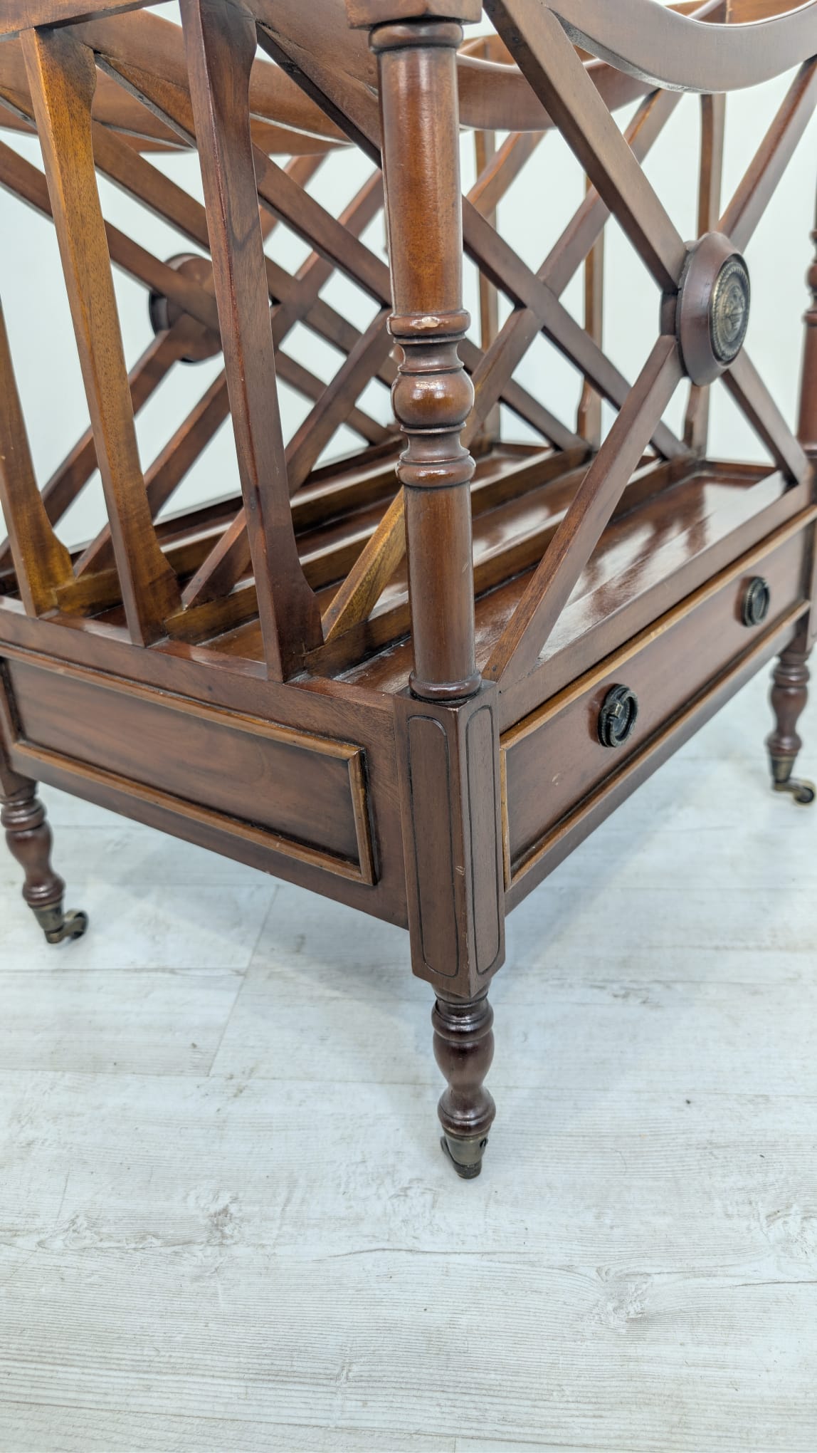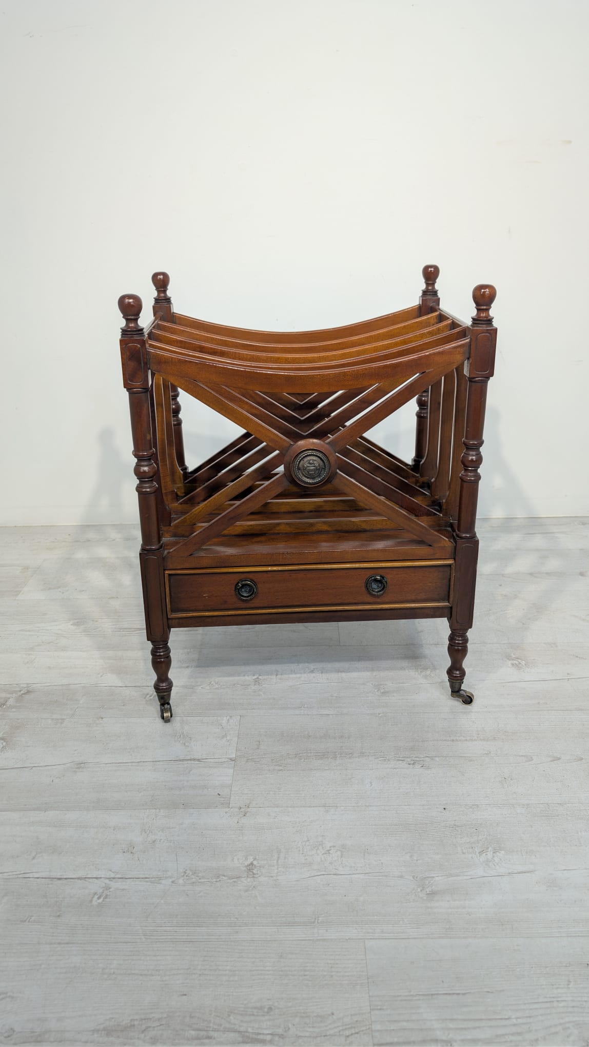 Elegancka, mobilny stojak na czasopisma, vinyle jak i albumy w stylu regencyjnym, wykonana z mahoniowego drewna. Mebel posiada praktyczną szufladę, która ułatwia przechowywanie drobnych przedmiotów.