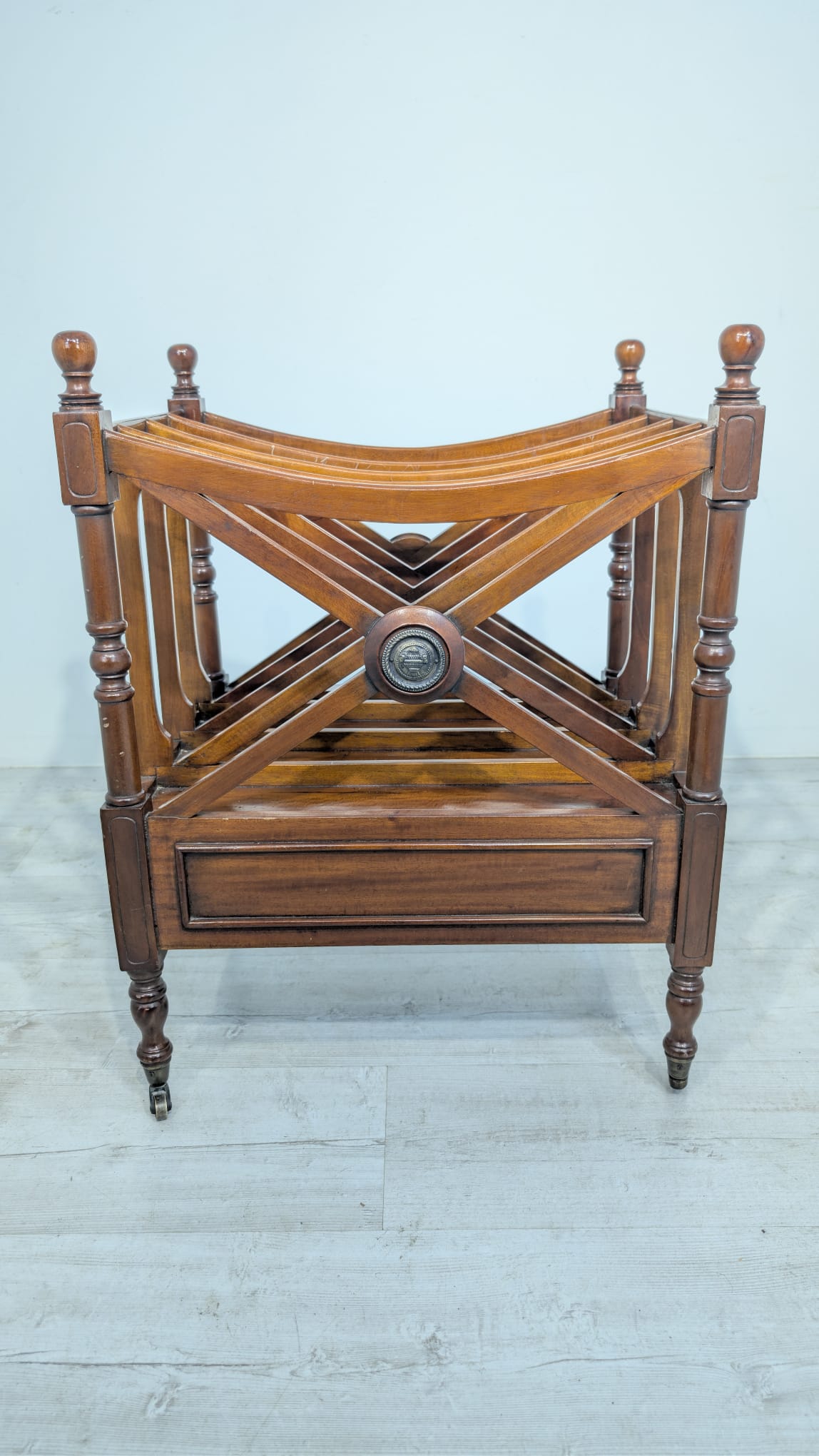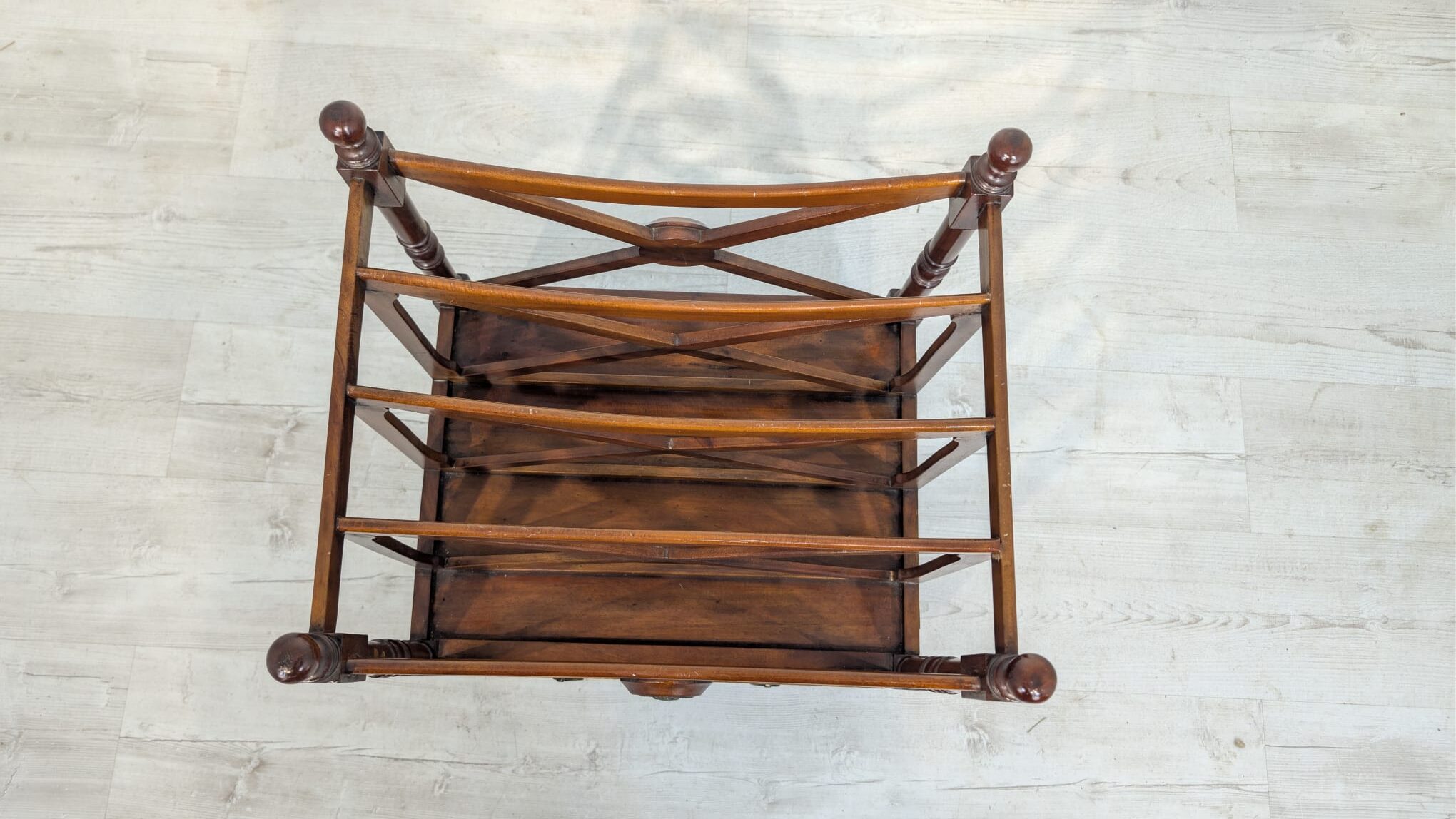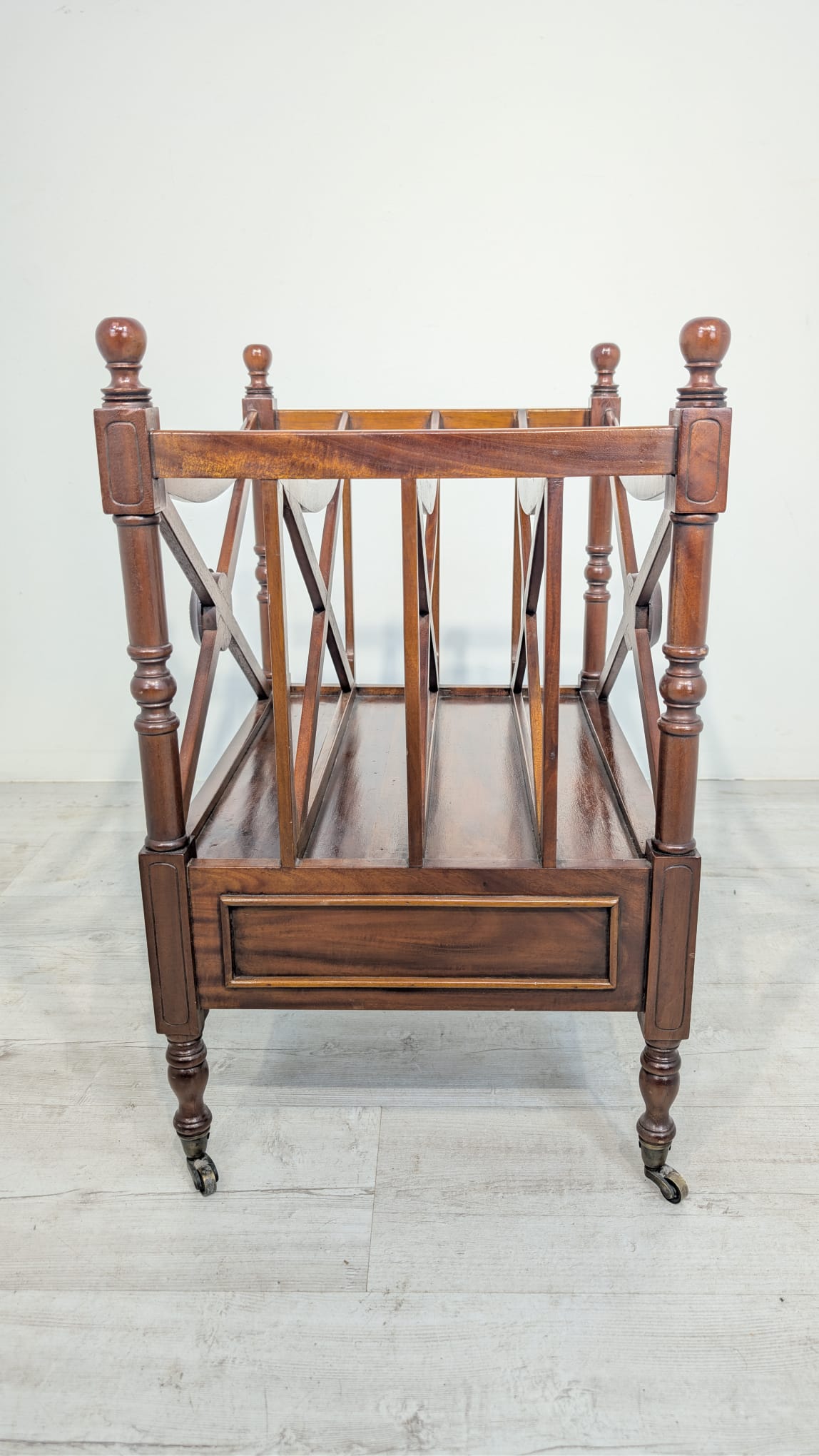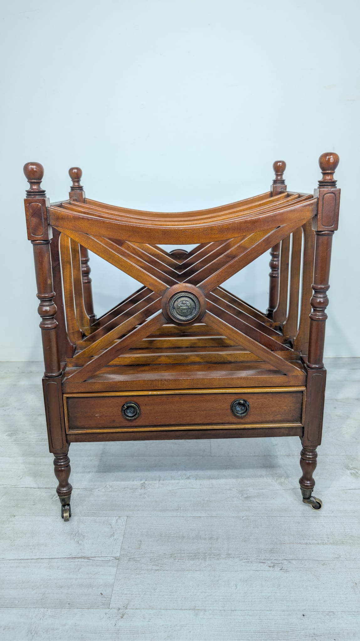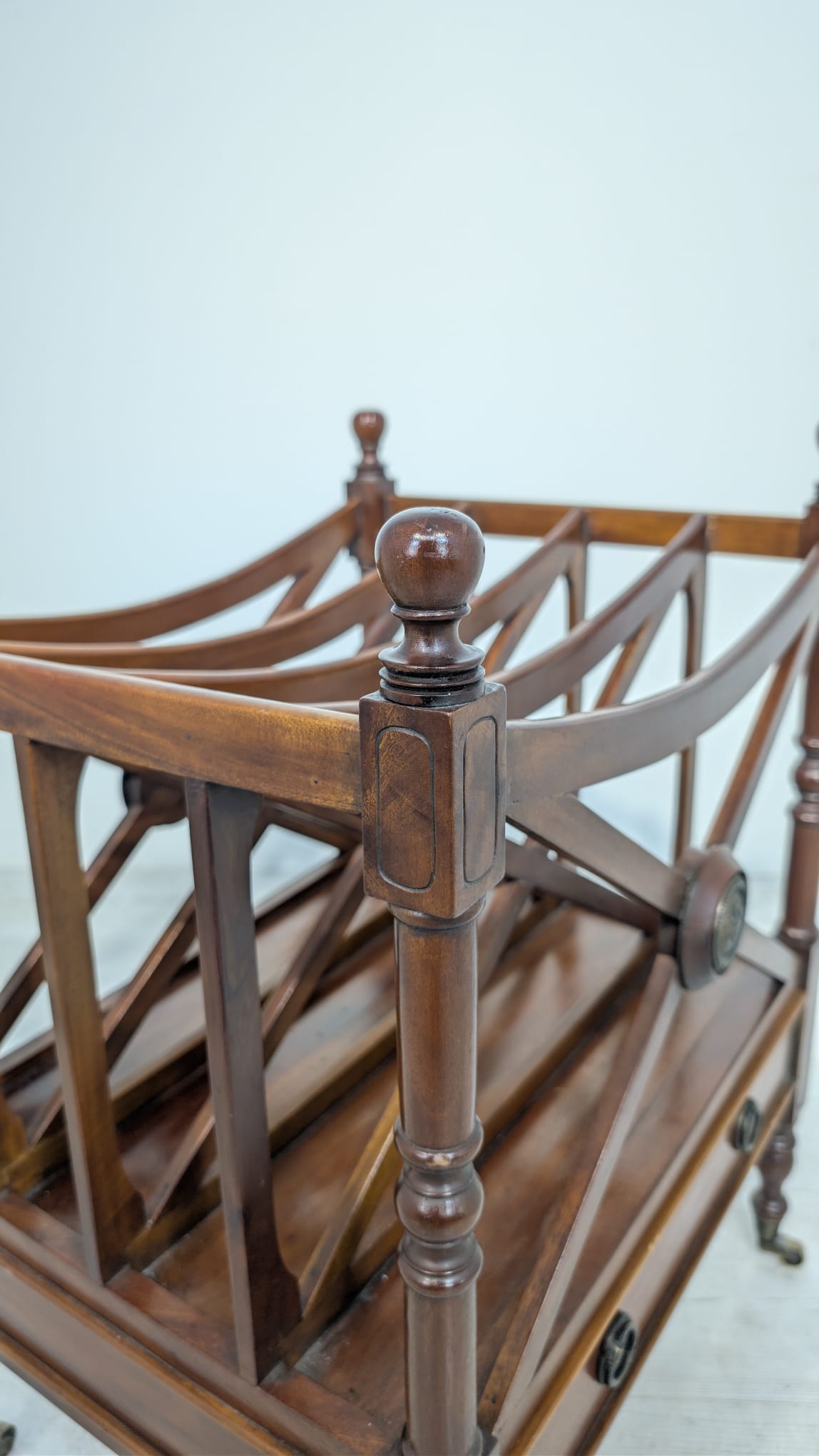 Elegancka, mobilny stojak na czasopisma, vinyle jak i albumy w stylu regencyjnym, wykonana z mahoniowego drewna. Mebel posiada praktyczną szufladę, która ułatwia przechowywanie drobnych przedmiotów.