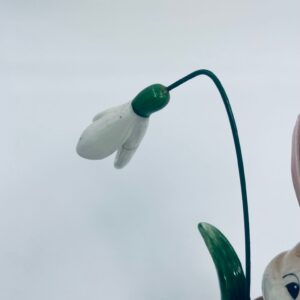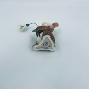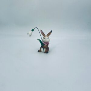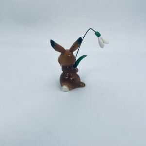 Figura dekoracyjna Zajączek, wytwórni Goebel, wykonana z porcelany. Zajączek w kolorze brązowym z różową muszką w biało czerwone groszki, trzymający w łapkach biały kwiatek przebiśniegu z zielona łodyga. Kwiatek ma pęknięcie, jest sklejony i trzyma się.