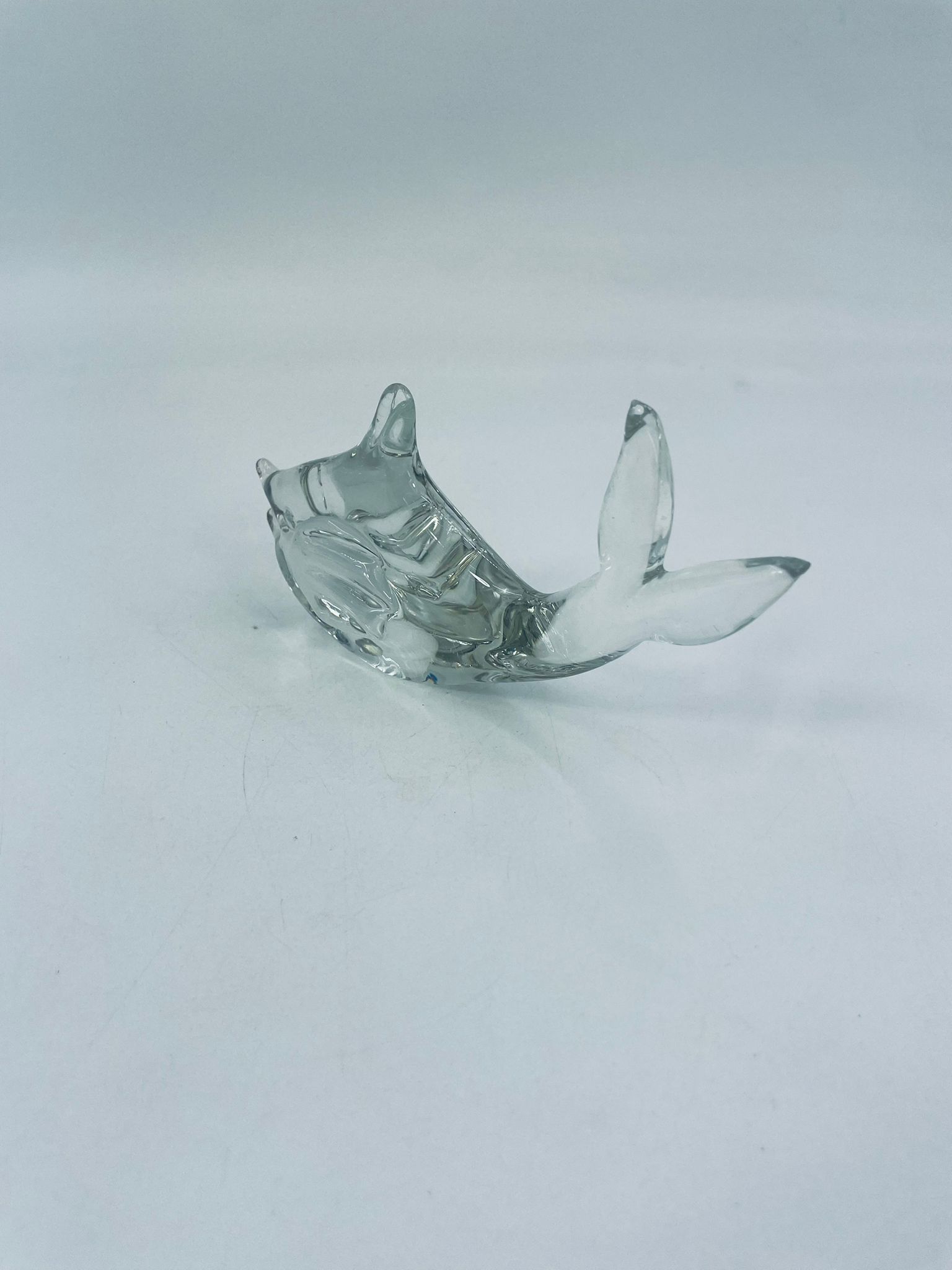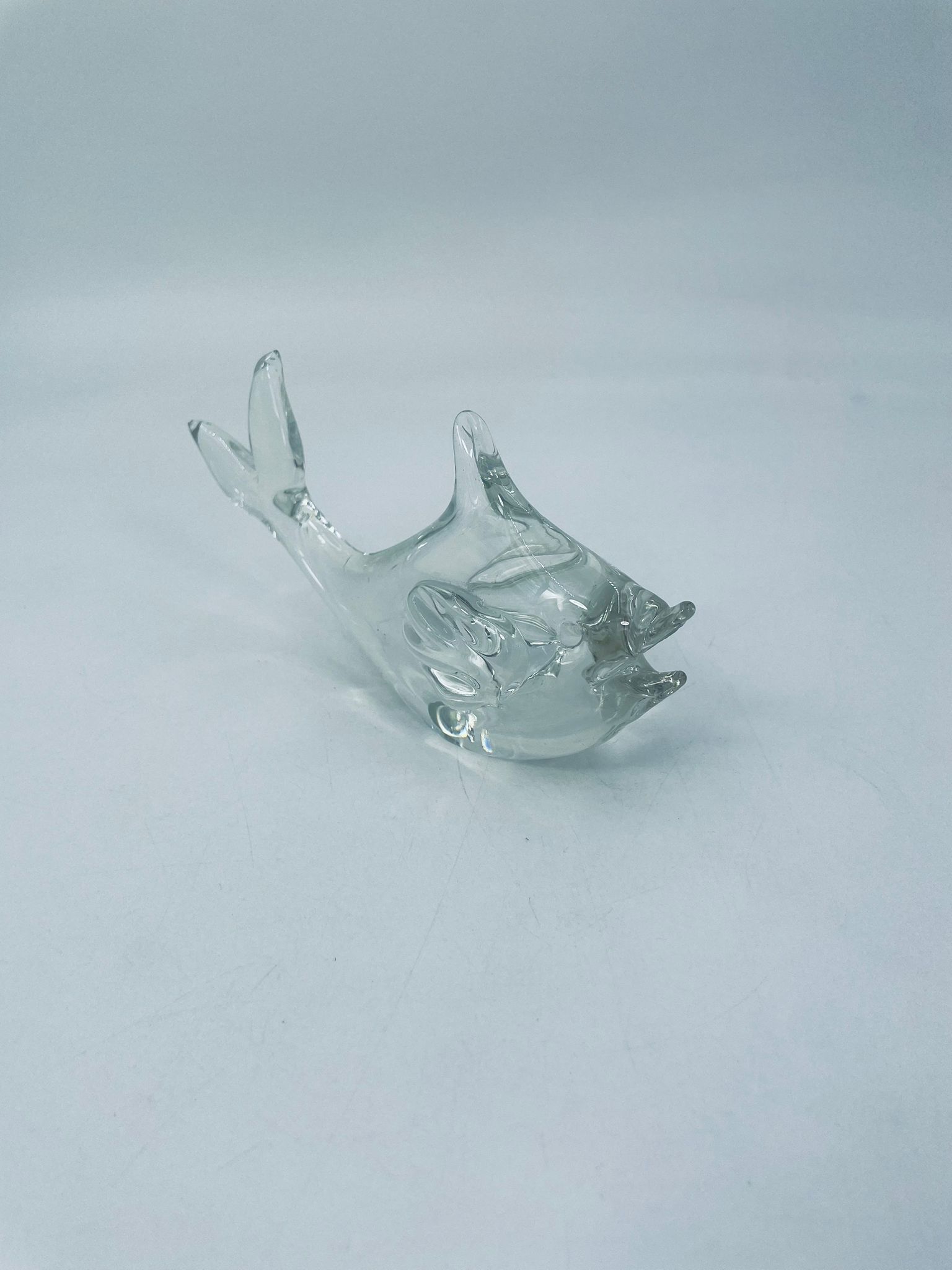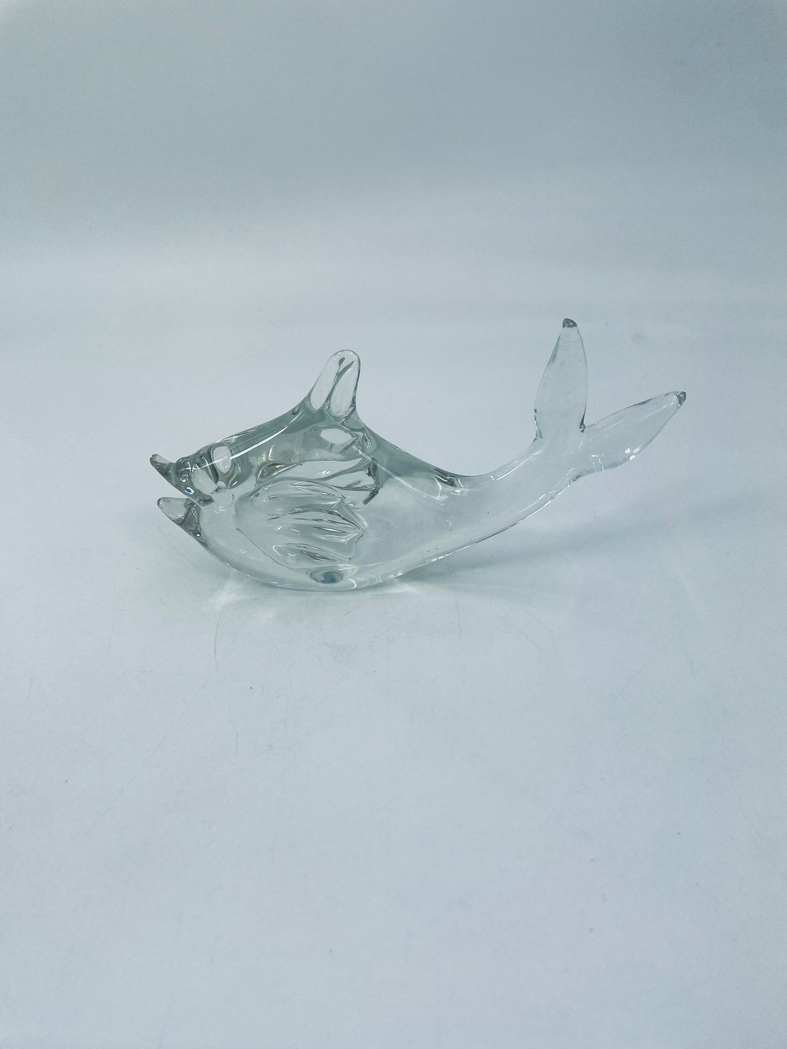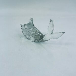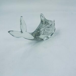 Figurka rybka ze szkła Murano, wyprodukowana we Włoszech z połowy XXw. Szkło przezroczyste, ręcznie dmuchane, co nadaje jej unikalne detale i formę.