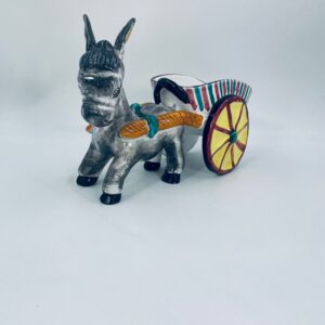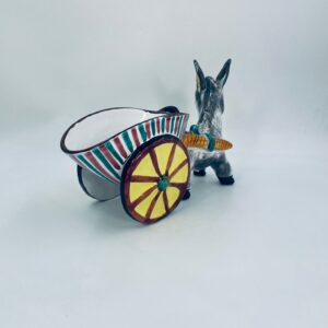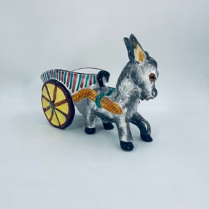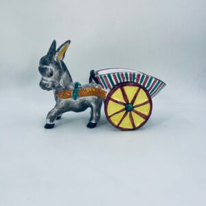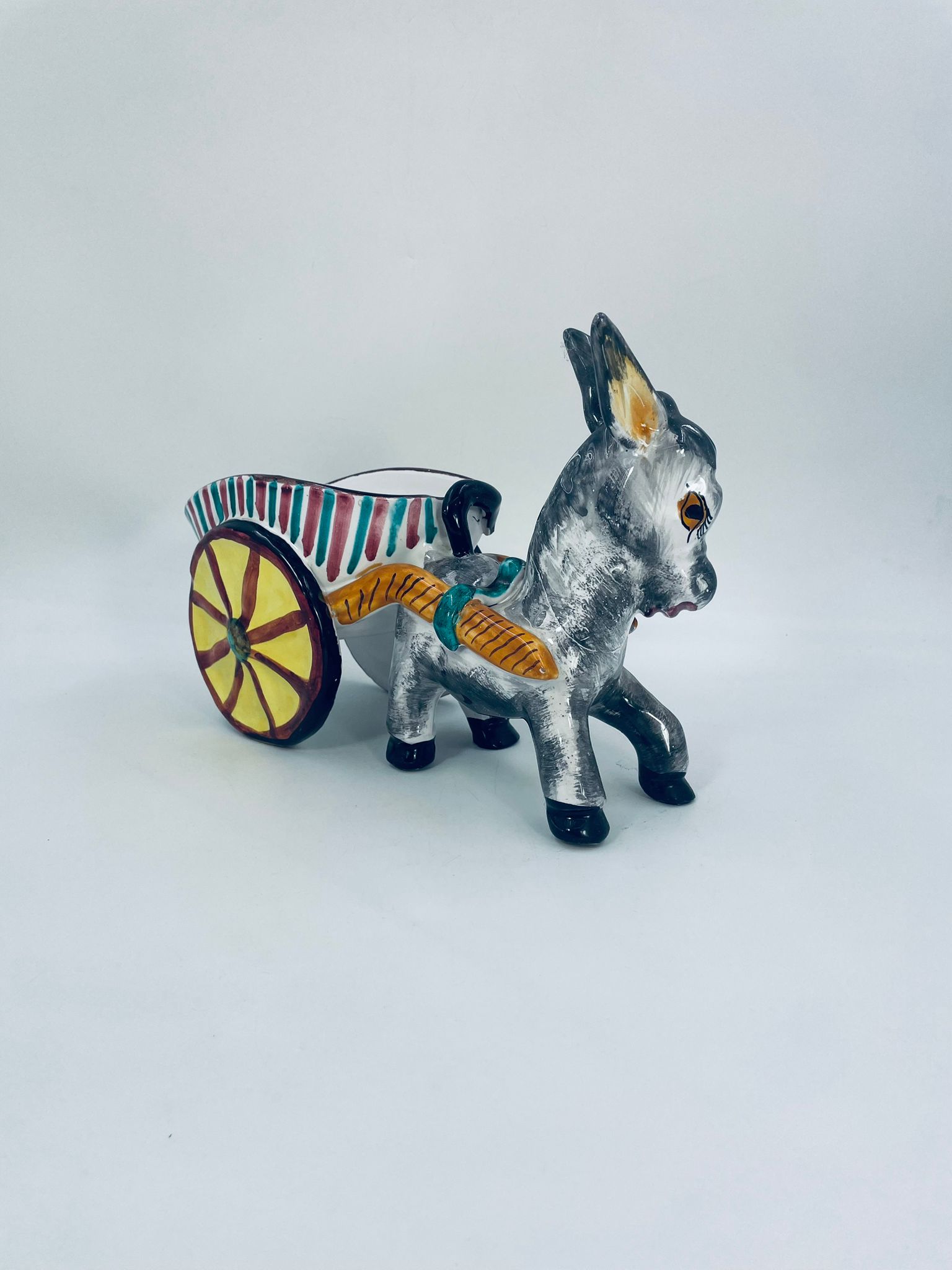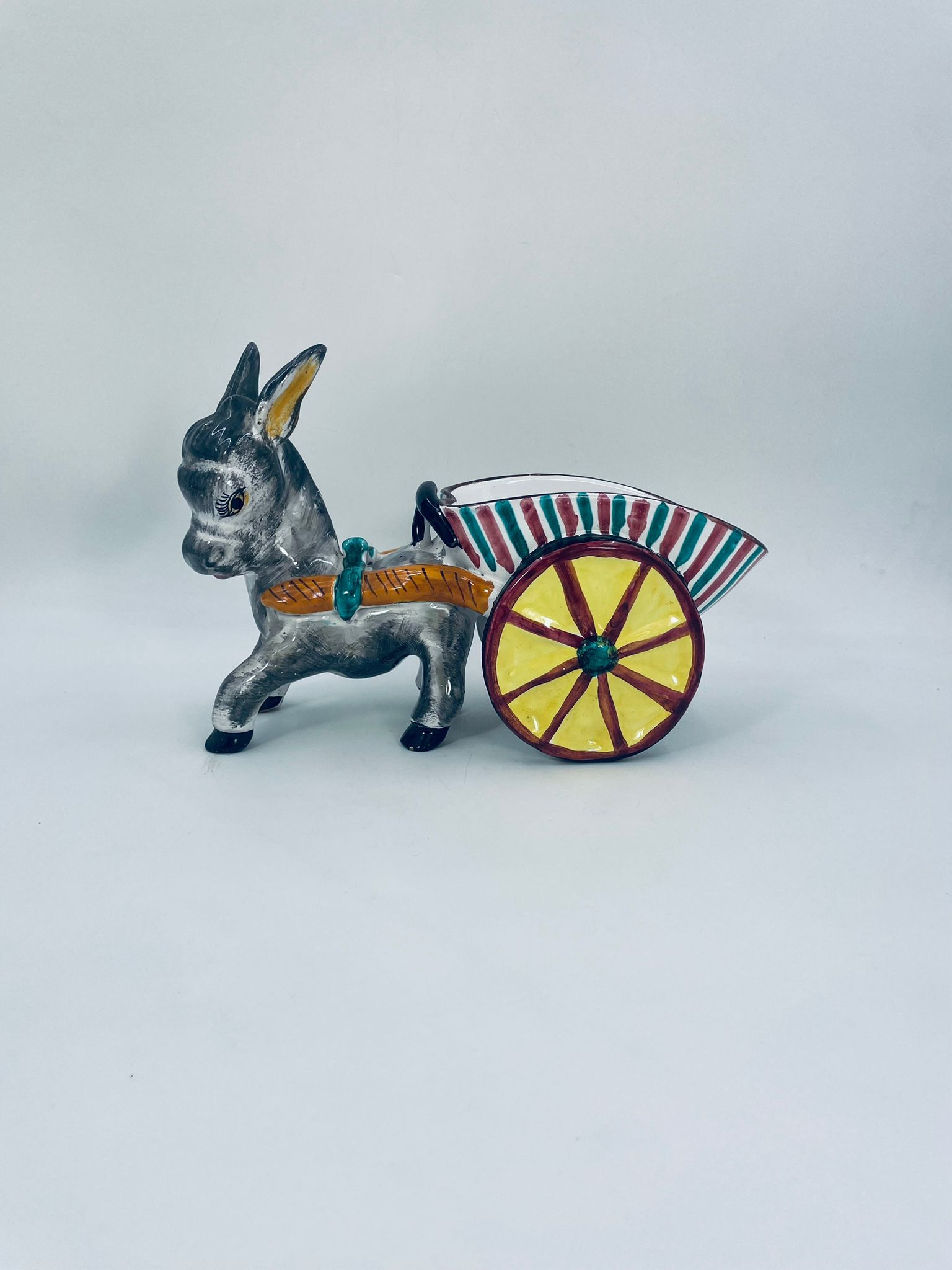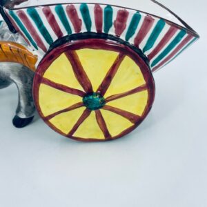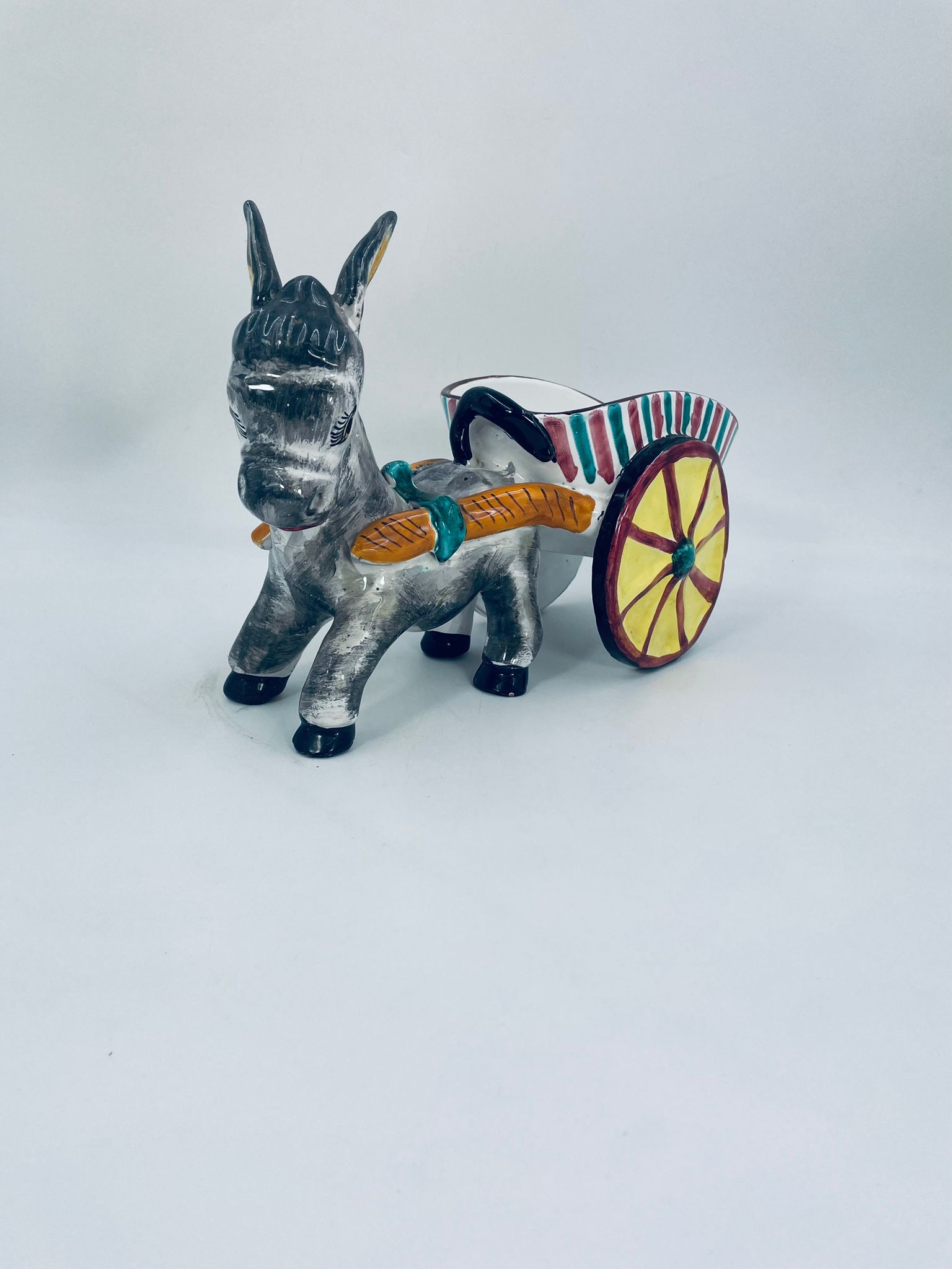Figurka kolekcjonerska, doniczka, Włoska w stylu Vintage, wykonana z wysokiej jakości ceramiki. Figurka ręcznie malowana, przedstawia uroczego osiołka, zaprzężonego do dwukołowego wozu. Może służyć jako uroczy dodatek do ogrodu, doniczka, a także jako pojemnik. Posiada maleńki uszczerbek na nóżce, mało widoczny.