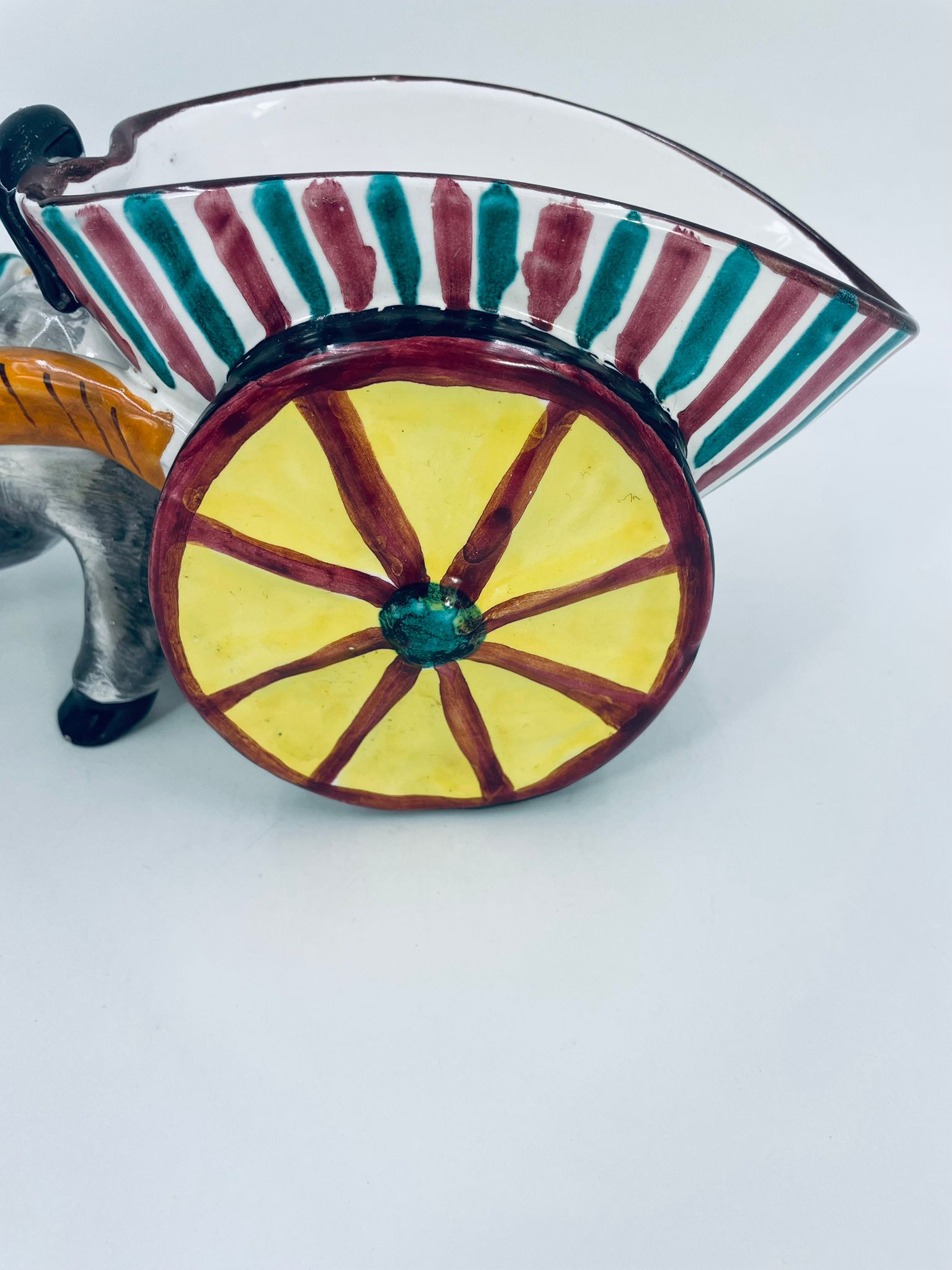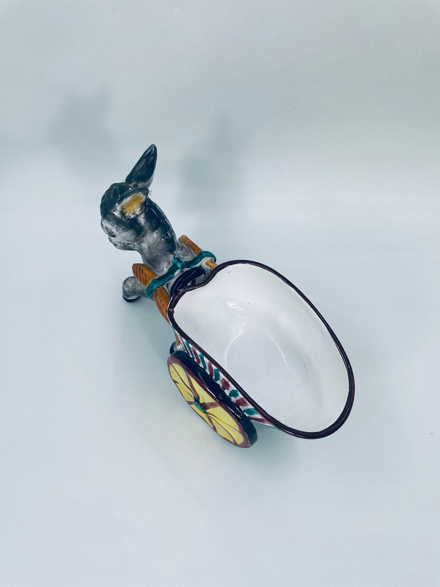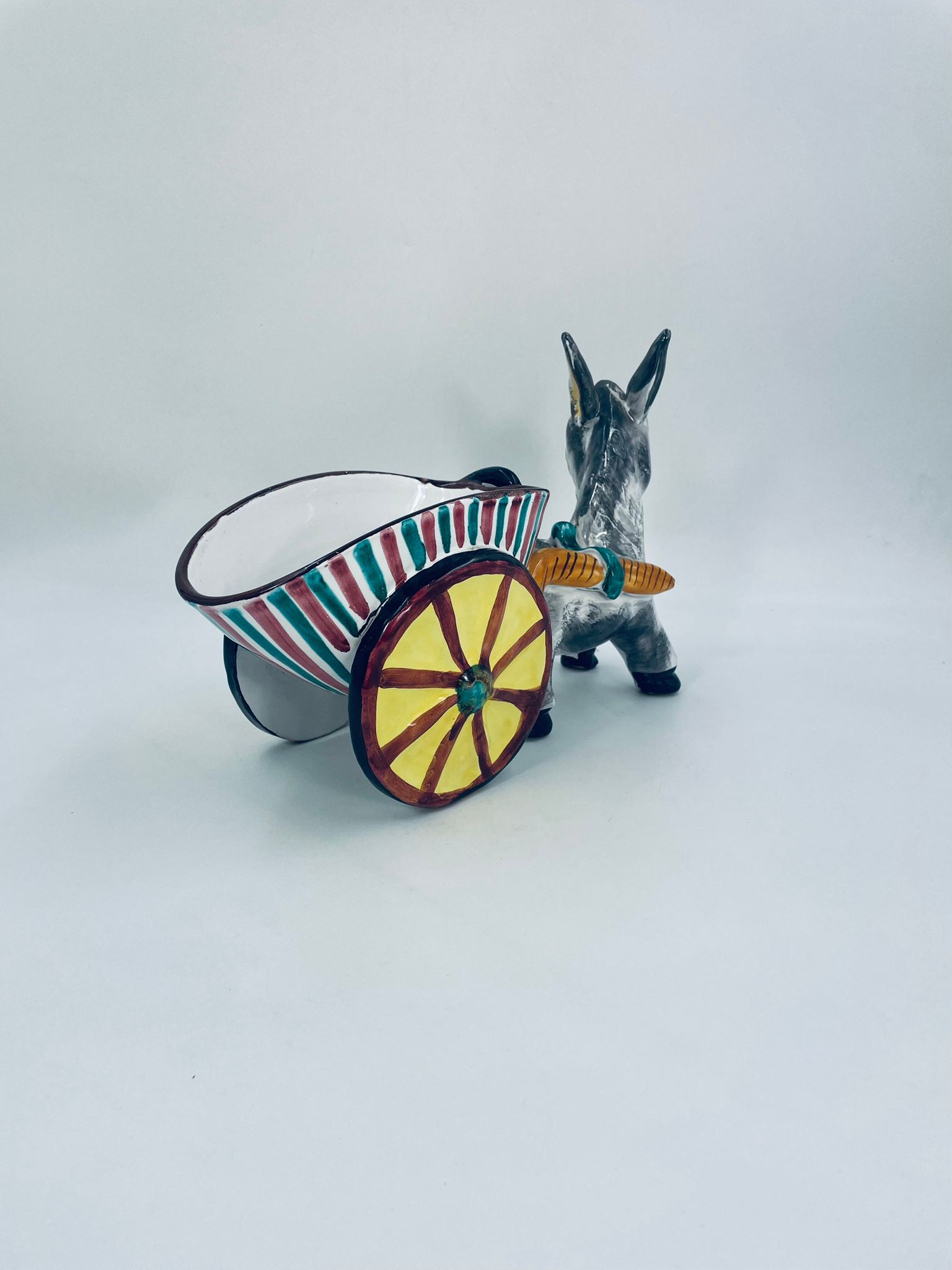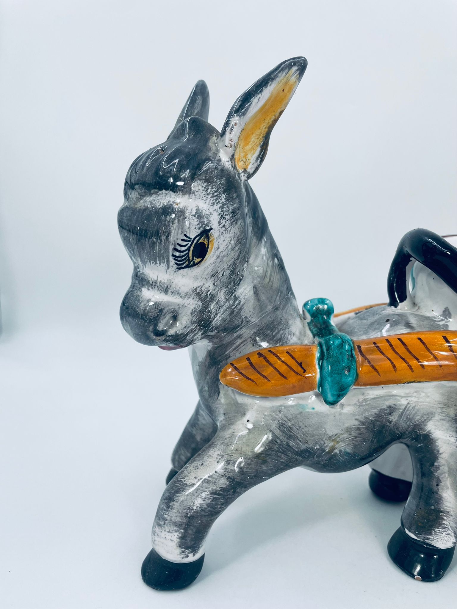 Figurka kolekcjonerska, doniczka, Włoska w stylu Vintage, wykonana z wysokiej jakości ceramiki. Figurka ręcznie malowana, przedstawia uroczego osiołka, zaprzężonego do dwukołowego wozu. Może służyć jako uroczy dodatek do ogrodu, doniczka, a także jako pojemnik. Posiada maleńki uszczerbek na nóżce, mało widoczny.