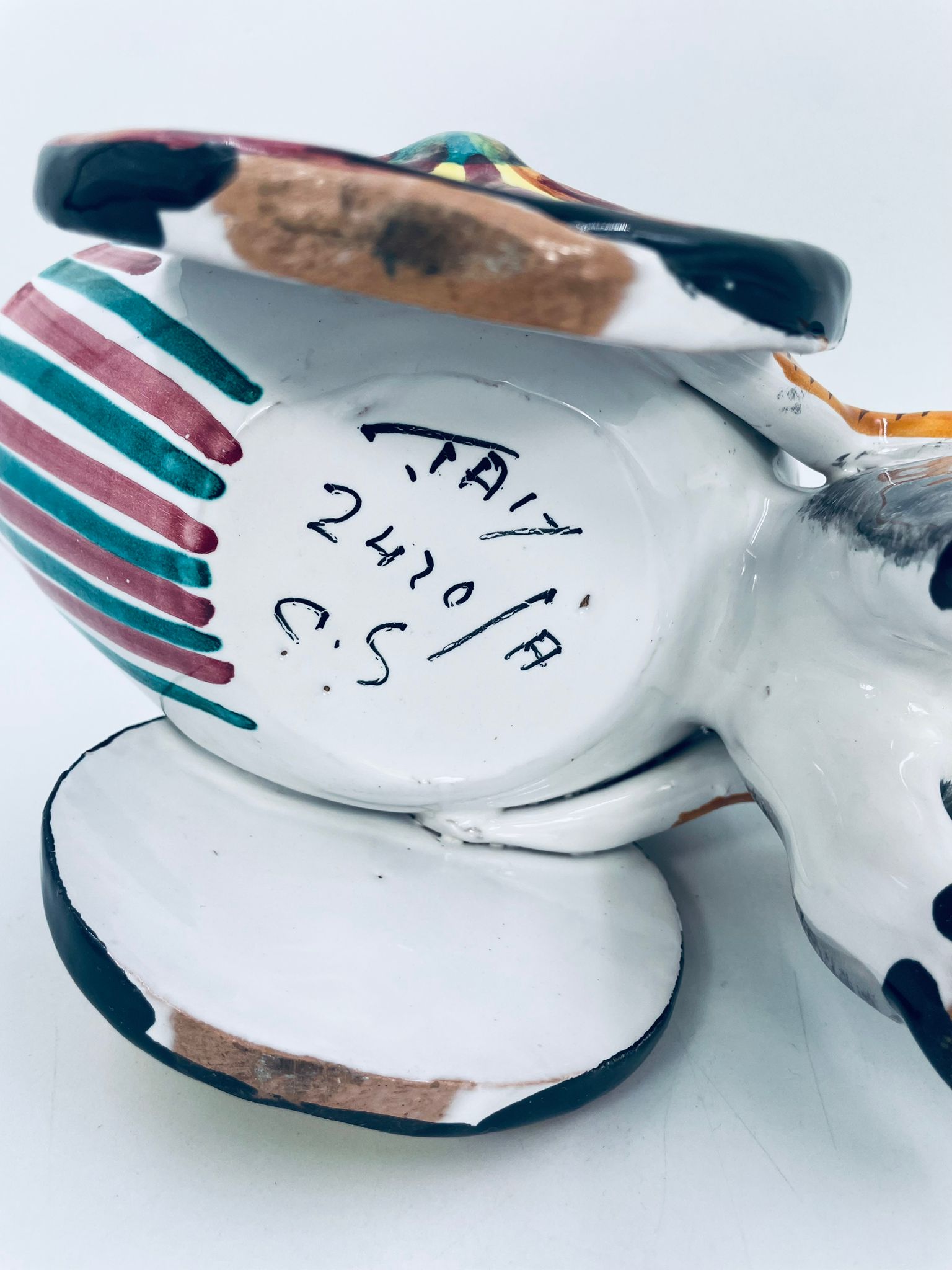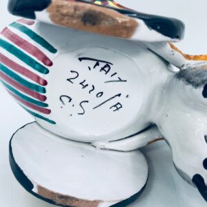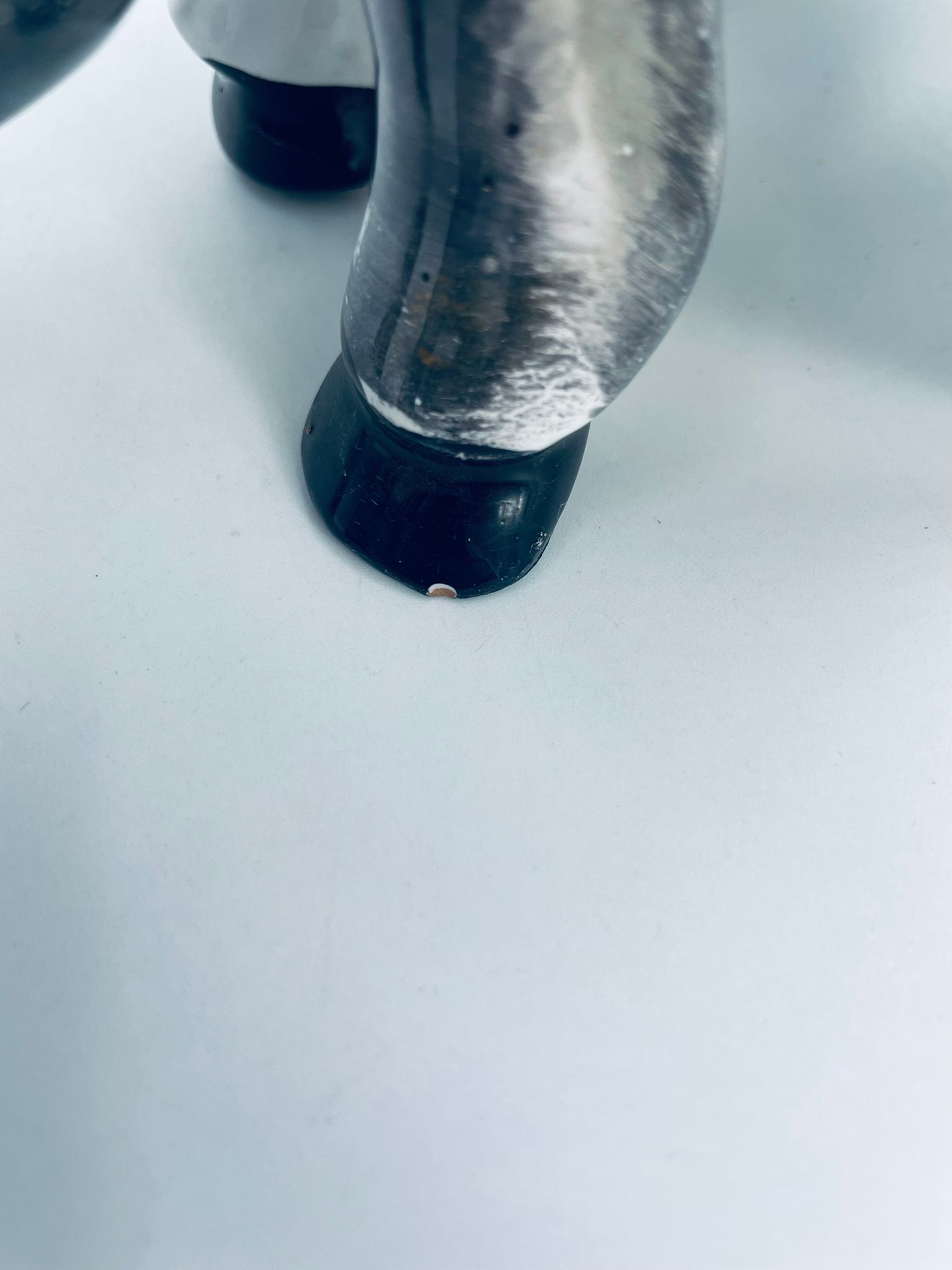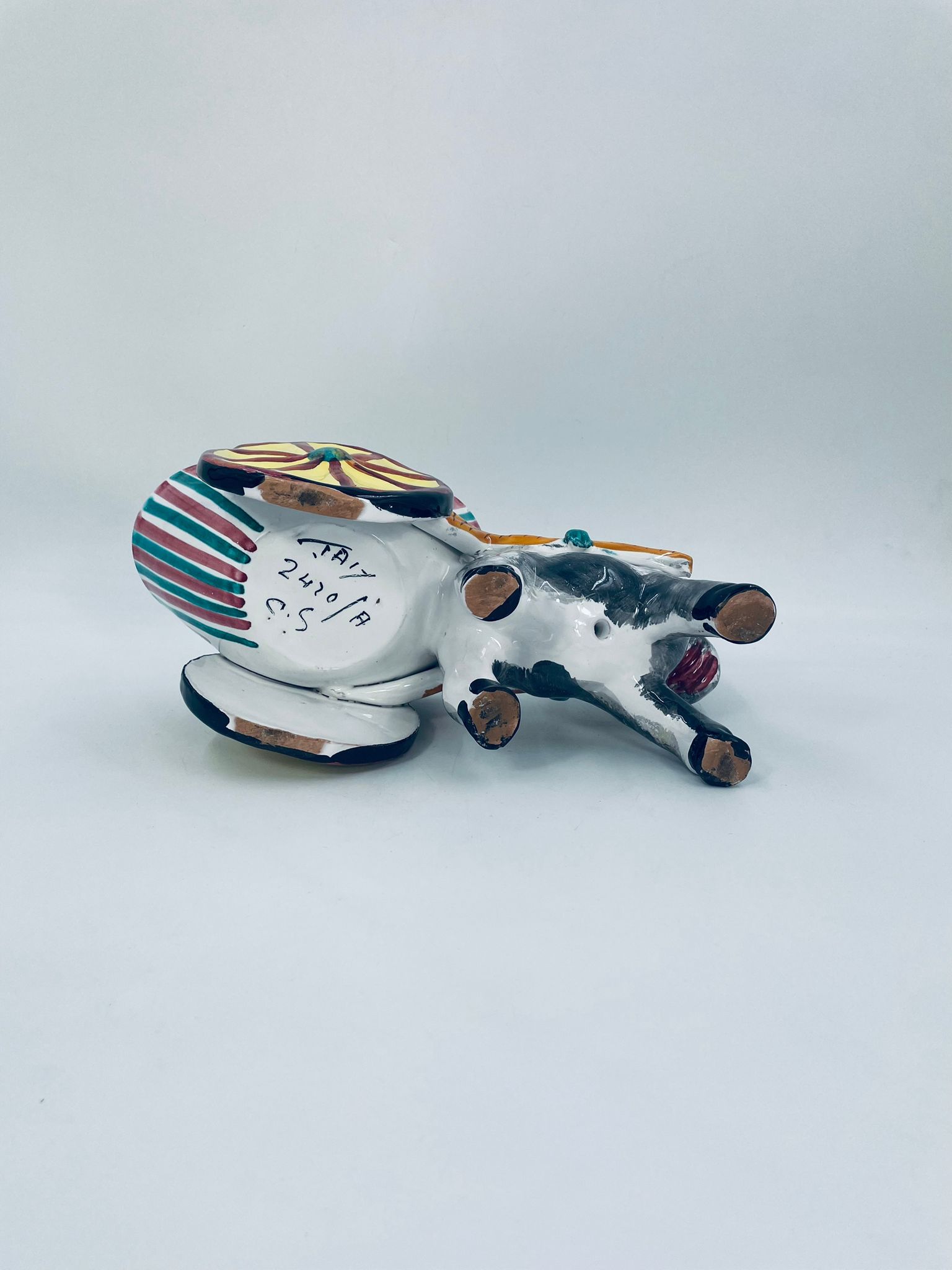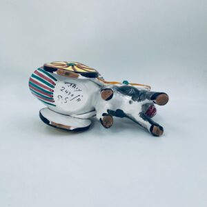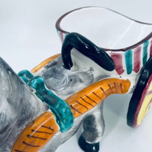 Figurka kolekcjonerska, doniczka, Włoska w stylu Vintage, wykonana z wysokiej jakości ceramiki. Figurka ręcznie malowana, przedstawia uroczego osiołka, zaprzężonego do dwukołowego wozu. Może służyć jako uroczy dodatek do ogrodu, doniczka, a także jako pojemnik. Posiada maleńki uszczerbek na nóżce, mało widoczny.