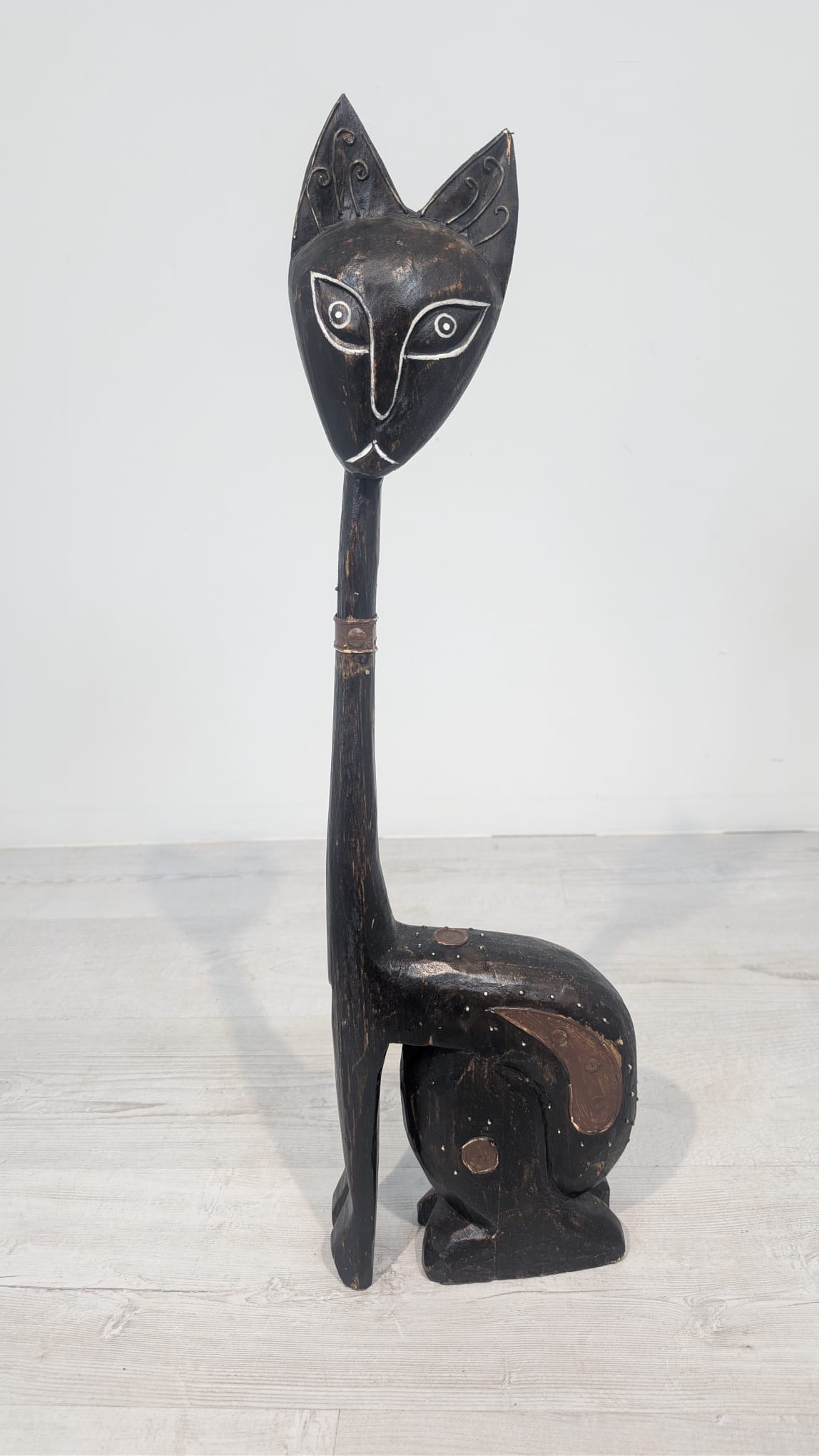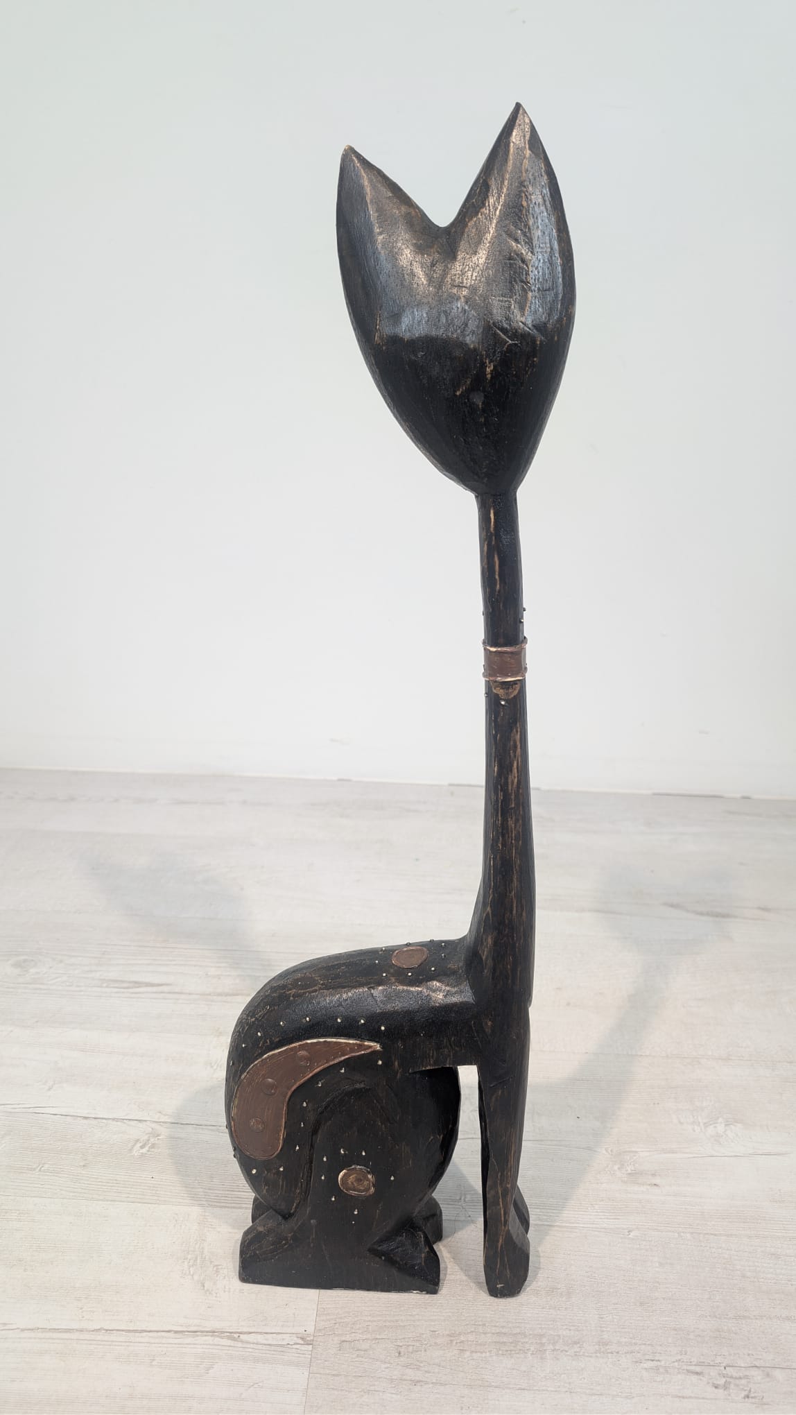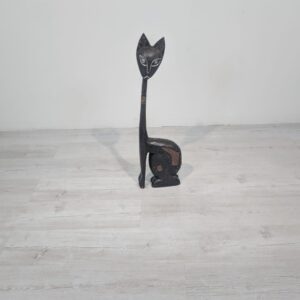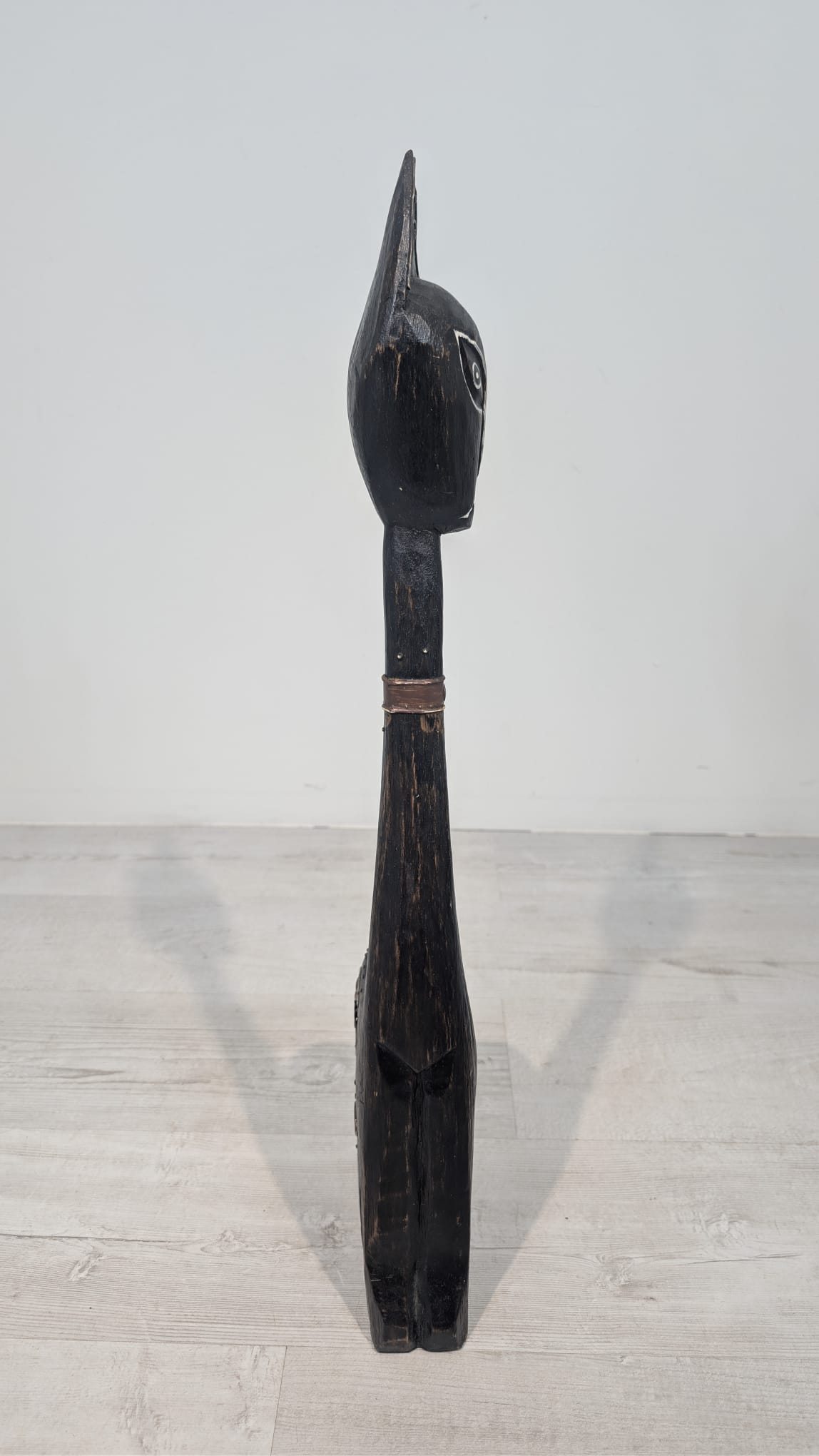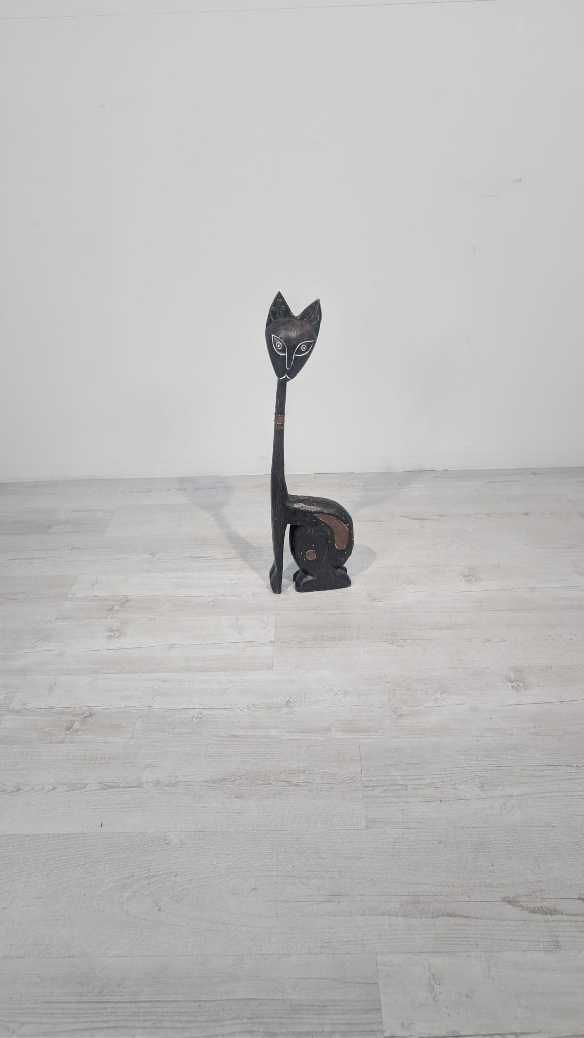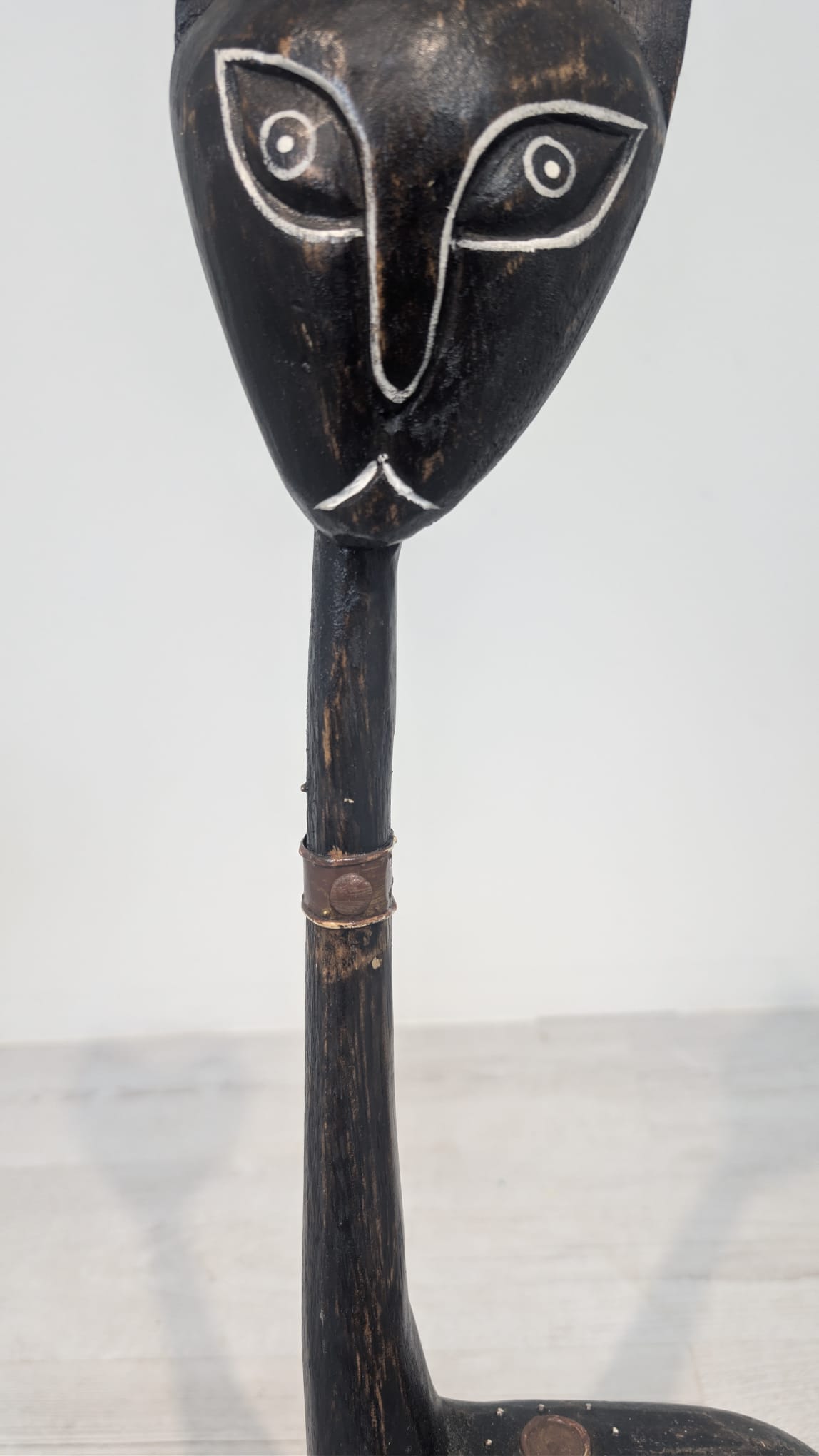 Drewniana figurka kota w stylu etnicznym. Ręcznie wykonana, z wyraźnymi śladami użytkowania. Czarna, stylizowana postać kota z charakterystycznymi dużymi oczami. Unikatowy, dekoracyjny element do domu lub ogrodu.