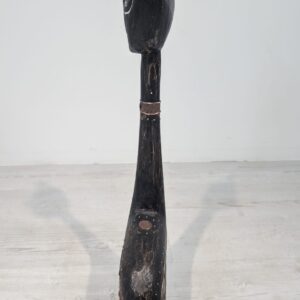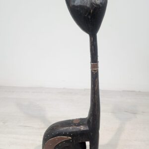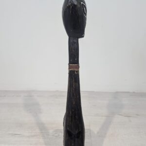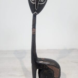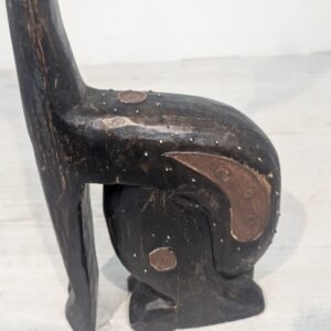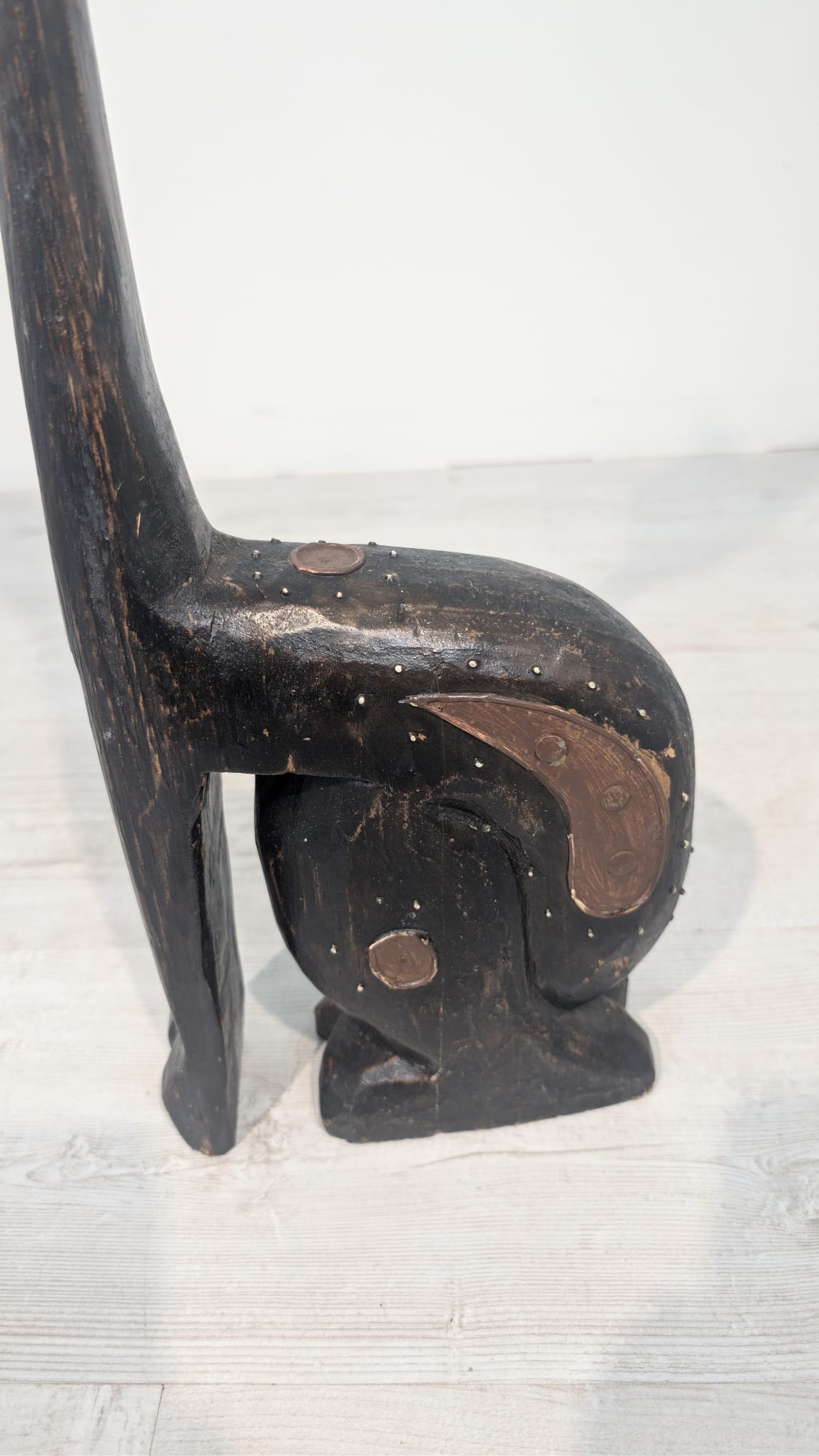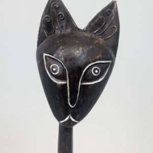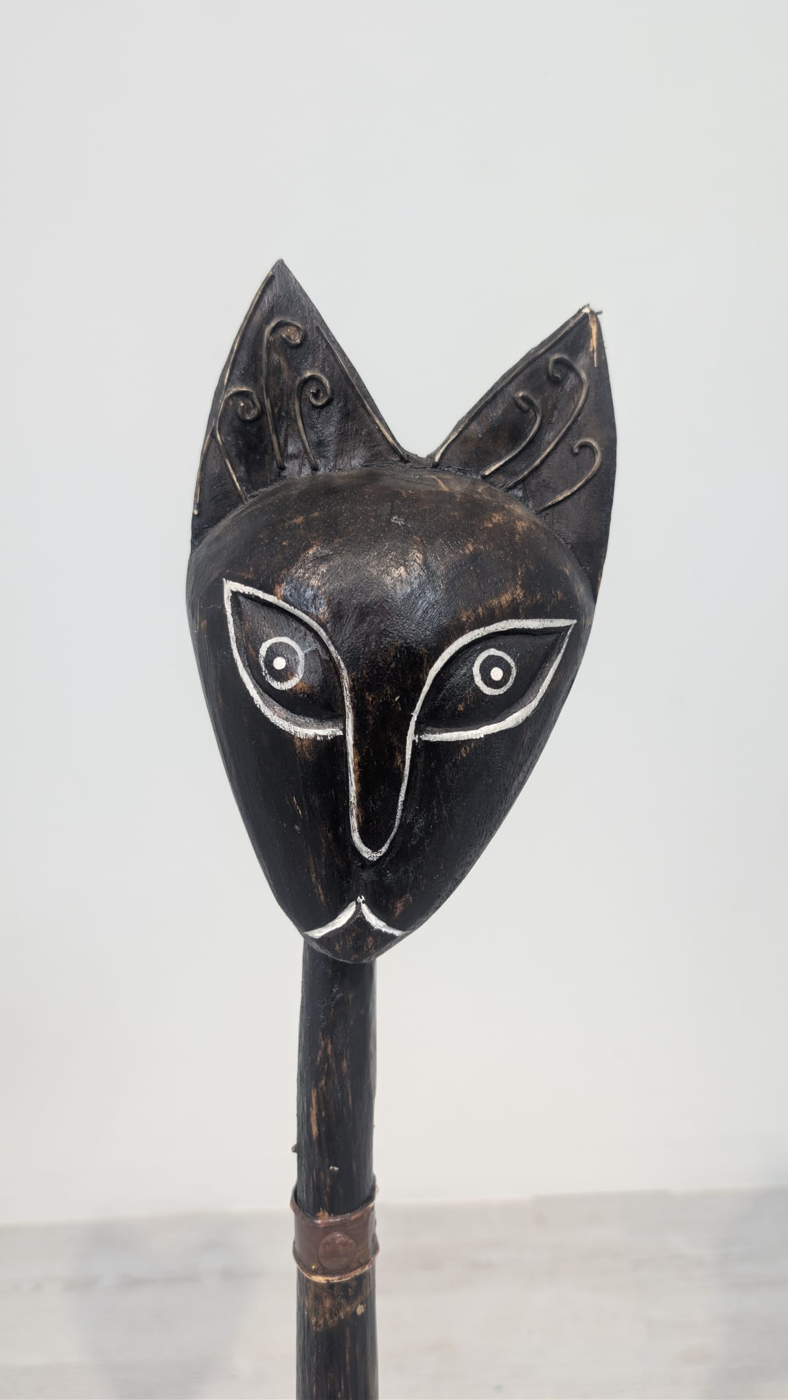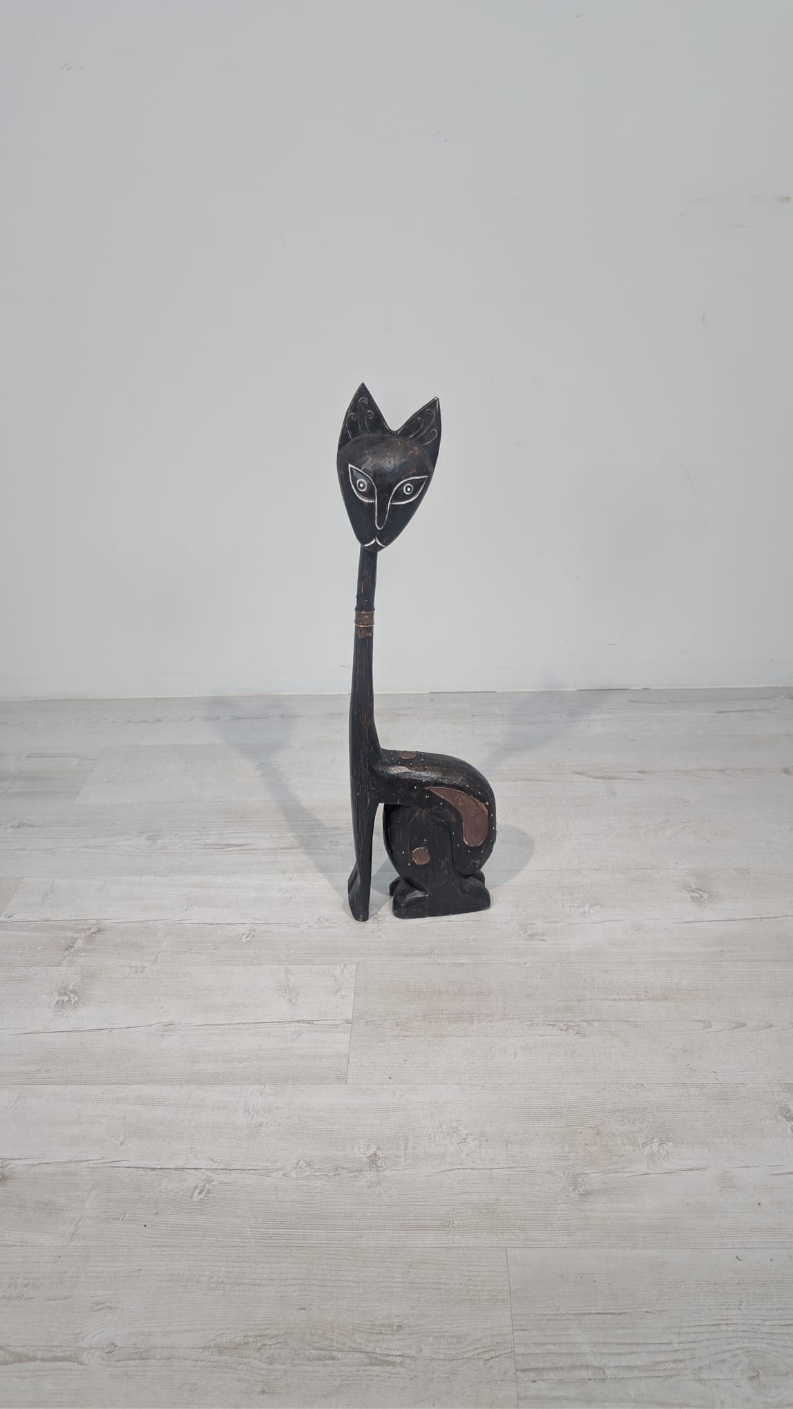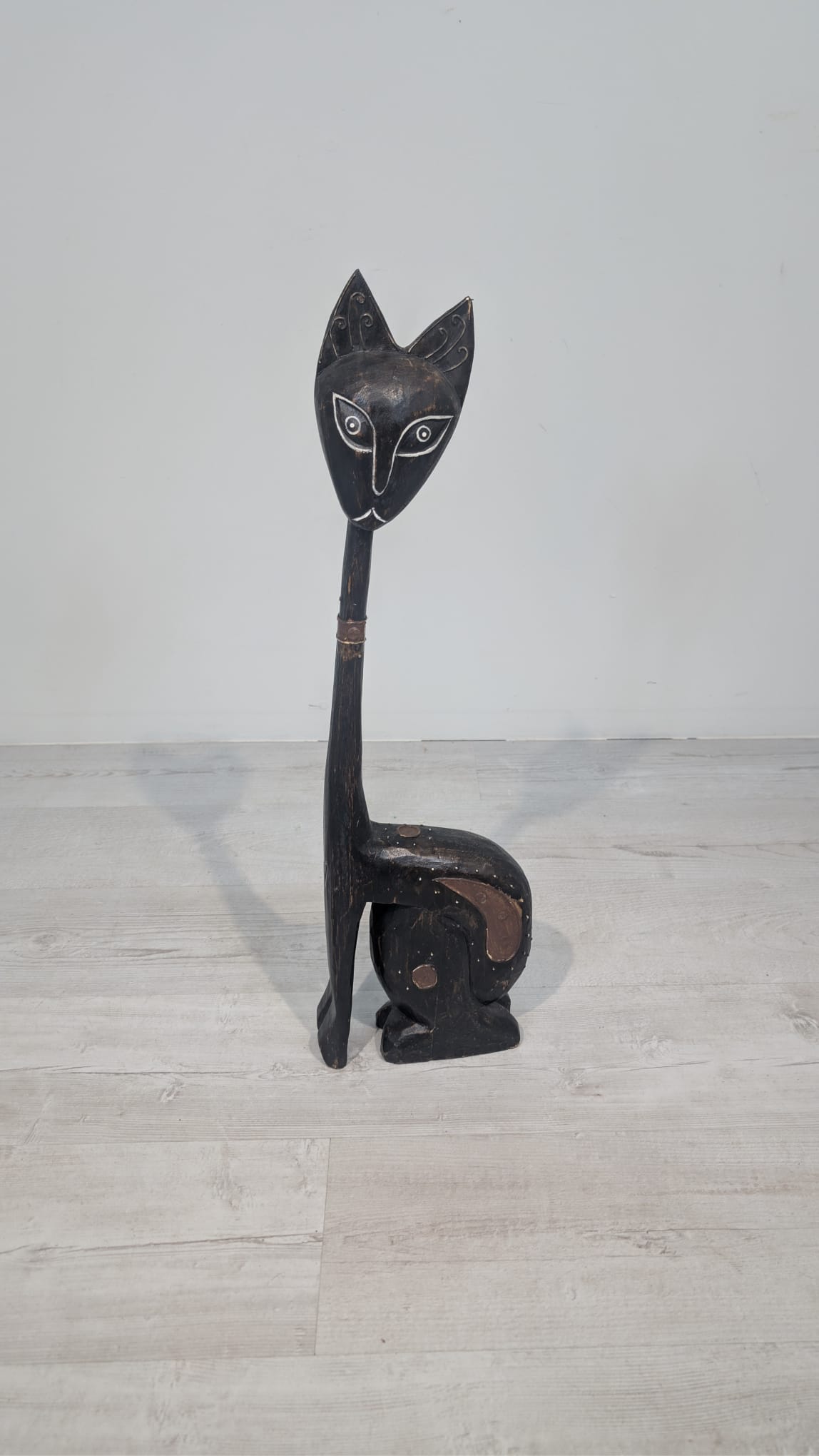Drewniana figurka kota w stylu etnicznym. Ręcznie wykonana, z wyraźnymi śladami użytkowania. Czarna, stylizowana postać kota z charakterystycznymi dużymi oczami. Unikatowy, dekoracyjny element do domu lub ogrodu.