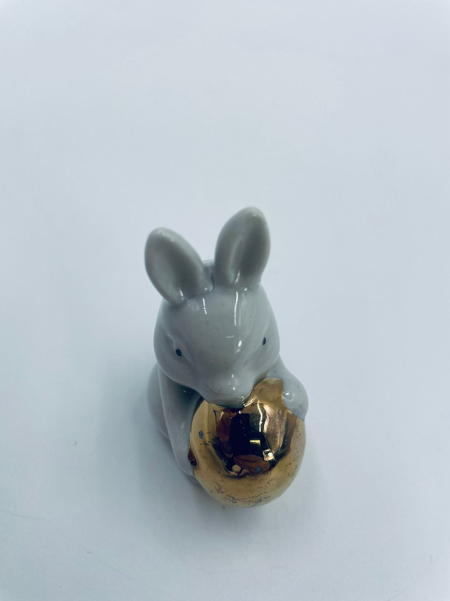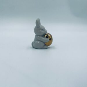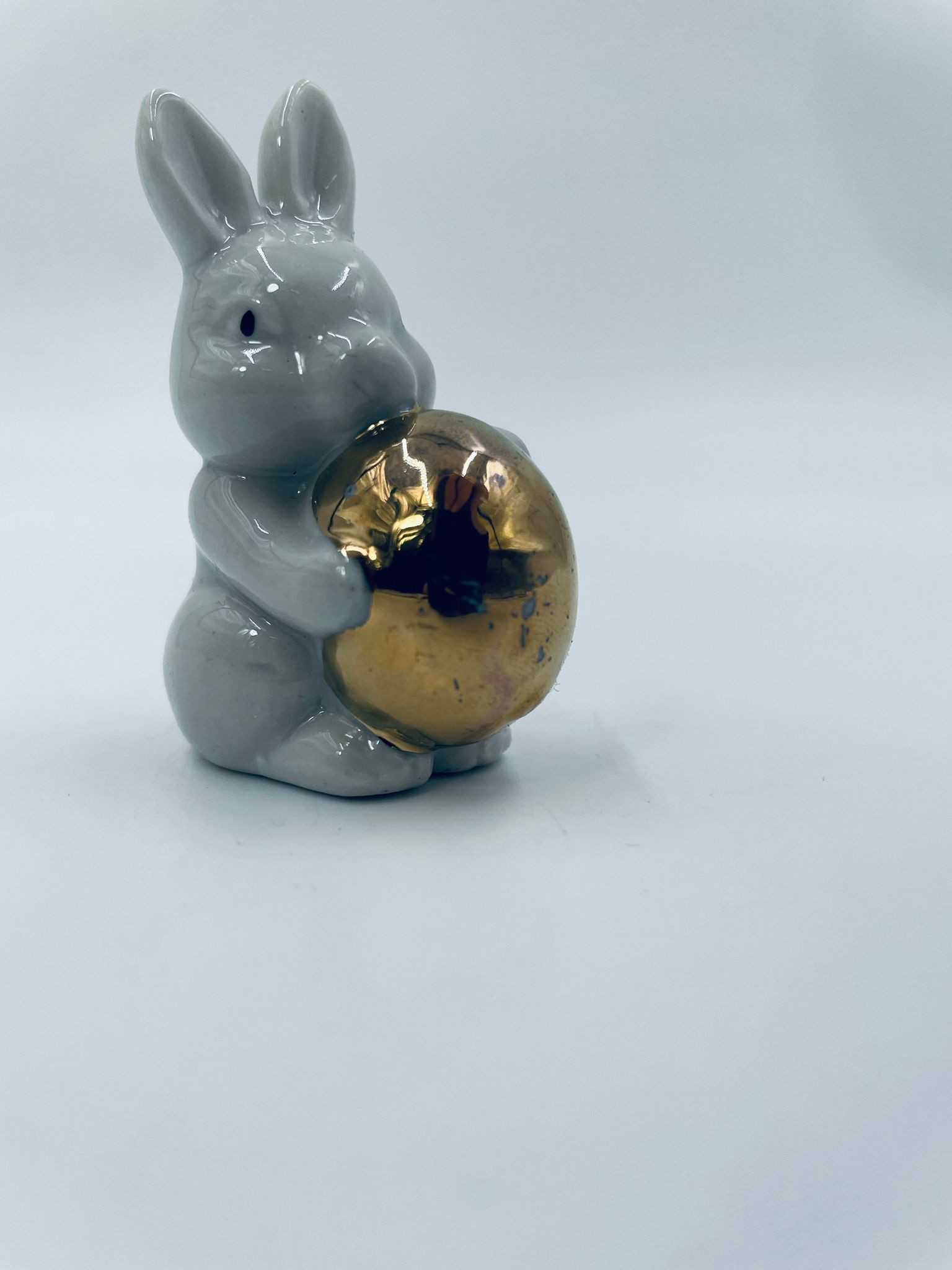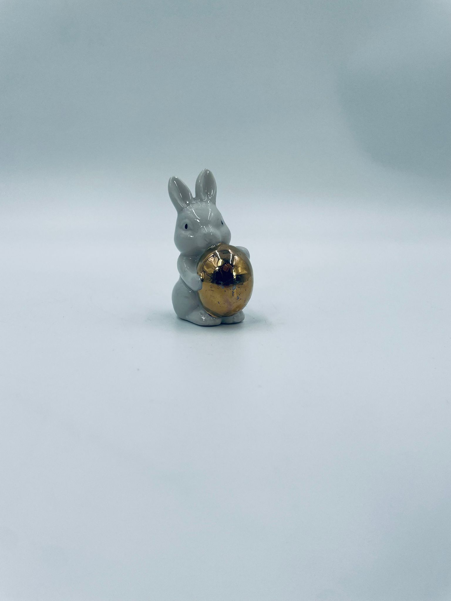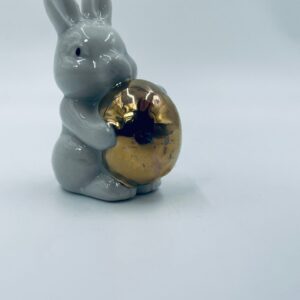Figurka kolekcjonerska w stylu Vintage, wykonana z wysokiej jakości białej ceramiki. Figurka przedstawia małego, uroczego zajaczka, trzymającego złote jajko. Posiada przetarcie na złoceniu oraz pęknięcie.