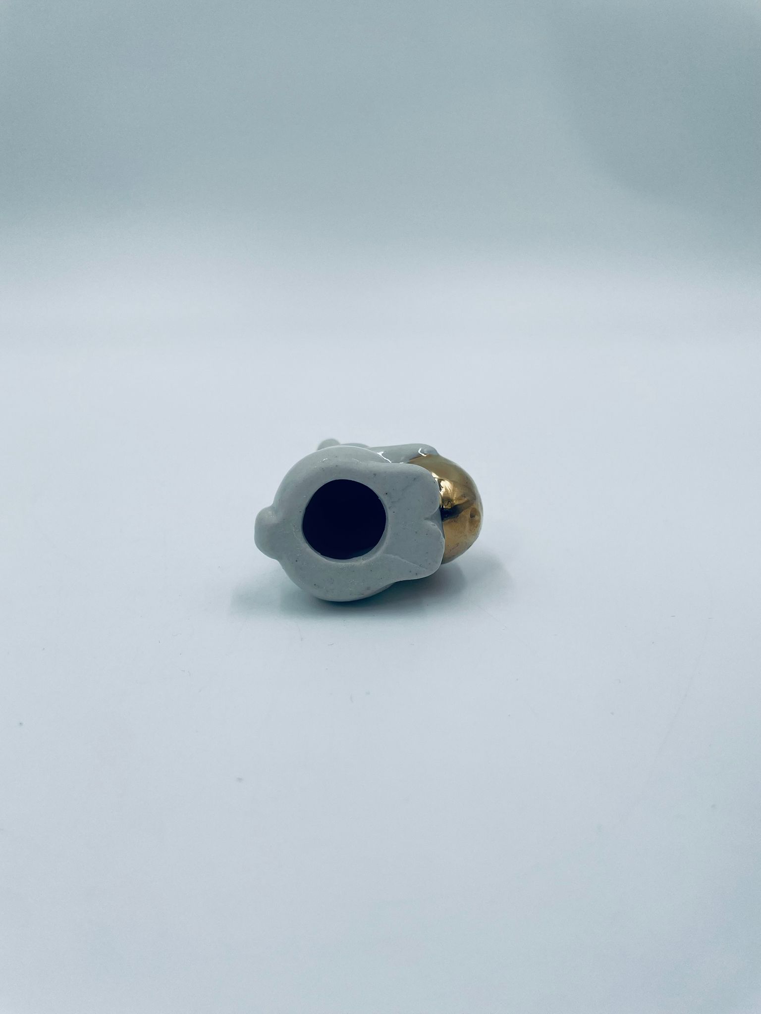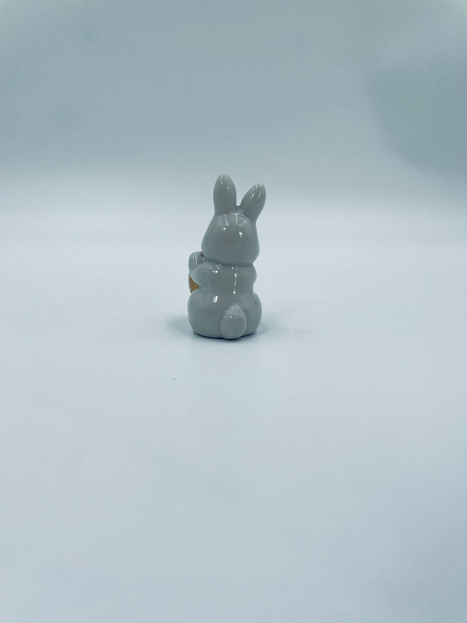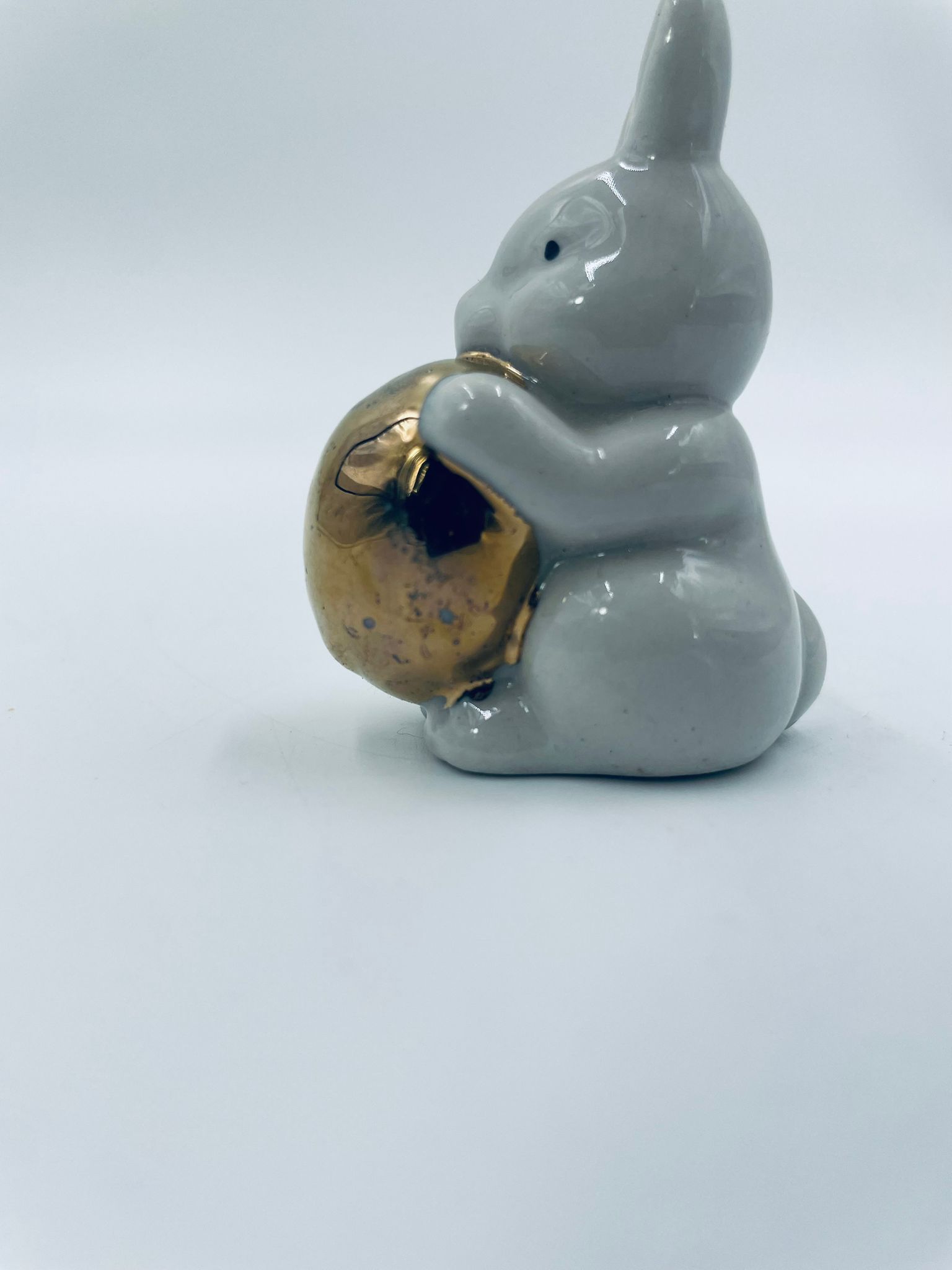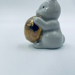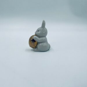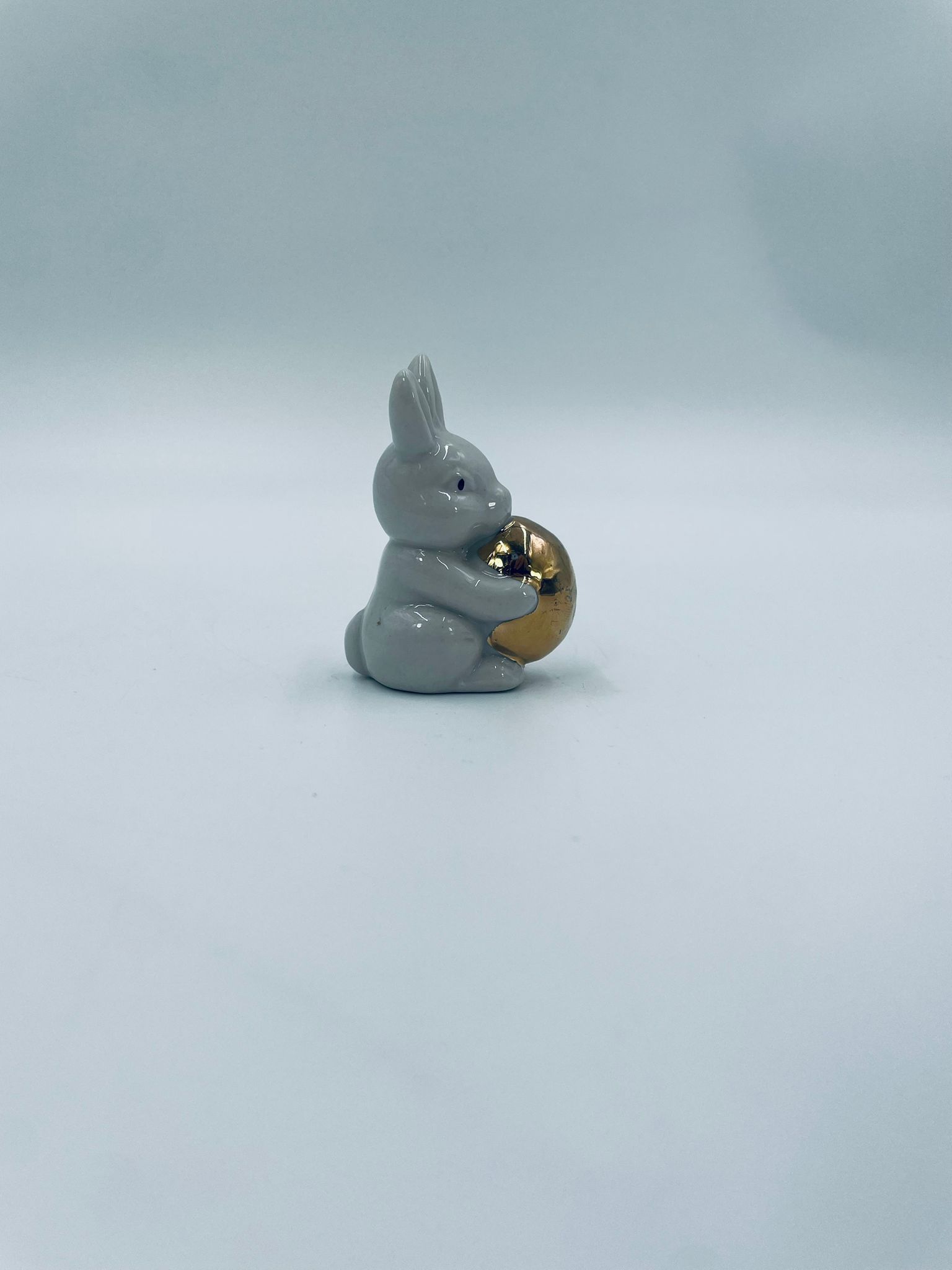 Figurka kolekcjonerska w stylu Vintage, wykonana z wysokiej jakości białej ceramiki. Figurka przedstawia małego, uroczego zajaczka, trzymającego złote jajko. Posiada przetarcie na złoceniu oraz pęknięcie.