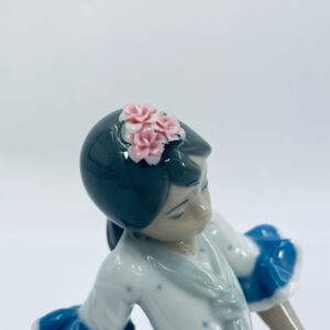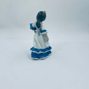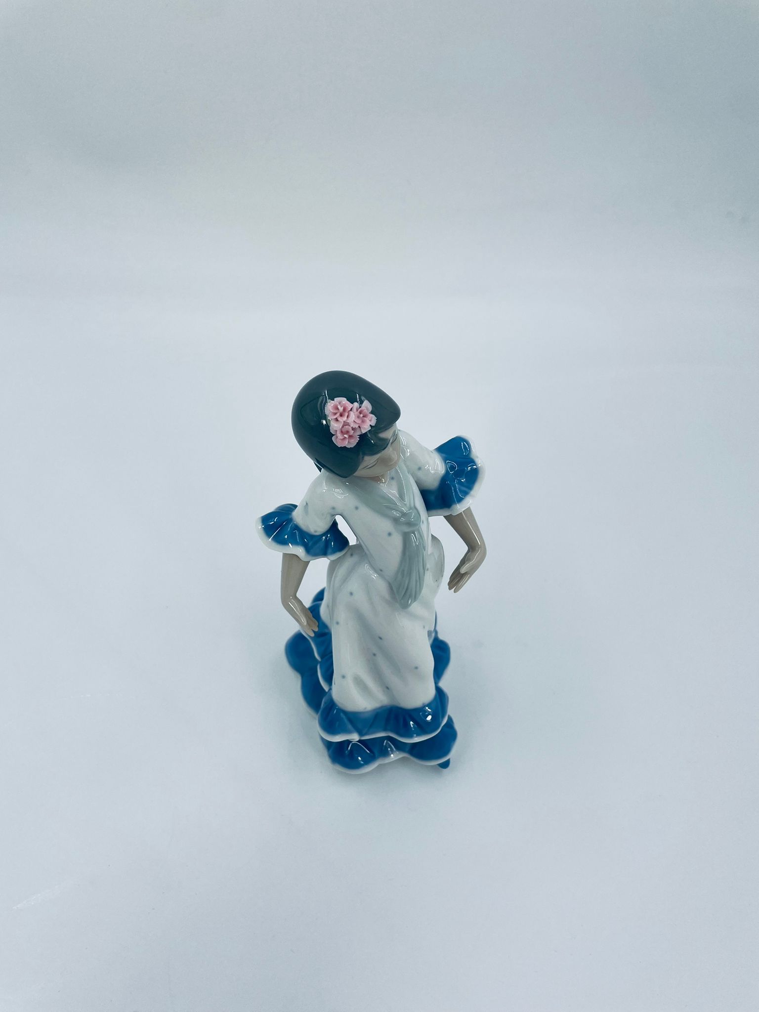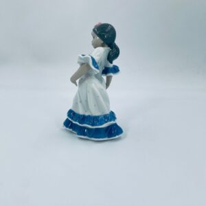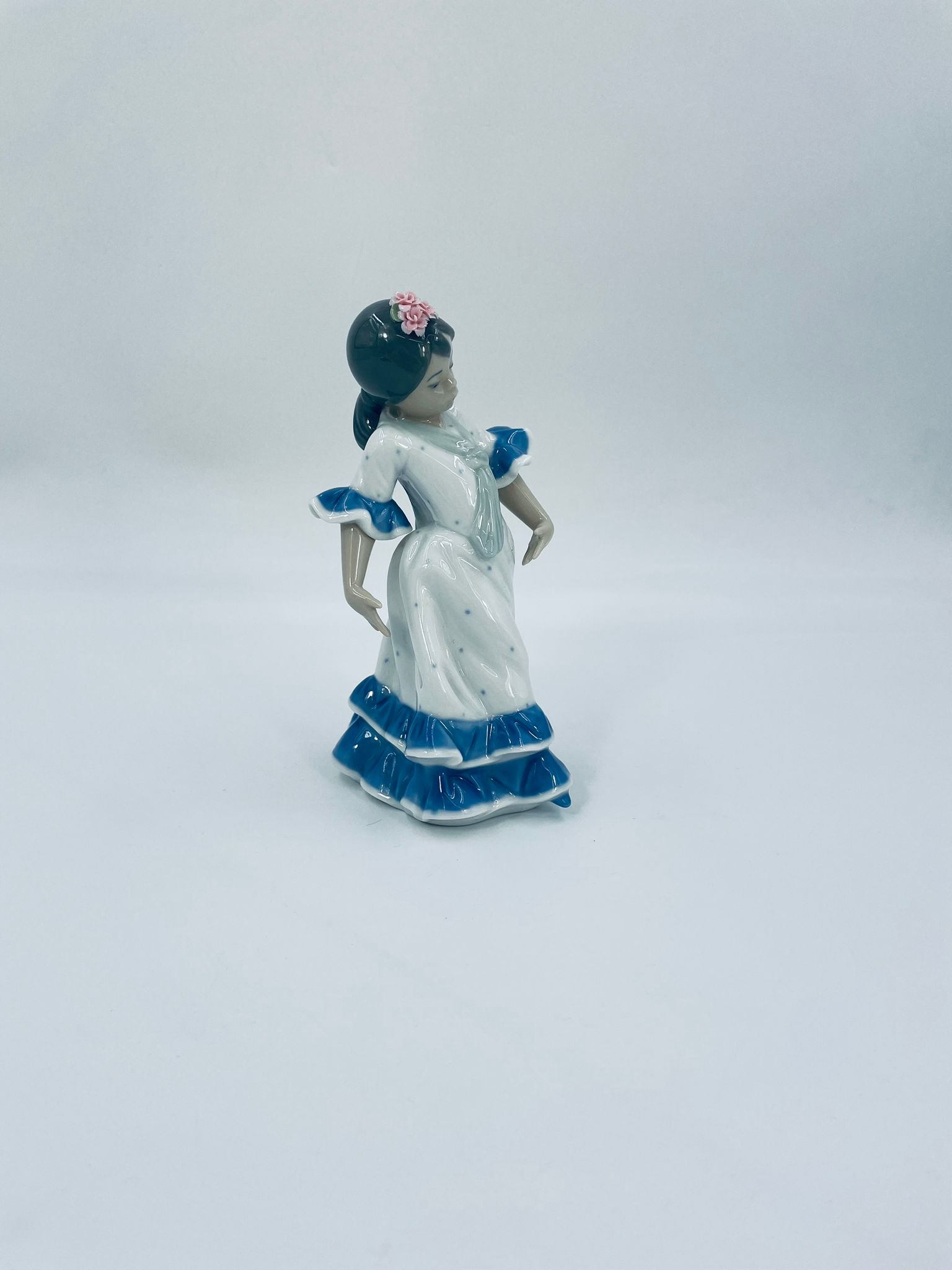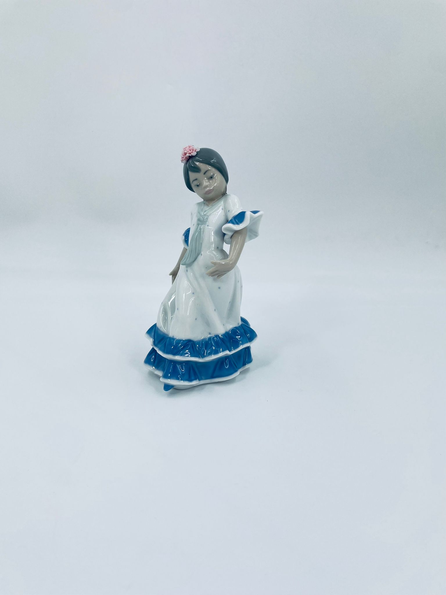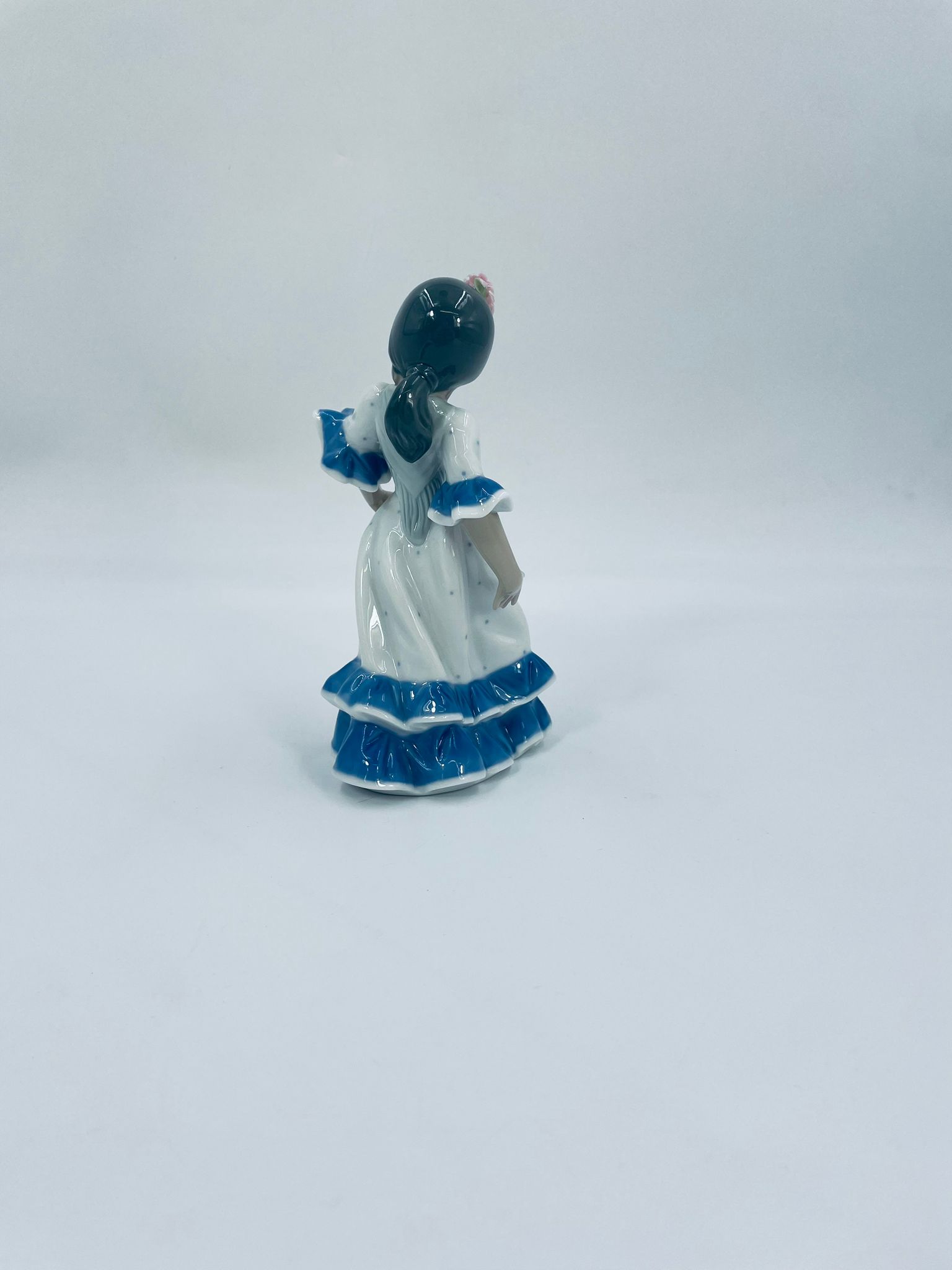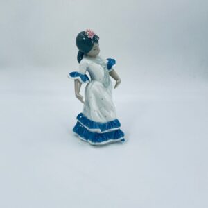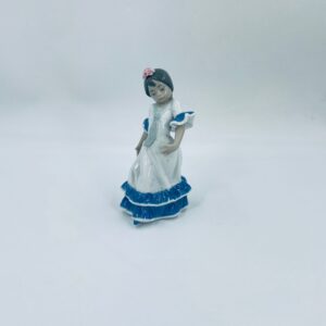Figurka kolekcjonerska hiszpańskiej wytwórni Lladro Juanita, wykonana z najwyz jakości porcelany. Figurka ręcznie robiona, przedstawiająca młodą dziewczynę, tancerkę flamenco w pięknej, falbaniastej sukni w kolorze biało niebieskim, wyróżniającą się delikatnymi różowymi kwiatkami we włosach.