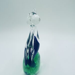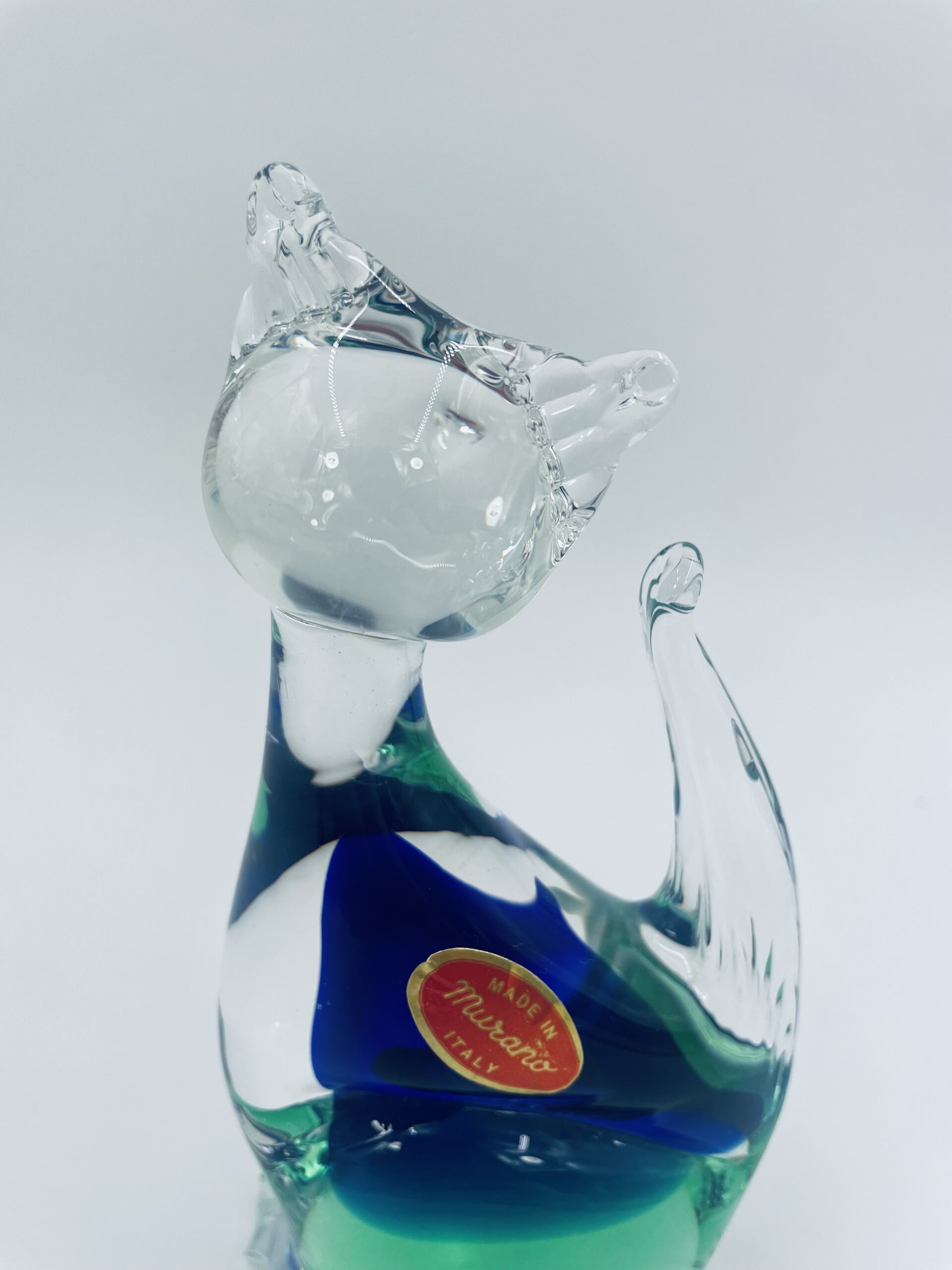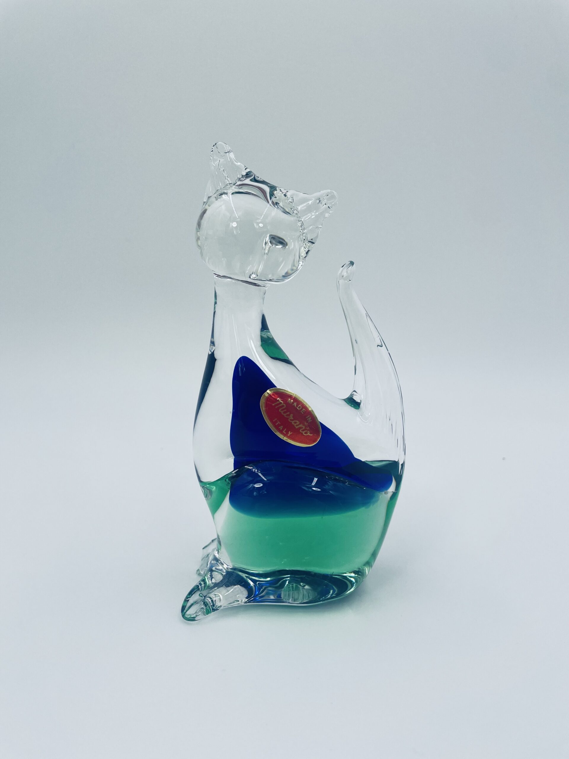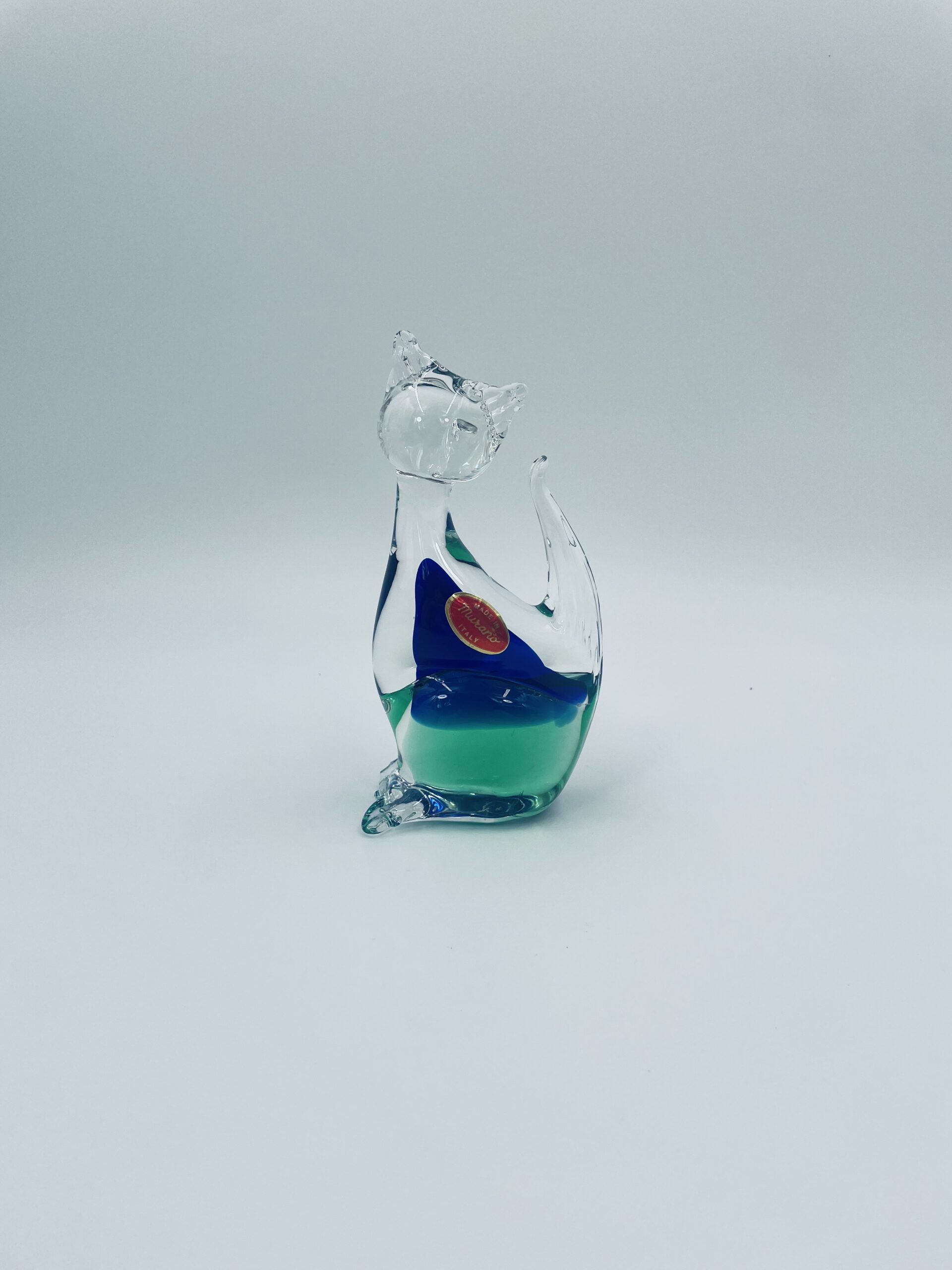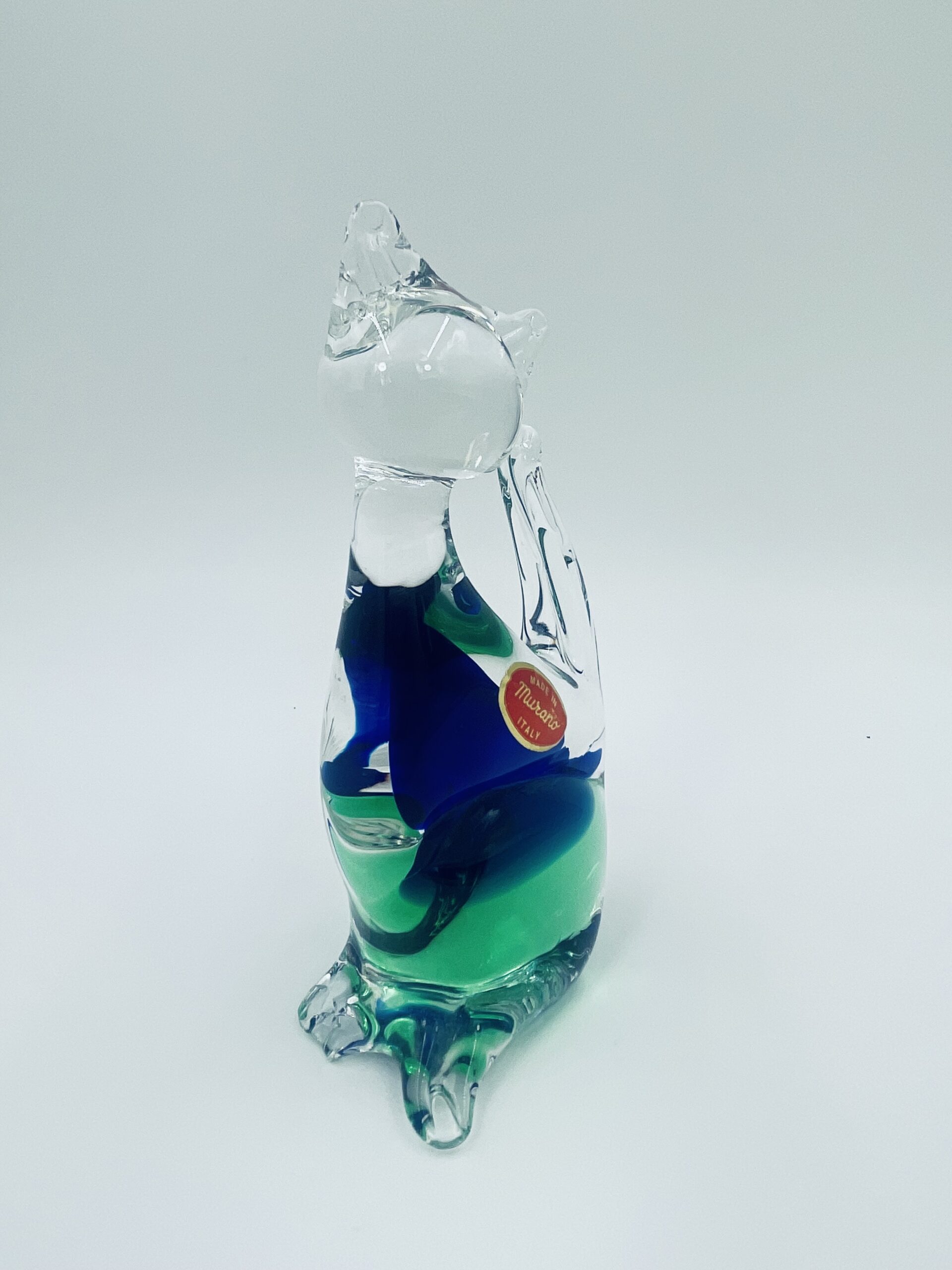 Figurka kota ze szkła Murano w stylu vintage, niebiesko-zielona i przezroczysta, z oryginalną naklejką Murano Włochy.