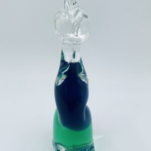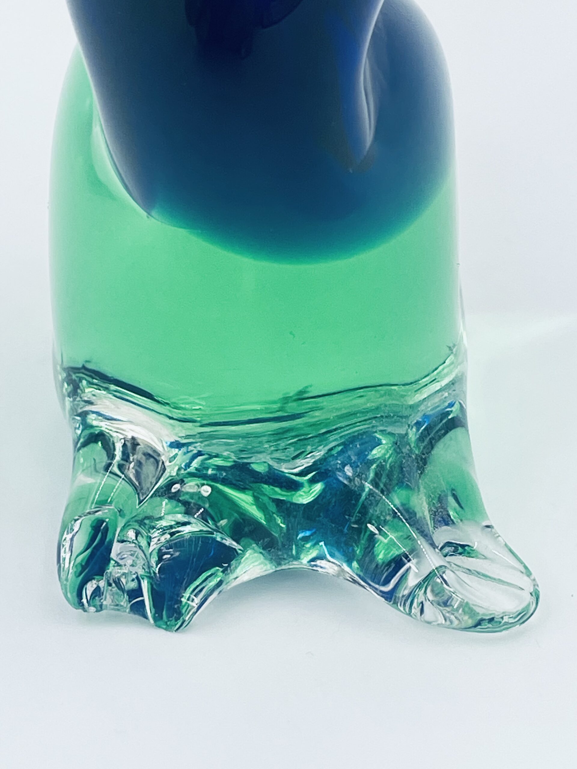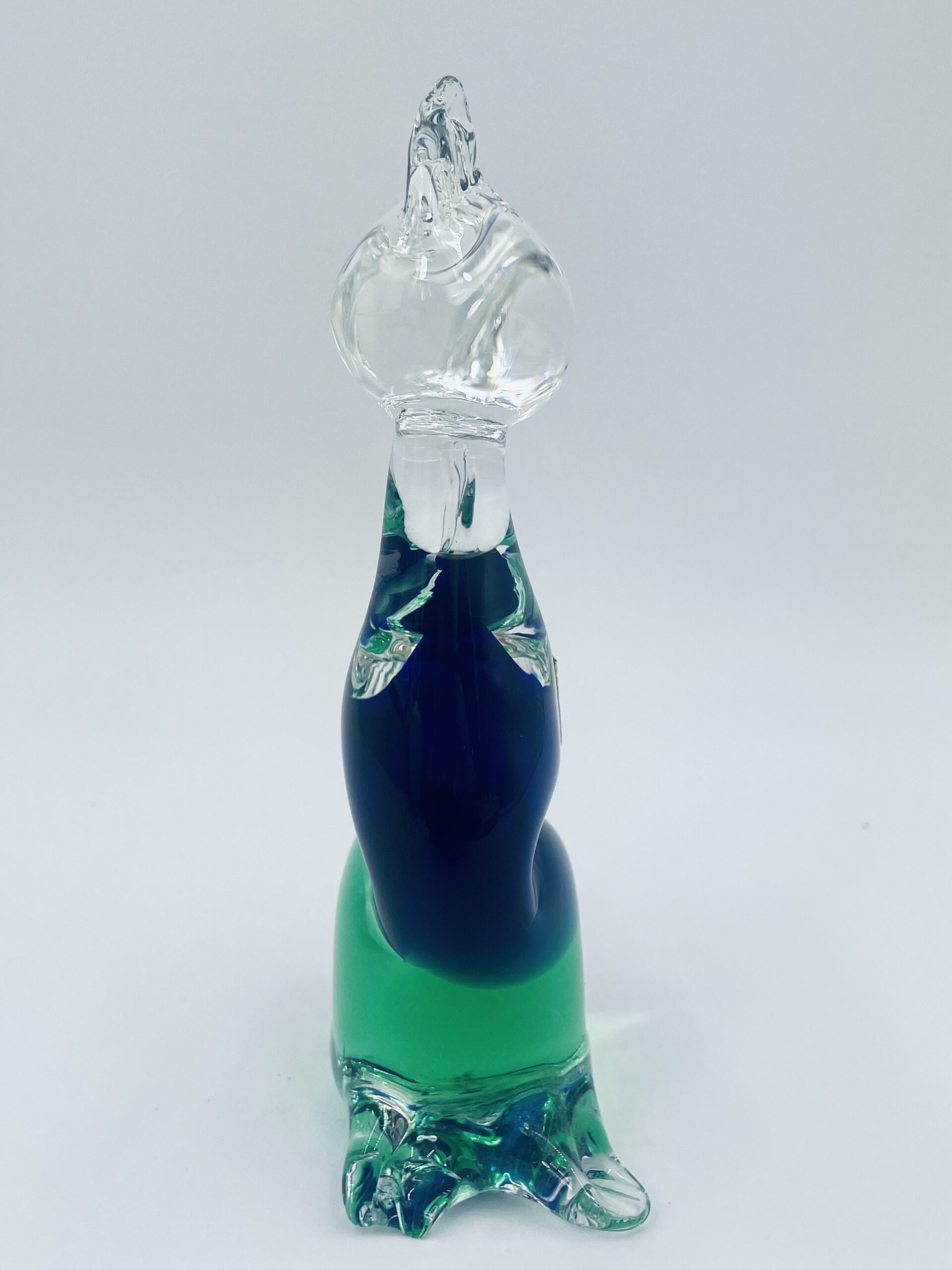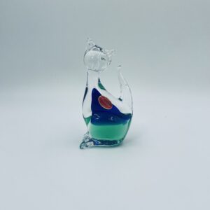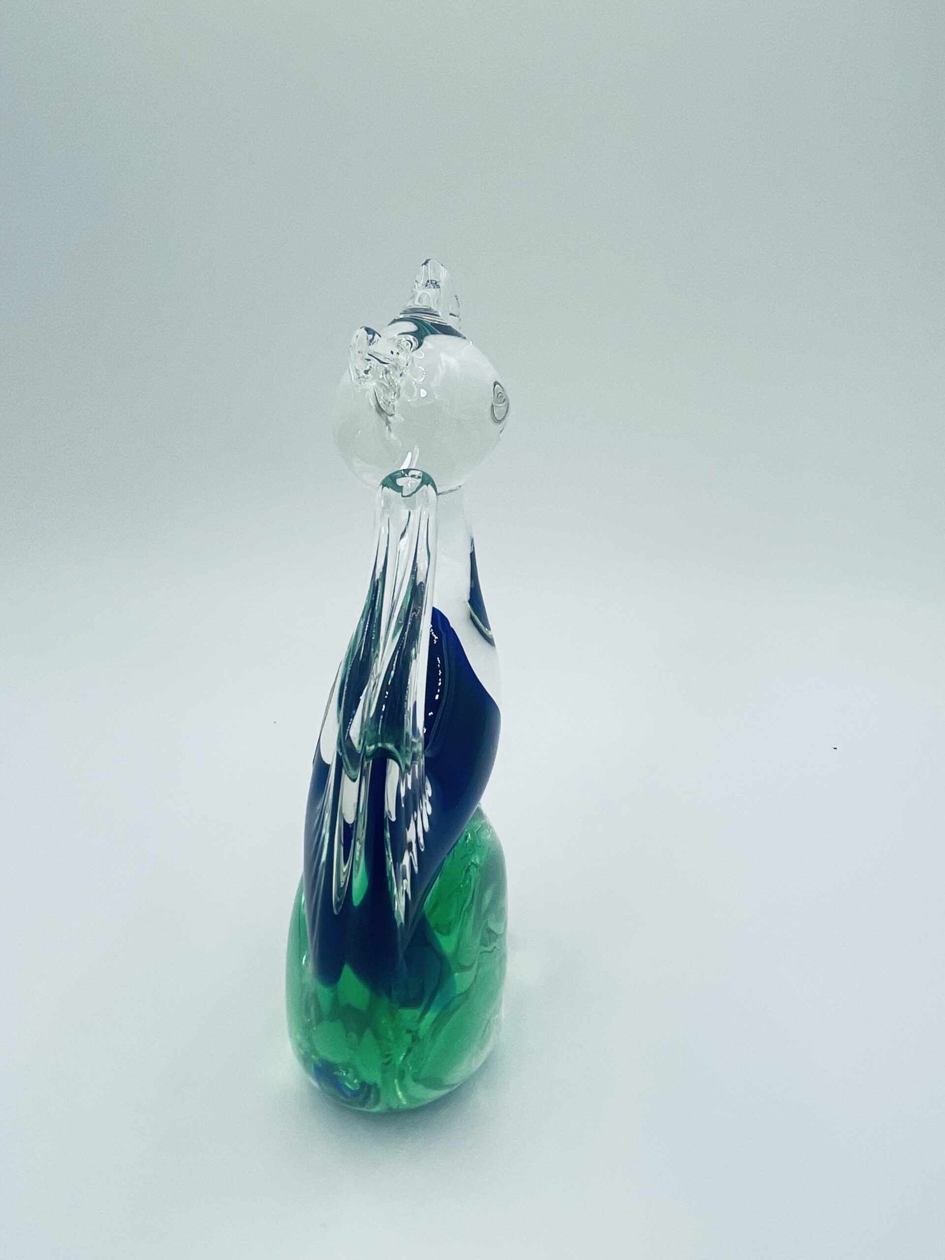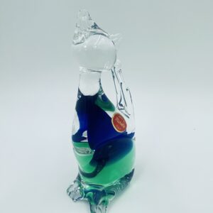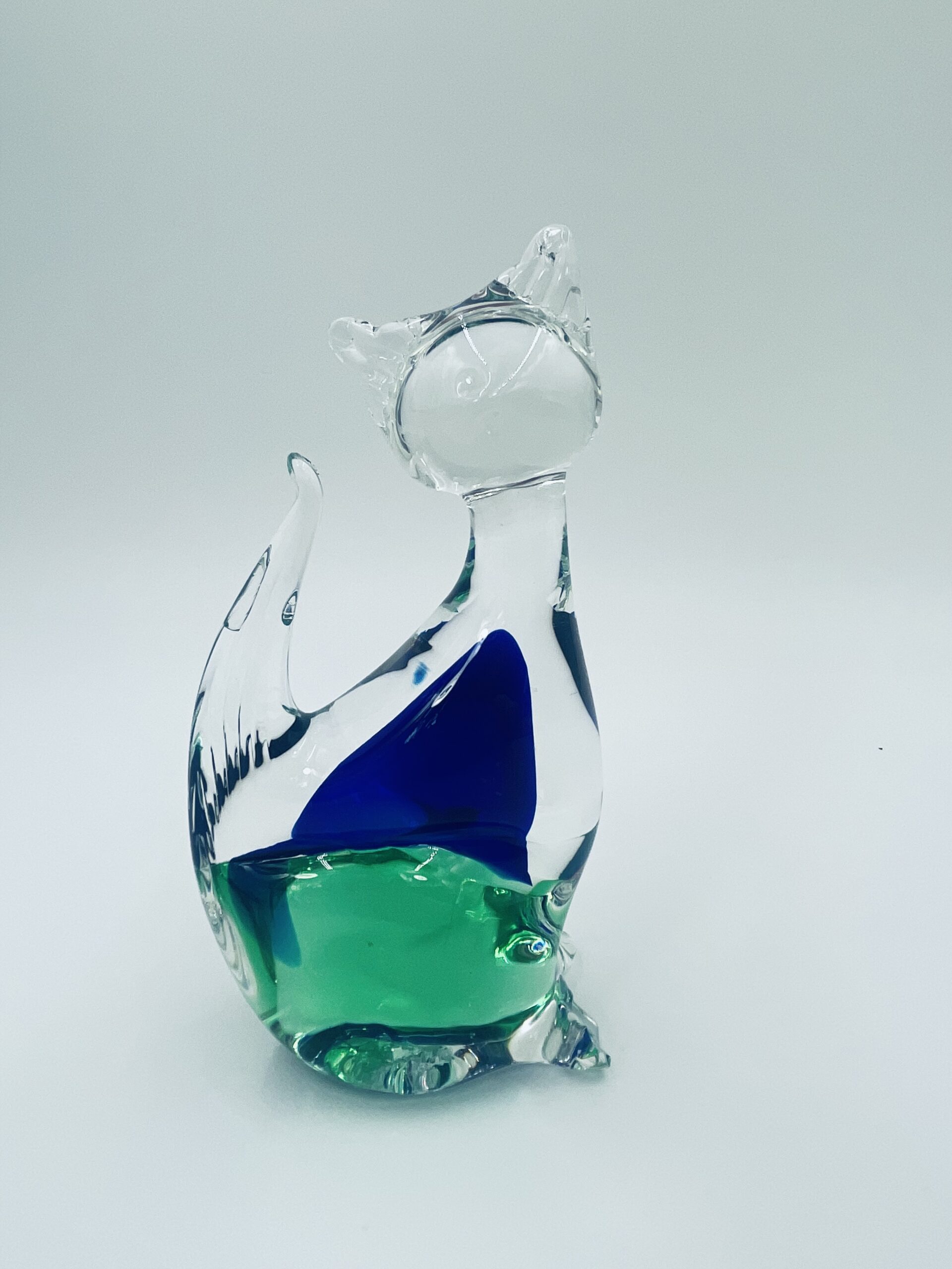 Figurka kota ze szkła Murano w stylu vintage, niebiesko-zielona i przezroczysta, z oryginalną naklejką Murano Włochy.