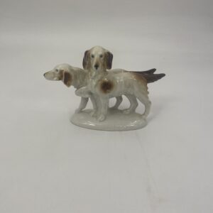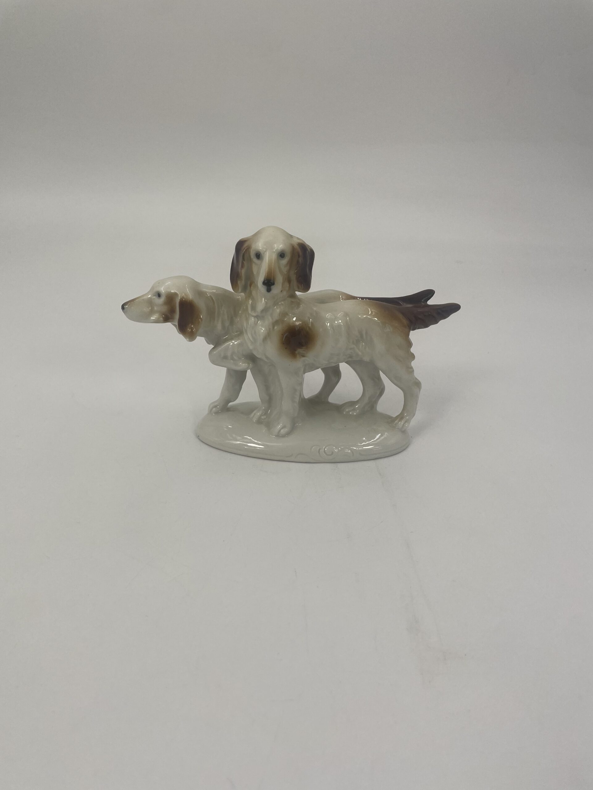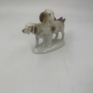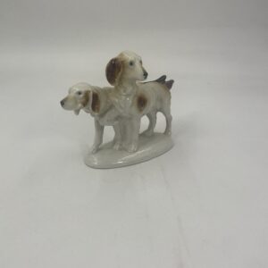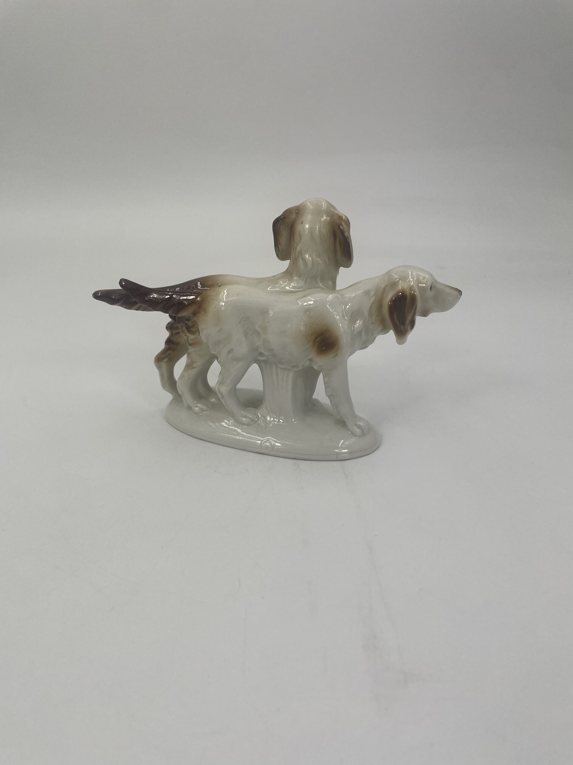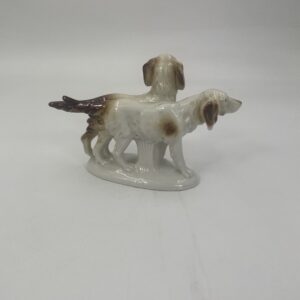 Figurka przedstawia psy myśliwskie Spaniel. Porcelana pochodzi z wytwórni Carl Scheidig Niemcy z lat 1935-1990. Figurka w kolorze ecru-brąz.