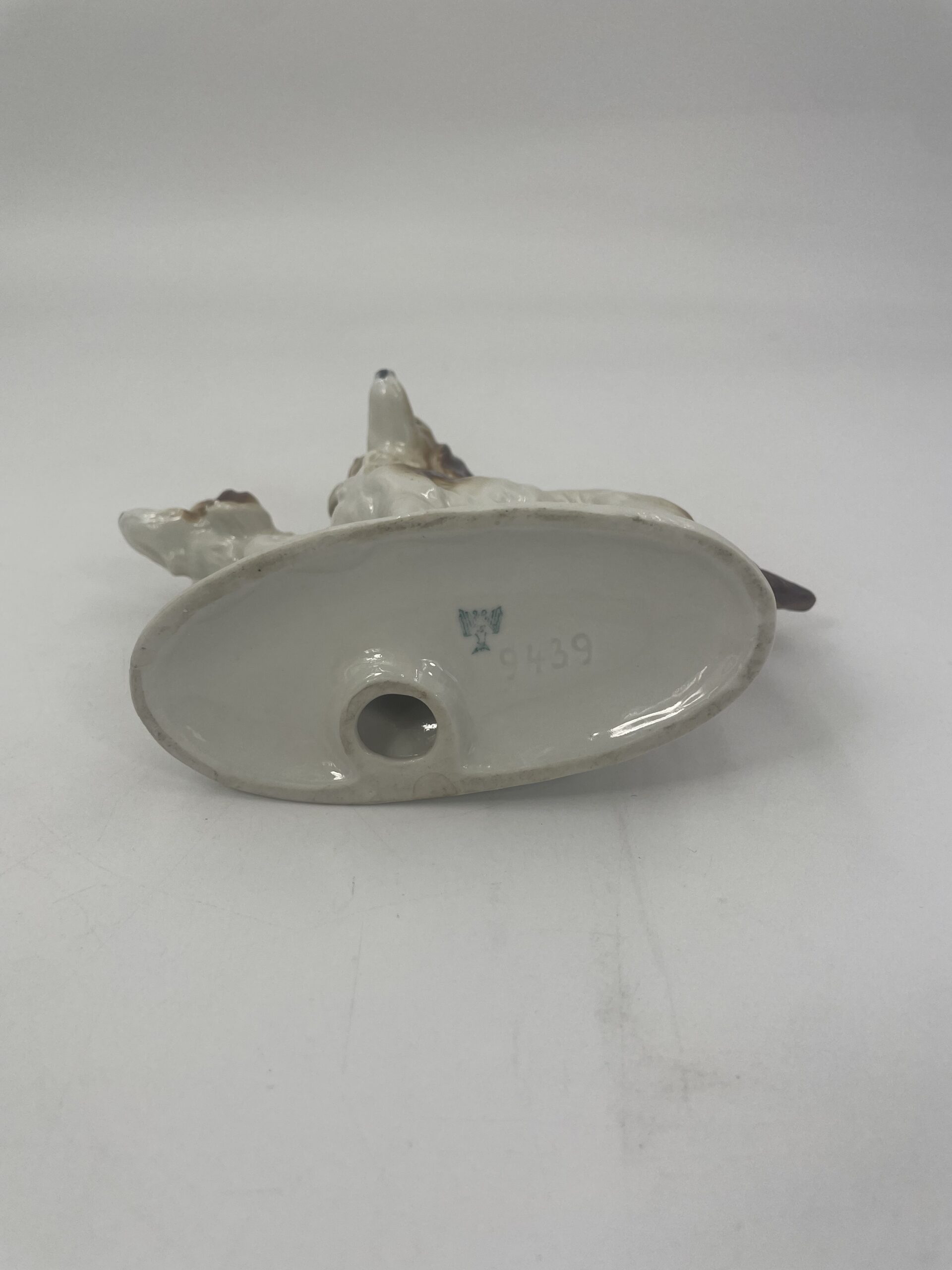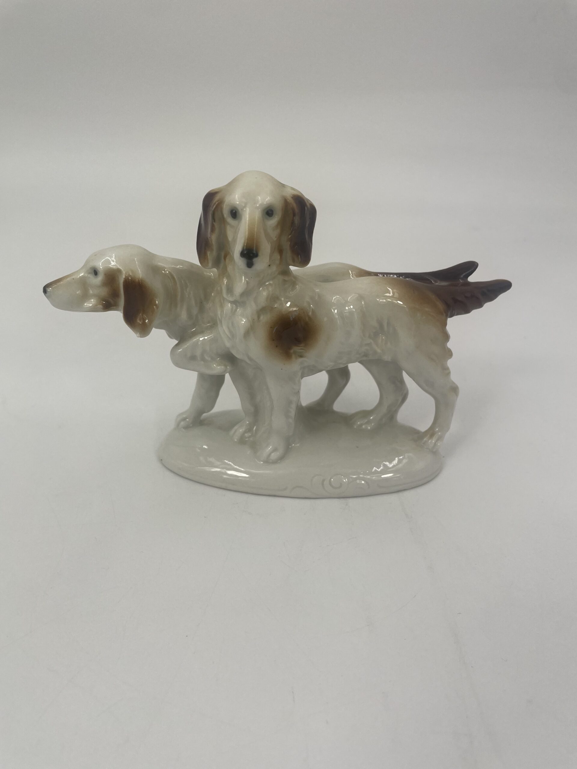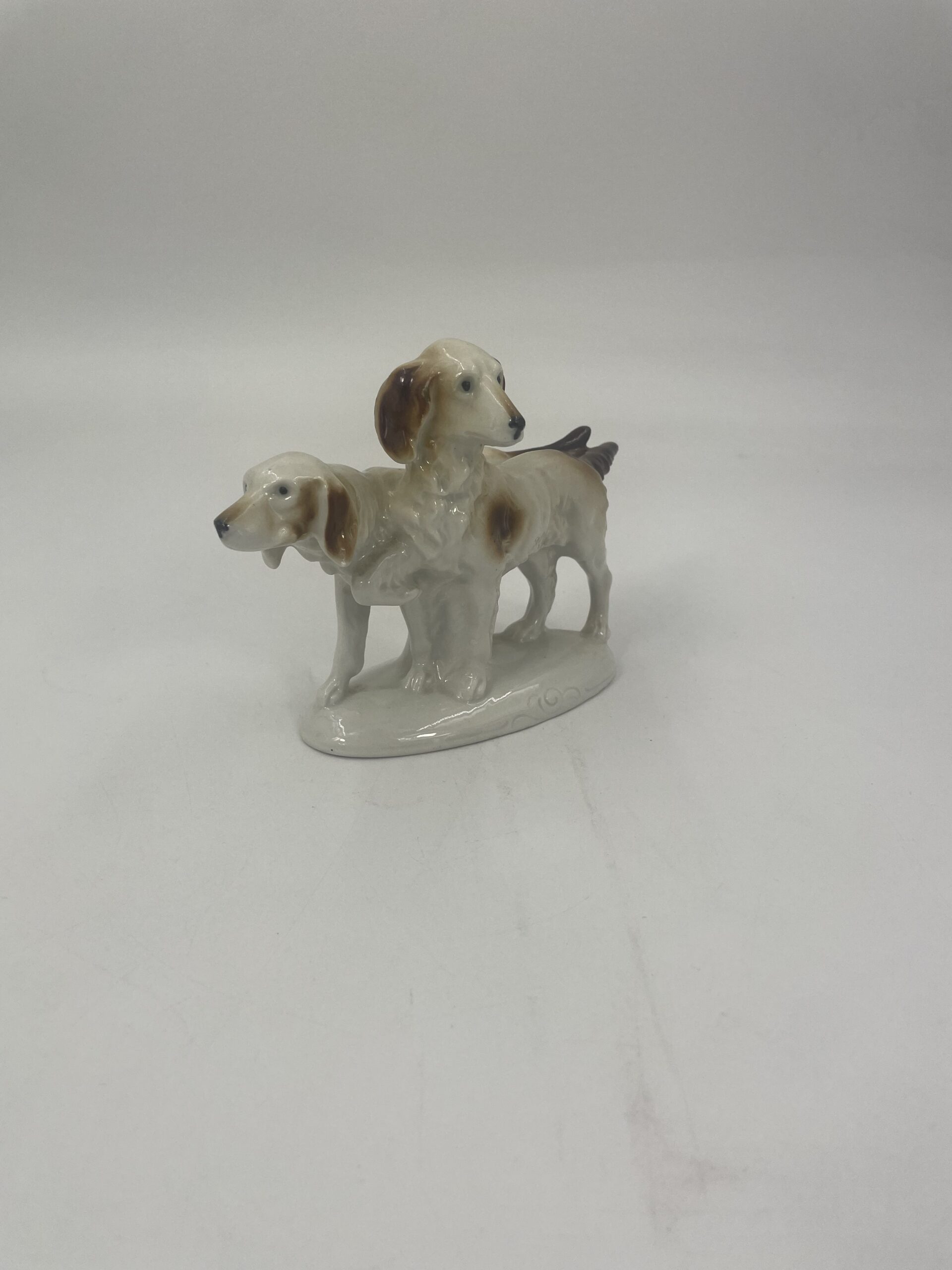 Figurka przedstawia psy myśliwskie Spaniel. Porcelana pochodzi z wytwórni Carl Scheidig Niemcy z lat 1935-1990. Figurka w kolorze ecru-brąz.
