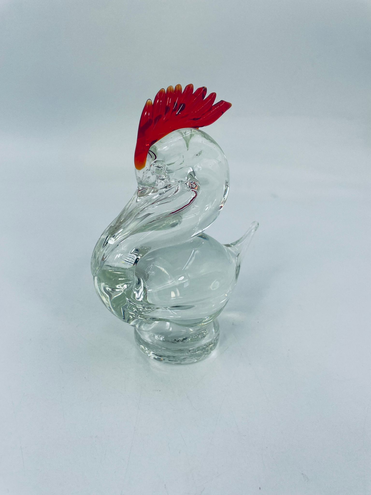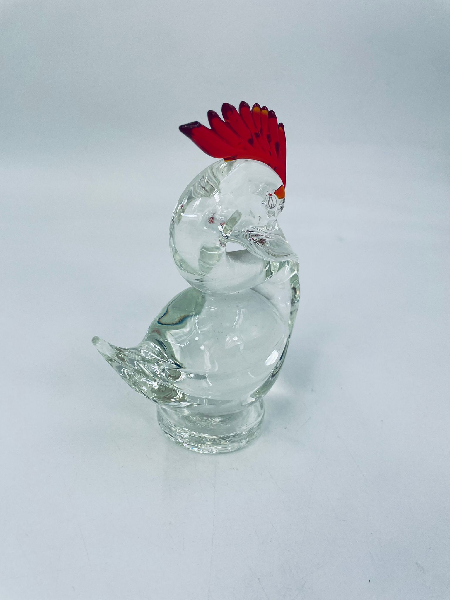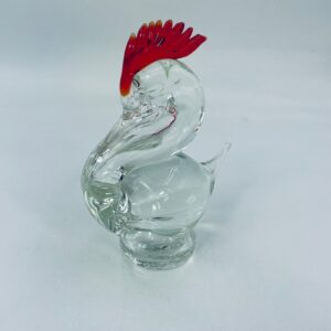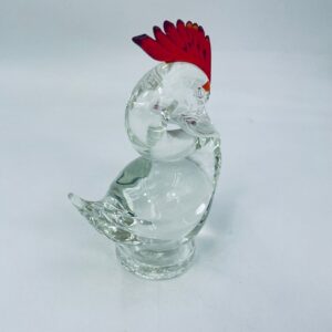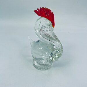 Piękna figurka w kształcie ptaka wykonana ze szkła murano. Ptak ręcznie robiony, przezroczysty z czerwonym grzebieniem na głowie. Figurka pochodzi z Włoch.