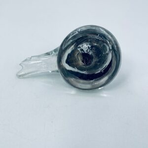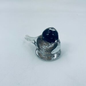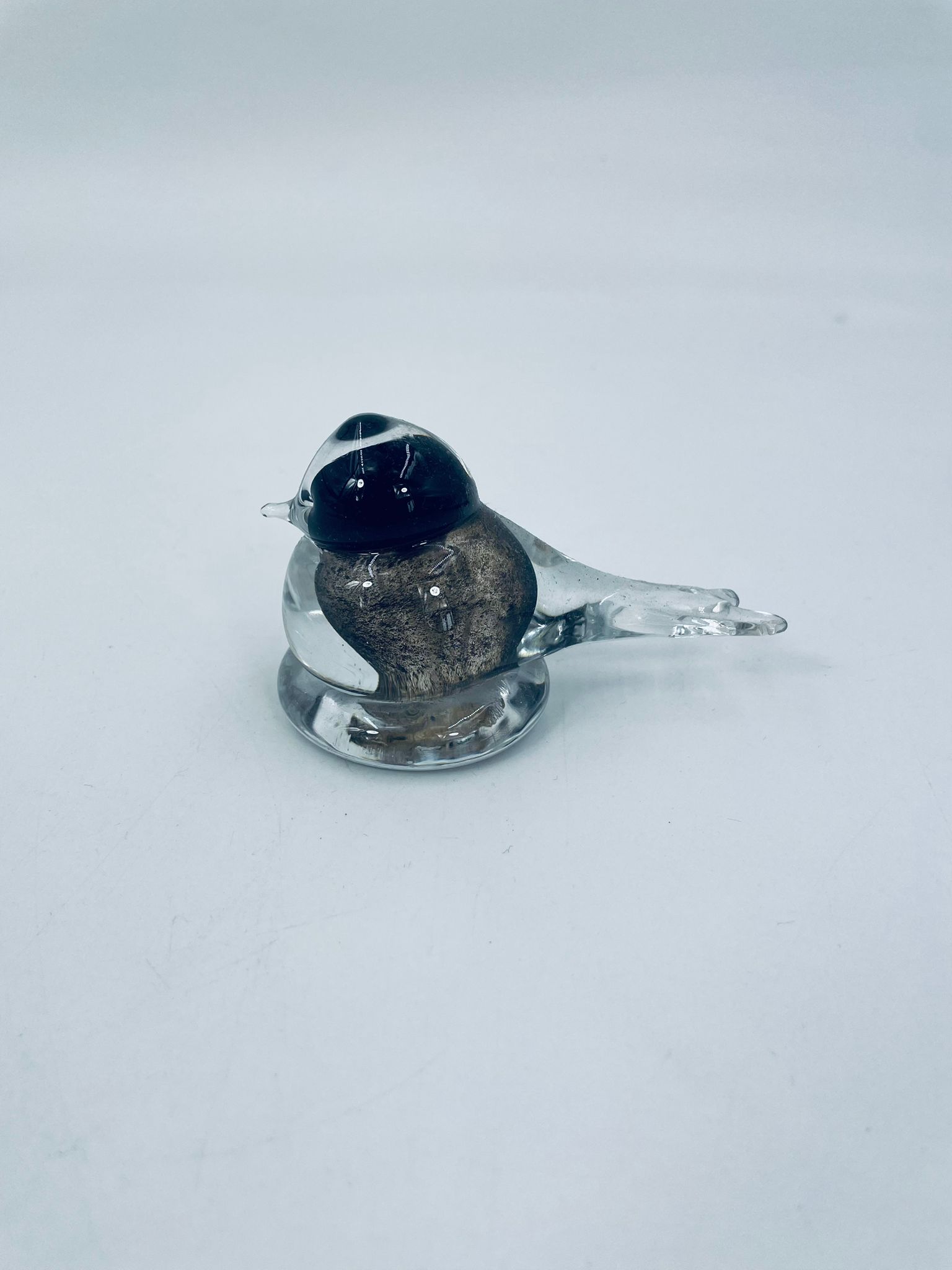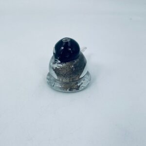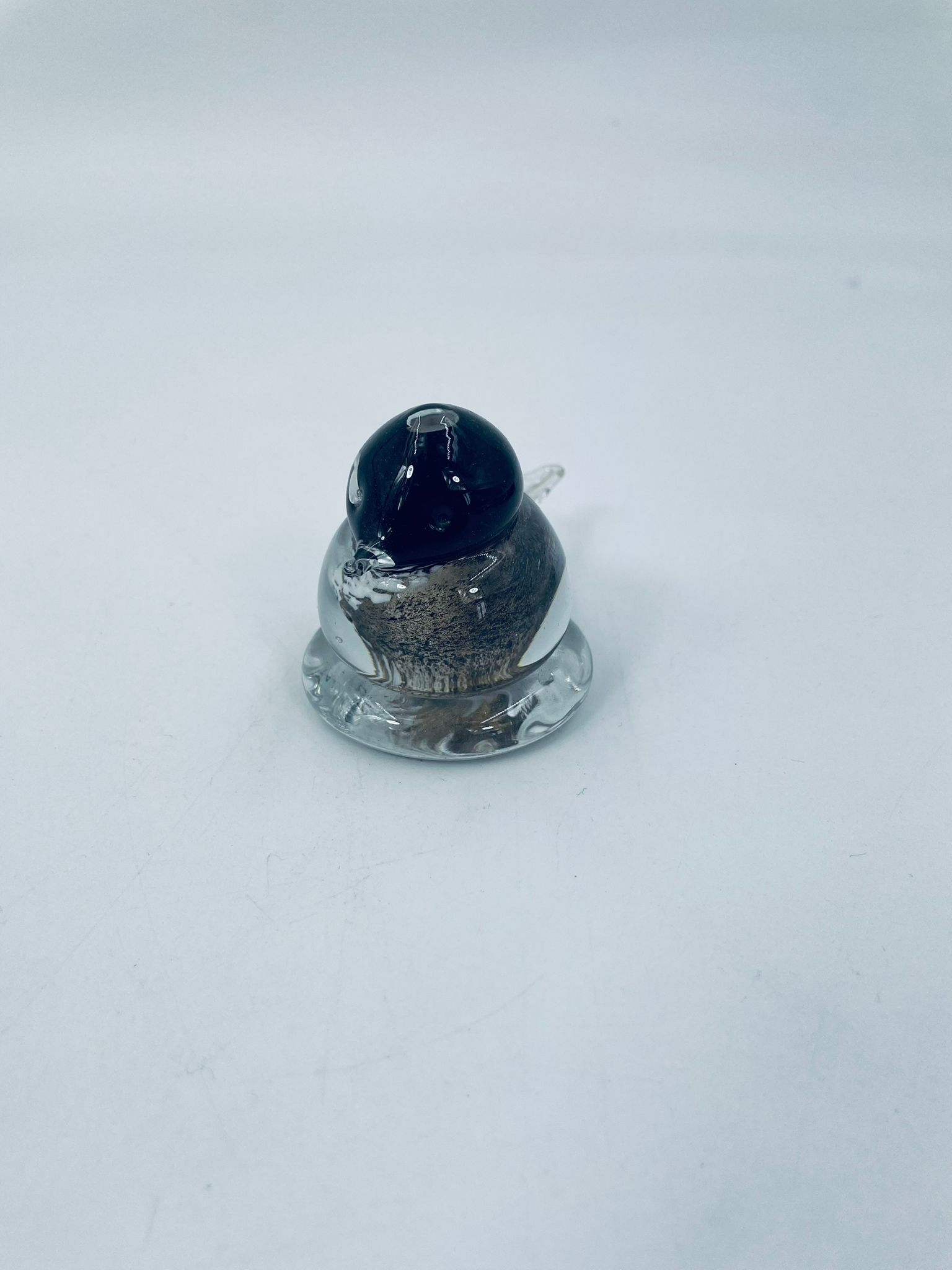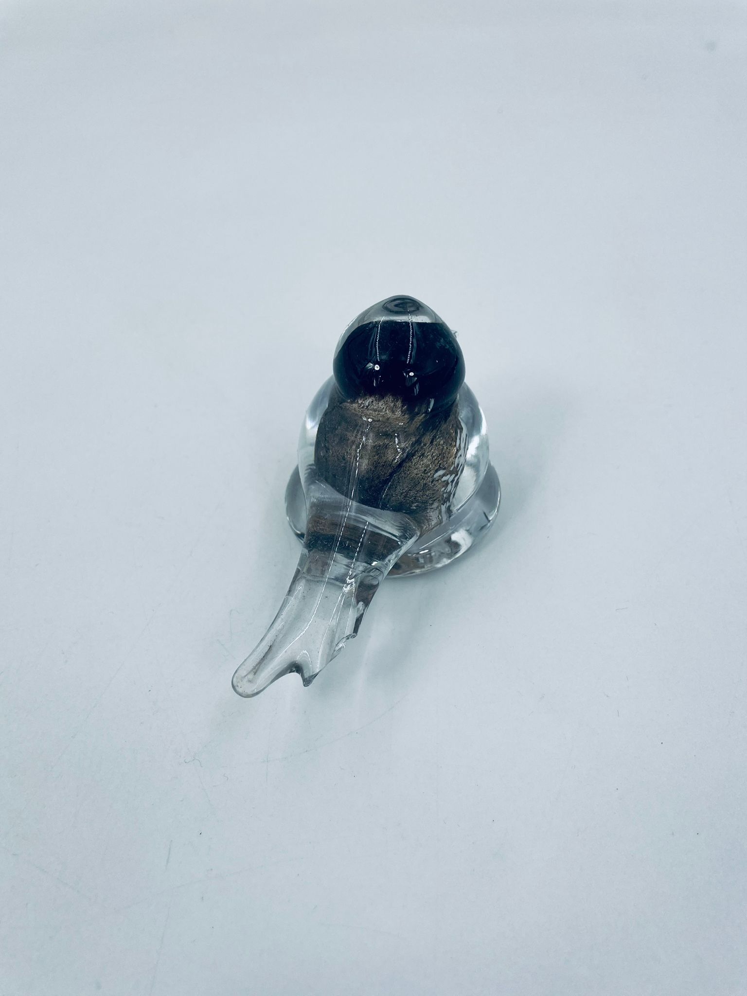 Ptaszek dekoracyjny z wysp Murano. Szkło przezroczyste, wewnętrzna części kolorze czarno-białym i złotym. Uszczerbienie na ogonie ptaszka.