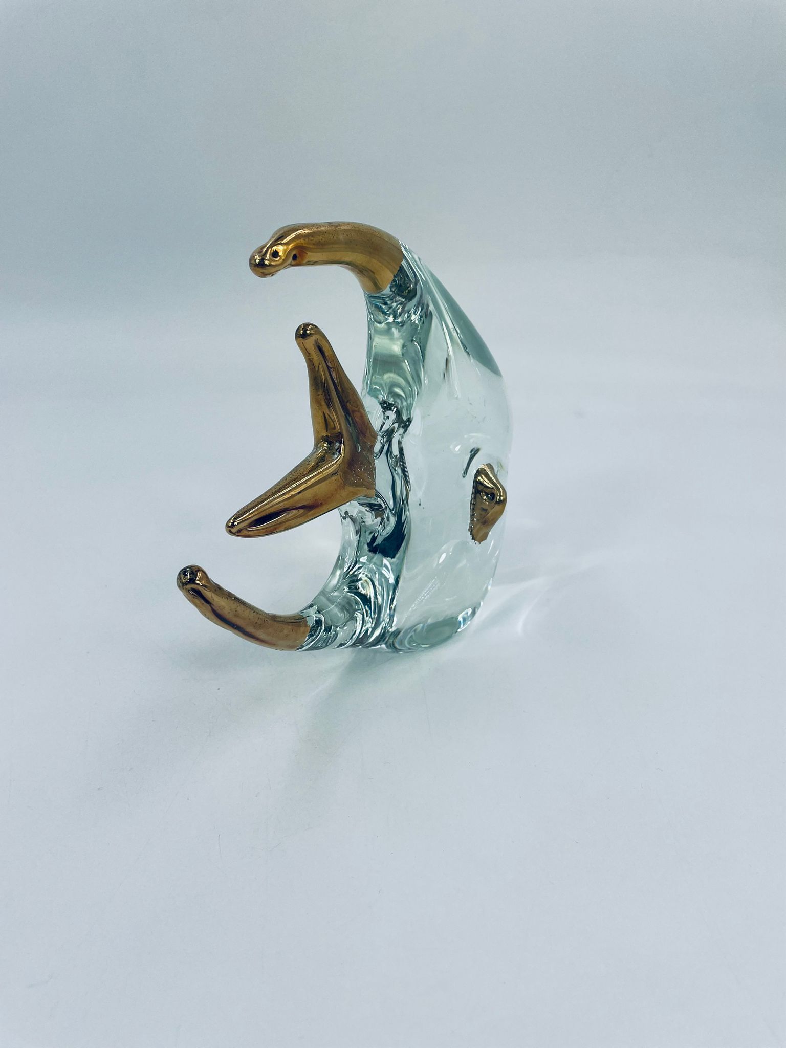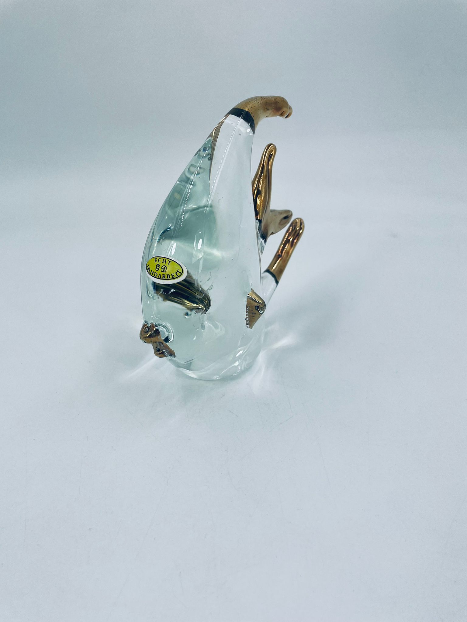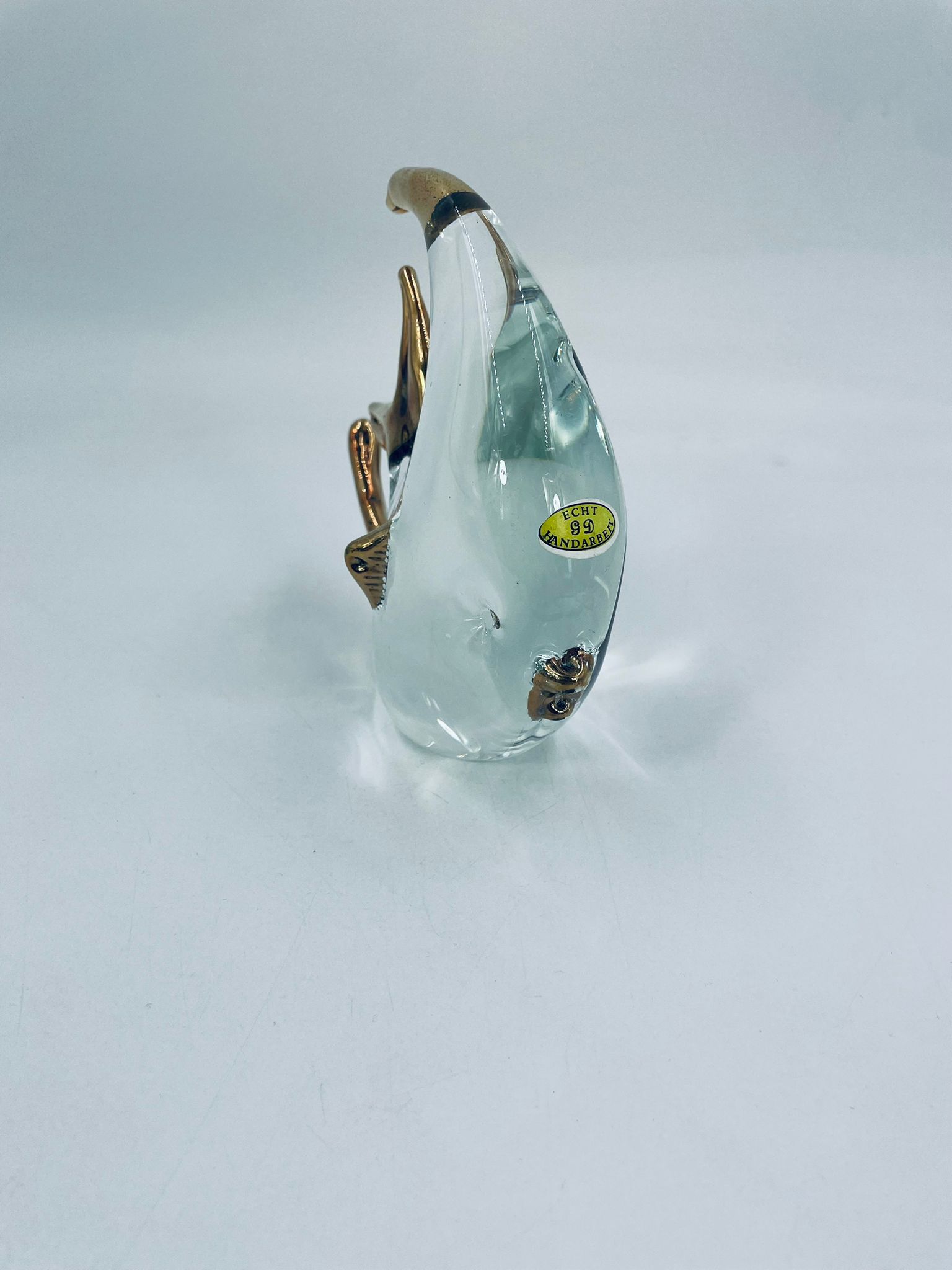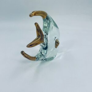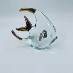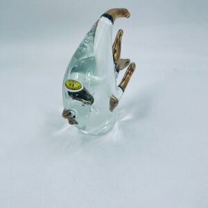 Figurka przedstawia Rybę ze szkła artystycznego Murano, ręcznie dmuchana. Ryba posiada złote akcenty na płetwach, ogonie o dzióbku. Widoczna etykieta z napisem ECHT HANDARBEIT- prawdziwa praca ręczna.