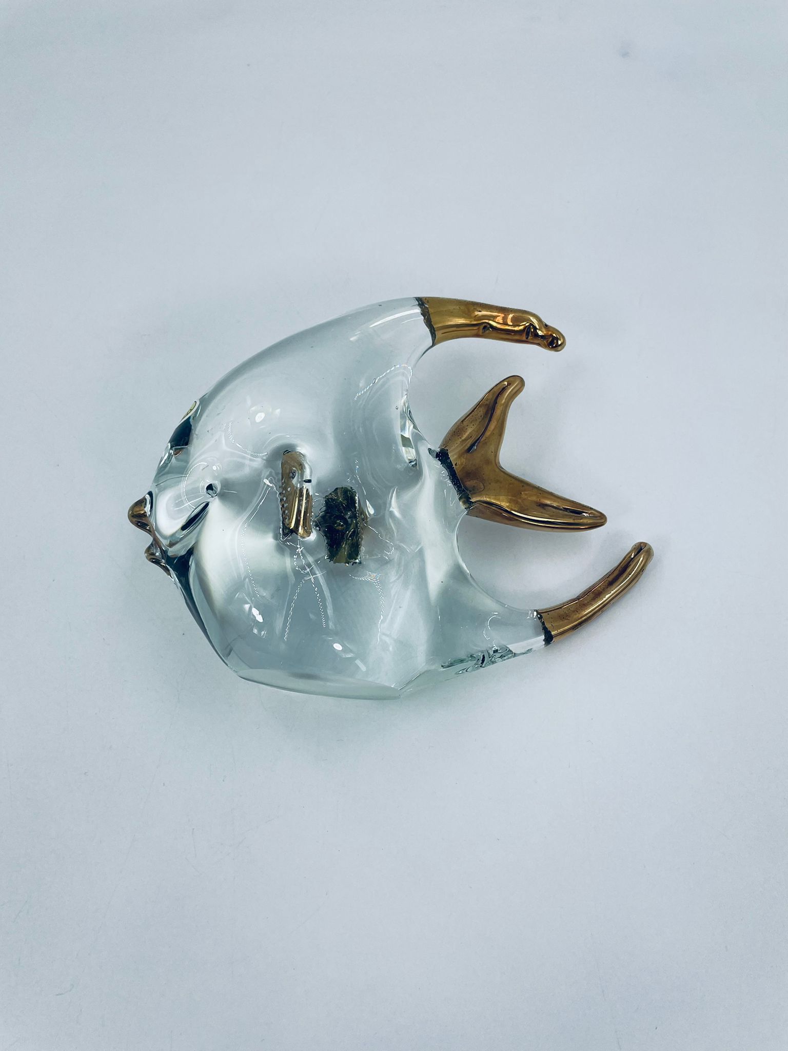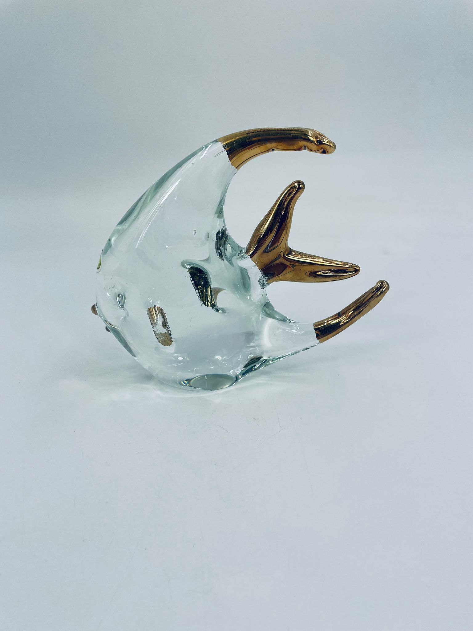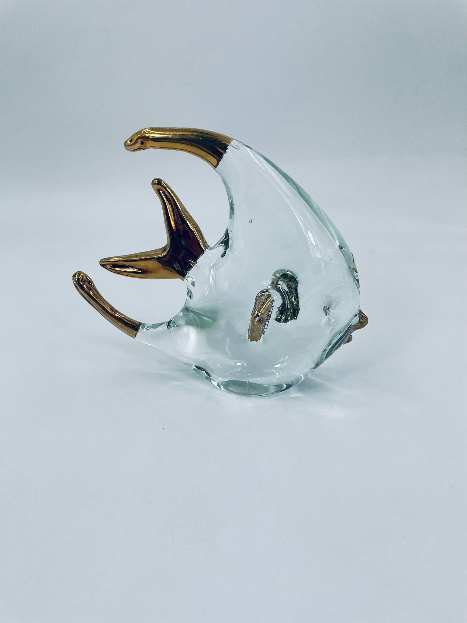 Figurka przedstawia Rybę ze szkła artystycznego Murano, ręcznie dmuchana. Ryba posiada złote akcenty na płetwach, ogonie o dzióbku. Widoczna etykieta z napisem ECHT HANDARBEIT- prawdziwa praca ręczna.