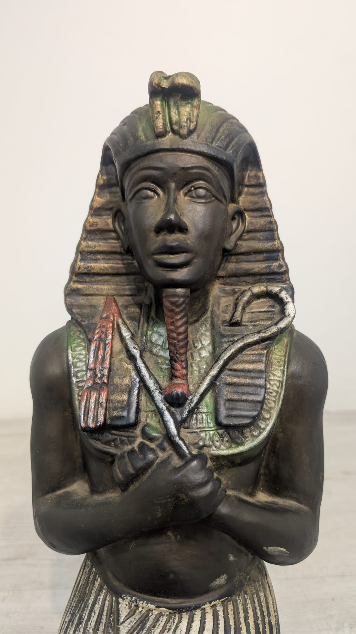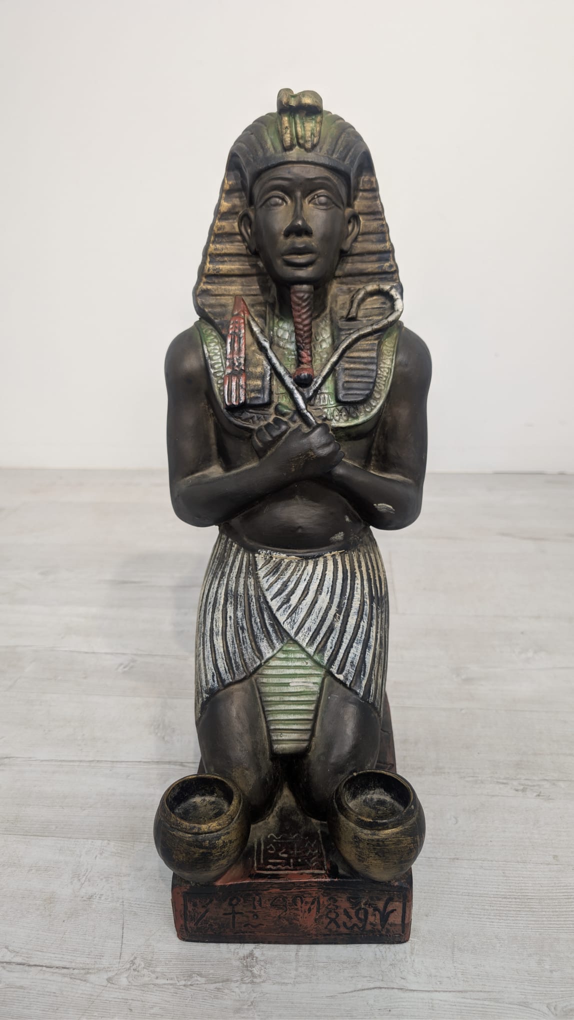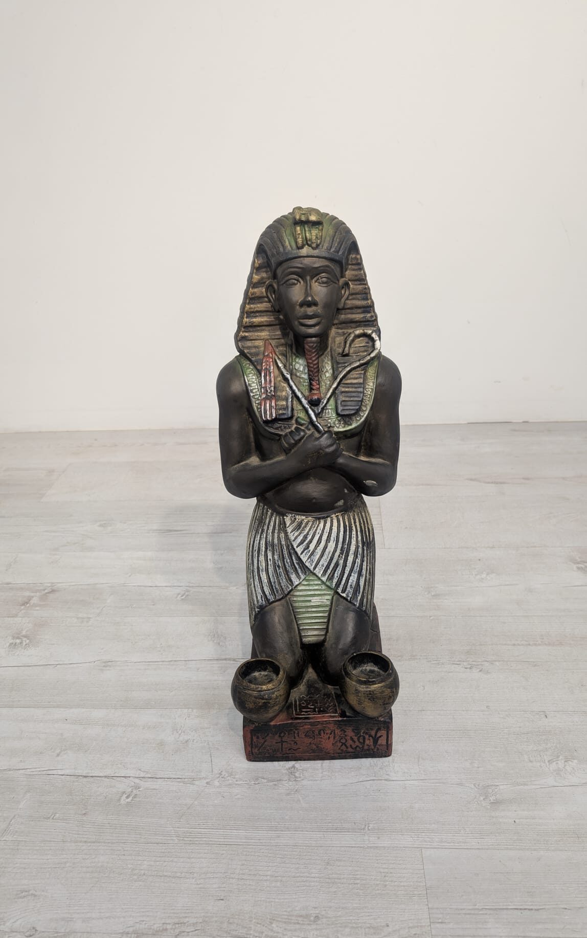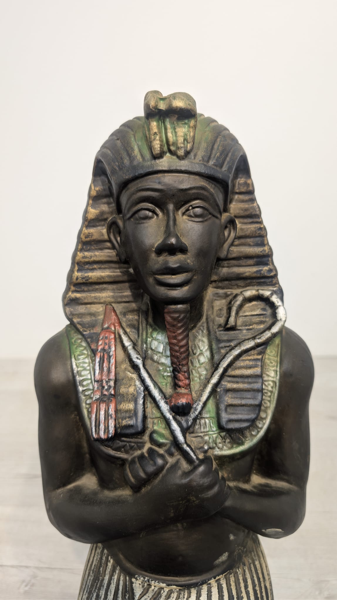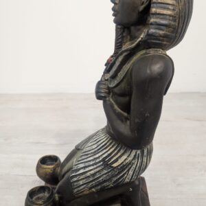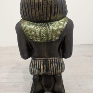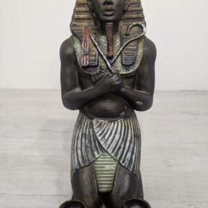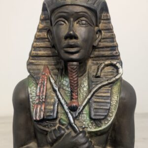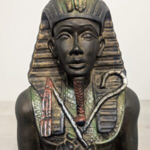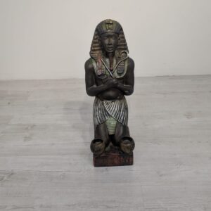 Figurka egipskiej rzeźby przedstawiającej faraona Ramzesa. Wykonana z ciemnego materiału, ozdobiona kolorowymi elementami. Ciekawa dekoracja lub kolekcjonerski przedmiot.