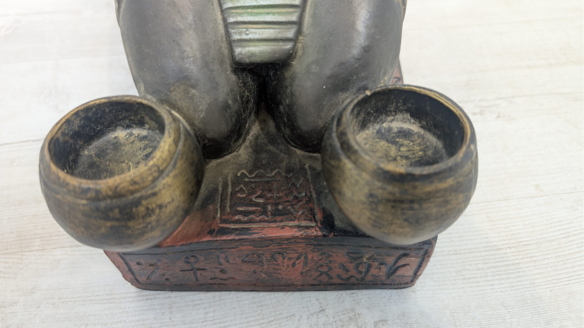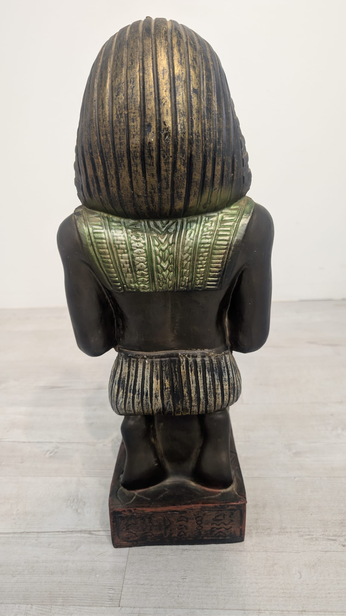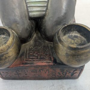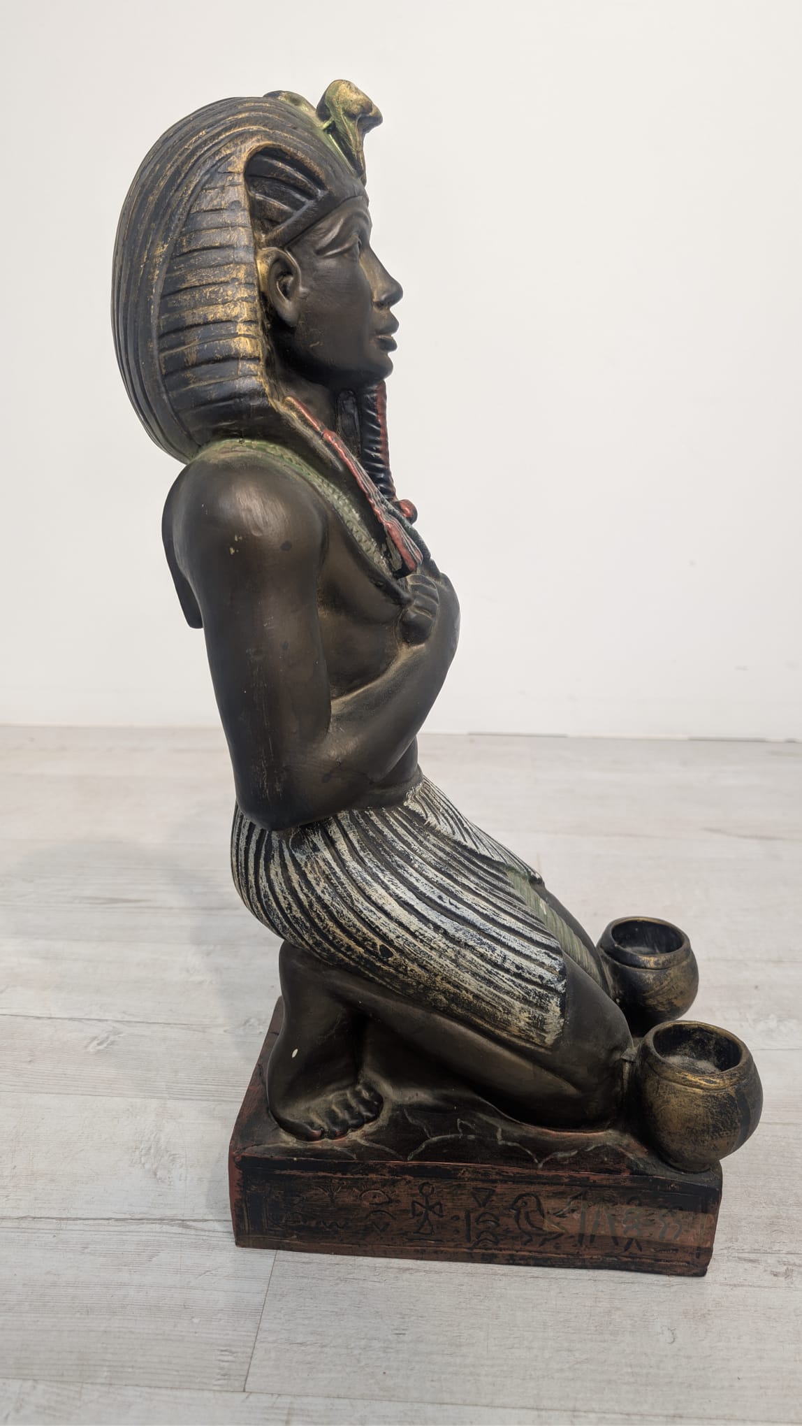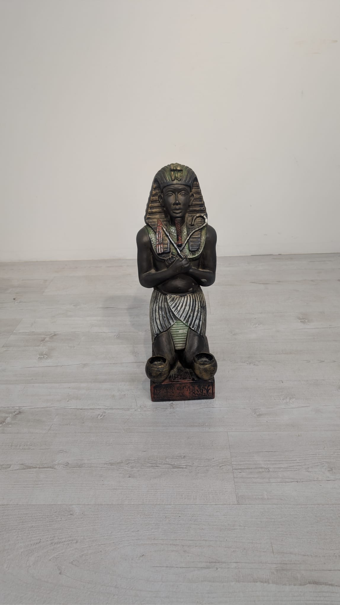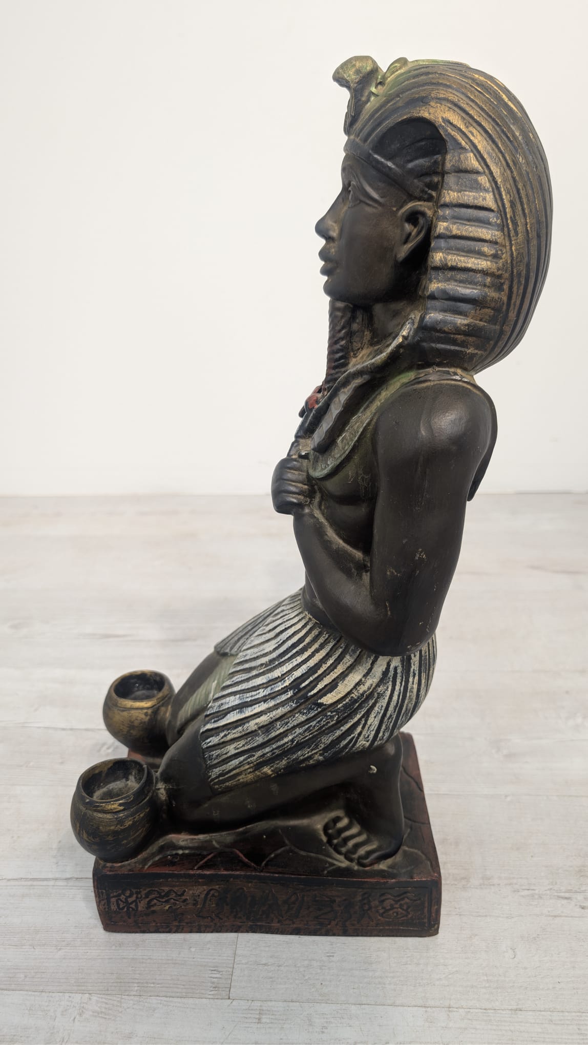 Figurka egipskiej rzeźby przedstawiającej faraona Ramzesa. Wykonana z ciemnego materiału, ozdobiona kolorowymi elementami. Ciekawa dekoracja lub kolekcjonerski przedmiot.