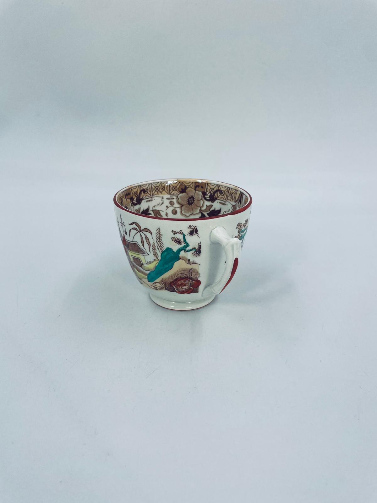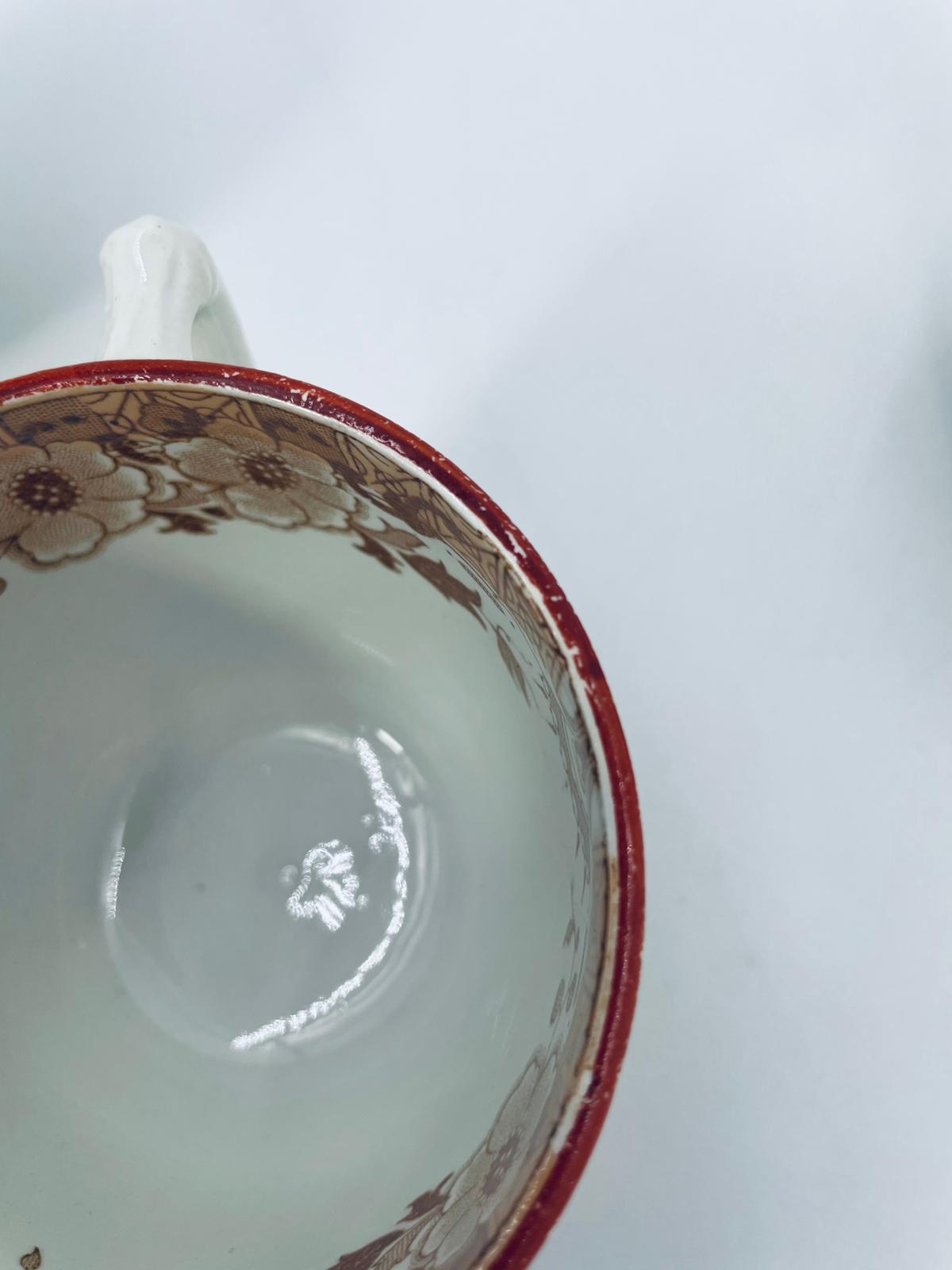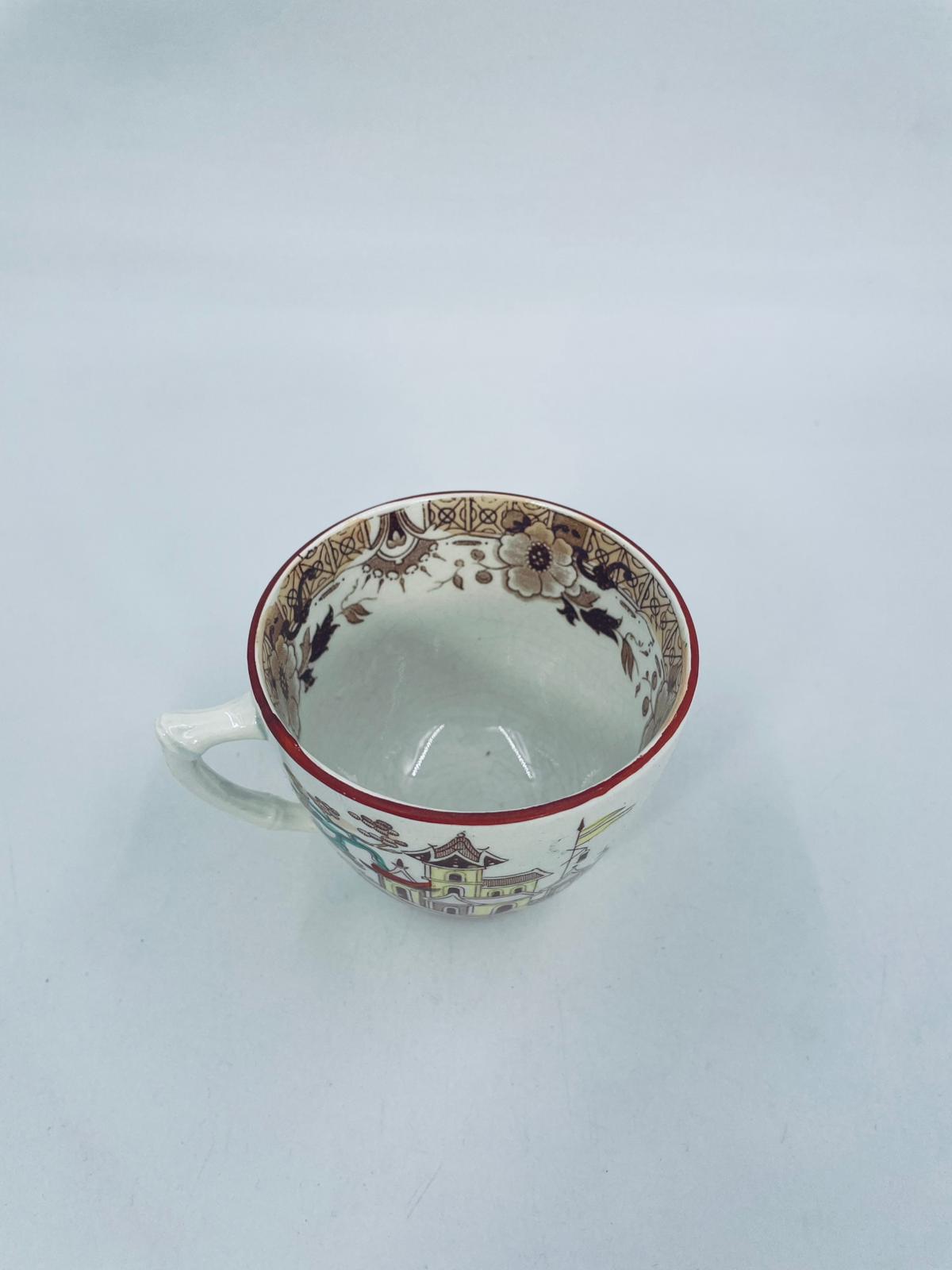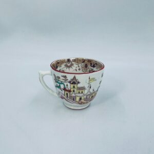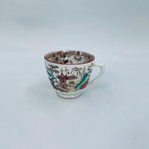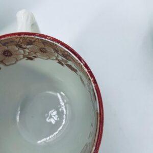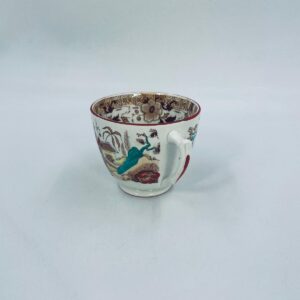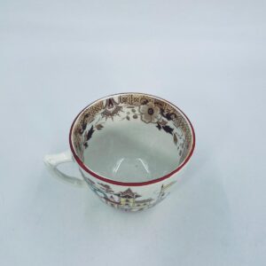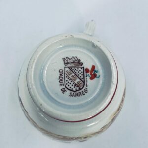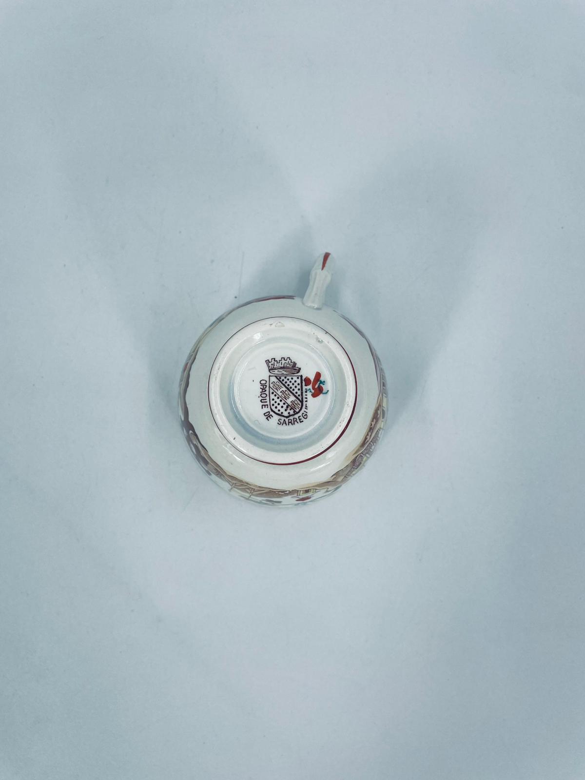 Filiżanka kolekcjonerska, antyczna, francuskiej wytwórni Opaque de Sarreguemines która została założona w 1790r, a filiżanka tego typu datuje się na przełom XIX i XX w. Filiżanka dekorowana ręcznie kolorowa kalkomanią w stylu orientalnym, wykończona na rantach kolorem bordowym. Posiada przetarcia, przebarwienia oraz pęknięcie szkliwa.
