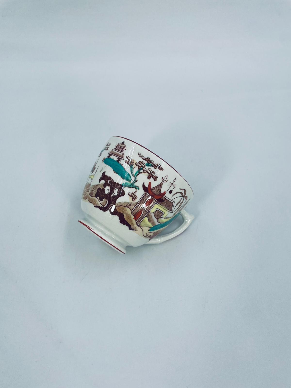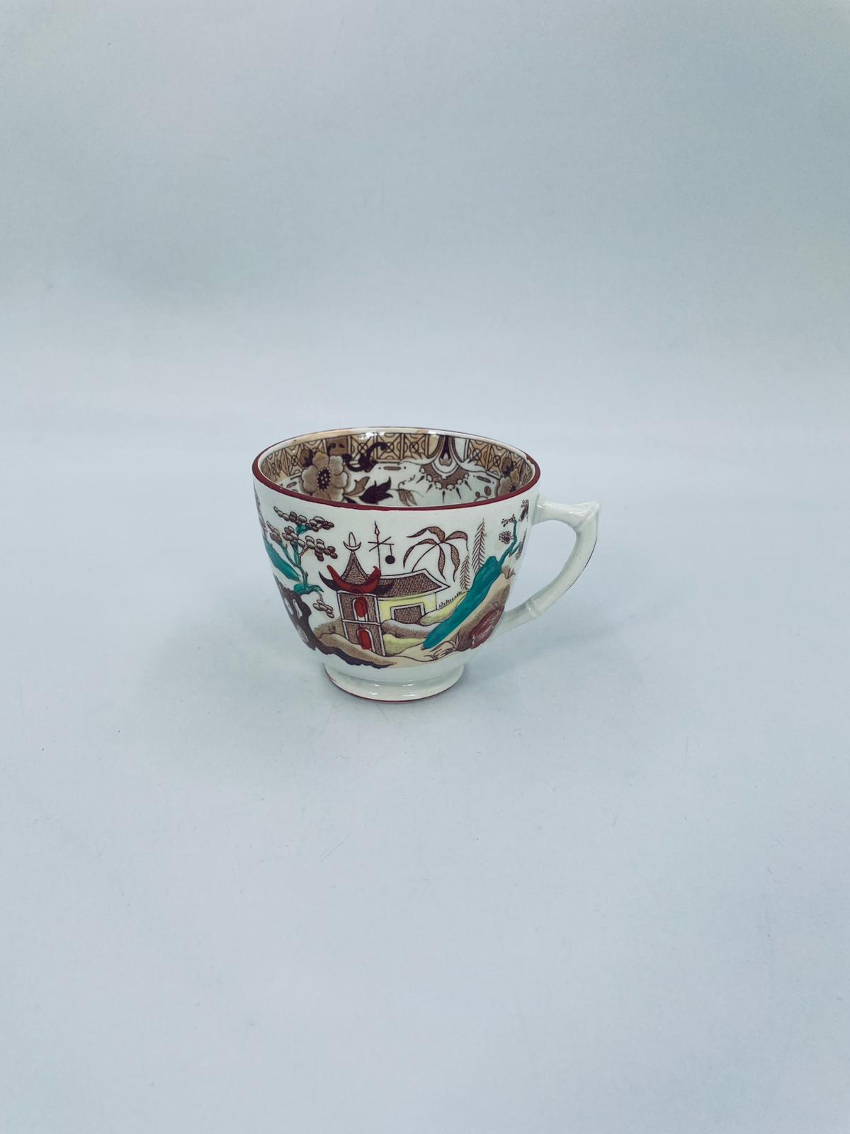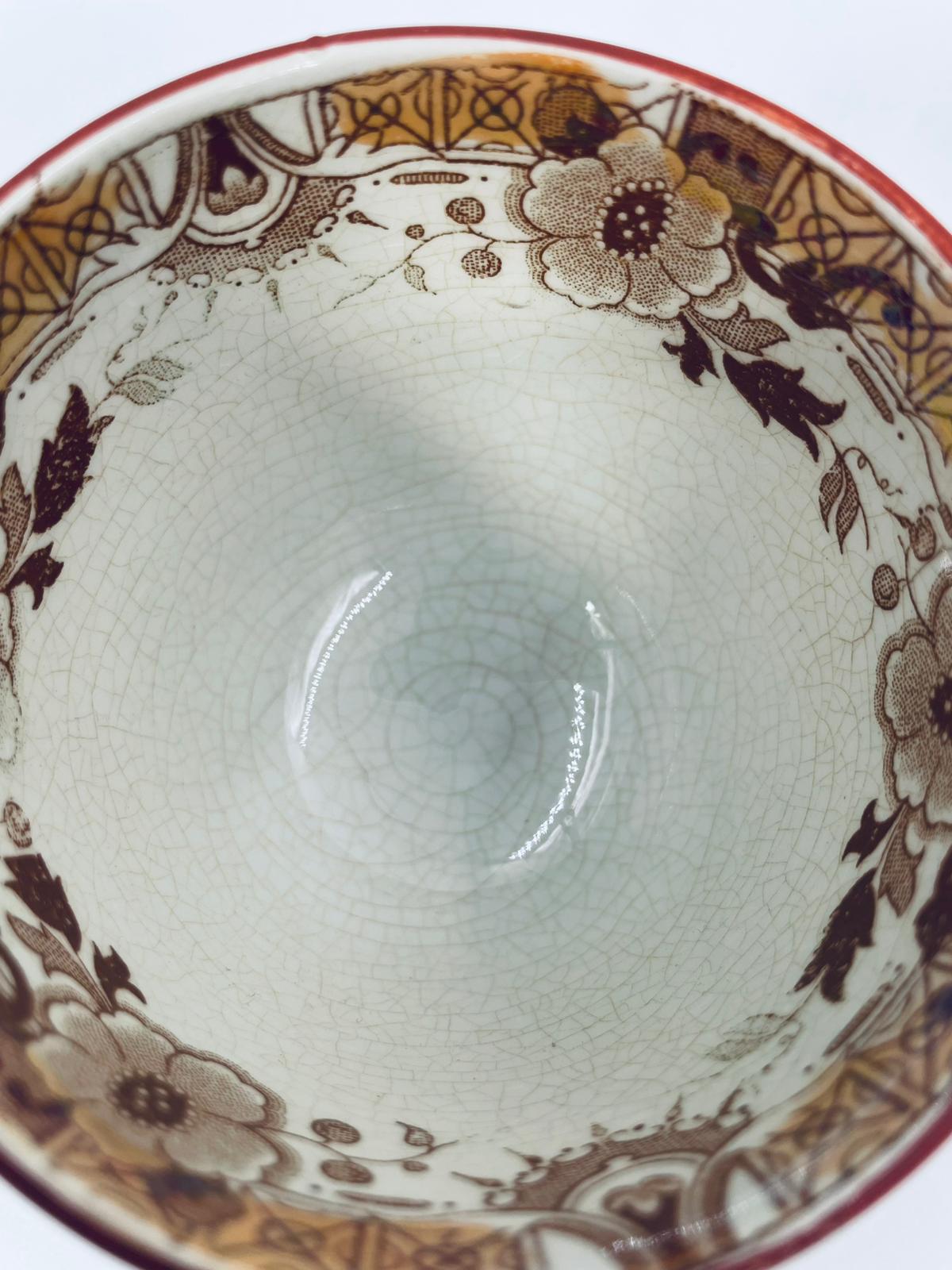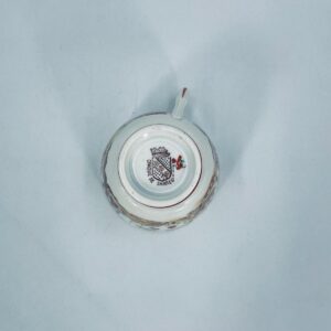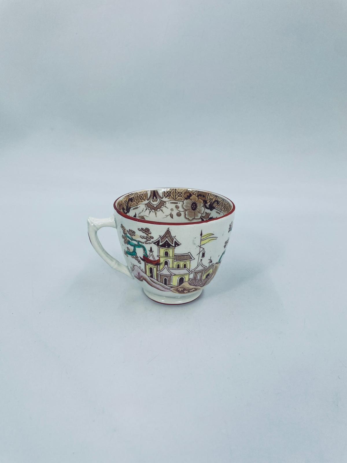 Filiżanka kolekcjonerska, antyczna, francuskiej wytwórni Opaque de Sarreguemines która została założona w 1790r, a filiżanka tego typu datuje się na przełom XIX i XX w. Filiżanka dekorowana ręcznie kolorowa kalkomanią w stylu orientalnym, wykończona na rantach kolorem bordowym. Posiada przetarcia, przebarwienia oraz pęknięcie szkliwa.